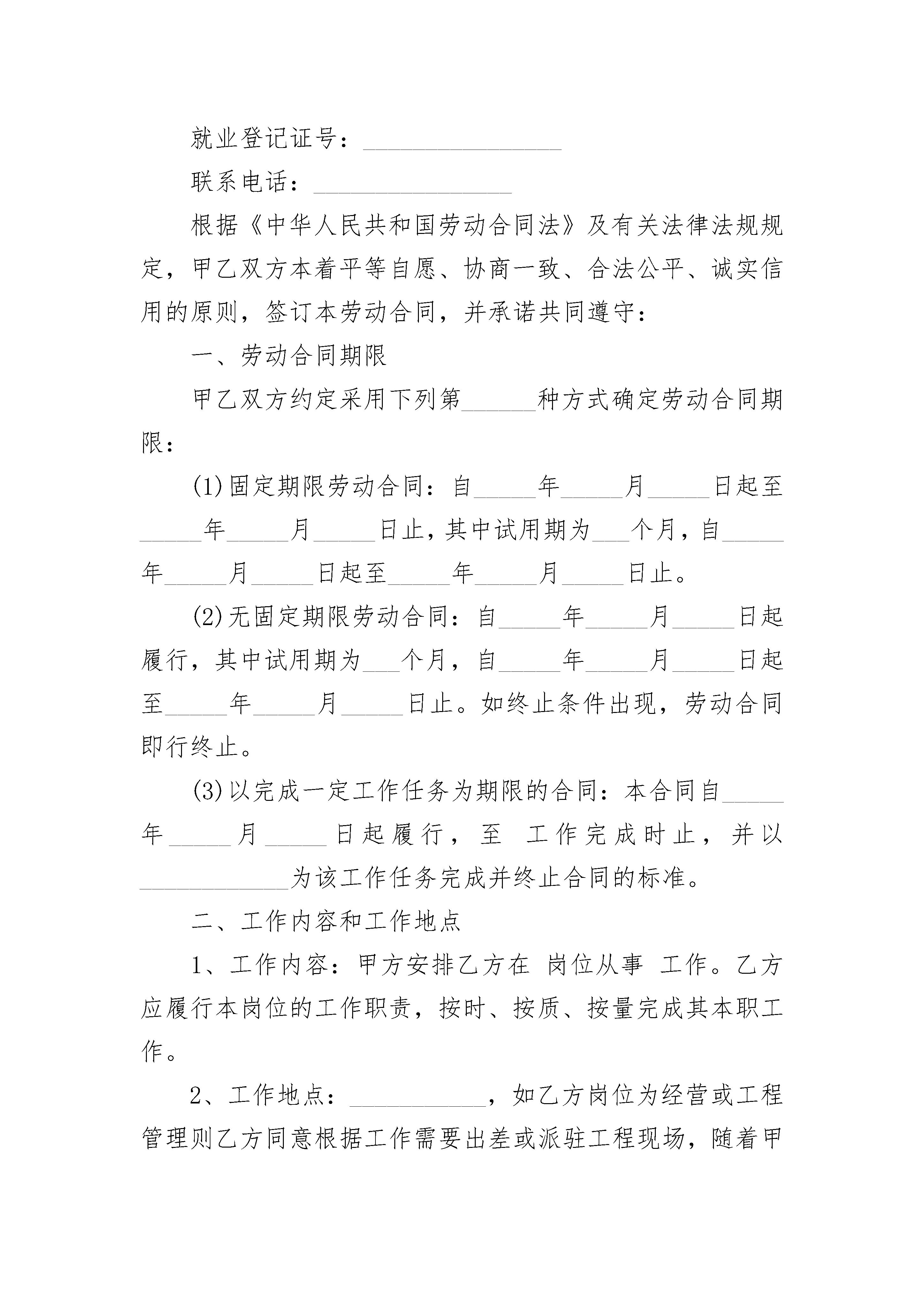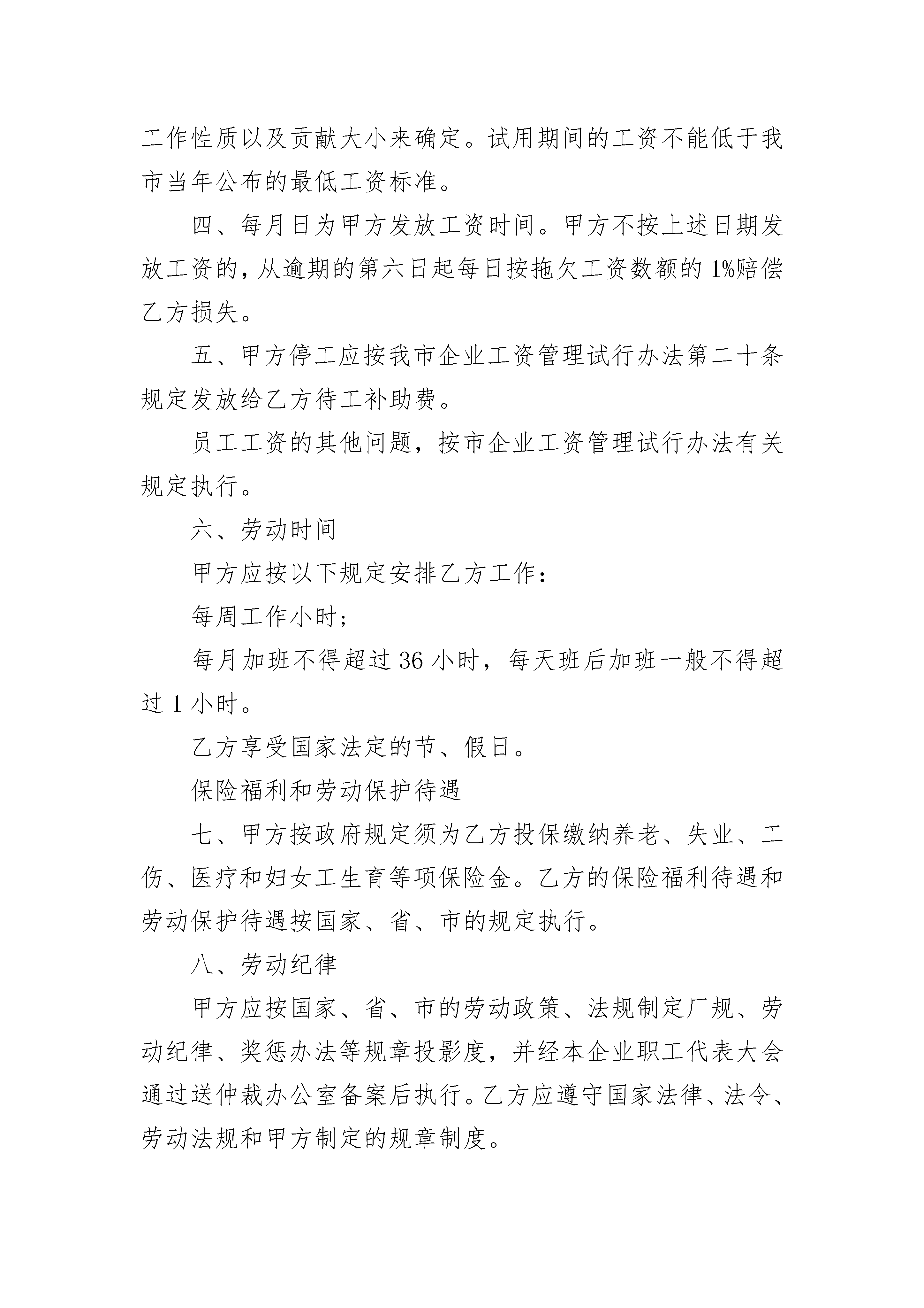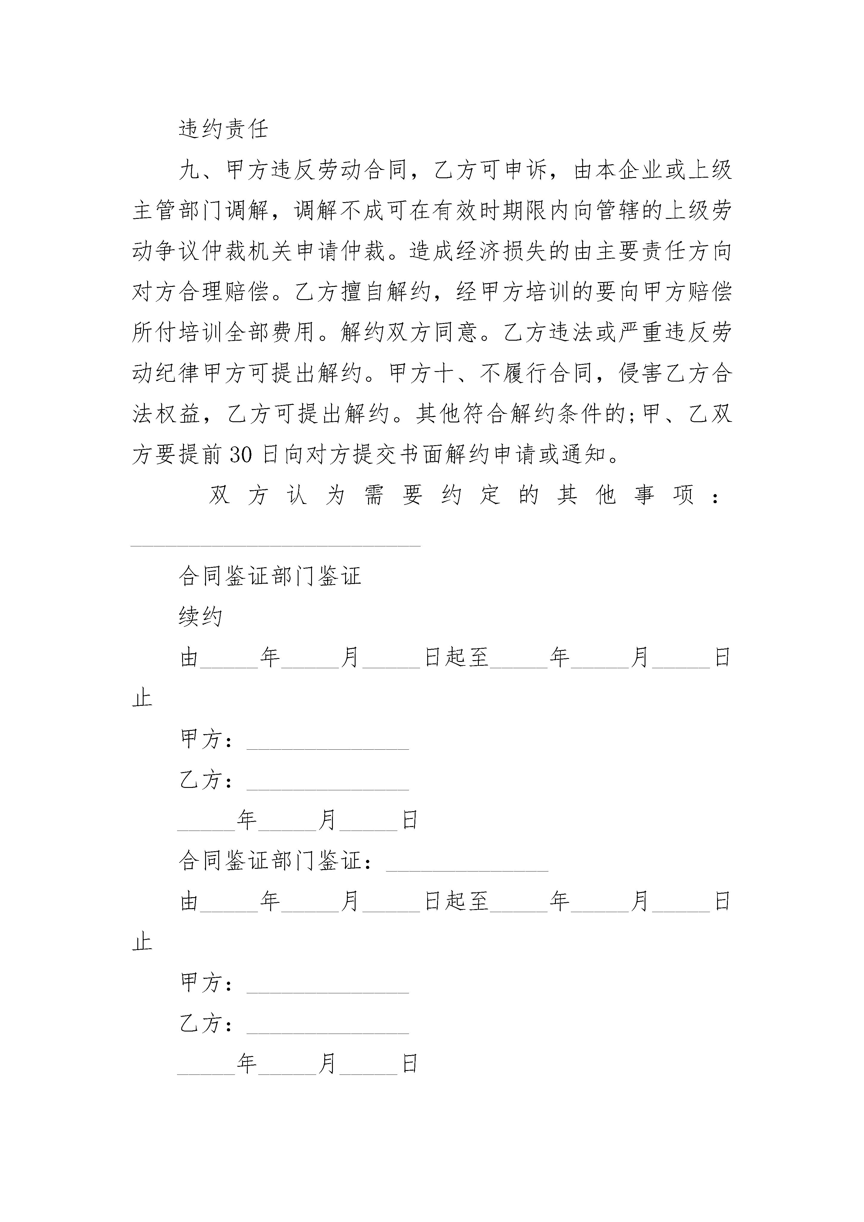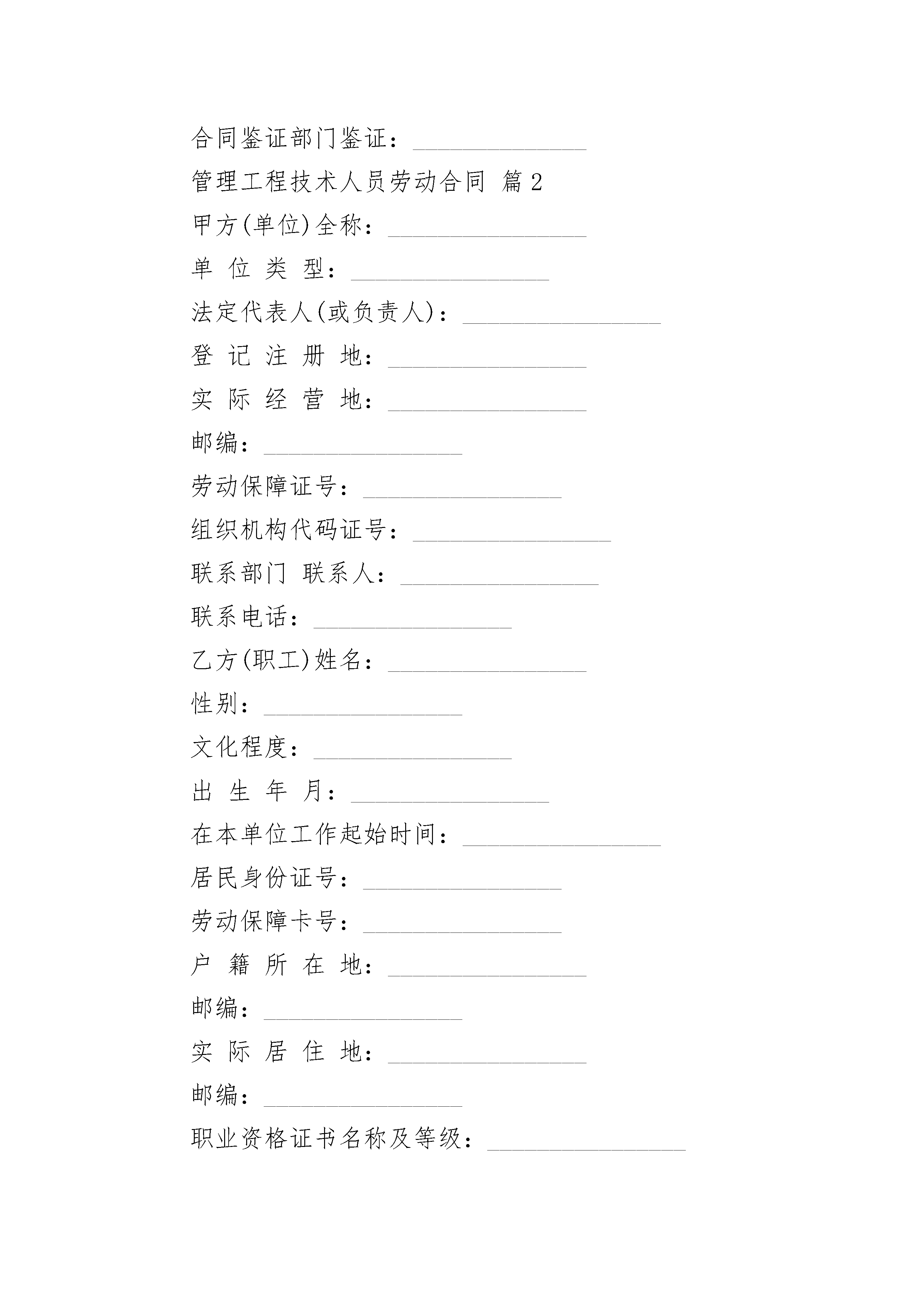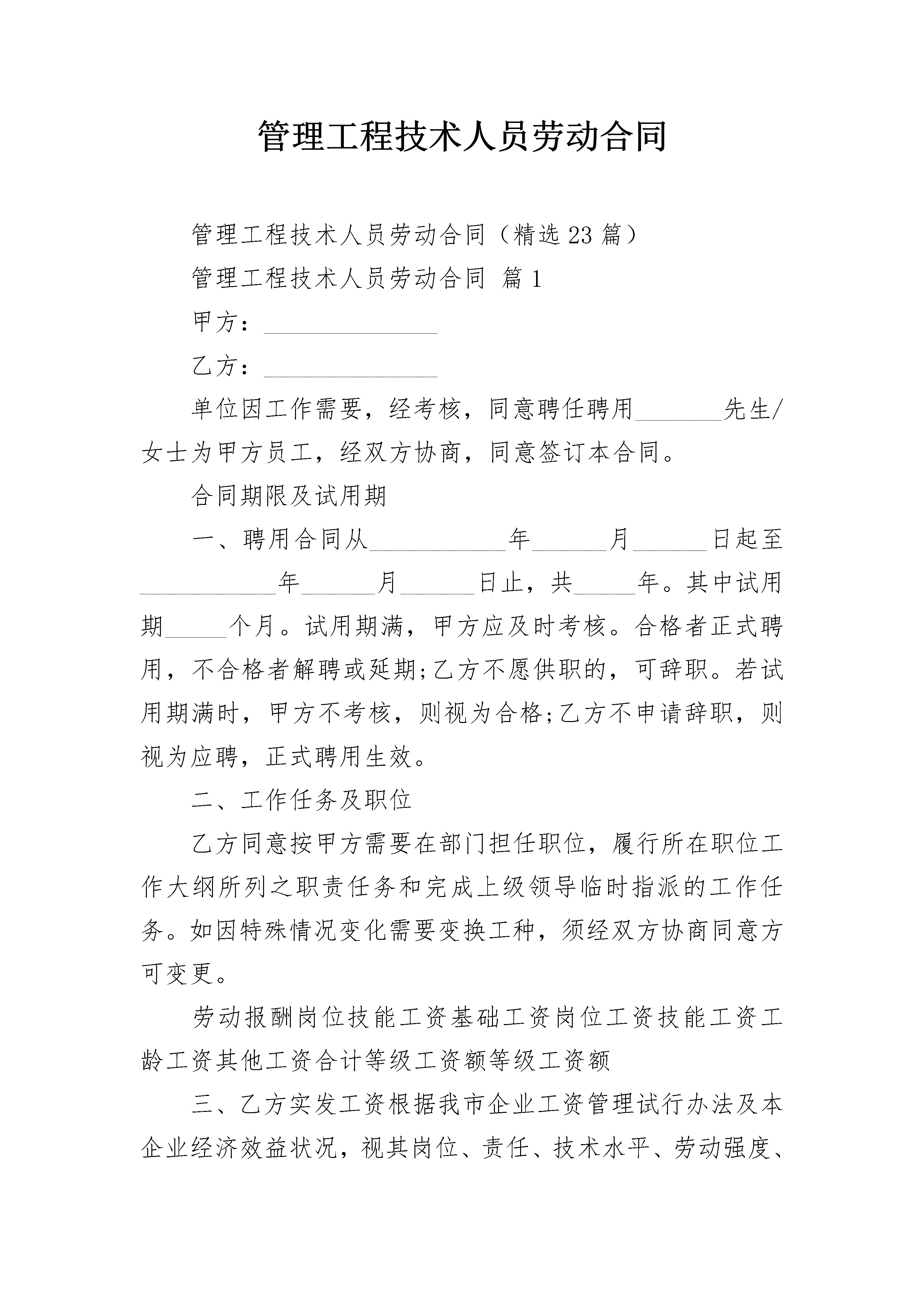 管理工程技术人员劳动合同管理工程技术人员劳动合同(精选23篇)管理工程技术人员劳动合同篇1甲方:______________乙方:______________单位因工作需要,经考核,同意聘任聘用_______先生/女士为甲方员工,经双方协商,同意签订本合同。合同期限及试用期一、聘用合同从___________年______月______日起至___________年______月______日止,共_____年。其中试用期_____个月。试用期满,甲方应及时考核。合格者正式聘用,不合格者解聘或延期;乙方不愿供职的,可辞职。若试用期满时,甲方不考核,则视为合格;乙方不申请辞职,则视为应聘,正式聘用生效。二、工作任务及职位乙方同意按甲方需要在部门担任职位,履行所在职位工作大纲所列之职责任务和完成上级领导临时指派的工作任务。如因特殊情况变化需要变换工种,须经双方协商同意方可变更。劳动报酬岗位技能工资基础工资岗位工资技能工资工龄工资其他工资合计等级工资额等级工资额三、乙方实发工资根据我市企业工资管理试行办法及本企业经济效益状况,视其岗位、责任、技术水平、劳动强度、工作性质以及贡献大小来确定。试用期间的工资不能低于我市当年公布的最低工资标准。四、每月日为甲方发放工资时间。甲方不按上述日期发放工资的,从逾期的第六日起每日按拖欠工资数额的1%赔偿乙方损失。五、甲方停工应按我市企业工资管理试行办法第二十条规定发放给乙方待工补助费。员工工资的其他问题,按市企业工资管理试行办法有关规定执行。六、劳动时间甲方应按以下规定安排乙方工作:每周工作小时;每月加班不得超过36小时,每天班后加班一般不得超过1小时。乙方享受国家法定的节、假日。保险福利和劳动保护待遇七、甲方按政府规定须为乙方投保缴纳养老、失业、工伤、医疗和妇女工生育等项保险金。乙方的保险福利待遇和劳动保护待遇按国家、省、市的规定执行。八、劳动纪律甲方应按国家、省、市的劳动政策、法规制定厂规、劳动纪律、奖惩办法等规章投影度,并经本企业职工代表大会通过送仲裁办公室备案后执行。乙方应遵守国家法律、法令、劳动法规和甲方制定的规章制度。违约责任九、甲方违反劳动合同,乙方可申诉,由本企业或上级主管部门调解,调解不成可在有效时期限内向管辖的上级劳动争议仲裁机关申请仲裁。造成经济损失的由主要责任方向对方合理赔偿。乙方擅自解约,经甲方培训的要向甲方赔偿所付培训全部费用。解约双方同意。乙方违法或严重违反劳动纪律甲方可提出解约。甲方十、不履行合同,侵害乙方合法权益,乙方可提出解约。其他符合解约条件的;甲、乙双方要提前30日向对方提交书面解约申请或通知。双方认为需要约定的其他事项:_________________________合同鉴证部门鉴证续约由_____年_____月_____日起至_____年_____月_____日止甲方:______________乙方:___________________年_____月_____日合同鉴证部门鉴证:______________由_____年_____月_____日起至_____年_____月_____日止甲方:______________乙方:___________________年_____月_____日合同鉴证部门鉴证:______________管理工程技术人员劳动合同篇2甲方(单位)全称:________________单位类型:________________法定代表人(或负责人):________________登记注册地:________________实际经营地:________________邮编:________________劳动保障证号:________________组织机构代码证号:________________联系部门联系人:________________联系电话:________________乙方(职工)姓名:________________性别:________________文化程度:________________出生年月:________________在本单位工作起始时间:________________居民身份证号:________________劳动保障卡号:________________户籍所在地:________________邮编:________________实际居住地:________________邮编:________________职业资格证书名称及等级:________________就业登记证号:________________联系电话:________________根据《中华人民共和国劳动合同法》及有关法律法规规定,甲乙双方本着平等自愿、协商一致、合法公平、诚实信用的原则,签订本劳动合