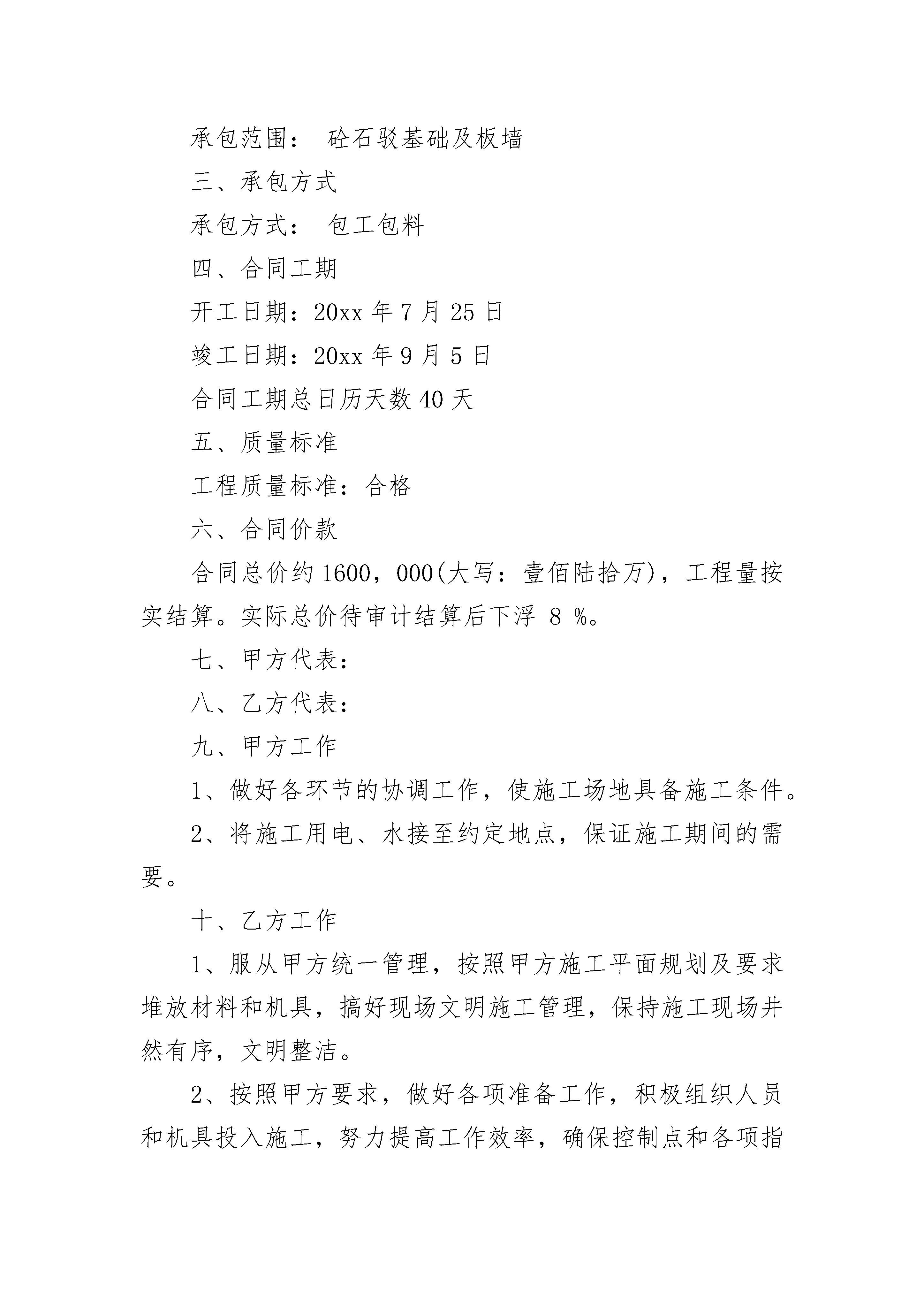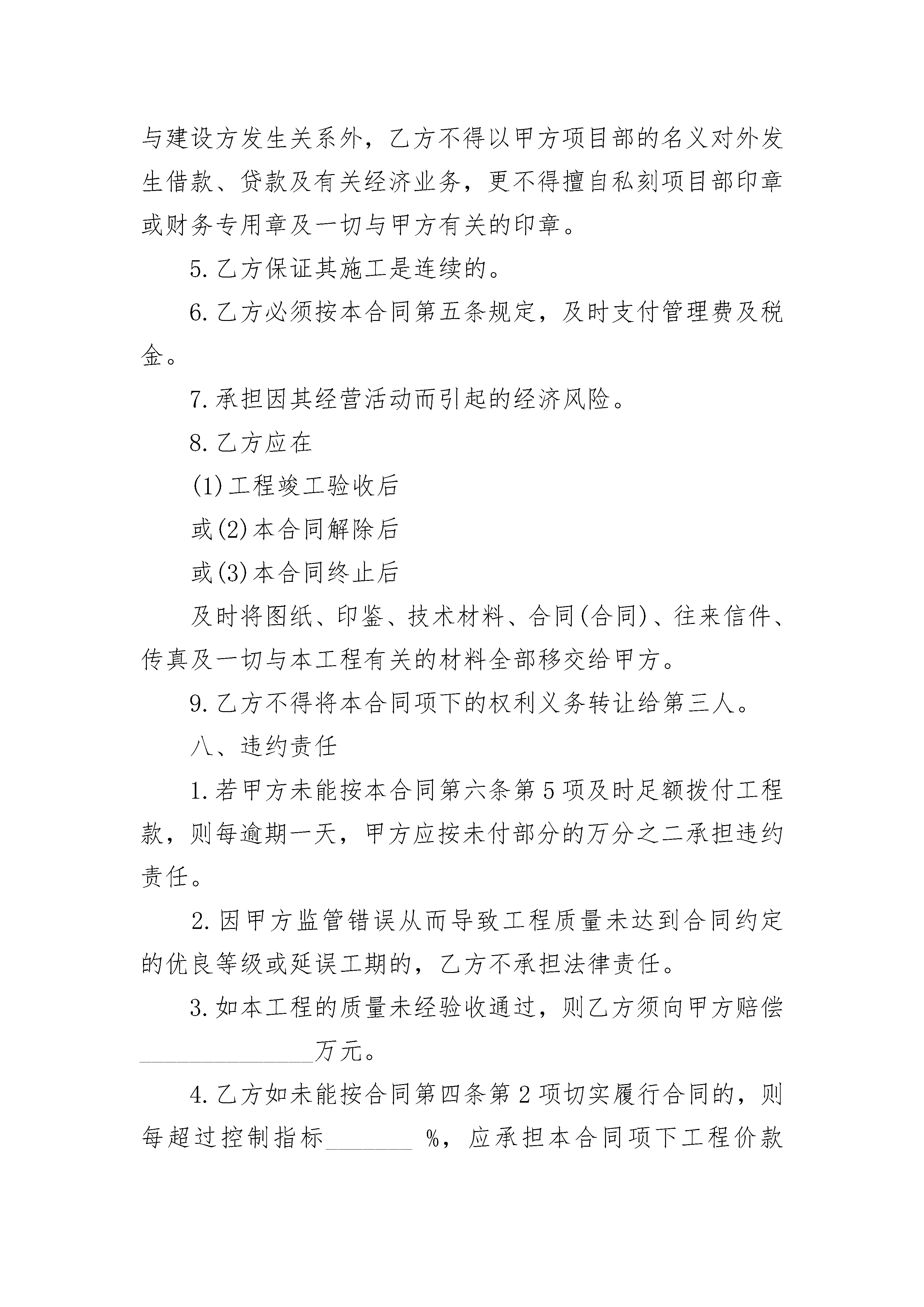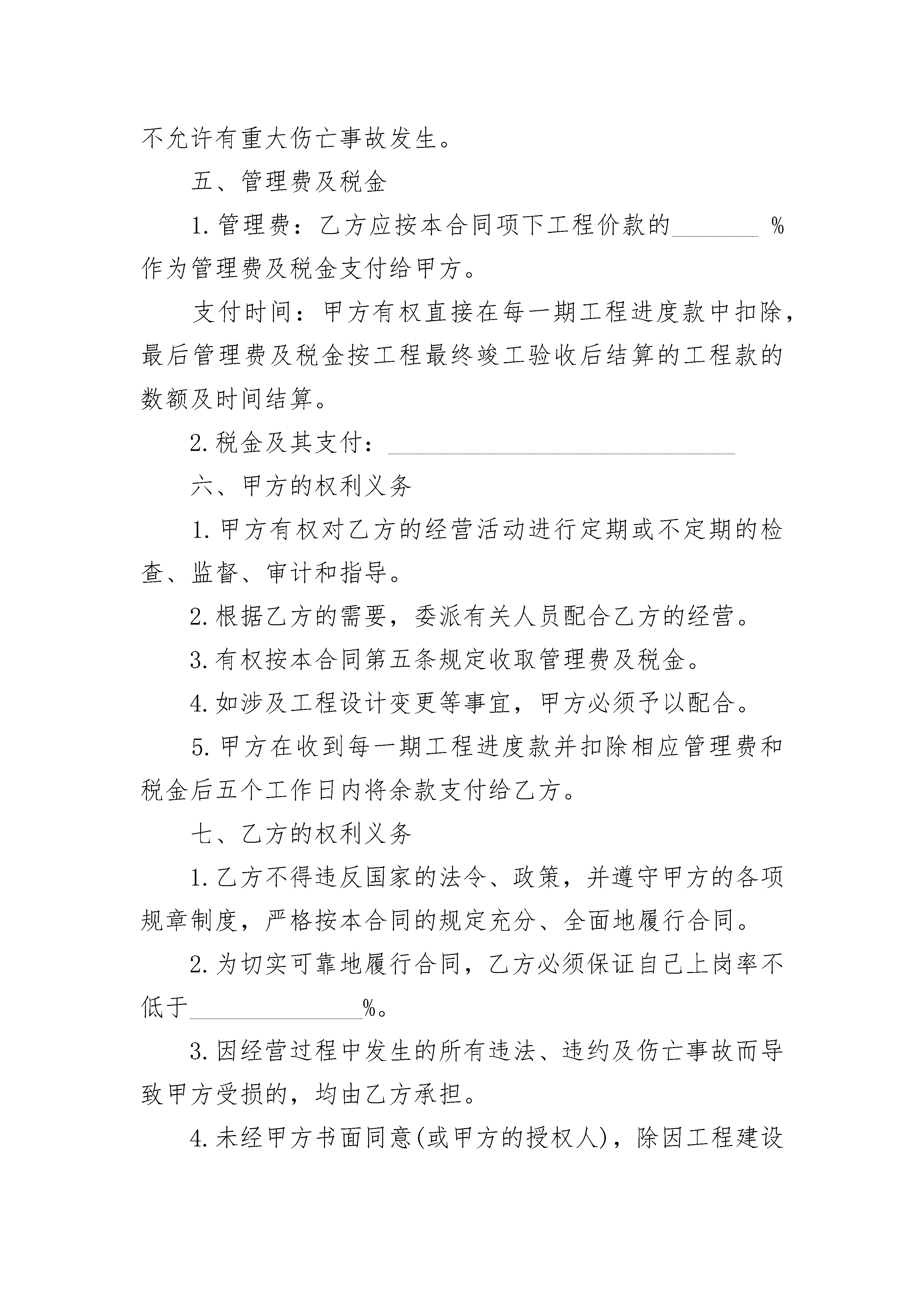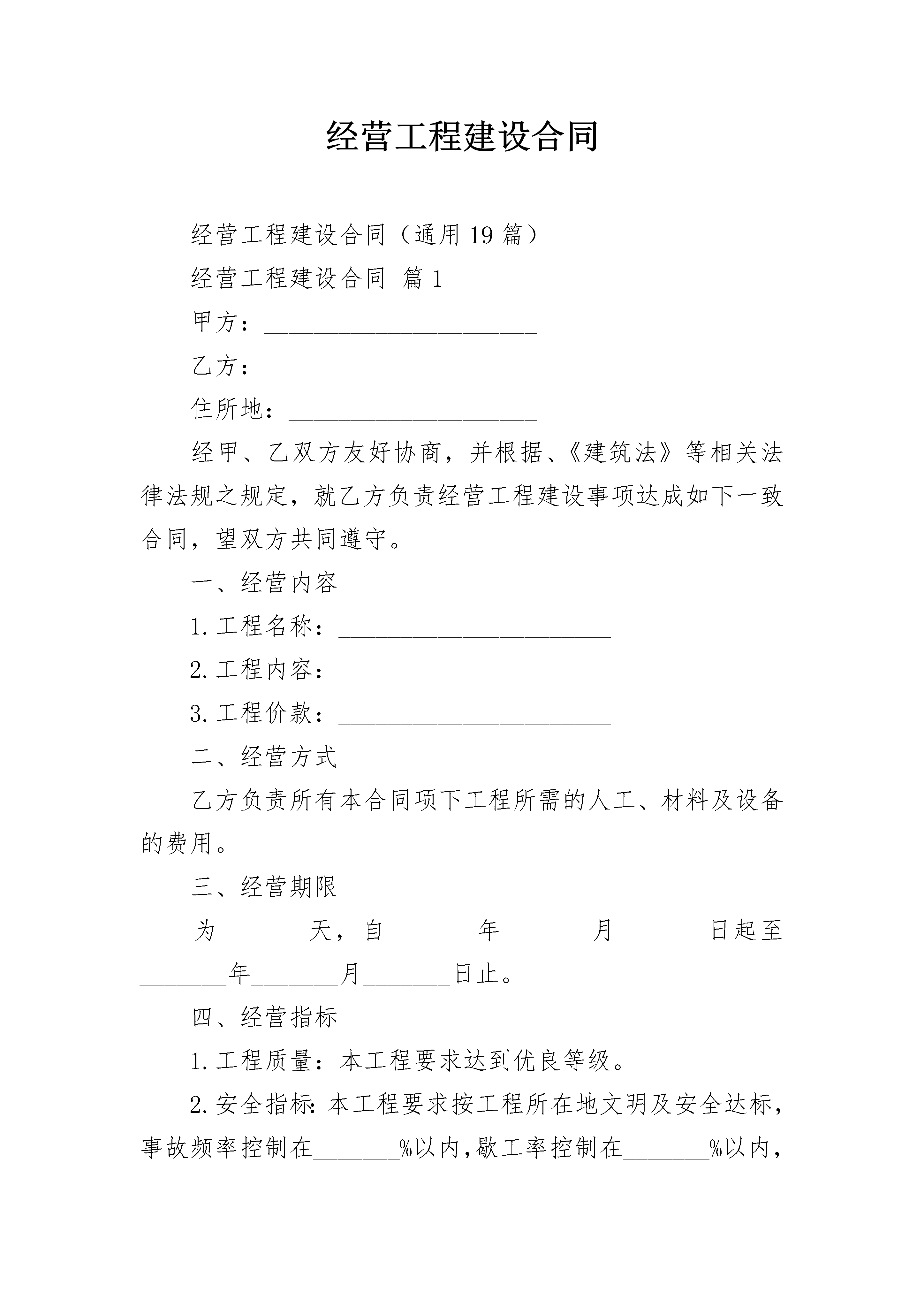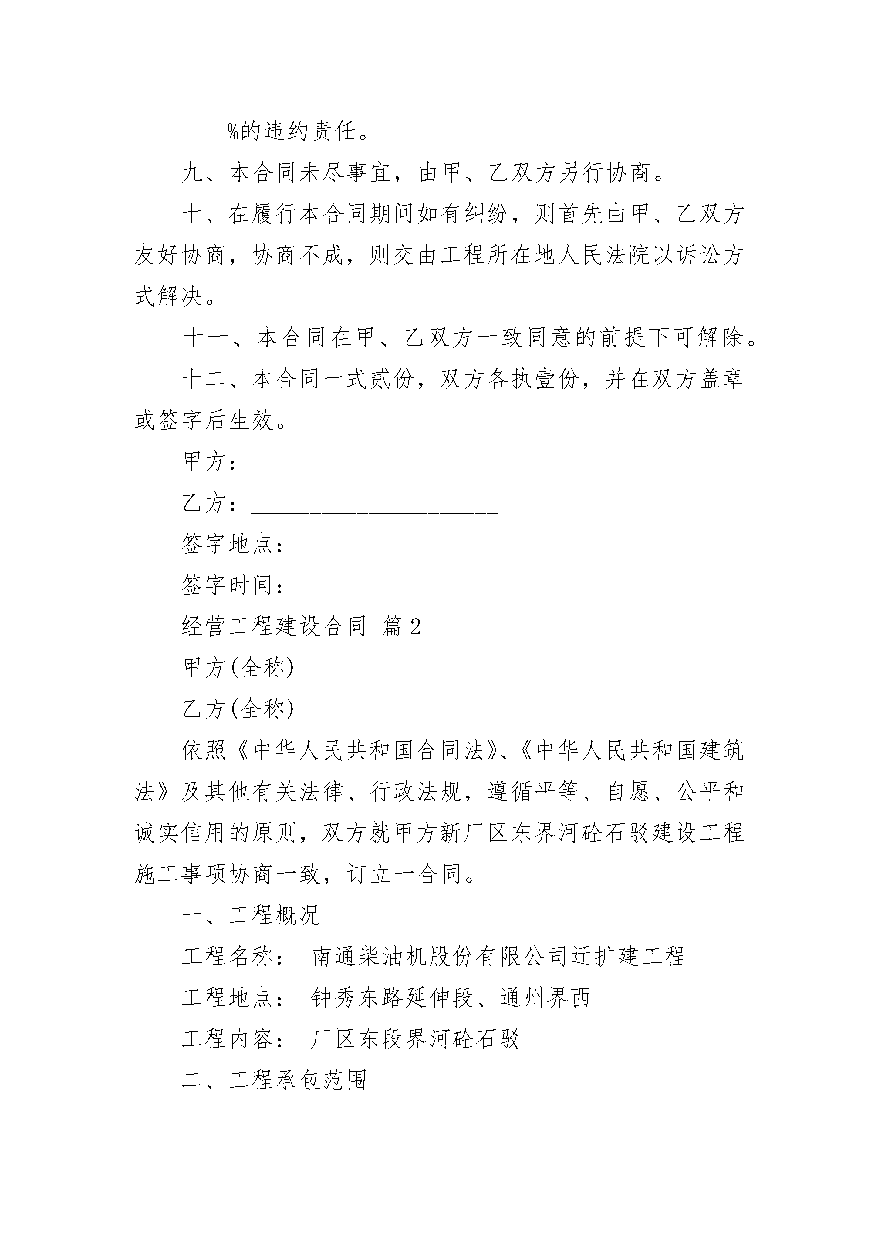 经营工程建设合同经营工程建设合同(通用19篇)经营工程建设合同篇1甲方:______________________乙方:______________________住所地:____________________经甲、乙双方友好协商,并根据、《建筑法》等相关法律法规之规定,就乙方负责经营工程建设事项达成如下一致合同,望双方共同遵守。一、经营内容1.工程名称:______________________2.工程内容:______________________3.工程价款:______________________二、经营方式乙方负责所有本合同项下工程所需的人工、材料及设备的费用。三、经营期限为_______天,自_______年_______月_______日起至_______年_______月_______日止。四、经营指标1.工程质量:本工程要求达到优良等级。2.安全指标:本工程要求按工程所在地文明及安全达标,事故频率控制在_______%以内,歇工率控制在_______%以内,不允许有重大伤亡事故发生。五、管理费及税金1.管理费:乙方应按本合同项下工程价款的_______%作为管理费及税金支付给甲方。支付时间:甲方有权直接在每一期工程进度款中扣除,最后管理费及税金按工程最终竣工验收后结算的工程款的数额及时间结算。2.税金及其支付:____________________________六、甲方的权利义务1.甲方有权对乙方的经营活动进行定期或不定期的检查、监督、审计和指导。2.根据乙方的需要,委派有关人员配合乙方的经营。3.有权按本合同第五条规定收取管理费及税金。4.如涉及工程设计变更等事宜,甲方必须予以配合。5.甲方在收到每一期工程进度款并扣除相应管理费和税金后五个工作日内将余款支付给乙方。七、乙方的权利义务1.乙方不得违反国家的法令、政策,并遵守甲方的各项规章制度,严格按本合同的规定充分、全面地履行合同。2.为切实可靠地履行合同,乙方必须保证自己上岗率不低于______________%。3.因经营过程中发生的所有违法、违约及伤亡事故而导致甲方受损的,均由乙方承担。4.未经甲方书面同意(或甲方的授权人),除因工程建设与建设方发生关系外,乙方不得以甲方项目部的名义对外发生借款、贷款及有关经济业务,更不得擅自私刻项目部印章或财务专用章及一切与甲方有关的印章。5.乙方保证其施工是连续的。6.乙方必须按本合同第五条规定,及时支付管理费及税金。7.承担因其经营活动而引起的经济风险。8.乙方应在(1)工程竣工验收后或(2)本合同解除后或(3)本合同终止后及时将图纸、印鉴、技术材料、合同(合同)、往来信件、传真及一切与本工程有关的材料全部移交给甲方。9.乙方不得将本合同项下的权利义务转让给第三人。八、违约责任1.若甲方未能按本合同第六条第5项及时足额拨付工程款,则每逾期一天,甲方应按未付部分的万分之二承担违约责任。2.因甲方监管错误从而导致工程质量未达到合同约定的优良等级或延误工期的,乙方不承担法律责任。3.如本工程的质量未经验收通过,则乙方须向甲方赔偿______________万元。4.乙方如未能按合同第四条第2项切实履行合同的,则每超过控制指标_______%,应承担本合同项下工程价款_______%的违约责任。九、本合同未尽事宜,由甲、乙双方另行协商。十、在履行本合同期间如有纠纷,则首先由甲、乙双方友好协商,协商不成,则交由工程所在地人民法院以诉讼方式解决。十一、本合同在甲、乙双方一致同意的前提下可解除。十二、本合同一式贰份,双方各执壹份,并在双方盖章或签字后生效。甲方:_____________________乙方:_____________________签字地点:_________________签字时间:_________________经营工程建设合同篇2甲方(全称)乙方(全称)依照《中华人民共和国合同法》、《中华人民共和国建筑法》及其他有关法律、行政法规,遵循平等、自愿、公平和诚实信用的原则,双方就甲方新厂区东界河砼石驳建设工程施工事项协商一致,订立一合同。一、工程概况工程名称:南通柴油机股份有限公司迁扩建工程工程地点:钟秀东路延伸段、通州界西工程内容:厂区东段界河砼石驳二、工程承包范围承包范围:砼石驳基础及板墙三、承包方式承包方式:包工包料四、合同工期开工日期:20xx年7月25日竣工日期:20xx年9月5日合同工期总日历天数40天五、质量标准工程质量标准:合格六、合同价款合同总价约1600,000(大写:壹佰陆拾万),工程量按实结算。实际总价待审计结算后下浮8%。七、甲方代表:八、乙方代表:九、甲方工作1、做好各环节的协调工作,使施工场地具备施工条件。2、将施工用电、水接至约定地点,保证施工期间的需要