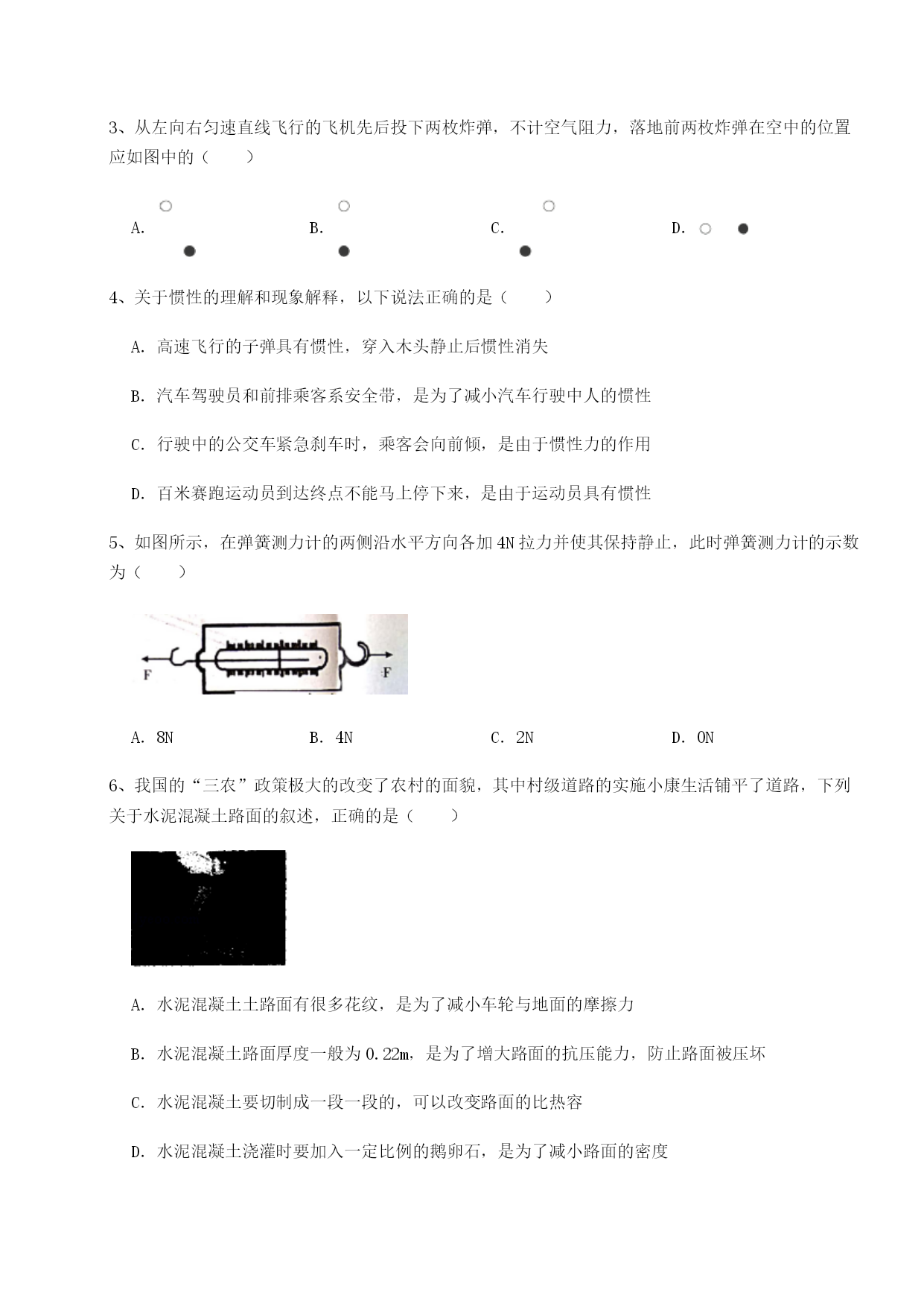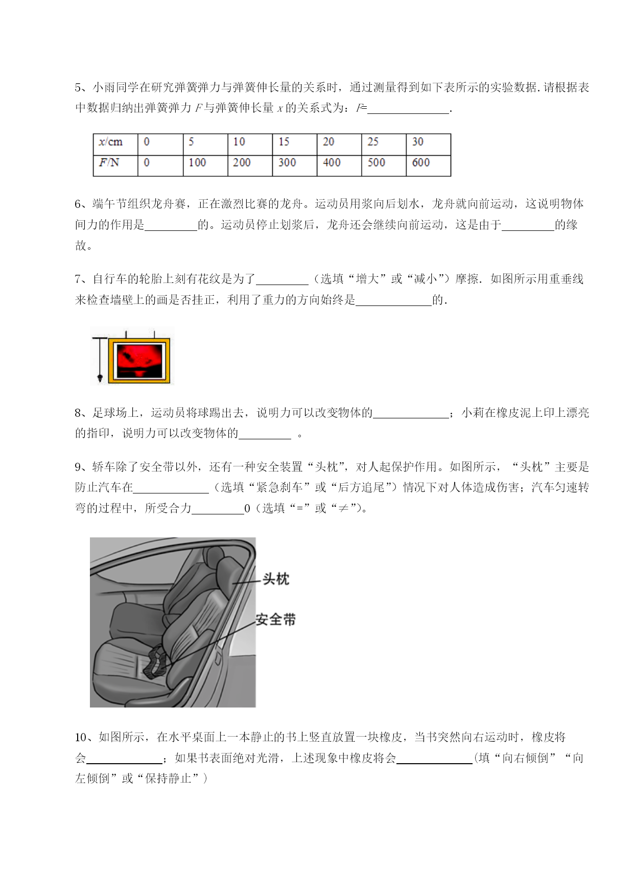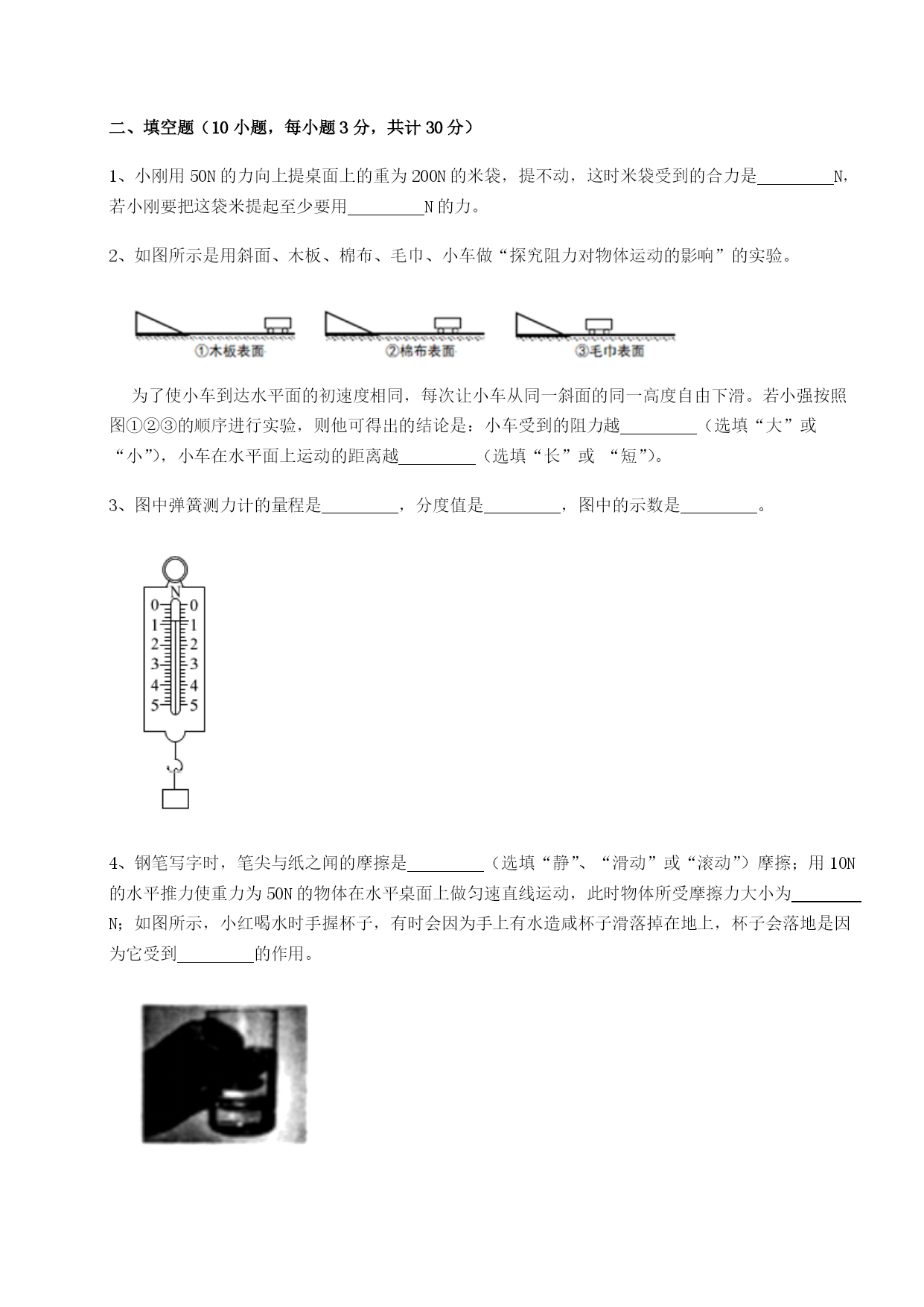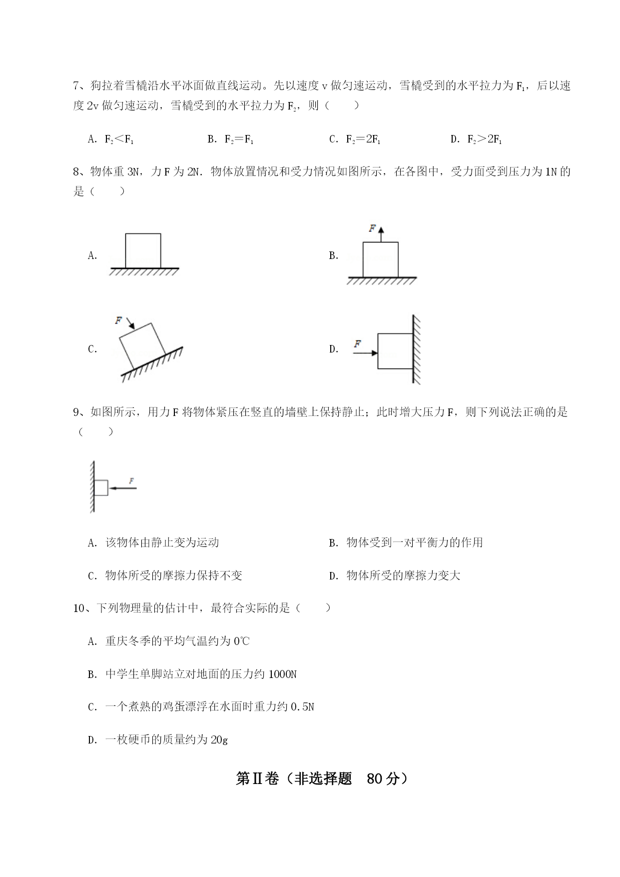 四川德阳外国语学校物理北师大版八年级(下册)第七章运动和力单元测评 考试时间:90分钟;命题人:教研组 考生注意: 1、本卷分第I卷(选择题)和第Ⅱ卷(非选择题)两部分,满分100分,考试时间90分钟 2、答卷前,考生务必用0.5毫米黑色签字笔将自己的姓名、班级填写在试卷规定位置上 3、答案必须写在试卷各个题目指定区域内相应的位置,如需改动,先划掉原来的答案,然后再写上新的答案;不准使用涂改液、胶带纸、修正带,不按以上要求作答的答案无效。 第I卷(选择题20分) 一、单选题(10小题,每小题2分,共计20分) 1、如图所示,小海用水平推力推着箱子在水平面地上滑动,下列操作肯定能减小箱子所受滑动摩擦力的是() A.减小推箱子的力 B.减小箱子与地面的接触面积 C.取出箱内的物品 D.增大箱子运动的速度 2、一个重20N的物体,受到20N竖直向上的拉力时,该物体() A.一定处于静止状态 B.一定处于匀速上升状态 C.一定处于匀速下降状态 D.以上三种情况都有可能 3、从左向右匀速直线飞行的飞机先后投下两枚炸弹,不计空气阻力,落地前两枚炸弹在空中的位置应如图中的() A. B. C. D. 4、关于惯性的理解和现象解释,以下说法正确的是() A.高速飞行的子弹具有惯性,穿入木头静止后惯性消失 B.汽车驾驶员和前排乘客系安全带,是为了减小汽车行驶中人的惯性 C.行驶中的公交车紧急刹车时,乘客会向前倾,是由于惯性力的作用 D.百米赛跑运动员到达终点不能马上停下来,是由于运动员具有惯性 5、如图所示,在弹簧测力计的两侧沿水平方向各加4N拉力并使其保持静止,此时弹簧测力计的示数为() A.8N B.4N C.2N D.0N 6、我国的“三农”政策极大的改变了农村的面貌,其中村级道路的实施小康生活铺平了道路,下列关于水泥混凝土路面的叙述,正确的是() A.水泥混凝土土路面有很多花纹,是为了减小车轮与地面的摩擦力 B.水泥混凝土路面厚度一般为0.22m,是为了增大路面的抗压能力,防止路面被压坏 C.水泥混凝土要切制成一段一段的,可以改变路面的比热容 D.水泥混凝土浇灌时要加入一定比例的鹅卵石,是为了减小路面的密度 7、狗拉着雪橇沿水平冰面做直线运动。先以速度v做匀速运动,雪橇受到的水平拉力为F1,后以速度2v做匀速运动,雪橇受到的水平拉力为F2,则() A.F2<F1 B.F2=F1 C.F2=2F1 D.F2>2F1 8、物体重3N,力F为2N.物体放置情况和受力情况如图所示,在各图中,受力面受到压力为1N的是() A. B. C. D. 9、如图所示,用力F将物体紧压在竖直的墙壁上保持静止;此时增大压力F,则下列说法正确的是() A.该物体由静止变为运动 B.物体受到一对平衡力的作用 C.物体所受的摩擦力保持不变 D.物体所受的摩擦力变大 10、下列物理量的估计中,最符合实际的是() A.重庆冬季的平均气温约为0℃ B.中学生单脚站立对地面的压力约1000N C.一个煮熟的鸡蛋漂浮在水面时重力约0.5N D.一枚硬币的质量约为20g 第Ⅱ卷(非选择题80分) 二、填空题(10小题,每小题3分,共计30分) 1、小刚用50N的力向上提桌面上的重为200N的米袋,提不动,这时米袋受到的合力是N,若小刚要把这袋米提起至少要用N的力。 2、如图所示是用斜面、木板、棉布、毛巾、小车做“探究阻力对物体运动的影响”的实验。 为了使小车到达水平面的初速度相同,每次让小车从同一斜面的同一高度自由下滑。若小强按照图①②③的顺序进行实验,则他可得出的结论是:小车受到的阻力越(选填“大”或“小”),小车在水平面上运动的距离越(选填“长”或“短”)。 3、图中弹簧测力计的量程是,分度值是,图中的示数是。 4、钢笔写字时,笔尖与纸之闻的摩擦是(选填“静”、“滑动”或“滚动”)摩擦;用10N的水平推力使重力为50N的物体在水平桌面上做匀速直线运动,此时物体所受摩擦力大小为N;如图所示,小红喝水时手握杯子,有时会因为手上有水造咸杯子滑落掉在地上,杯子会落地是因为它受到的作用。 5、小雨同学在研究弹簧弹力与弹簧伸长量的关系时,通过测量得到如下表所示的实验数据.请根据表中数据归纳出弹簧弹力F与弹簧伸长量x的关系式为:F=. 6、端午节组织龙舟赛,正在激烈比赛的龙舟。运动员用浆向后划水,龙舟就向前运动,这说明物体间力的作用是的。运动员停止划浆后,龙舟还会继续向前运动,这是由于的缘故。 7、自行车的轮胎上刻有花纹是为了(选填“增大”或“减小”)摩擦.如图所示用重垂线来检查墙壁上的画是否挂正,利用了重力的方向始终是的. 8、足球场上,运动员将球踢出去,说明力可以改变物体的;小莉在橡皮泥上印上漂亮的指印,说明力可以改变物体的。 9、轿车除了安全带以外,还有一种安全