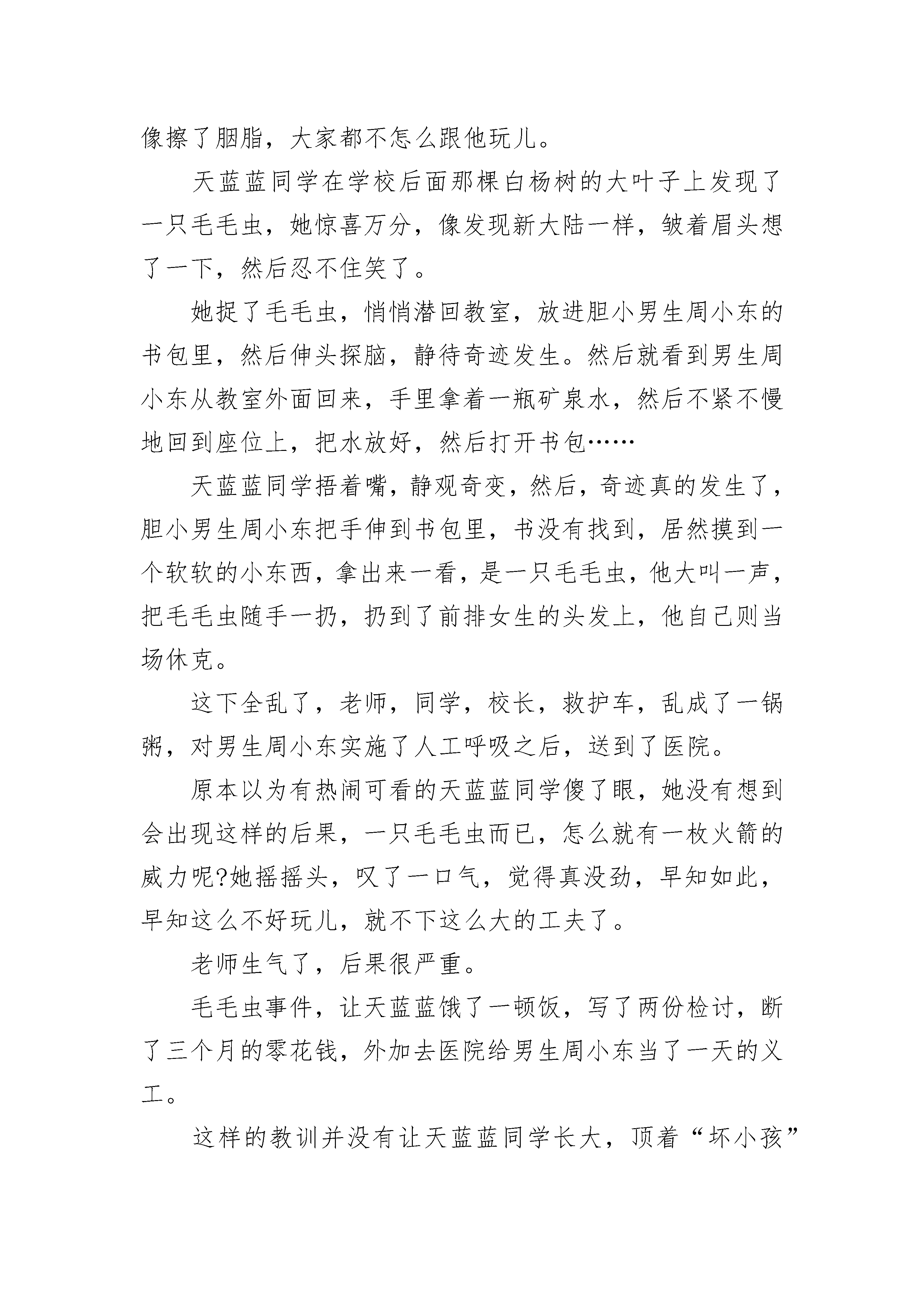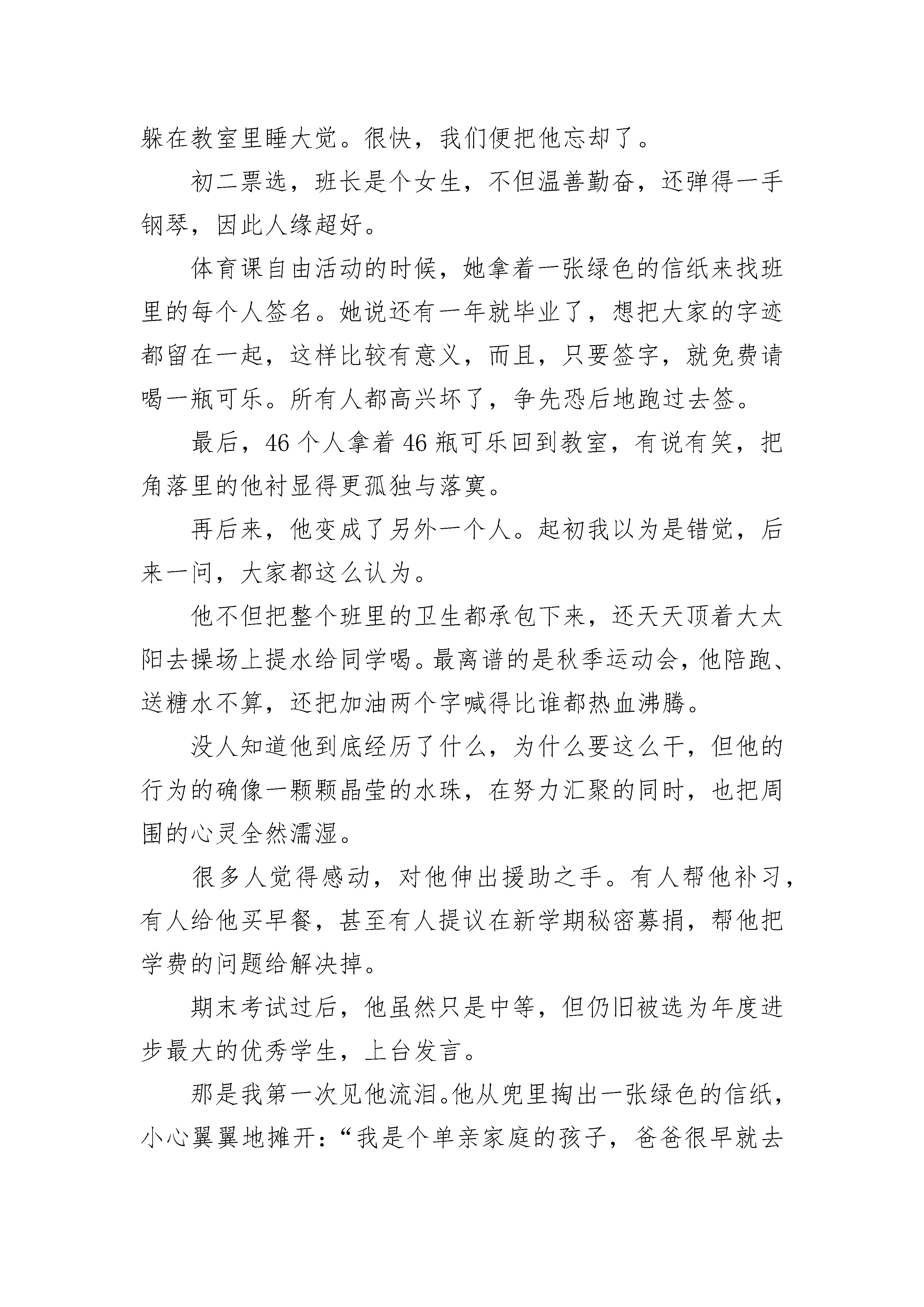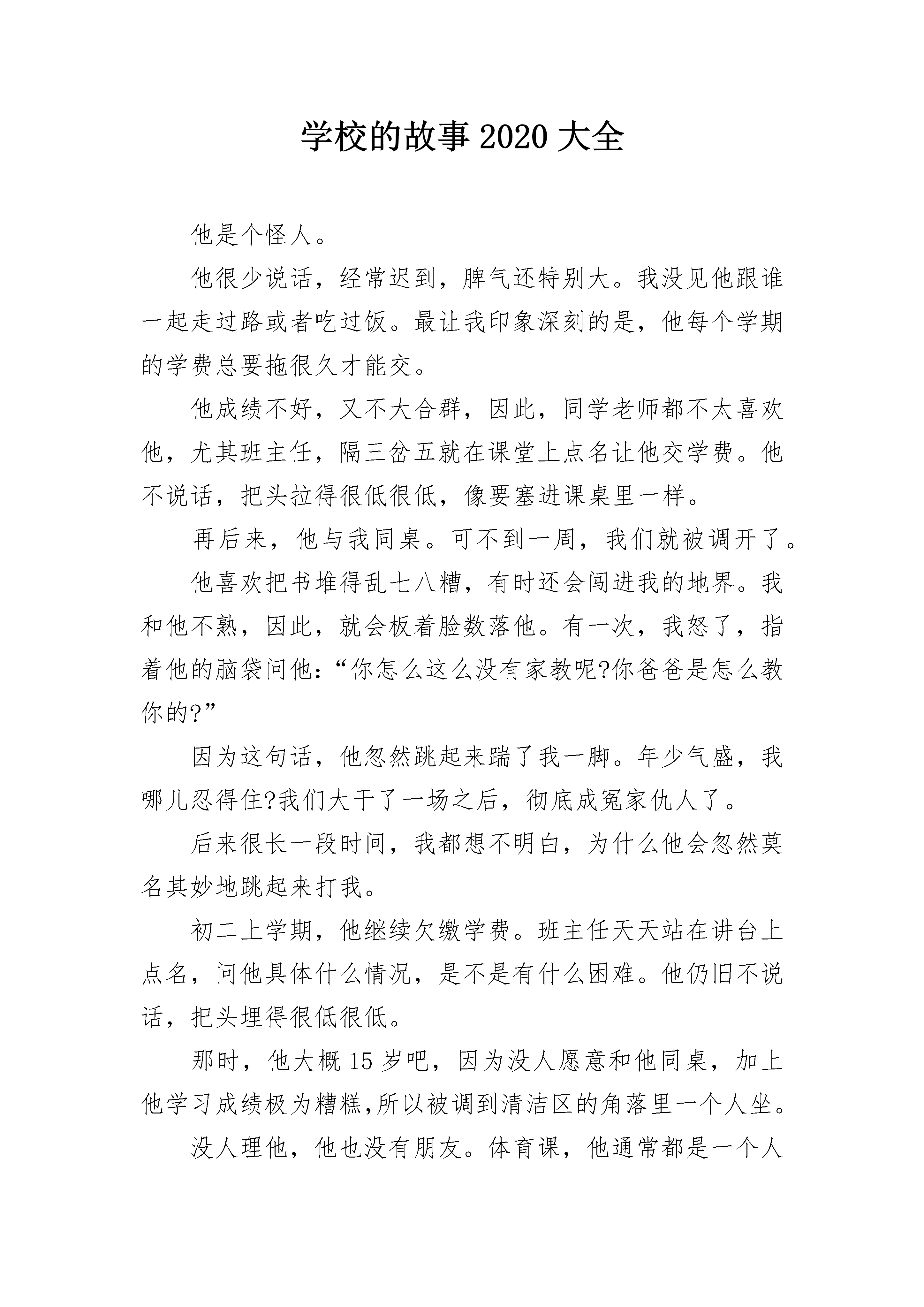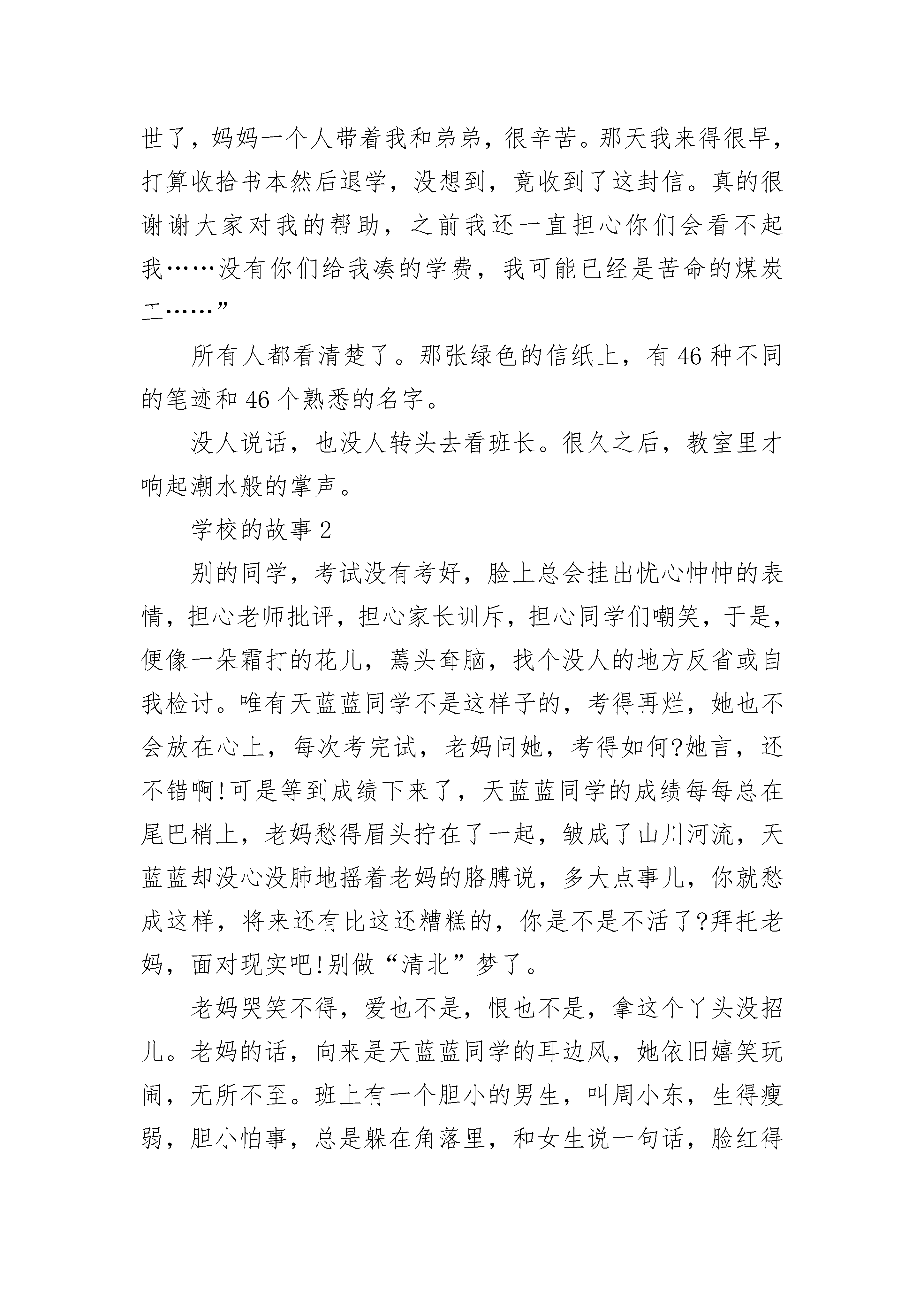 学校的故事2020大全他是个怪人。他很少说话,经常迟到,脾气还特别大。我没见他跟谁一起走过路或者吃过饭。最让我印象深刻的是,他每个学期的学费总要拖很久才能交。他成绩不好,又不大合群,因此,同学老师都不太喜欢他,尤其班主任,隔三岔五就在课堂上点名让他交学费。他不说话,把头拉得很低很低,像要塞进课桌里一样。再后来,他与我同桌。可不到一周,我们就被调开了。他喜欢把书堆得乱七八糟,有时还会闯进我的地界。我和他不熟,因此,就会板着脸数落他。有一次,我怒了,指着他的脑袋问他:“你怎么这么没有家教呢?你爸爸是怎么教你的?”因为这句话,他忽然跳起来踹了我一脚。年少气盛,我哪儿忍得住?我们大干了一场之后,彻底成冤家仇人了。后来很长一段时间,我都想不明白,为什么他会忽然莫名其妙地跳起来打我。初二上学期,他继续欠缴学费。班主任天天站在讲台上点名,问他具体什么情况,是不是有什么困难。他仍旧不说话,把头埋得很低很低。那时,他大概15岁吧,因为没人愿意和他同桌,加上他学习成绩极为糟糕,所以被调到清洁区的角落里一个人坐。没人理他,他也没有朋友。体育课,他通常都是一个人躲在教室里睡大觉。很快,我们便把他忘却了。初二票选,班长是个女生,不但温善勤奋,还弹得一手钢琴,因此人缘超好。体育课自由活动的时候,她拿着一张绿色的信纸来找班里的每个人签名。她说还有一年就毕业了,想把大家的字迹都留在一起,这样比较有意义,而且,只要签字,就免费请喝一瓶可乐。所有人都高兴坏了,争先恐后地跑过去签。最后,46个人拿着46瓶可乐回到教室,有说有笑,把角落里的他衬显得更孤独与落寞。再后来,他变成了另外一个人。起初我以为是错觉,后来一问,大家都这么认为。他不但把整个班里的卫生都承包下来,还天天顶着大太阳去操场上提水给同学喝。最离谱的是秋季运动会,他陪跑、送糖水不算,还把加油两个字喊得比谁都热血沸腾。没人知道他到底经历了什么,为什么要这么干,但他的行为的确像一颗颗晶莹的水珠,在努力汇聚的同时,也把周围的心灵全然濡湿。很多人觉得感动,对他伸出援助之手。有人帮他补习,有人给他买早餐,甚至有人提议在新学期秘密募捐,帮他把学费的问题给解决掉。期末考试过后,他虽然只是中等,但仍旧被选为年度进步最大的优秀学生,上台发言。那是我第一次见他流泪。他从兜里掏出一张绿色的信纸,小心翼翼地摊开:“我是个单亲家庭的孩子,爸爸很早就去世了,妈妈一个人带着我和弟弟,很辛苦。那天我来得很早,打算收拾书本然后退学,没想到,竟收到了这封信。真的很谢谢大家对我的帮助,之前我还一直担心你们会看不起我……没有你们给我凑的学费,我可能已经是苦命的煤炭工……”所有人都看清楚了。那张绿色的信纸上,有46种不同的笔迹和46个熟悉的名字。没人说话,也没人转头去看班长。很久之后,教室里才响起潮水般的掌声。学校的故事2别的同学,考试没有考好,脸上总会挂出忧心忡忡的表情,担心老师批评,担心家长训斥,担心同学们嘲笑,于是,便像一朵霜打的花儿,蔫头耷脑,找个没人的地方反省或自我检讨。唯有天蓝蓝同学不是这样子的,考得再烂,她也不会放在心上,每次考完试,老妈问她,考得如何?她言,还不错啊!可是等到成绩下来了,天蓝蓝同学的成绩每每总在尾巴梢上,老妈愁得眉头拧在了一起,皱成了山川河流,天蓝蓝却没心没肺地摇着老妈的胳膊说,多大点事儿,你就愁成这样,将来还有比这还糟糕的,你是不是不活了?拜托老妈,面对现实吧!别做“清北”梦了。老妈哭笑不得,爱也不是,恨也不是,拿这个丫头没招儿。老妈的话,向来是天蓝蓝同学的耳边风,她依旧嬉笑玩闹,无所不至。班上有一个胆小的男生,叫周小东,生得瘦弱,胆小怕事,总是躲在角落里,和女生说一句话,脸红得像擦了胭脂,大家都不怎么跟他玩儿。天蓝蓝同学在学校后面那棵白杨树的大叶子上发现了一只毛毛虫,她惊喜万分,像发现新大陆一样,皱着眉头想了一下,然后忍不住笑了。她捉了毛毛虫,悄悄潜回教室,放进胆小男生周小东的书包里,然后伸头探脑,静待奇迹发生。然后就看到男生周小东从教室外面回来,手里拿着一瓶矿泉水,然后不紧不慢地回到座位上,把水放好,然后打开书包……天蓝蓝同学捂着嘴,静观奇变,然后,奇迹真的发生了,胆小男生周小东把手伸到书包里,书没有找到,居然摸到一个软软的小东西,拿出来一看,是一只毛毛虫,他大叫一声,把毛毛虫随手一扔,扔到了前排女生的头发上,他自己则当场休克。这下全乱了,老师,同学,校长,救护车,乱成了一锅粥,对男生周小东实施了人工呼吸之后,送到了医院。原本以为有热闹可看的天蓝蓝同学傻了眼,她没有想到会出现这样的后果,一只毛毛虫而已,怎么就有一枚火箭的威力呢?她摇摇头,叹了一口气,觉得真没劲,早知如此,早知这么不好玩儿,就不下这么大的工夫了。老师生气了,后果很严重。毛毛虫事件,让天蓝蓝饿了一顿饭,写了两份检讨,断了三个月的零花钱,外加去