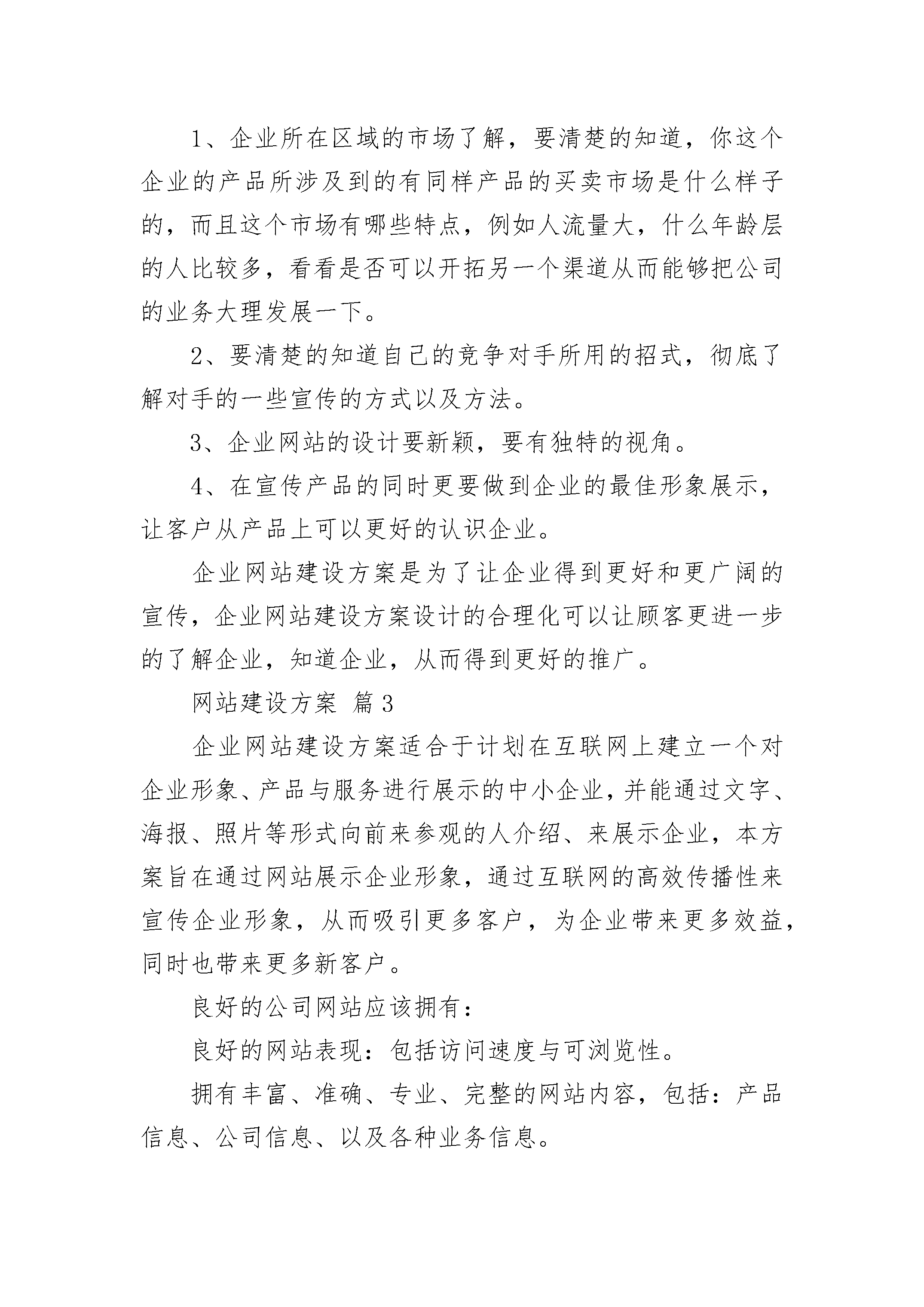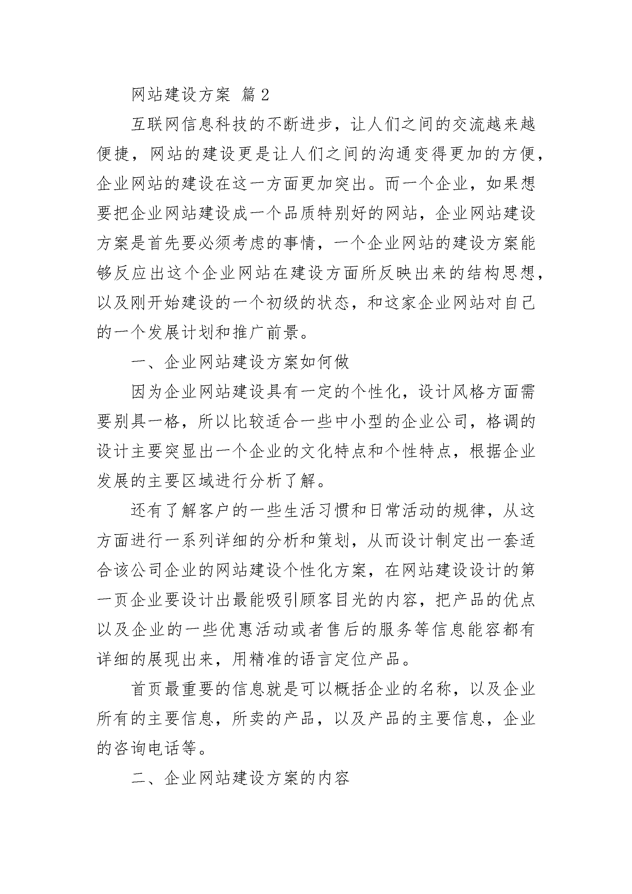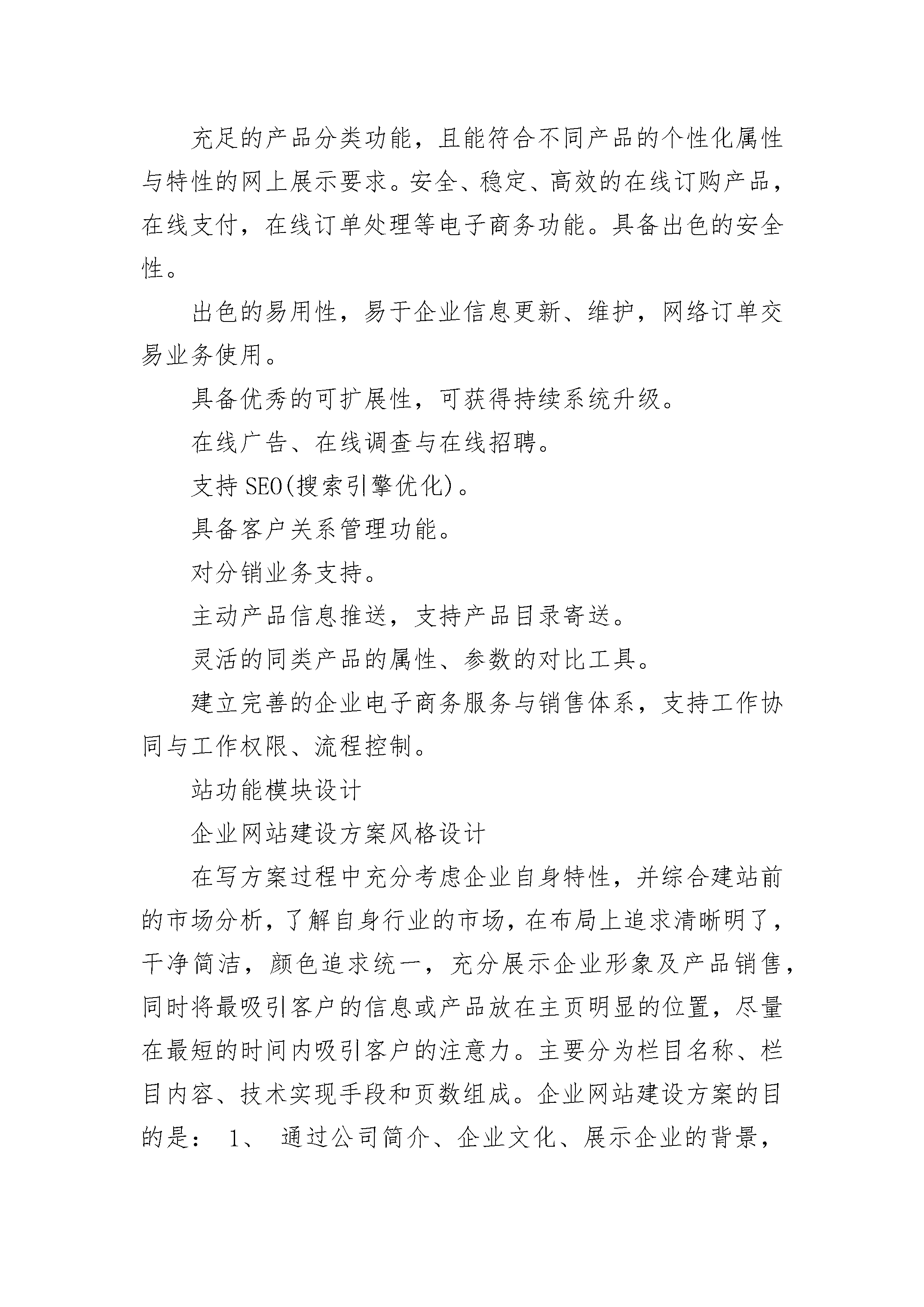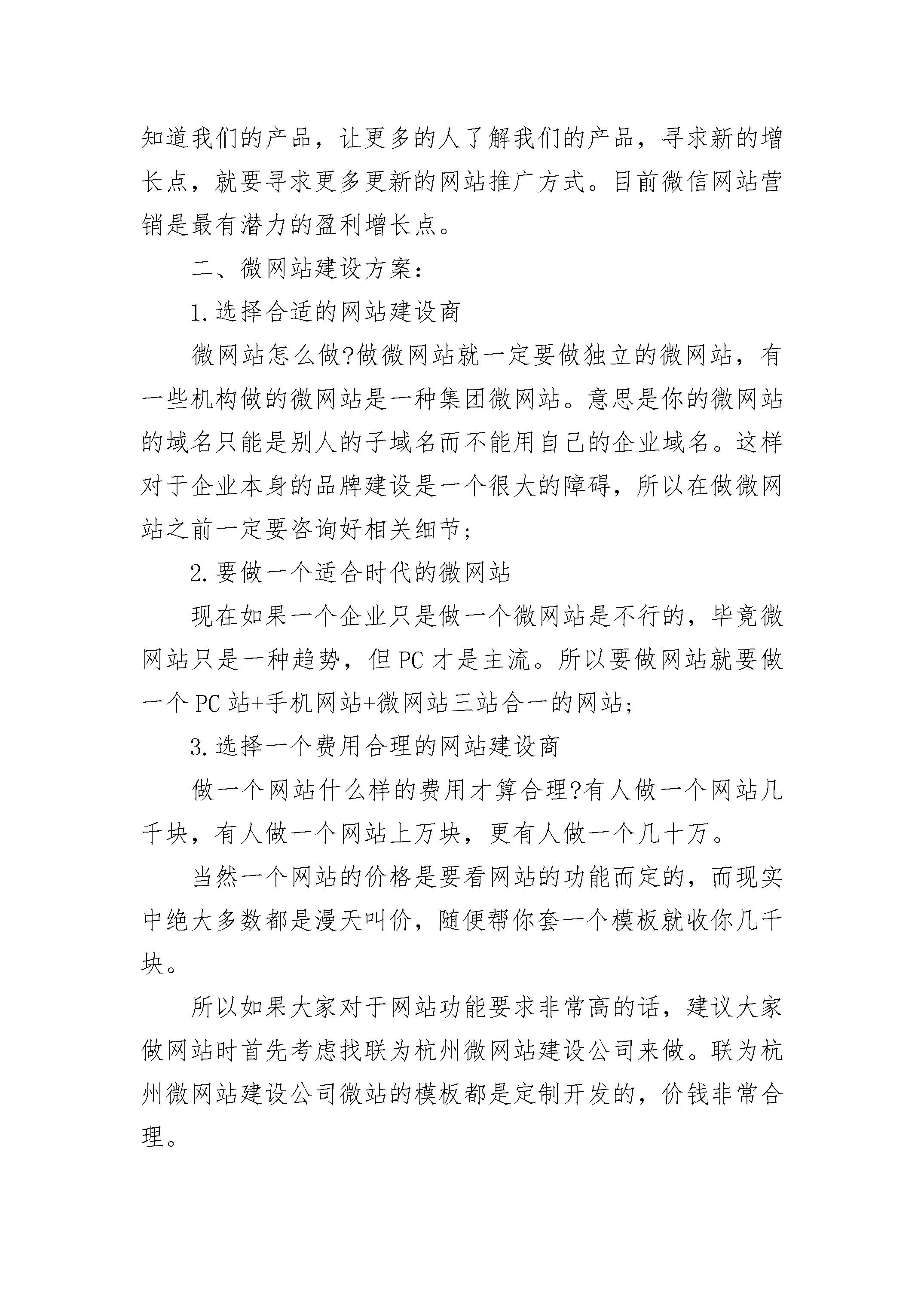 网站建设方案网站建设方案(精选11篇)网站建设方案篇1非常好的微网站建设策划方案,联为杭州微网站建设公司不能说是专业的,但我们已做了14年,各大企业、各大行业品牌微网站我们做了太多。非常好的微网站建设策划方案在此分享给大家,相信您的企业一定需要。一、微信网站特征:1.推广成本低廉2.定位精准3.方式多元化4.方式人性化5.信息到达率高;微信网站建设现状:微信网站是基于庞大的微信用户而建立的网站。目前微信用户已经达到6亿,并且有不断增长的趋势。有一些人错把微信网站认为就是微信公众平台,其实微信网站并不是微信公众平台,他是一种基于手机网站,和微信公众平台绑定在一起的独立网站。微信将成为真正跟生活相关的平台,过去还没有这样从线上到走出家门的生活平台出现,从这个角度来说,微信将成为生活的基础设施。为什么要做微信网站:科技越来越发达,通讯日益进步,微信是目前最流行的通讯工具之一。行业竞争日益激烈,要把自己的品牌打出去,要占有市场,提高市场占有率塑造自己的品牌,让更多的人知道我们的产品,让更多的人了解我们的产品,寻求新的增长点,就要寻求更多更新的网站推广方式。目前微信网站营销是最有潜力的盈利增长点。二、微网站建设方案:1.选择合适的网站建设商微网站怎么做?做微网站就一定要做独立的微网站,有一些机构做的微网站是一种集团微网站。意思是你的微网站的域名只能是别人的子域名而不能用自己的企业域名。这样对于企业本身的品牌建设是一个很大的障碍,所以在做微网站之前一定要咨询好相关细节;2.要做一个适合时代的微网站现在如果一个企业只是做一个微网站是不行的,毕竟微网站只是一种趋势,但PC才是主流。所以要做网站就要做一个PC站+手机网站+微网站三站合一的网站;3.选择一个费用合理的网站建设商做一个网站什么样的费用才算合理?有人做一个网站几千块,有人做一个网站上万块,更有人做一个几十万。当然一个网站的价格是要看网站的功能而定的,而现实中绝大多数都是漫天叫价,随便帮你套一个模板就收你几千块。所以如果大家对于网站功能要求非常高的话,建议大家做网站时首先考虑找联为杭州微网站建设公司来做。联为杭州微网站建设公司微站的模板都是定制开发的,价钱非常合理。网站建设方案篇2互联网信息科技的不断进步,让人们之间的交流越来越便捷,网站的建设更是让人们之间的沟通变得更加的方便,企业网站的建设在这一方面更加突出。而一个企业,如果想要把企业网站建设成一个品质特别好的网站,企业网站建设方案是首先要必须考虑的事情,一个企业网站的建设方案能够反应出这个企业网站在建设方面所反映出来的结构思想,以及刚开始建设的一个初级的状态,和这家企业网站对自己的一个发展计划和推广前景。一、企业网站建设方案如何做因为企业网站建设具有一定的个性化,设计风格方面需要别具一格,所以比较适合一些中小型的企业公司,格调的设计主要突显出一个企业的文化特点和个性特点,根据企业发展的主要区域进行分析了解。还有了解客户的一些生活习惯和日常活动的规律,从这方面进行一系列详细的分析和策划,从而设计制定出一套适合该公司企业的网站建设个性化方案,在网站建设设计的第一页企业要设计出最能吸引顾客目光的内容,把产品的优点以及企业的一些优惠活动或者售后的服务等信息能容都有详细的展现出来,用精准的语言定位产品。首页最重要的信息就是可以概括企业的名称,以及企业所有的主要信息,所卖的产品,以及产品的主要信息,企业的咨询电话等。二、企业网站建设方案的内容1、企业所在区域的市场了解,要清楚的知道,你这个企业的产品所涉及到的有同样产品的买卖市场是什么样子的,而且这个市场有哪些特点,例如人流量大,什么年龄层的人比较多,看看是否可以开拓另一个渠道从而能够把公司的业务大理发展一下。2、要清楚的知道自己的竞争对手所用的招式,彻底了解对手的一些宣传的方式以及方法。3、企业网站的设计要新颖,要有独特的视角。4、在宣传产品的同时更要做到企业的最佳形象展示,让客户从产品上可以更好的认识企业。企业网站建设方案是为了让企业得到更好和更广阔的宣传,企业网站建设方案设计的合理化可以让顾客更进一步的了解企业,知道企业,从而得到更好的推广。网站建设方案篇3企业网站建设方案适合于计划在互联网上建立一个对企业形象、产品与服务进行展示的中小企业,并能通过文字、海报、照片等形式向前来参观的人介绍、来展示企业,本方案旨在通过网站展示企业形象,通过互联网的高效传播性来宣传企业形象,从而吸引更多客户,为企业带来更多效益,同时也带来更多新客户。良好的公司网站应该拥有:良好的网站表现:包括访问速度与可浏览性。拥有丰富、准确、专业、完整的网站内容,包括:产品信息、公司信息、以及各种业务信息。充足的产品分类功能,且能符合不同产品的个性化属性与特性的网上展示要求。安全、稳定、高效的在线订购产品,在线支付,在线