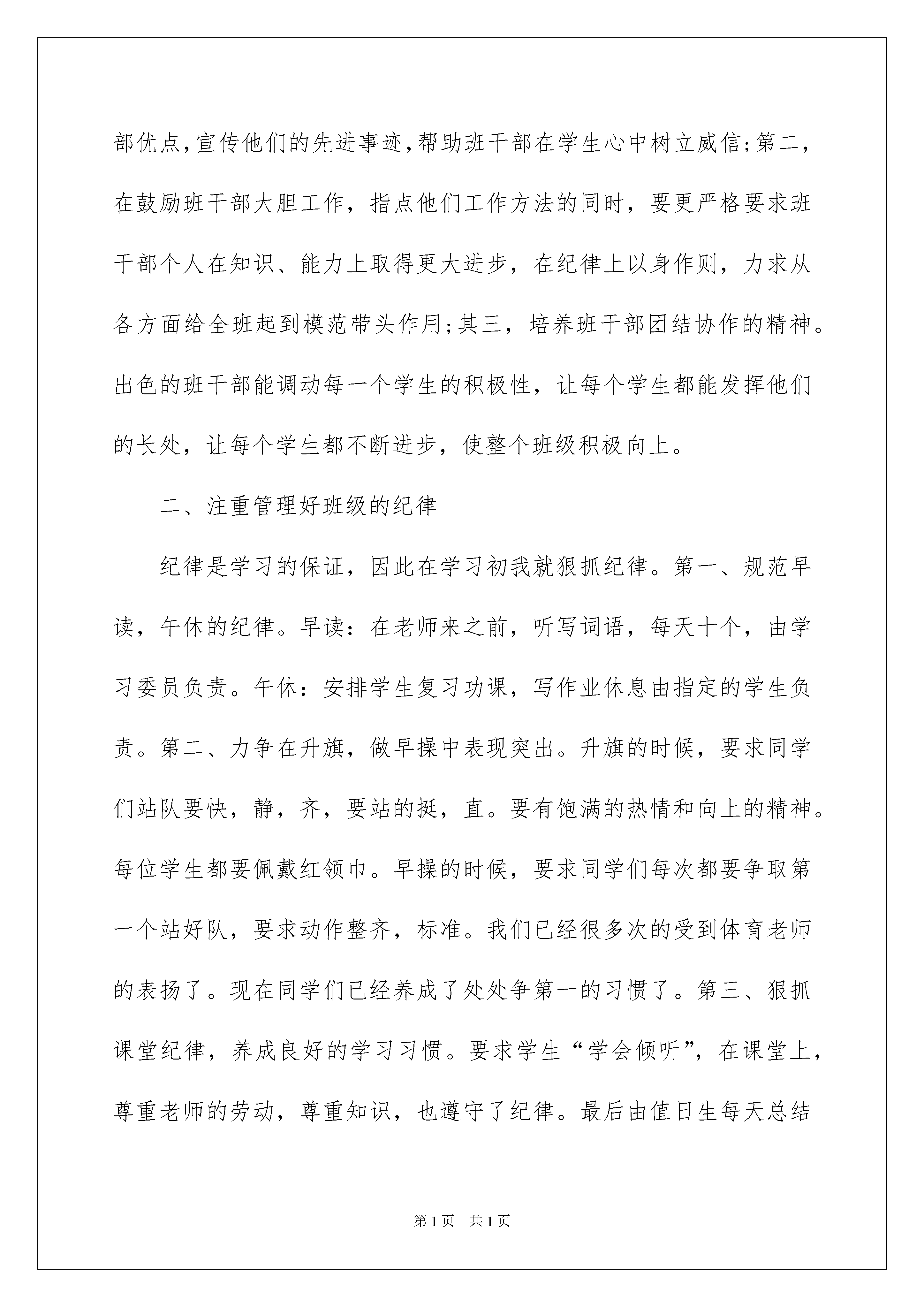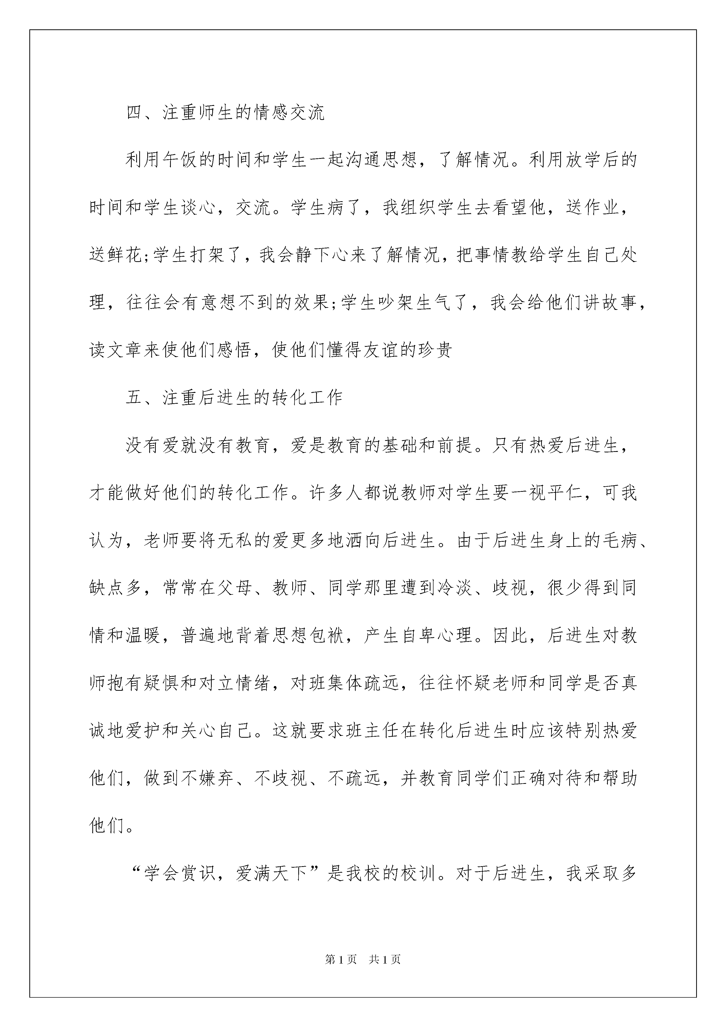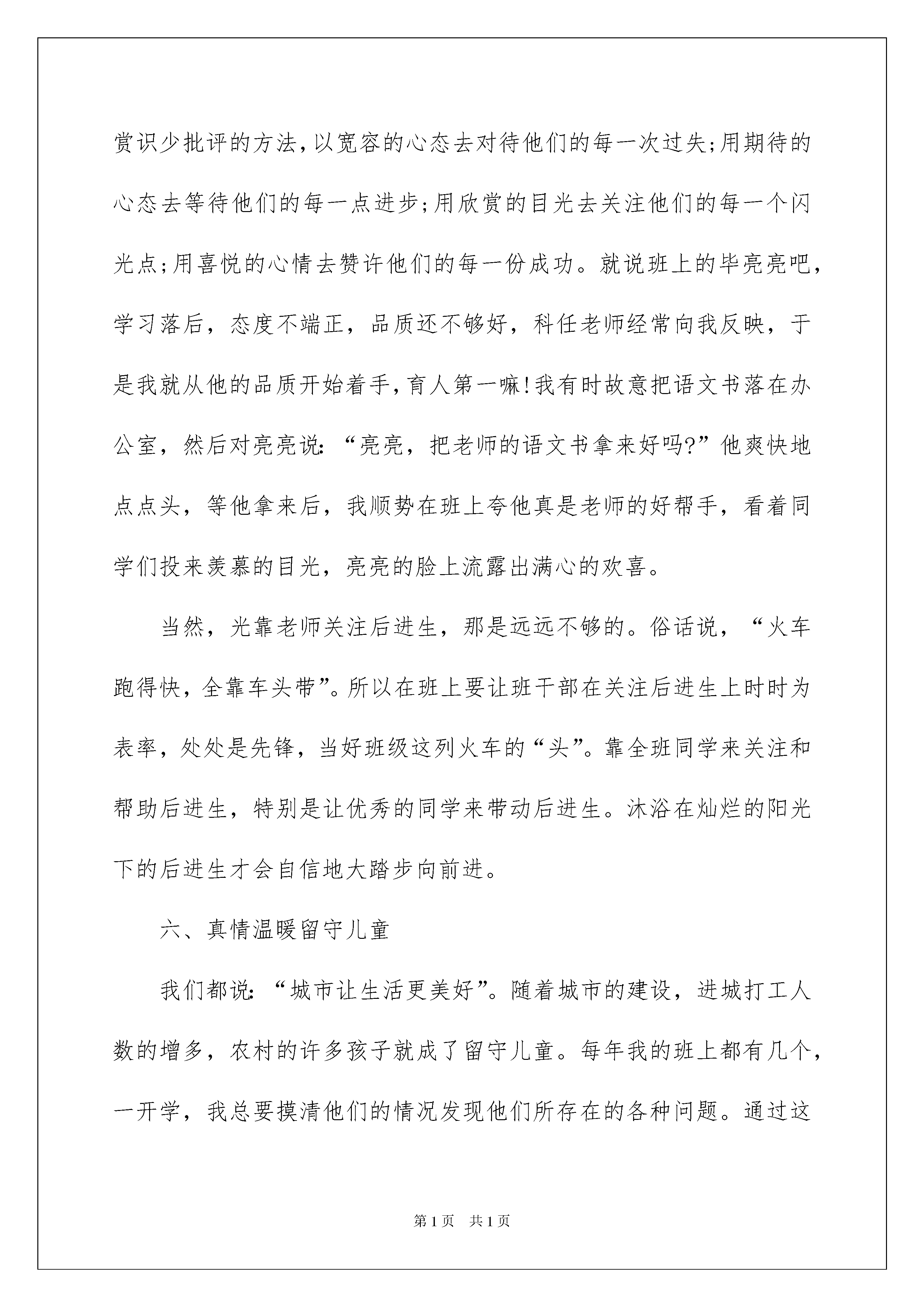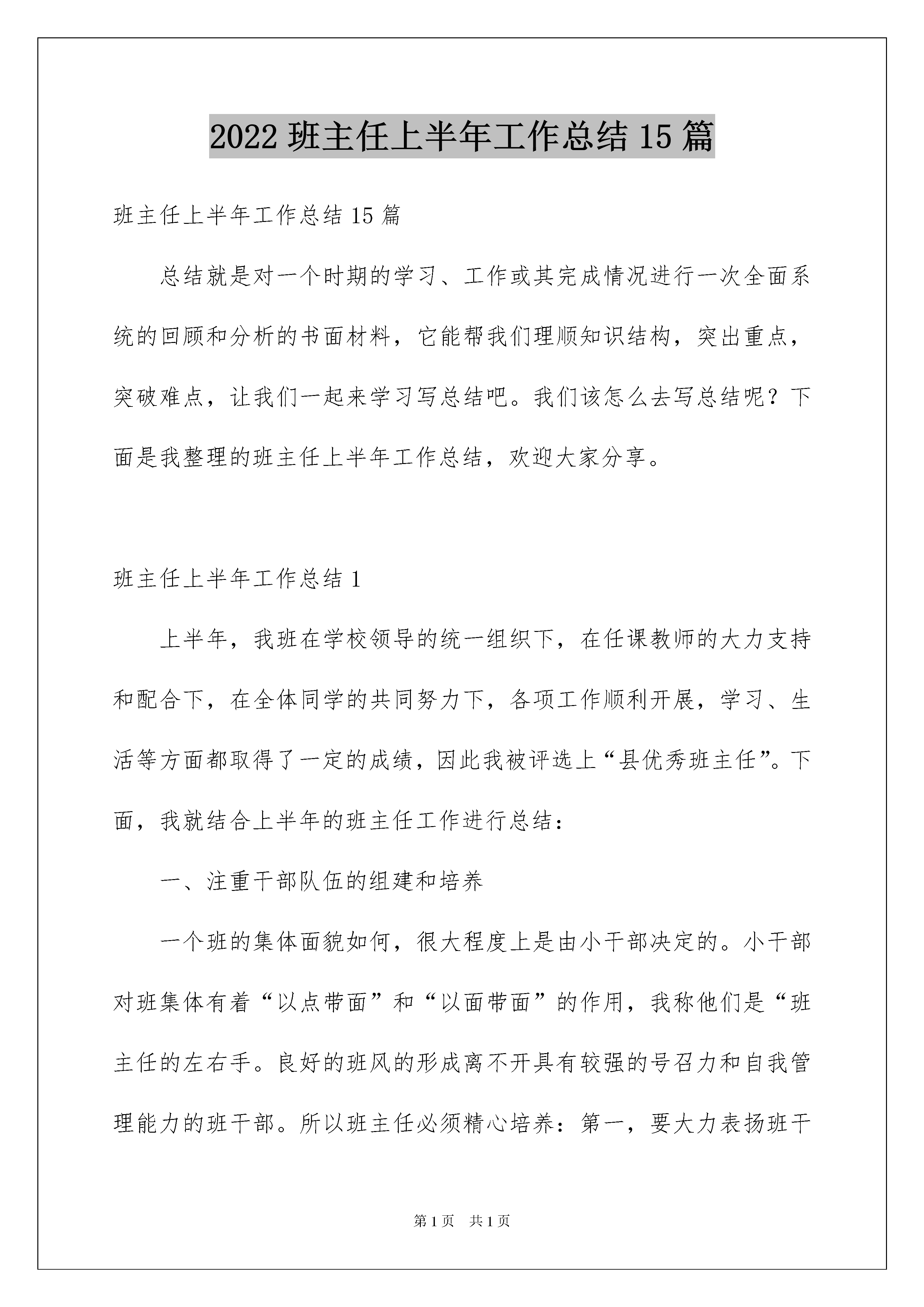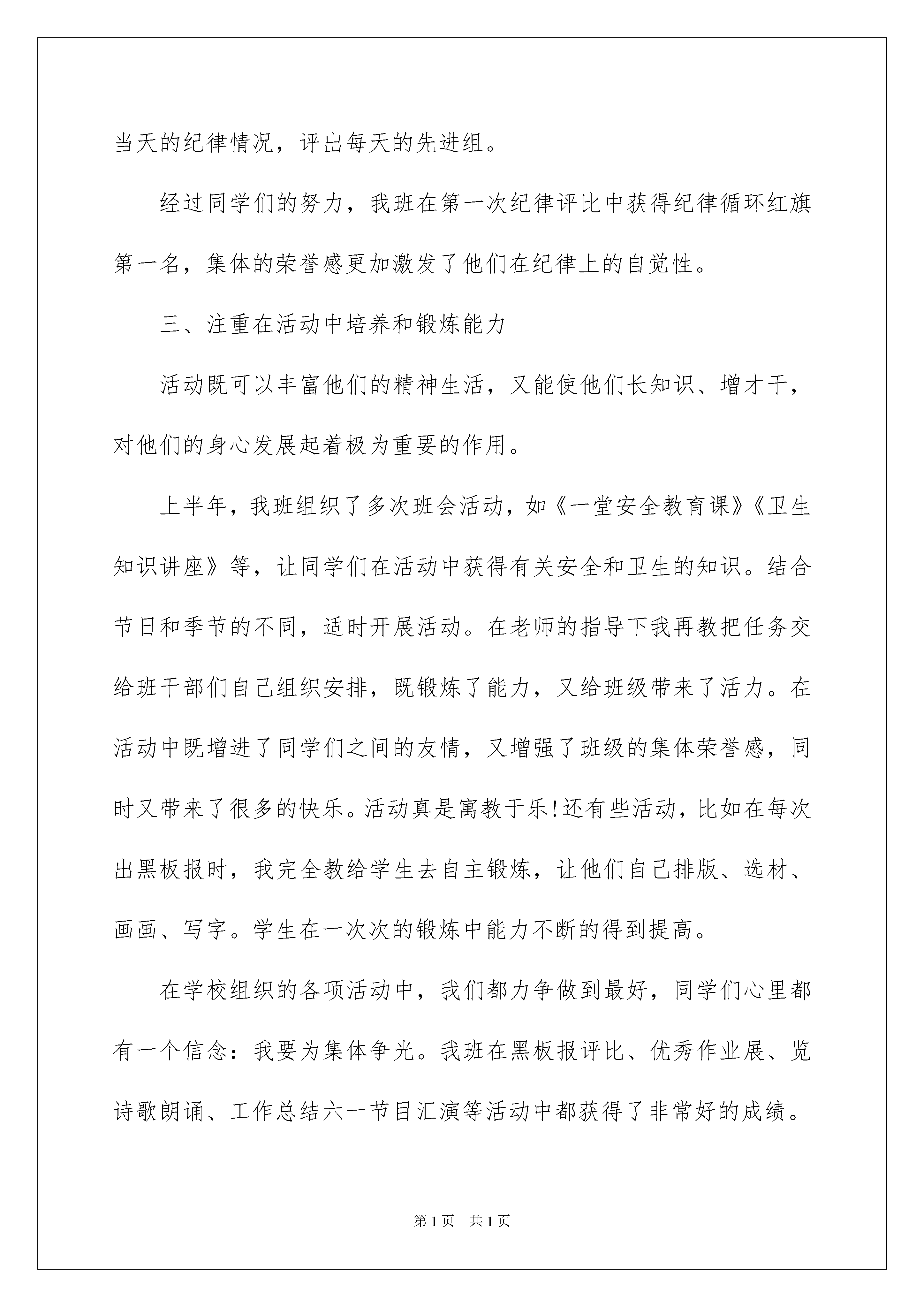 2022班主任上半年工作总结15篇班主任上半年工作总结15篇总结就是对一个时期的学习、工作或其完成情况进行一次全面系统的回顾和分析的书面材料,它能帮我们理顺知识结构,突出重点,突破难点,让我们一起来学习写总结吧。我们该怎么去写总结呢?下面是我整理的班主任上半年工作总结,欢迎大家分享。班主任上半年工作总结1上半年,我班在学校领导的统一组织下,在任课教师的大力支持和配合下,在全体同学的共同努力下,各项工作顺利开展,学习、生活等方面都取得了一定的成绩,因此我被评选上“县优秀班主任”。下面,我就结合上半年的班主任工作进行总结:一、注重干部队伍的组建和培养一个班的集体面貌如何,很大程度上是由小干部决定的。小干部对班集体有着“以点带面”和“以面带面”的作用,我称他们是“班主任的左右手。良好的班风的形成离不开具有较强的号召力和自我管理能力的班干部。所以班主任必须精心培养:第一,要大力表扬班干部优点,宣传他们的先进事迹,帮助班干部在学生心中树立威信;第二,在鼓励班干部大胆工作,指点他们工作方法的同时,要更严格要求班干部个人在知识、能力上取得更大进步,在纪律上以身作则,力求从各方面给全班起到模范带头作用;其三,培养班干部团结协作的精神。出色的班干部能调动每一个学生的积极性,让每个学生都能发挥他们的长处,让每个学生都不断进步,使整个班级积极向上。二、注重管理好班级的纪律纪律是学习的保证,因此在学习初我就狠抓纪律。第一、规范早读,午休的纪律。早读:在老师来之前,听写词语,每天十个,由学习委员负责。午休:安排学生复习功课,写作业休息由指定的学生负责。第二、力争在升旗,做早操中表现突出。升旗的时候,要求同学们站队要快,静,齐,要站的挺,直。要有饱满的热情和向上的精神。每位学生都要佩戴红领巾。早操的时候,要求同学们每次都要争取第一个站好队,要求动作整齐,标准。我们已经很多次的受到体育老师的表扬了。现在同学们已经养成了处处争第一的习惯了。第三、狠抓课堂纪律,养成良好的学习习惯。要求学生“学会倾听”,在课堂上,尊重老师的劳动,尊重知识,也遵守了纪律。最后由值日生每天总结当天的纪律情况,评出每天的先进组。经过同学们的努力,我班在第一次纪律评比中获得纪律循环红旗第一名,集体的荣誉感更加激发了他们在纪律上的自觉性。三、注重在活动中培养和锻炼能力活动既可以丰富他们的精神生活,又能使他们长知识、增才干,对他们的身心发展起着极为重要的作用。上半年,我班组织了多次班会活动,如《一堂安全教育课》《卫生知识讲座》等,让同学们在活动中获得有关安全和卫生的知识。结合节日和季节的不同,适时开展活动。在老师的指导下我再教把任务交给班干部们自己组织安排,既锻炼了能力,又给班级带来了活力。在活动中既增进了同学们之间的友情,又增强了班级的集体荣誉感,同时又带来了很多的快乐。活动真是寓教于乐!还有些活动,比如在每次出黑板报时,我完全教给学生去自主锻炼,让他们自己排版、选材、画画、写字。学生在一次次的锻炼中能力不断的得到提高。在学校组织的各项活动中,我们都力争做到最好,同学们心里都有一个信念:我要为集体争光。我班在黑板报评比、优秀作业展、览诗歌朗诵、工作总结六一节目汇演等活动中都获得了非常好的成绩。四、注重师生的情感交流利用午饭的时间和学生一起沟通思想,了解情况。利用放学后的时间和学生谈心,交流。学生病了,我组织学生去看望他,送作业,送鲜花;学生打架了,我会静下心来了解情况,把事情教给学生自己处理,往往会有意想不到的效果;学生吵架生气了,我会给他们讲故事,读文章来使他们感悟,使他们懂得友谊的珍贵五、注重后进生的转化工作没有爱就没有教育,爱是教育的基础和前提。只有热爱后进生,才能做好他们的转化工作。许多人都说教师对学生要一视平仁,可我认为,老师要将无私的爱更多地洒向后进生。由于后进生身上的毛病、缺点多,常常在父母、教师、同学那里遭到冷淡、歧视,很少得到同情和温暖,普遍地背着思想包袱,产生自卑心理。因此,后进生对教师抱有疑惧和对立情绪,对班集体疏远,往往怀疑老师和同学是否真诚地爱护和关心自己。这就要求班主任在转化后进生时应该特别热爱他们,做到不嫌弃、不歧视、不疏远,并教育同学们正确对待和帮助他们。“学会赏识,爱满天下”是我校的校训。对于后进生,我采取多赏识少批评的方法,以宽容的心态去对待他们的每一次过失;用期待的心态去等待他们的每一点进步;用欣赏的目光去关注他们的每一个闪光点;用喜悦的心情去赞许他们的每一份成功。就说班上的毕亮亮吧,学习落后,态度不端正,品质还不够好,科任老师经常向我反映,于是我就从他的品质开始着手,育人第一嘛!我有时故意把语