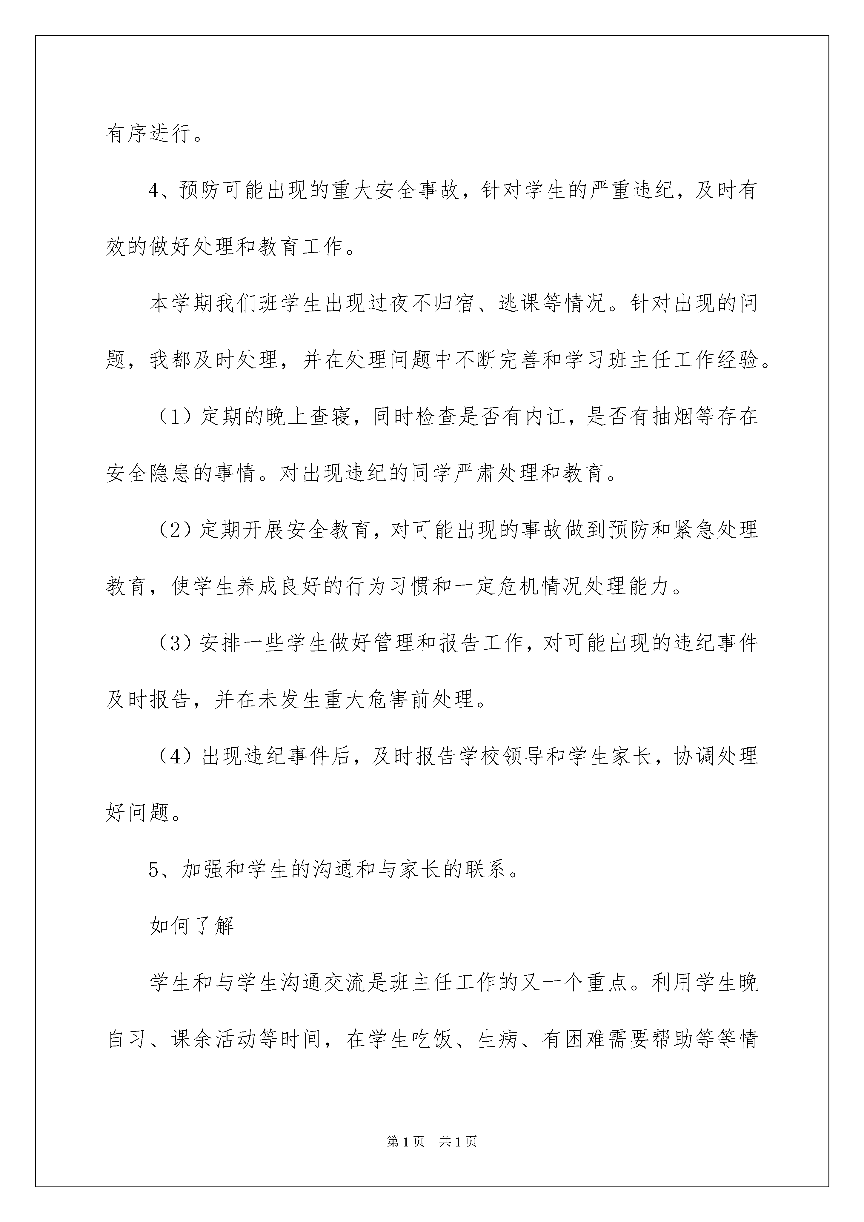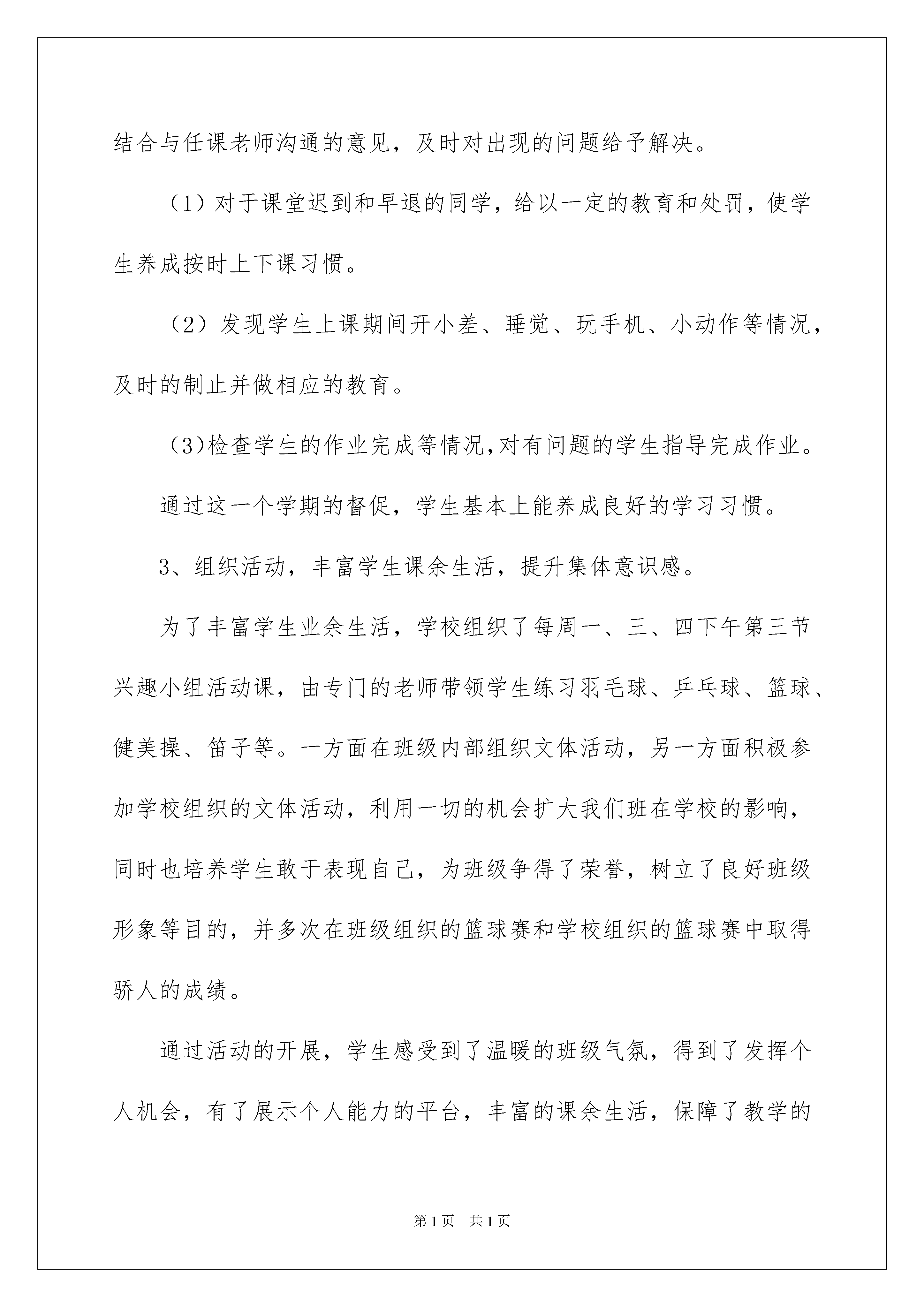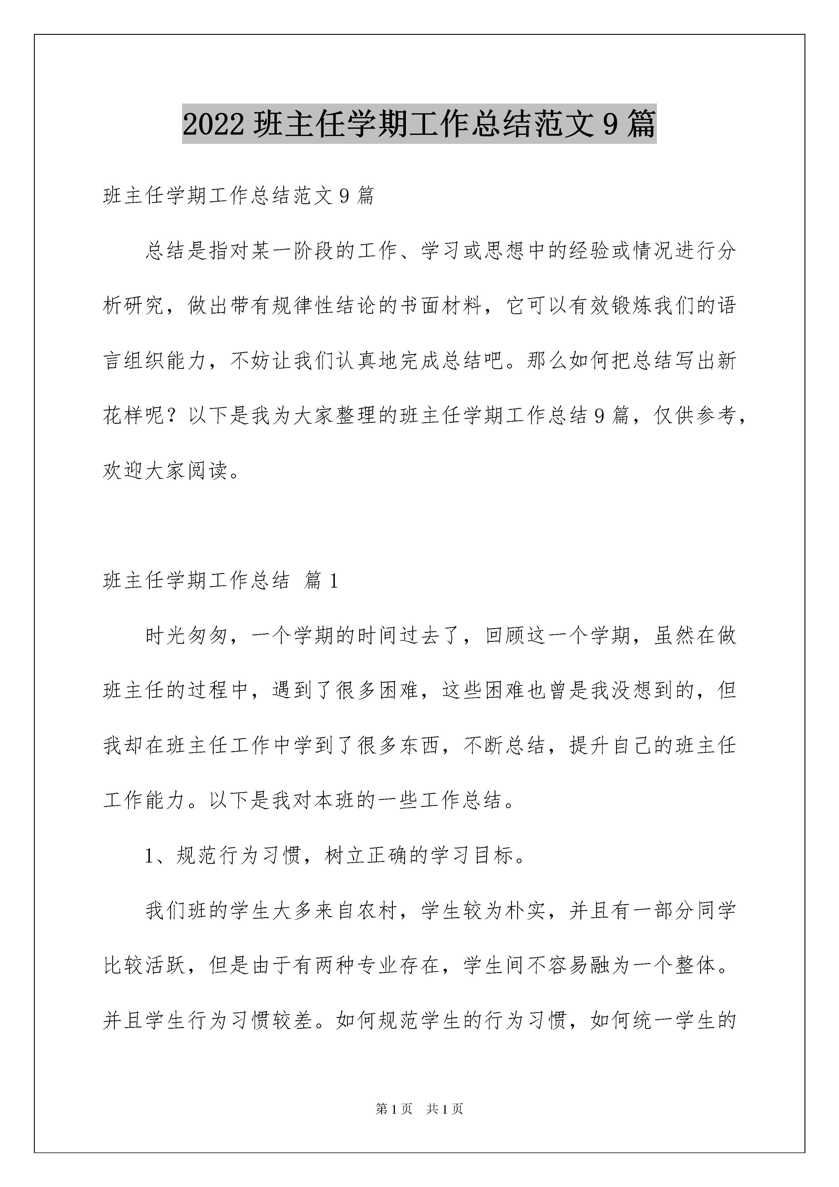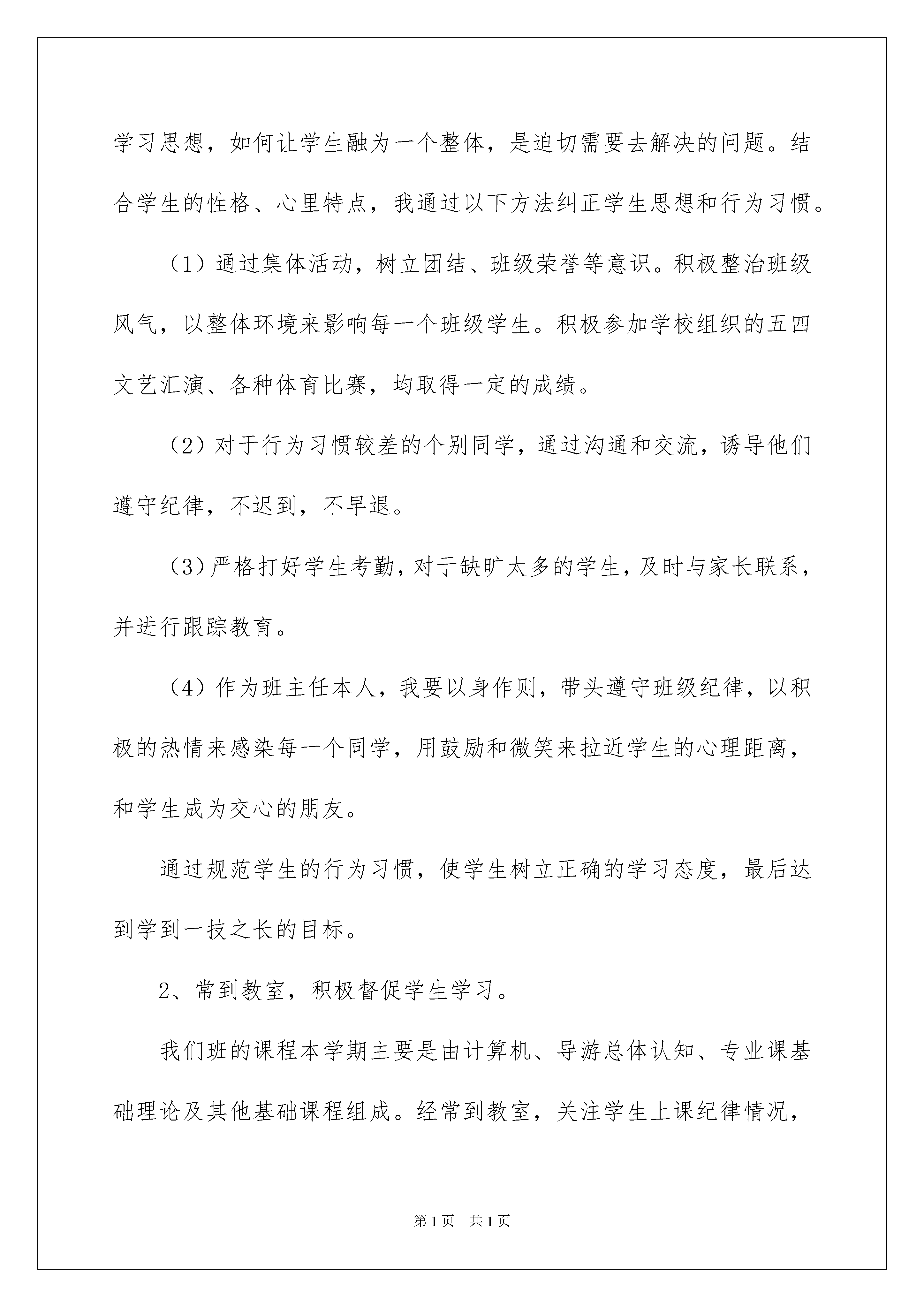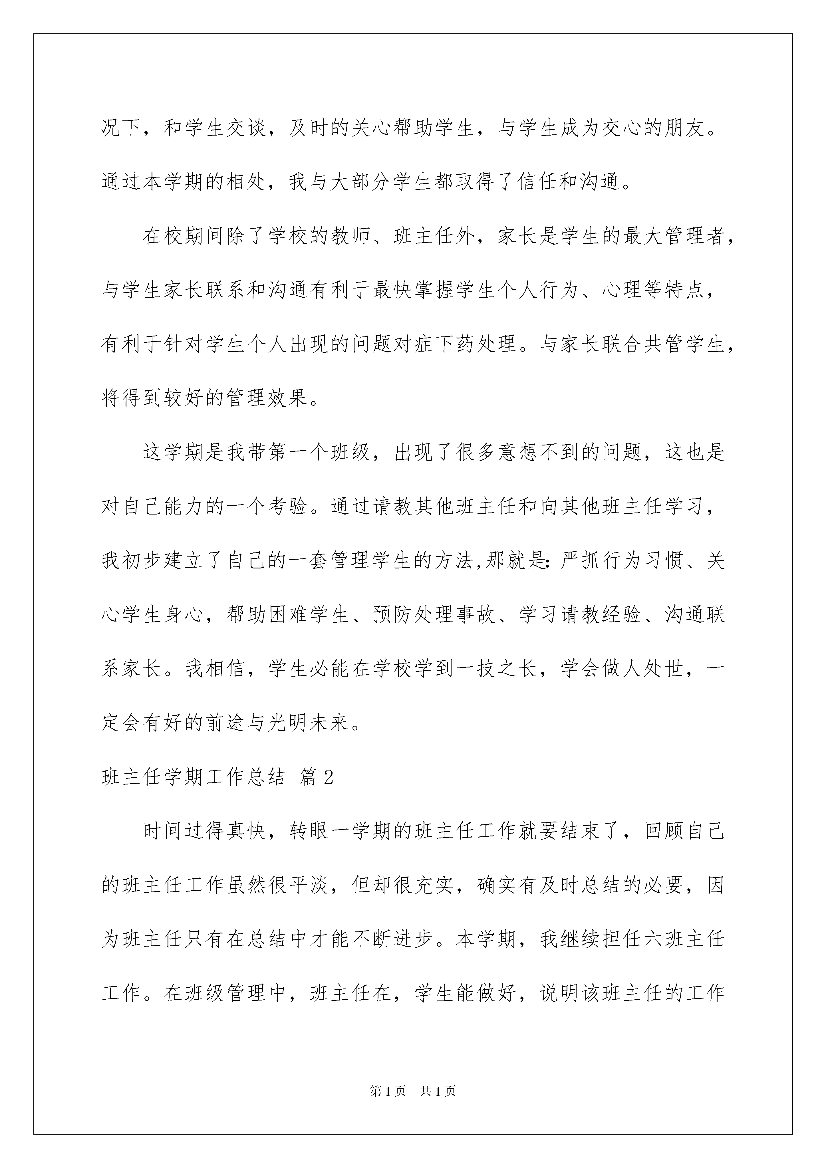 2022班主任学期工作总结范文9篇班主任学期工作总结范文9篇总结是指对某一阶段的工作、学习或思想中的经验或情况进行分析研究,做出带有规律性结论的书面材料,它可以有效锻炼我们的语言组织能力,不妨让我们认真地完成总结吧。那么如何把总结写出新花样呢?以下是我为大家整理的班主任学期工作总结9篇,仅供参考,欢迎大家阅读。班主任学期工作总结篇1时光匆匆,一个学期的时间过去了,回顾这一个学期,虽然在做班主任的过程中,遇到了很多困难,这些困难也曾是我没想到的,但我却在班主任工作中学到了很多东西,不断总结,提升自己的班主任工作能力。以下是我对本班的一些工作总结。1、规范行为习惯,树立正确的学习目标。我们班的学生大多来自农村,学生较为朴实,并且有一部分同学比较活跃,但是由于有两种专业存在,学生间不容易融为一个整体。并且学生行为习惯较差。如何规范学生的行为习惯,如何统一学生的学习思想,如何让学生融为一个整体,是迫切需要去解决的问题。结合学生的性格、心里特点,我通过以下方法纠正学生思想和行为习惯。(1)通过集体活动,树立团结、班级荣誉等意识。积极整治班级风气,以整体环境来影响每一个班级学生。积极参加学校组织的五四文艺汇演、各种体育比赛,均取得一定的成绩。(2)对于行为习惯较差的个别同学,通过沟通和交流,诱导他们遵守纪律,不迟到,不早退。(3)严格打好学生考勤,对于缺旷太多的学生,及时与家长联系,并进行跟踪教育。(4)作为班主任本人,我要以身作则,带头遵守班级纪律,以积极的热情来感染每一个同学,用鼓励和微笑来拉近学生的心理距离,和学生成为交心的朋友。通过规范学生的行为习惯,使学生树立正确的学习态度,最后达到学到一技之长的目标。2、常到教室,积极督促学生学习。我们班的课程本学期主要是由计算机、导游总体认知、专业课基础理论及其他基础课程组成。经常到教室,关注学生上课纪律情况,结合与任课老师沟通的意见,及时对出现的问题给予解决。(1)对于课堂迟到和早退的同学,给以一定的教育和处罚,使学生养成按时上下课习惯。(2)发现学生上课期间开小差、睡觉、玩手机、小动作等情况,及时的制止并做相应的教育。(3)检查学生的作业完成等情况,对有问题的学生指导完成作业。通过这一个学期的督促,学生基本上能养成良好的学习习惯。3、组织活动,丰富学生课余生活,提升集体意识感。为了丰富学生业余生活,学校组织了每周一、三、四下午第三节兴趣小组活动课,由专门的老师带领学生练习羽毛球、乒乓球、篮球、健美操、笛子等。一方面在班级内部组织文体活动,另一方面积极参加学校组织的文体活动,利用一切的机会扩大我们班在学校的影响,同时也培养学生敢于表现自己,为班级争得了荣誉,树立了良好班级形象等目的,并多次在班级组织的篮球赛和学校组织的篮球赛中取得骄人的成绩。通过活动的开展,学生感受到了温暖的班级气氛,得到了发挥个人机会,有了展示个人能力的平台,丰富的课余生活,保障了教学的有序进行。4、预防可能出现的重大安全事故,针对学生的严重违纪,及时有效的做好处理和教育工作。本学期我们班学生出现过夜不归宿、逃课等情况。针对出现的问题,我都及时处理,并在处理问题中不断完善和学习班主任工作经验。(1)定期的晚上查寝,同时检查是否有内讧,是否有抽烟等存在安全隐患的事情。对出现违纪的同学严肃处理和教育。(2)定期开展安全教育,对可能出现的事故做到预防和紧急处理教育,使学生养成良好的行为习惯和一定危机情况处理能力。(3)安排一些学生做好管理和报告工作,对可能出现的违纪事件及时报告,并在未发生重大危害前处理。(4)出现违纪事件后,及时报告学校领导和学生家长,协调处理好问题。5、加强和学生的沟通和与家长的联系。如何了解学生和与学生沟通交流是班主任工作的又一个重点。利用学生晚自习、课余活动等时间,在学生吃饭、生病、有困难需要帮助等等情况下,和学生交谈,及时的关心帮助学生,与学生成为交心的朋友。通过本学期的相处,我与大部分学生都取得了信任和沟通。在校期间除了学校的教师、班主任外,家长是学生的最大管理者,与学生家长联系和沟通有利于最快掌握学生个人行为、心理等特点,有利于针对学生个人出现的问题对症下药处理。与家长联合共管学生,将得到较好的管理效果。这学期是我带第一个班级,出现了很多意想不到的问题,这也是对自己能力的一个考验。通过请教其他班主任和向其他班主任学习,我初步建立了自己的一套管理学生的方法,那就是:严抓行为习惯、关心学生身心,帮助困难学生、预防处理事故、学习请教经验、沟通联系家长。我相信,学生必能在学校学到一技之长,学会做人处世,一定会有好的前途与光明未来。班主任学期工作总结篇