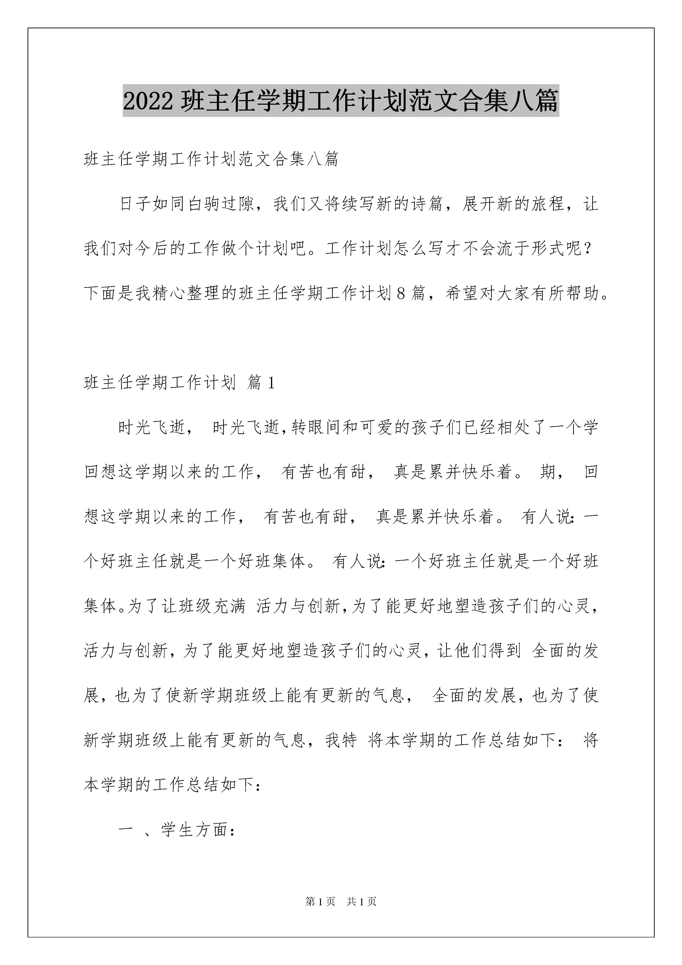 2022班主任学期工作计划范文合集八篇班主任学期工作计划范文合集八篇日子如同白驹过隙,我们又将续写新的诗篇,展开新的旅程,让我们对今后的工作做个计划吧。工作计划怎么写才不会流于形式呢?下面是我精心整理的班主任学期工作计划8篇,希望对大家有所帮助。班主任学期工作计划篇1时光飞逝,时光飞逝,转眼间和可爱的孩子们已经相处了一个学回想这学期以来的工作,有苦也有甜,真是累并快乐着。期,回想这学期以来的工作,有苦也有甜,真是累并快乐着。有人说:一个好班主任就是一个好班集体。有人说:一个好班主任就是一个好班集体。为了让班级充满活力与创新,为了能更好地塑造孩子们的心灵,活力与创新,为了能更好地塑造孩子们的心灵,让他们得到全面的发展,也为了使新学期班级上能有更新的气息,全面的发展,也为了使新学期班级上能有更新的气息,我特将本学期的工作总结如下:将本学期的工作总结如下:一、学生方面:1、积极响应学校号召,开展各种活动。如:在新生入队积极响应学校号召,开展各种活动。活动中,体会成为少先队员的光荣;在国庆歌演会中,活动中,体会成为少先队员的光荣;在国庆歌演会中,感受演会中集体的力量;在元旦汇演中,感受歌舞的欢乐,集体的力量;在元旦汇演中,感受歌舞的欢乐,丰富孩子们的课间生活,增强班级凝聚力等等,的课间生活,增强班级凝聚力等等,这些活动不但给学生带来了无穷的乐趣,更加丰富了他们的课外生活。来了无穷的乐趣,更加丰富了他们的课外生活。2、课堂习惯的培养。对于一年级的孩子们,课堂习惯的课堂习惯的培养。对于一年级的孩子们,培养是班主任工作的重中之重,培养是班主任工作的重中之重,可以说是检验班主任工作成败的关键。每天多表扬,尽量少批评或不批评,败的关键。每天多表扬,尽量少批评或不批评,利用孩子的上进心鞭策他们。再次,关心学生,上进心鞭策他们。再次,关心学生,事无巨细关心学生的生活,不仅是生活老师的事情,也是班主任应尽的义务。孩子不仅是生活老师的事情,也是班主任应尽的义务。们年龄小,经常有个头疼脑热的。作为班主任,们年龄小,经常有个头疼脑热的。作为班主任,我总是在孩子出现不良状况的第一时间联系他们的家长,安慰他们。子出现不良状况的第一时间联系他们的家长,安慰他们。二、家校联合方面和家长多联系,多交流,共同促进孩子的发展。和家长多联系,多交流,共同促进孩子的发展。我始终觉得,一个人的成长离不开家庭的影响。觉得,一个人的成长离不开家庭的影响。教师对孩子的影响再大,如果得不到家庭的响应与合作,必然是势单力薄的。再大,如果得不到家庭的响应与合作,必然是势单力薄的。所以我经常通过家长接送孩子的时候,所以我经常通过家长接送孩子的时候,表达自己对教育孩子的看法,反映孩子的在校表现和提出一些建议等等。的看法,反映孩子的在校表现和提出一些建议等等。虽然工作一点都不轻松,但是生活是很充实的,收获也是很多的。作一点都不轻松,但是生活是很充实的,收获也是很多的。一个学期不知不觉中过去了,从学生进校到现在,一个学期不知不觉中过去了,从学生进校到现在,学生从什么都不懂,到现在会认字,会表达,能与老师、么都不懂,到现在会认字,会表达,能与老师、同学进行交流,生活基本能自理。这一学期下来,学生基本能适应学校生活基本能自理。这一学期下来,本能自理的生活了,并能比较自觉地遵守学校的各项规章制度。的生活了,并能比较自觉地遵守学校的各项规章制度。三、自身方面作为班主任,我深深懂得教师的一言一行都影响着学生,作为班主任,我深深懂得教师的一言一行都影响着学生,对学生起着言传身教的作用。所以在工作中我一直遵循“严对学生起着言传身教的作用。所以在工作中我一直遵循严要求,高标准”的指导方针。要求,高标准的指导方针的指导方针。1、思想教育常抓不懈。利用班会,晨会进行思想品德教思想教育常抓不懈。利用班会,育,卫生、纪律、安全等经常讲,着重培养学生良好的道德卫生、纪律、安全等经常讲,品质、学习习惯、劳动习惯和文明行为习惯等。品质、学习习惯、劳动习惯和文明行为习惯等。小干部”的大作用2、发挥“小干部的大作用。大胆放手使用班干部,通过发挥小干部的大作用。大胆放手使用班干部,制定班级管理制度,对学生各方面做出了严格要求,制定班级管理制度,对学生各方面做出了严格要求,班内形成了团结向上的优良班风。成了团结向上的优良班风。向上的优良班风3、关心爱护每个学生。作为一名教师,我爱班上的优等关心爱护每个学生。作为一名教师,也爱班级的后进生。在学习中,不让一个学生掉队。如爱班级的后进生。在学习中,不让一个学生掉队。我班何燕同学,每天上课走神,不按时做作业,我班何燕同学,每天上课走神