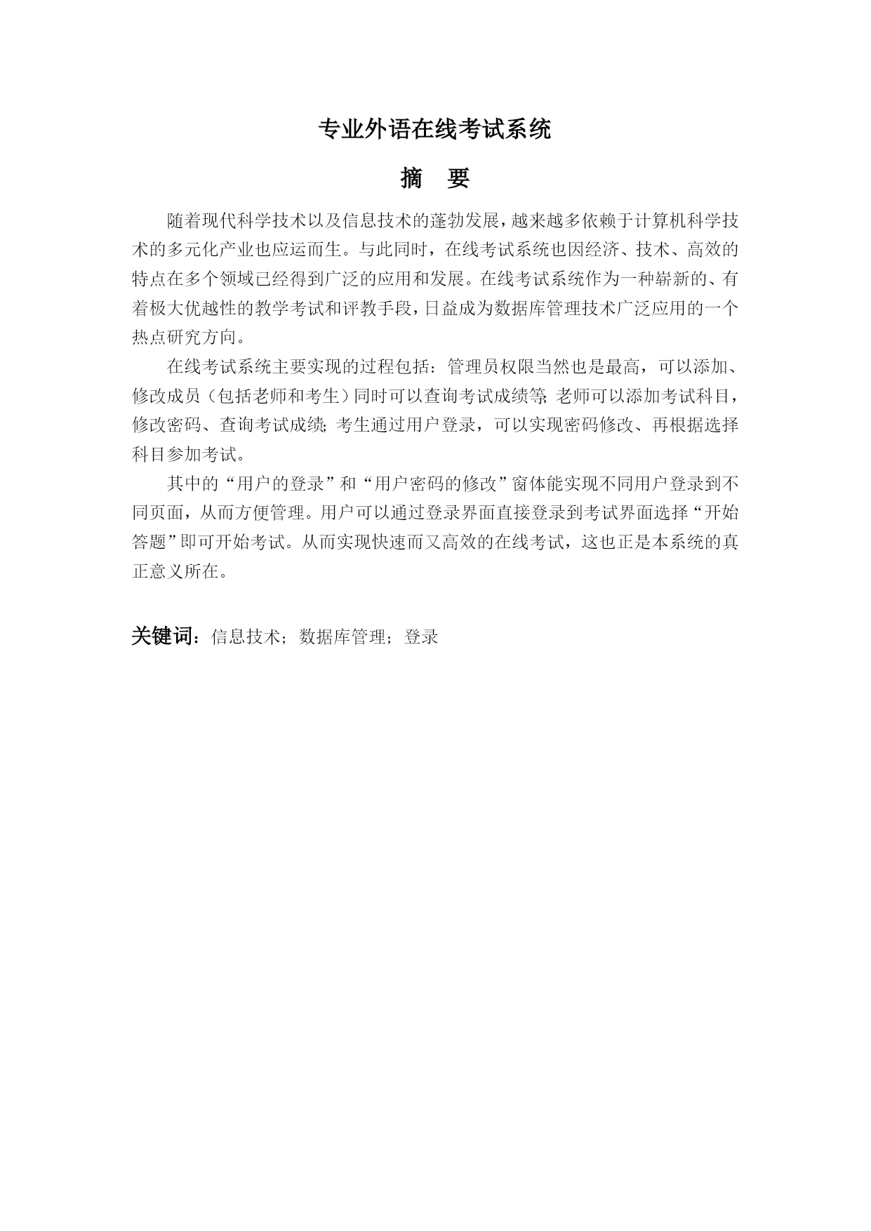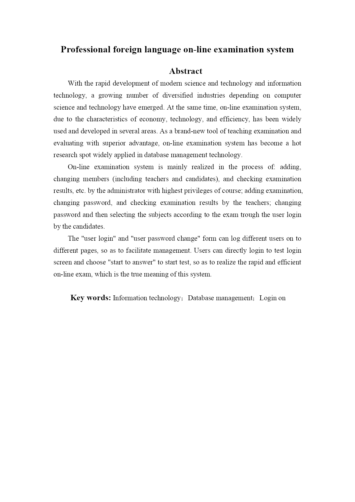分类号:TP31UDC:D10621-408-(2011)2015-0 密级:公开编号:2007051170 成都信息工程学院 学位论文 专业外语在线考试系统 论文作者姓名:申请学位专业:计算机科学与技术申请学位类别:工学学士指导教师姓名(职称):论文提交日期: 毕业设计(论文)原创性声明和使用授权说明 原创性声明 本人郑重承诺:所呈交的毕业设计(论文),是我个人在指导教师的指导下进行的研究工作及取得的成果。尽我所知,除文中特别加以标注和致谢的地方外,不包含其他人或组织已经发表或公布过的研究成果,也不包含我为获得及其它教育机构的学位或学历而使用过的材料。对本研究提供过帮助和做出过贡献的个人或集体,均已在文中作了明确的说明并表示了谢意。 作者签名:日期: 指导教师签名:日期: 使用授权说明 本人完全了解大学关于收集、保存、使用毕业设计(论文)的规定,即:按照学校要求提交毕业设计(论文)的印刷本和电子版本;学校有权保存毕业设计(论文)的印刷本和电子版,并提供目录检索与阅览服务;学校可以采用影印、缩印、数字化或其它复制手段保存论文;在不以赢利为目的前提下,学校可以公布论文的部分或全部内容。 作者签名:日期: 学位论文原创性声明 本人郑重声明:所呈交的论文是本人在导师的指导下独立进行研究所取得的研究成果。除了文中特别加以标注引用的内容外,本论文不包含任何其他个人或集体已经发表或撰写的成果作品。对本文的研究做出重要贡献的个人和集体,均已在文中以明确方式标明。本人完全意识到本声明的法律后果由本人承担。 作者签名: 日期:年月日 学位论文版权使用授权书 本学位论文作者完全了解学校有关保留、使用学位论文的规定,同意学校保留并向国家有关部门或机构送交论文的复印件和电子版,允许论文被查阅和借阅。本人授权大学可以将本学位论文的全部或部分内容编入有关数据库进行检索,可以采用影印、缩印或扫描等复制手段保存和汇编本学位论文。 涉密论文按学校规定处理。 作者签名: 日期:年月日 导师签名:日期:年月日 专业外语在线考试系统 摘要 随着现代科学技术以及信息技术的蓬勃发展,越来越多依赖于计算机科学技术的多元化产业也应运而生。与此同时,在线考试系统也因经济、技术、高效的特点在多个领域已经得到广泛的应用和发展。在线考试系统作为一种崭新的、有着极大优越性的教学考试和评教手段,日益成为数据库管理技术广泛应用的一个热点研究方向。 在线考试系统主要实现的过程包括:管理员权限当然也是最高,可以添加、修改成员(包括老师和考生)同时可以查询考试成绩等;老师可以添加考试科目,修改密码、查询考试成绩;考生通过用户登录,可以实现密码修改、再根据选择科目参加考试。 其中的“用户的登录”和“用户密码的修改”窗体能实现不同用户登录到不同页面,从而方便管理。用户可以通过登录界面直接登录到考试界面选择“开始答题”即可开始考试。从而实现快速而又高效的在线考试,这也正是本系统的真正意义所在。 关键词:信息技术;数据库管理;登录 Professionalforeignlanguageon-lineexaminationsystem Abstract Withtherapiddevelopmentofmodernscienceandtechnologyandinformationtechnology,agrowingnumberofdiversifiedindustriesdependingoncomputerscienceandtechnologyhaveemerged.Atthesametime,on-lineexaminationsystem,duetothecharacteristicsofeconomy,technology,andefficiency,hasbeenwidelyusedanddevelopedinseveralareas.Asabrand-newtoolofteachingexaminationandevaluatingwithsuperioradvantage,on-lineexaminationsystemhasbecomeahotresearchspotwidelyappliedindatabasemanagementtechnology. On-lineexaminationsystemismainlyrealizedintheprocessof:adding,changingmembers(includingteachersandcandidates),andcheckingexaminationresults,etc.bytheadmini