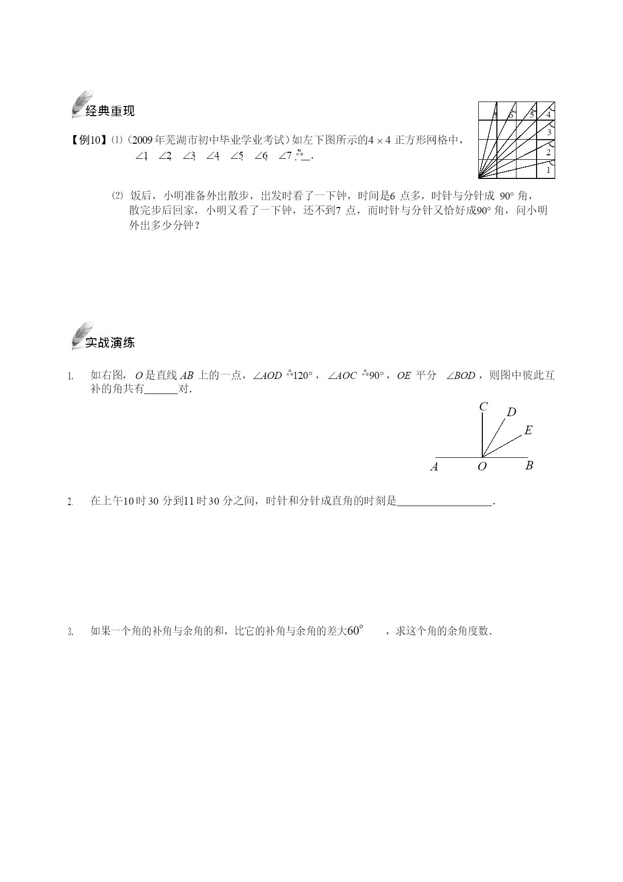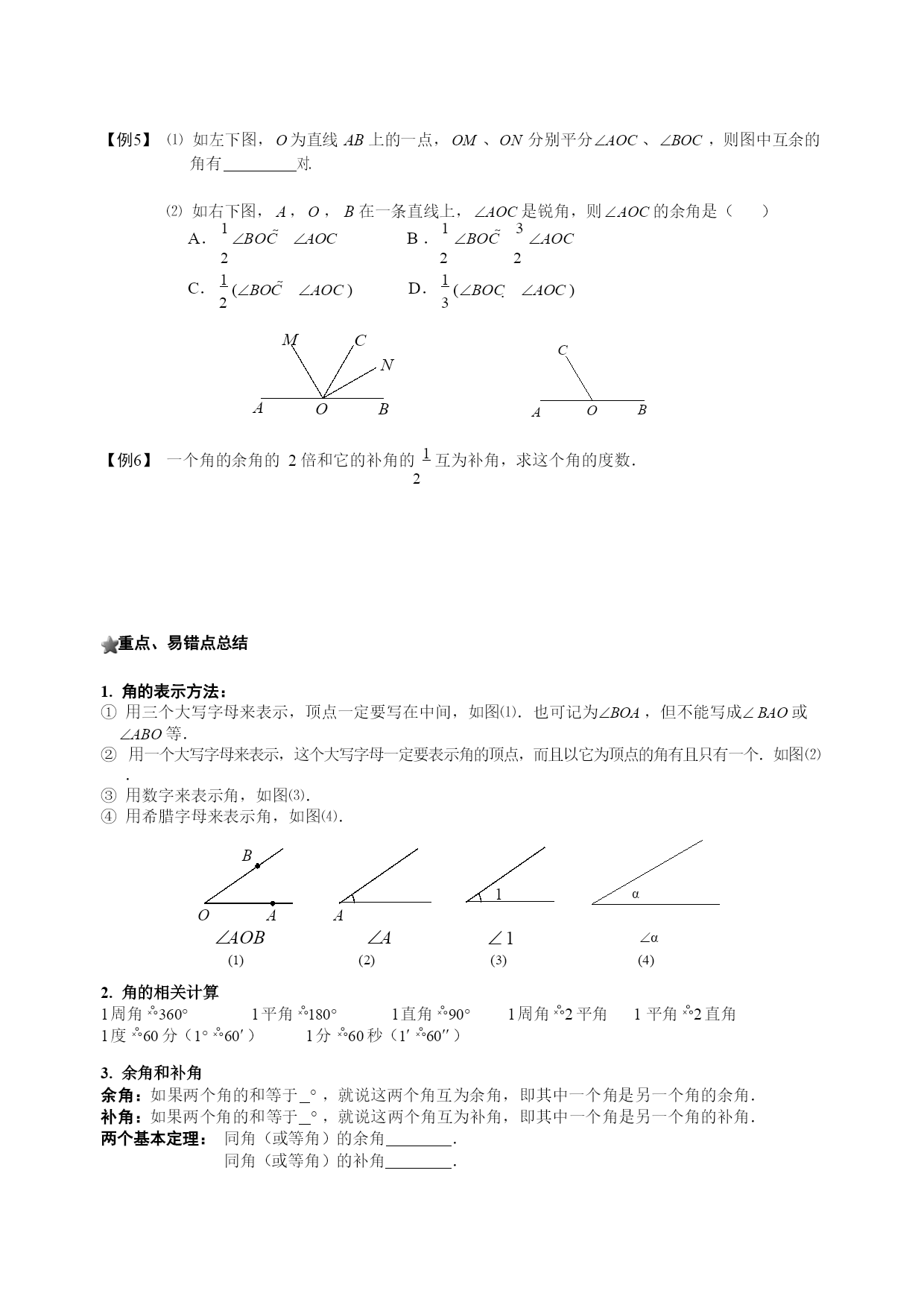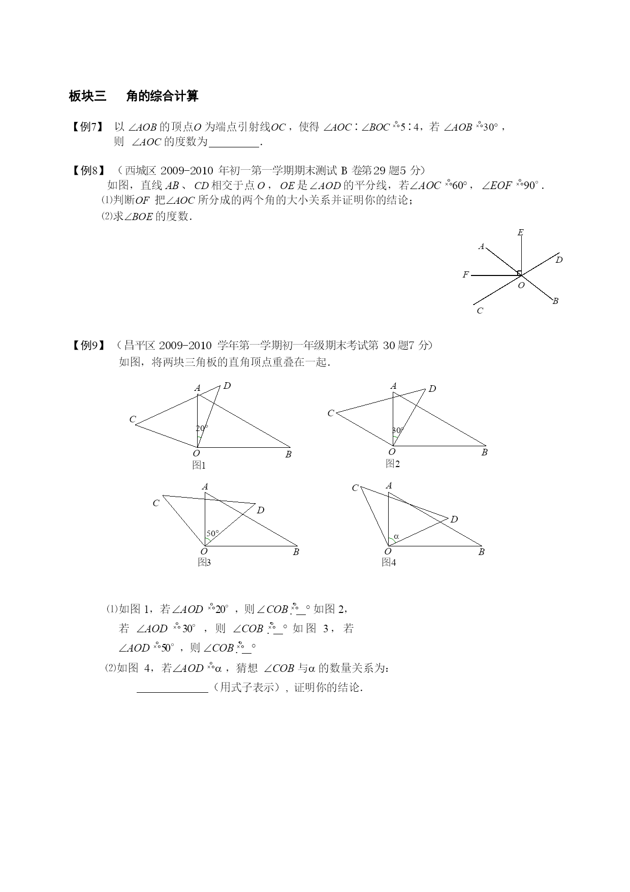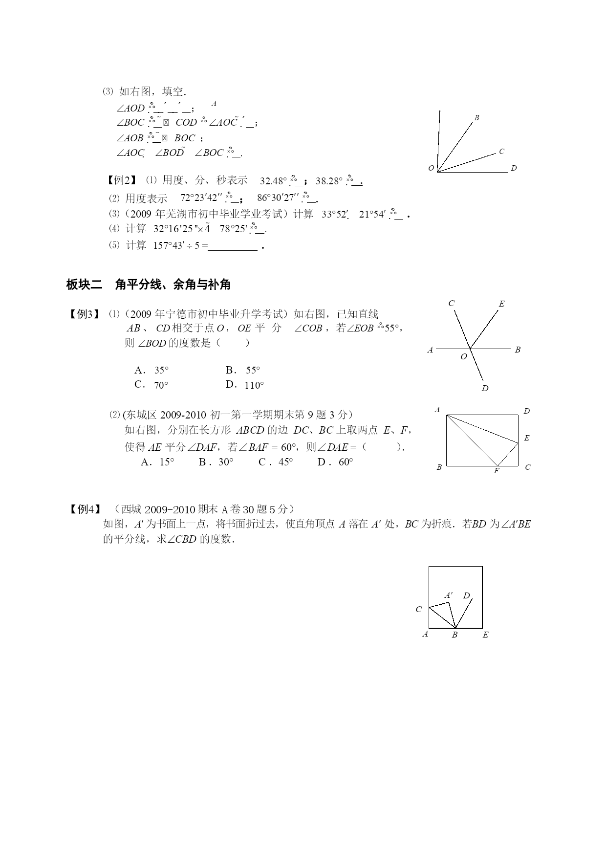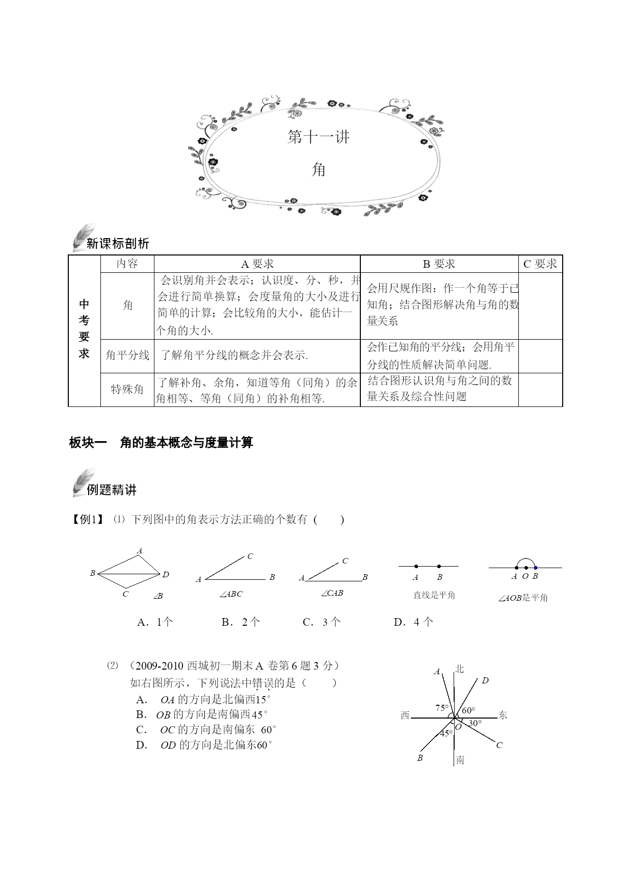 -- 初一·提高班·第11讲·学生版 第十一讲角 新课标剖析 中考要求内容A要求B要求C要求 角会识别角并会表示;认识度、分、秒,并会进行简单换算;会度量角的大小及进行简单的计算;会比较角的大小,能估计一 个角的大小.会用尺规作图:作一个角等于已知角;结合图形解决角与角的数量关系角平分线了解角平分线的概念并会表示.会作已知角的平分线;会用角平 分线的性质解决简单问题.特殊角了解补角、余角,知道等角(同角)的余角相等、等角(同角)的补角相等.结合图形认识角与角之间的数量关系及综合性问题 板块一 角的基本概念与度量计算 例题精讲 【例1】⑴下列图中的角表示方法正确的个数有( ) A D A C B A B A B AOB C B ABC CAB 直线是平角 AOB是平角 A.1个 B.2个 C.3个 D.4个 D 75° 45° 60° O30° C B ⑵(2009-2010西城初一期末A卷第6题3分) A 北 如右图所示,下列说法中错.误.的是( ) A.OA的方向是北偏西15° B.OB的方向是南偏西45° 西 东 C.OC的方向是南偏东60° D.OD的方向是北偏东60° 南 ⑶如右图,填空. B C AOD; A BOCCODAOC; AOBBOC; AOCBODBOC. O D 【例2】⑴用度、分、秒表示 32.48;38.28. ⑵用度表示 722342;863027. ⑶(2009年芜湖市初中毕业学业考试)计算33522154. ⑷计算3216'25''47825'. ⑸计算157435= . 板块二 角平分线、余角与补角 C E O 【例3】⑴(2009年宁德市初中毕业升学考试)如右图,已知直线 AB、CD相交于点O,OE平分则BOD的度数是( ) A.35 B.55 C.70 D.110 COB,若EOB55, A B D ⑵(东城区2009-2010初一第一学期期末第9题3分) A D 如右图,分别在长方形ABCD的边DC、BC上取两点E、F, E 使得AE平分∠DAF,若∠BAF=60°,则∠DAE=( ). A.15° B.30° C.45° D.60° B F C 【例4】(西城2009-2010期末A卷30题5分) 如图,A为书面上一点,将书面折过去,使直角顶点A落在A处,BC为折痕.若BD为ABE 的平分线,求CBD的度数. A' D C A B E 【例5】⑴如左下图,O为直线AB上的一点,OM、ON分别平分AOC、BOC,则图中互余的角有 对. ⑵如右下图,A,O,B在一条直线上,AOC是锐角,则AOC的余角是( ) A.1BOCAOC B.1BOC3AOC 2 C.1(BOCAOC)2 M C N 2 2 D.1(BOCAOC)3 C A O B A O B 【例6】一个角的余角的2倍和它的补角的1互为补角,求这个角的度数. 2 重点、易错点总结 角的表示方法: ①用三个大写字母来表示,顶点一定要写在中间,如图⑴.也可记为BOA,但不能写成BAO或 ABO等. ②用一个大写字母来表示,这个大写字母一定要表示角的顶点,而且以它为顶点的角有且只有一个.如图⑵. ③用数字来表示角,如图⑶. ④用希腊字母来表示角,如图⑷. B 1 α O A A AOB A 1 α 角的相关计算 (1) (2) (3) (4) 1周角360 1平角180 1直角90 1周角2平角 1平角2直角 1度60分(160) 1分60秒(160) 余角和补角 余角:如果两个角的和等于,就说这两个角互为余角,即其中一个角是另一个角的余角.补角:如果两个角的和等于,就说这两个角互为补角,即其中一个角是另一个角的补角.两个基本定理:同角(或等角)的余角 . 同角(或等角)的补角 . -- 初一·提高班·第11讲·学生版 板块三 角的综合计算 【例7】以AOB的顶点O为端点引射线OC,使得AOC∶BOC5∶4,若AOB30, 则AOC的度数为 . 【例8】(西城区2009-2010年初一第一学期期末测试B卷第29题5分) 如图,直线AB、CD相交于点O,OE是AOD的平分线,若AOC60,EOF90°. ⑴判断OF把AOC所分成的两个角的大小关系并证明你的结论; ⑵求BOE的度数. E A D F