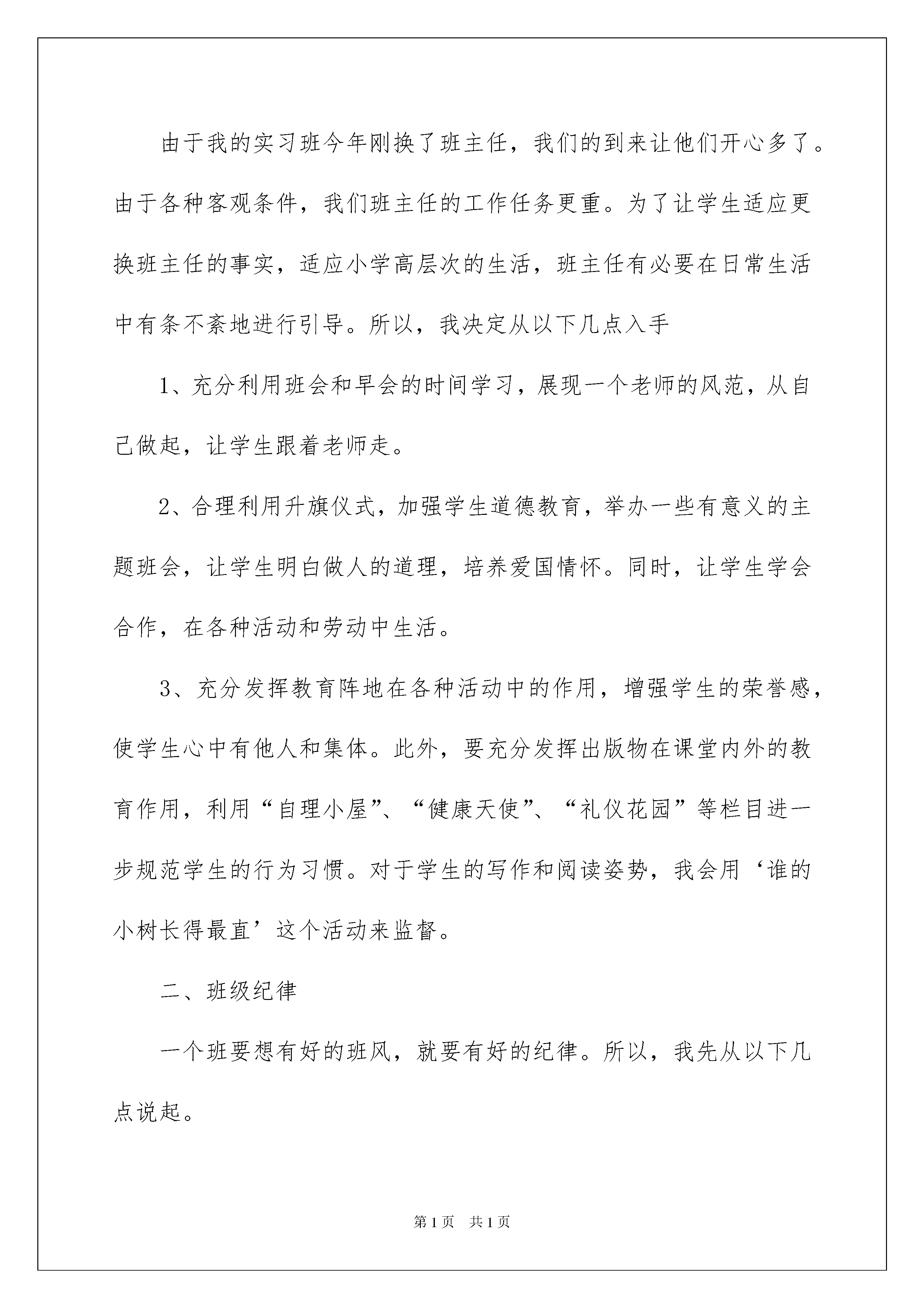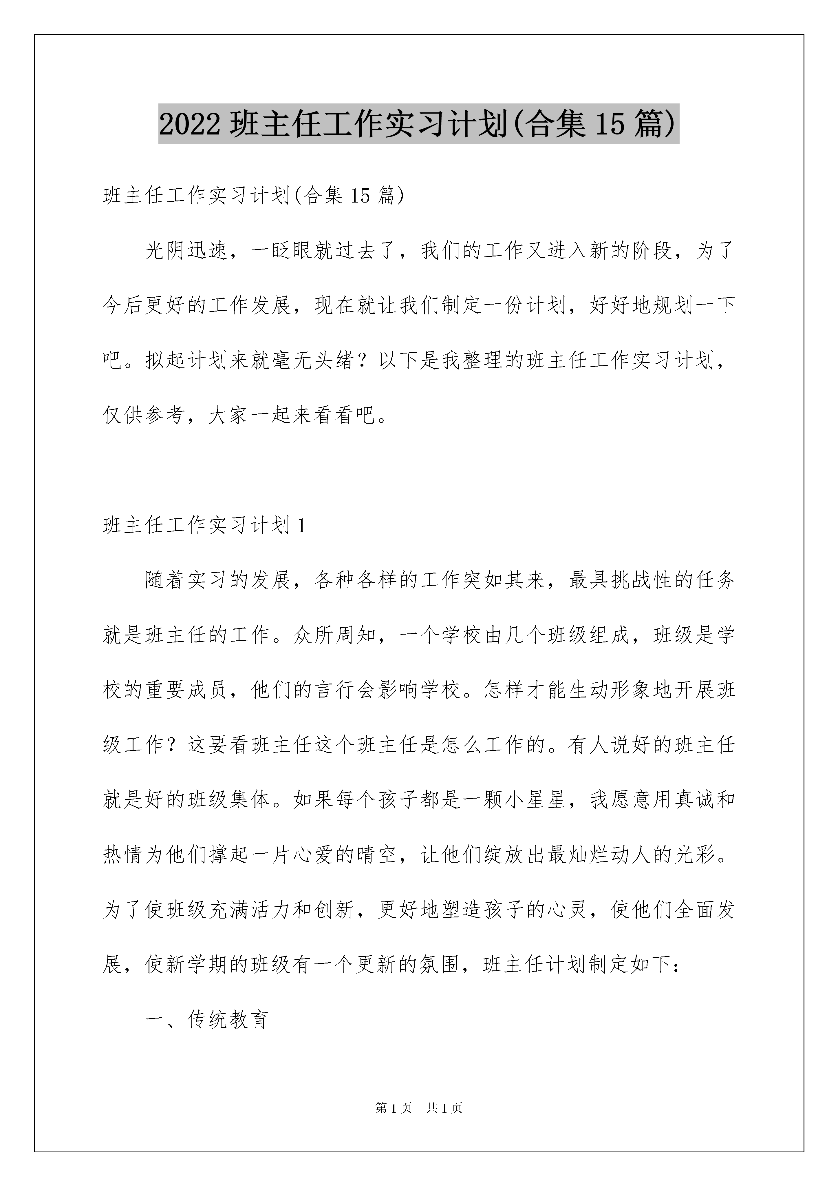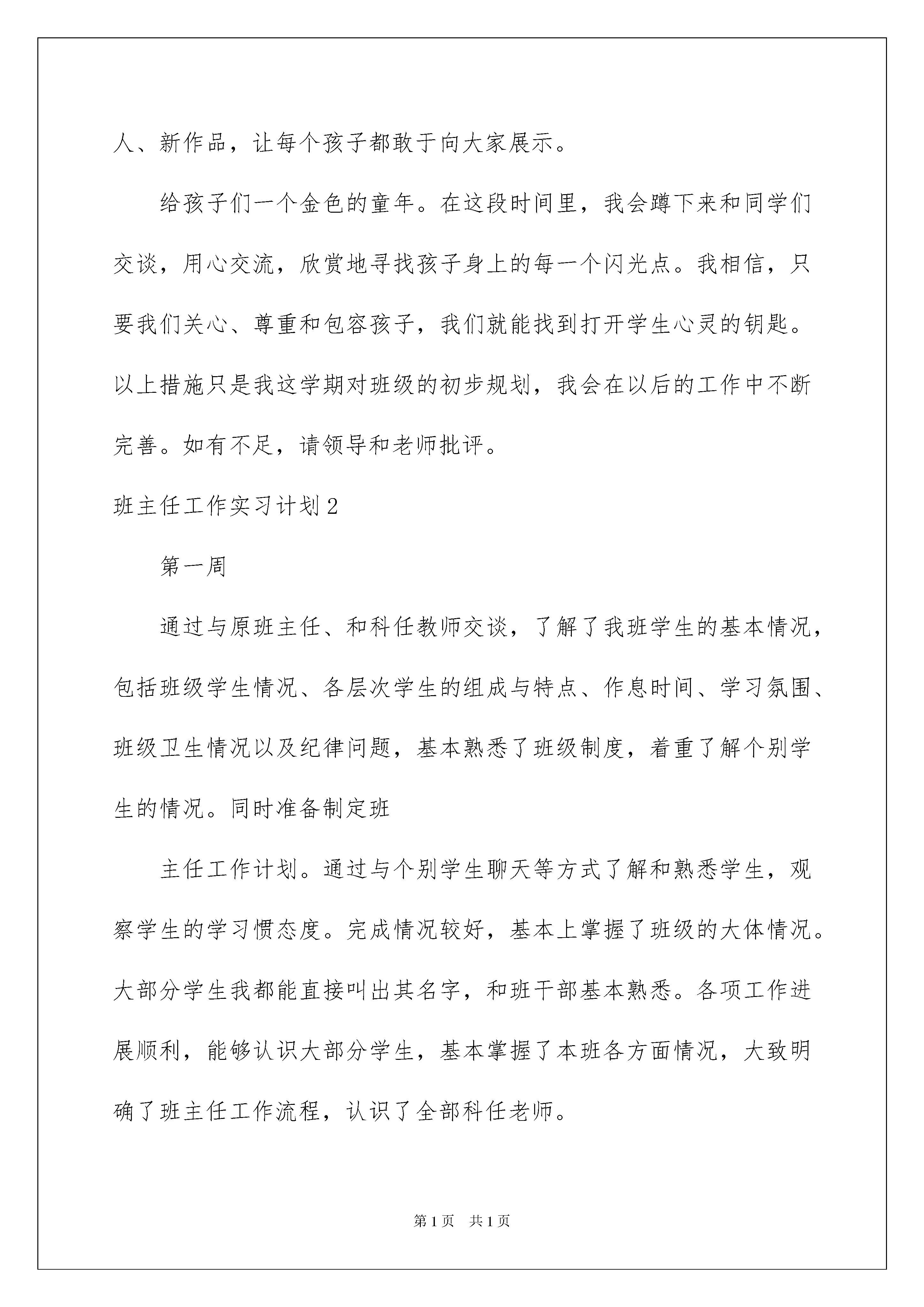2022班主任工作实习计划(合集15篇)班主任工作实习计划(合集15篇)光阴迅速,一眨眼就过去了,我们的工作又进入新的阶段,为了今后更好的工作发展,现在就让我们制定一份计划,好好地规划一下吧。拟起计划来就毫无头绪?以下是我整理的班主任工作实习计划,仅供参考,大家一起来看看吧。班主任工作实习计划1随着实习的发展,各种各样的工作突如其来,最具挑战性的任务就是班主任的工作。众所周知,一个学校由几个班级组成,班级是学校的重要成员,他们的言行会影响学校。怎样才能生动形象地开展班级工作?这要看班主任这个班主任是怎么工作的。有人说好的班主任就是好的班级集体。如果每个孩子都是一颗小星星,我愿意用真诚和热情为他们撑起一片心爱的晴空,让他们绽放出最灿烂动人的光彩。为了使班级充满活力和创新,更好地塑造孩子的心灵,使他们全面发展,使新学期的班级有一个更新的氛围,班主任计划制定如下:一、传统教育由于我的实习班今年刚换了班主任,我们的到来让他们开心多了。由于各种客观条件,我们班主任的工作任务更重。为了让学生适应更换班主任的事实,适应小学高层次的生活,班主任有必要在日常生活中有条不紊地进行引导。所以,我决定从以下几点入手1、充分利用班会和早会的时间学习,展现一个老师的风范,从自己做起,让学生跟着老师走。2、合理利用升旗仪式,加强学生道德教育,举办一些有意义的主题班会,让学生明白做人的道理,培养爱国情怀。同时,让学生学会合作,在各种活动和劳动中生活。3、充分发挥教育阵地在各种活动中的作用,增强学生的荣誉感,使学生心中有他人和集体。此外,要充分发挥出版物在课堂内外的教育作用,利用“自理小屋”、“健康天使”、“礼仪花园”等栏目进一步规范学生的行为习惯。对于学生的写作和阅读姿势,我会用‘谁的小树长得最直’这个活动来监督。二、班级纪律一个班要想有好的班风,就要有好的纪律。所以,我先从以下几点说起。1、课堂纪律首先,师生共同制定班级规章制度,并制定相应的奖惩办法。(加减分制)让学生既有趣又有动力,能在不知不觉中遵守纪律。因为是孩子自己做的,所以把被动的要求变成了主动的行为,帮助学生把话内化为行为。我们上课的目的是‘照你说的去做’2、闭会期间学科课堂是学生轻松放松的时间。良好的班际纪律会给整个校园带来积极轻松的氛围。但是,丰富多彩的班际活动是解决班际纪律混乱的法宝。我会根据学生的年龄特点开展‘跳绳、打游戏、投篮’等活动,让学生既能健身又能接受教育。同时可以增进师生感情,拓展交流空间。3、两个学科为了在老师和学生中树立我们班的良好形象,也为了我们班的荣誉(两个练习的红旗),我们班准备成立一个“小天使全队”班长配合纪律管理,老师应该给班干部权利。毕竟师生之间是有一定距离的,学生的自我约束能力也是要培养的。三、健康方面注意卫生很重要。俗话说,病从口入。打扫卫生不仅可以让人健康,还可以养成良好的生活习惯,创造良好的学习环境。1、个人卫生:要求衣服干净,良好的‘三勤’,清理桌椅,摆放物品,做两个练习。2、班级卫生:安排学生在早、中、晚值班打扫卫生,设立卫生监督岗,进行检查监督,奖励主动及时打扫卫生的学生或团体,利用花草美化环境,开展爱护环境和花草的教育。四,班干部的培养班级管理光靠班主任管理是不够的,班干部才是班级管理的助手。在此期间,我将采用班干部(包括班组长和班组长)轮换制,使班级管理达到一个新的水平,让每个孩子的潜力都得到充分挖掘,培养有个性的人,让孩子学会学习、生活、合作、管理。五、其他方面班级管理也要注重个人发展,在各种活动中挖掘各种人才和学生的潜力,让班级里的每一个学生都能在某一方面得到进一步的发展。于是班级里继续开展各种活动,如:文明小标兵评选、小书法家、小发明家、小诗人、数学小博士、书友等。在这些活动中,大力介绍新人、新作品,让每个孩子都敢于向大家展示。给孩子们一个金色的童年。在这段时间里,我会蹲下来和同学们交谈,用心交流,欣赏地寻找孩子身上的每一个闪光点。我相信,只要我们关心、尊重和包容孩子,我们就能找到打开学生心灵的钥匙。以上措施只是我这学期对班级的初步规划,我会在以后的工作中不断完善。如有不足,请领导和老师批评。班主任工作实习计划2第一周通过与原班主任、和科任教师交谈,了解了我班学生的基本情况,包括班级学生情况、各层次学生的组成与特点、作息时间、学习氛围、班级卫生情况以及纪律问题,基本熟悉了班级制度,着重了解个别学生的情况。同时准备制定班主任工作计划。通过与个别学生聊天等方式了解和熟悉学生,观察学生的学习惯态度。完成情况较好,基本上掌握了班级的大体情况。大部分学生我都能直接叫出其名字,和班干部基本熟悉。
