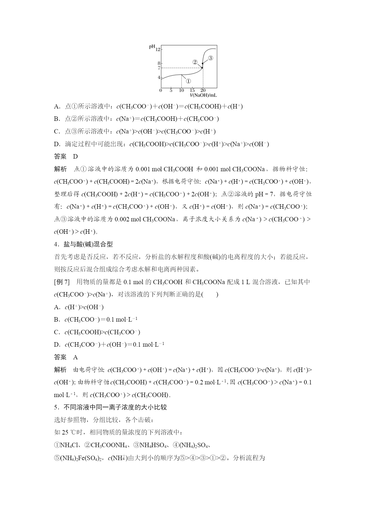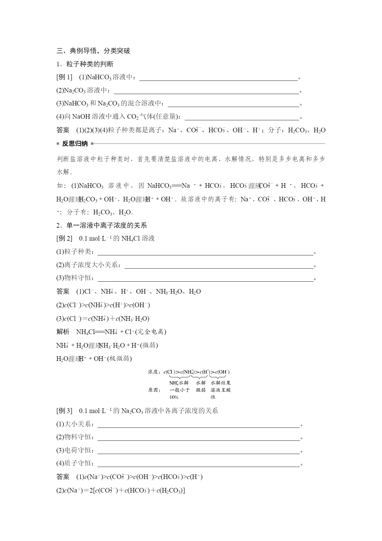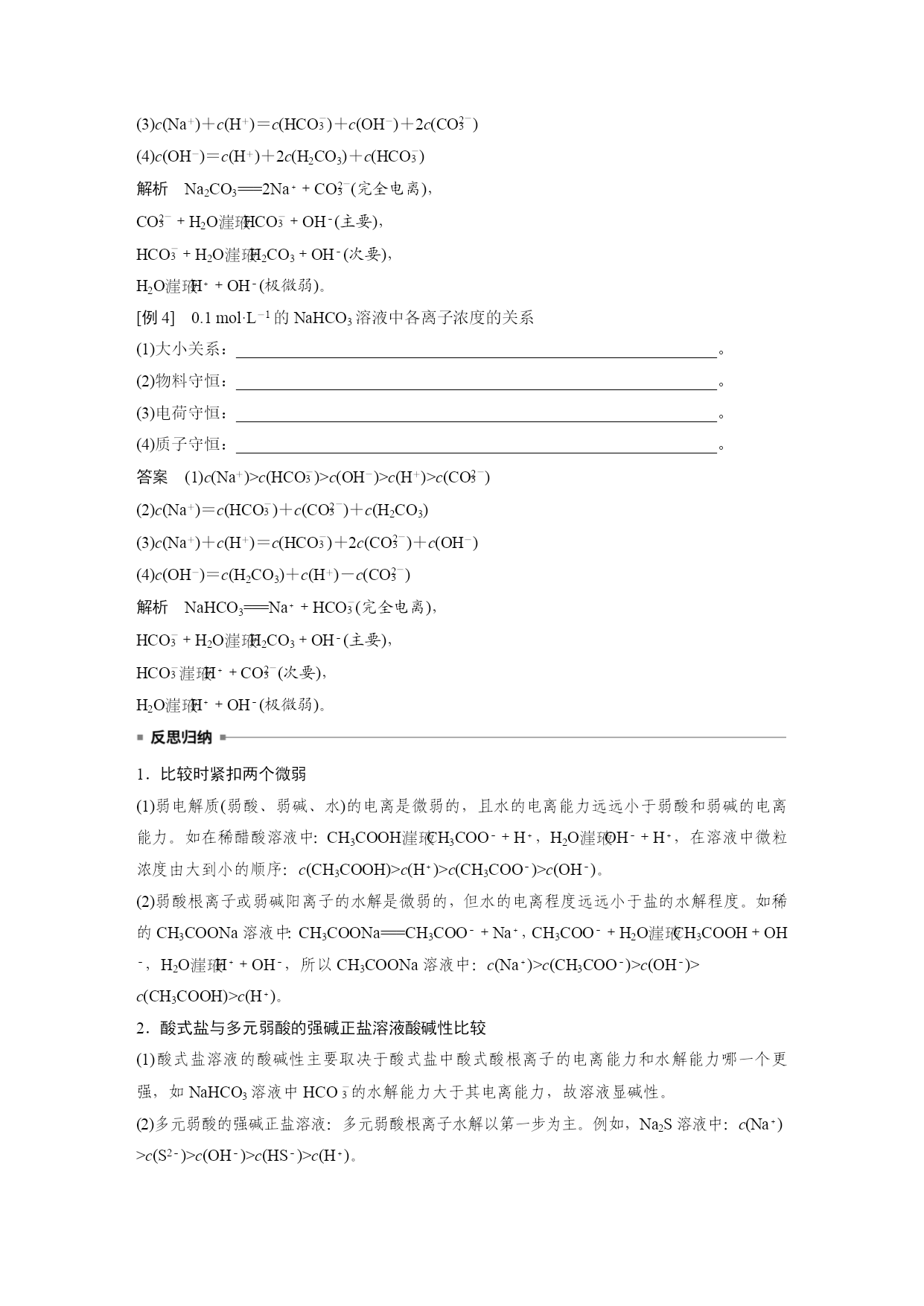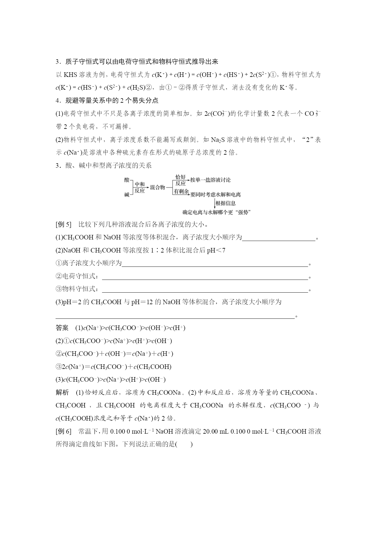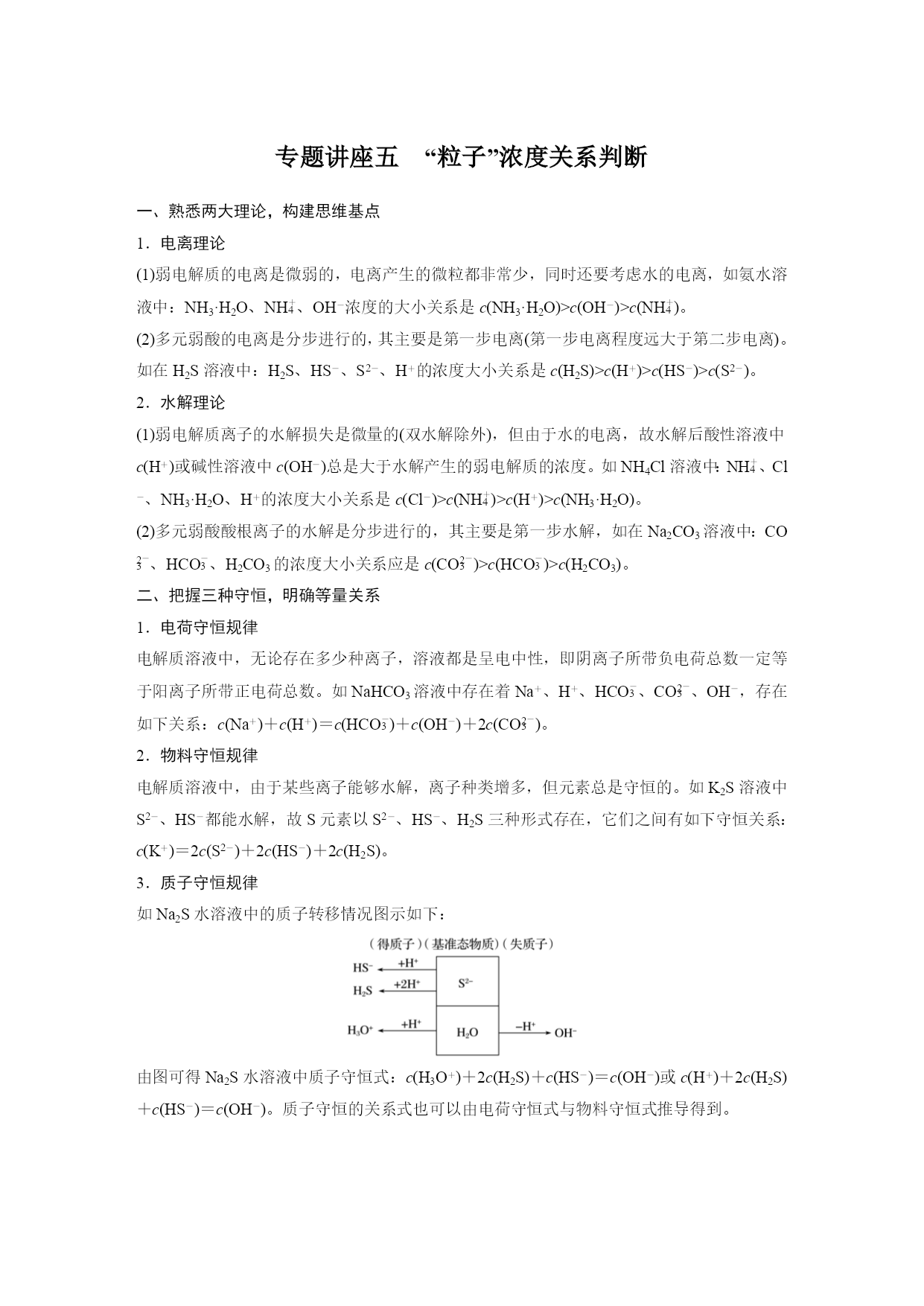 专题讲座五“粒子”浓度关系判断 一、熟悉两大理论,构建思维基点 1.电离理论 (1)弱电解质的电离是微弱的,电离产生的微粒都非常少,同时还要考虑水的电离,如氨水溶液中:NH3·H2O、NHeq\o\al(+,4)、OH-浓度的大小关系是c(NH3·H2O)>c(OH-)>c(NHeq\o\al(+,4))。 (2)多元弱酸的电离是分步进行的,其主要是第一步电离(第一步电离程度远大于第二步电离)。如在H2S溶液中:H2S、HS-、S2-、H+的浓度大小关系是c(H2S)>c(H+)>c(HS-)>c(S2-)。 2.水解理论 (1)弱电解质离子的水解损失是微量的(双水解除外),但由于水的电离,故水解后酸性溶液中c(H+)或碱性溶液中c(OH-)总是大于水解产生的弱电解质的浓度。如NH4Cl溶液中:NHeq\o\al(+,4)、Cl-、NH3·H2O、H+的浓度大小关系是c(Cl-)>c(NHeq\o\al(+,4))>c(H+)>c(NH3·H2O)。 (2)多元弱酸酸根离子的水解是分步进行的,其主要是第一步水解,如在Na2CO3溶液中:COeq\o\al(2-,3)、HCOeq\o\al(-,3)、H2CO3的浓度大小关系应是c(COeq\o\al(2-,3))>c(HCOeq\o\al(-,3))>c(H2CO3)。 二、把握三种守恒,明确等量关系 1.电荷守恒规律 电解质溶液中,无论存在多少种离子,溶液都是呈电中性,即阴离子所带负电荷总数一定等于阳离子所带正电荷总数。如NaHCO3溶液中存在着Na+、H+、HCOeq\o\al(-,3)、COeq\o\al(2-,3)、OH-,存在如下关系:c(Na+)+c(H+)=c(HCOeq\o\al(-,3))+c(OH-)+2c(COeq\o\al(2-,3))。 2.物料守恒规律 电解质溶液中,由于某些离子能够水解,离子种类增多,但元素总是守恒的。如K2S溶液中S2-、HS-都能水解,故S元素以S2-、HS-、H2S三种形式存在,它们之间有如下守恒关系:c(K+)=2c(S2-)+2c(HS-)+2c(H2S)。 3.质子守恒规律 如Na2S水溶液中的质子转移情况图示如下: 由图可得Na2S水溶液中质子守恒式:c(H3O+)+2c(H2S)+c(HS-)=c(OH-)或c(H+)+2c(H2S)+c(HS-)=c(OH-)。质子守恒的关系式也可以由电荷守恒式与物料守恒式推导得到。 三、典例导悟,分类突破 1.粒子种类的判断 [例1](1)NaHCO3溶液中:_______________________________________________。 (2)Na2CO3溶液中:_______________________________________________________。 (3)NaHCO3和Na2CO3的混合溶液中:_______________________________________。 (4)向NaOH溶液中通入CO2气体(任意量):__________________________________。 答案(1)(2)(3)(4)粒子种类都是离子:Na+、COeq\o\al(2-,3)、HCOeq\o\al(-,3)、OH-、H+;分子:H2CO3、H2O 判断盐溶液中粒子种类时,首先要清楚盐溶液中的电离、水解情况,特别是多步电离和多步水解。 如:(1)NaHCO3溶液中,因NaHCO3===Na++HCOeq\o\al(-,3),HCOeq\o\al(-,3)COeq\o\al(2-,3)+H+,HCOeq\o\al(-,3)+H2OH2CO3+OH-,H2OH++OH-。故溶液中的离子有:Na+、COeq\o\al(2-,3)、HCOeq\o\al(-,3)、OH-、H+;分子有:H2CO3、H2O。 2.单一溶液中离子浓度的关系 [例2]0.1mol·L-1的NH4Cl溶液 (1)粒子种类:________________________________________________________________。 (2)离子浓度大小关系:________________________________________________________。 (3)物料守恒:________________________________________________________________。 答案(1)Cl-、NHeq\o\al(+,4)、H+、OH-、NH3·H2O、H2O (2)c(