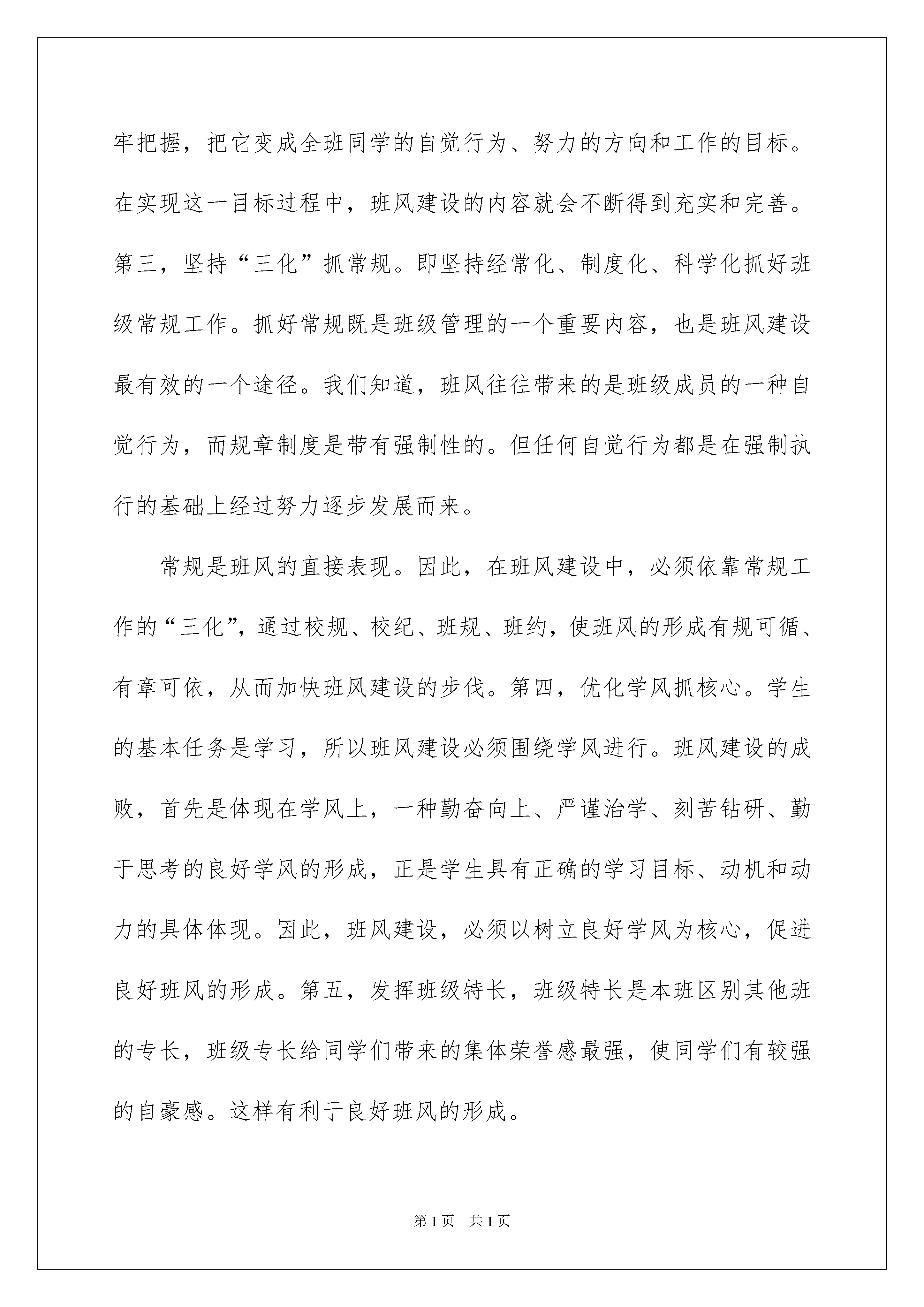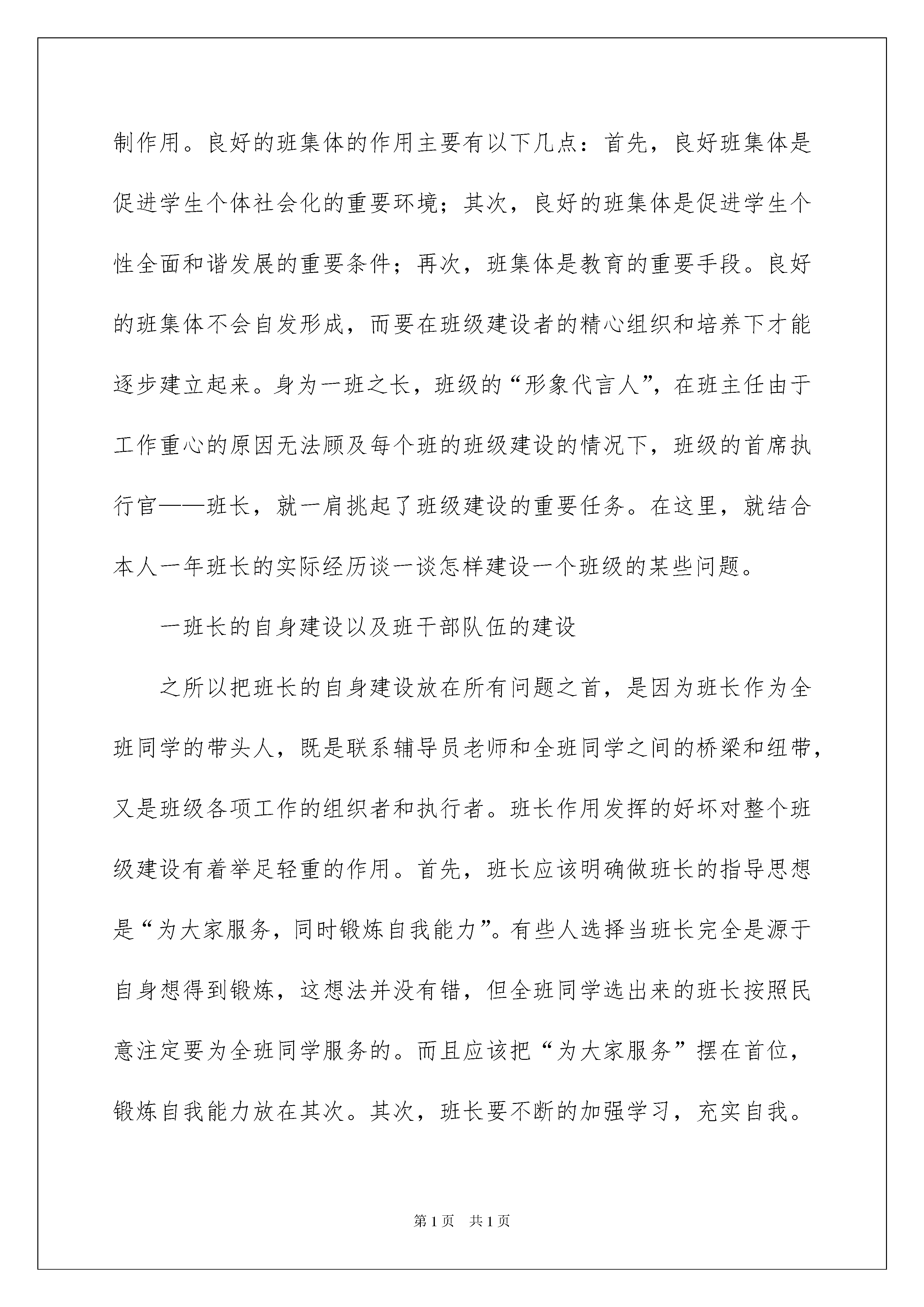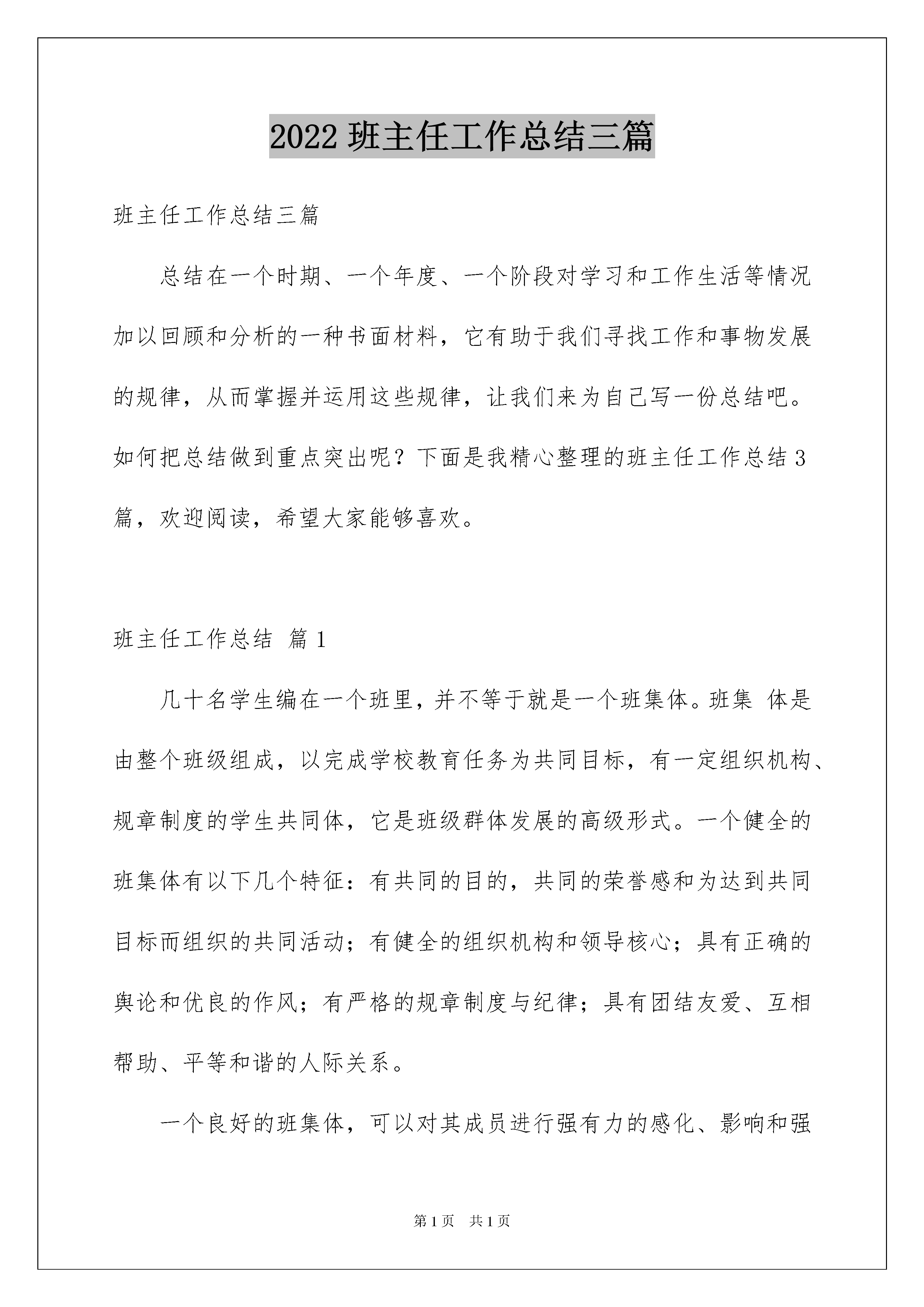 2022班主任工作总结三篇班主任工作总结三篇总结在一个时期、一个年度、一个阶段对学习和工作生活等情况加以回顾和分析的一种书面材料,它有助于我们寻找工作和事物发展的规律,从而掌握并运用这些规律,让我们来为自己写一份总结吧。如何把总结做到重点突出呢?下面是我精心整理的班主任工作总结3篇,欢迎阅读,希望大家能够喜欢。班主任工作总结篇1几十名学生编在一个班里,并不等于就是一个班集体。班集体是由整个班级组成,以完成学校教育任务为共同目标,有一定组织机构、规章制度的学生共同体,它是班级群体发展的高级形式。一个健全的班集体有以下几个特征:有共同的目的,共同的荣誉感和为达到共同目标而组织的共同活动;有健全的组织机构和领导核心;具有正确的舆论和优良的作风;有严格的规章制度与纪律;具有团结友爱、互相帮助、平等和谐的人际关系。一个良好的班集体,可以对其成员进行强有力的感化、影响和强制作用。良好的班集体的作用主要有以下几点:首先,良好班集体是促进学生个体社会化的重要环境;其次,良好的班集体是促进学生个性全面和谐发展的重要条件;再次,班集体是教育的重要手段。良好的班集体不会自发形成,而要在班级建设者的精心组织和培养下才能逐步建立起来。身为一班之长,班级的“形象代言人”,在班主任由于工作重心的原因无法顾及每个班的班级建设的情况下,班级的首席执行官——班长,就一肩挑起了班级建设的重要任务。在这里,就结合本人一年班长的实际经历谈一谈怎样建设一个班级的某些问题。一班长的自身建设以及班干部队伍的建设之所以把班长的自身建设放在所有问题之首,是因为班长作为全班同学的带头人,既是联系辅导员老师和全班同学之间的桥梁和纽带,又是班级各项工作的组织者和执行者。班长作用发挥的好坏对整个班级建设有着举足轻重的作用。首先,班长应该明确做班长的指导思想是“为大家服务,同时锻炼自我能力”。有些人选择当班长完全是源于自身想得到锻炼,这想法并没有错,但全班同学选出来的班长按照民意注定要为全班同学服务的。而且应该把“为大家服务”摆在首位,锻炼自我能力放在其次。其次,班长要不断的加强学习,充实自我。一般说来,要使全班同学对班长信服,班长自身的业务水平一定要高,尽量在学习上、校级的各种竞赛中取得好成绩,此外班长一定要把自己的理论水平提高到一定的高度,这样才能形成自己的班级建设理念。第三,班长一定要具备良好的沟通能力,沟通本班与本年级,沟通自己与全班同学,同时通过各种方法不断加深与全班的感情,为日后的班级建设打造良好的外部条件和内部条件,第四,确立班集体目标,由于目标具有导向、凝聚和激励的作用。目标是集体的发展前景,是班集体的凝聚核心。所以班长一定要制定一个符合本班实际情况的班级目标。班干队伍建设的好坏对班长日后工作开展起重要作用。班干部作为班长的助手,是班级的骨干和核心。一个优秀的班集体必须有一支素质优良,团结协作,富有活力,能独立工作的干部队伍。班长针对班干队伍一定要作好以下工作:一是向他们灌输自己的班级建设理念,力争与他们取得认识上的一致;二是严格要求各位班委干部,要求他们具有高度的责任心和集体荣誉感。三是可以组织全体班干部走出去和人家交流。班干部是全班同学民主选举产生的,由于各方面的原因,选举出来的班干部不可能立即就做得让人满意。要更好的带领班干队伍开展班级建设工作,对班干队伍的建设是班级建设一个必不可少的环节。二班风建设班风是一个班级特有的风貌,或整个班级的风气,它是班级绝大多数学生言论、行动的精神状态的共同倾向或表现。班风发端于舆论的形成。一个班集体的舆论持久地发生作用,就会形成这个班的班风。优良的班风是一种无形的教育力量,可以潜移默化地影响全班同学的思想和行为,对巩固和发展班集体起着重要作用。班风的特点在于自觉性和持久性。全班绝大多数甚至全体同学自觉的坚持某种良好行为,就会在某方面形成好的班风。优良的班风是在班委会长期培养下逐步形成起来的,在实践中应做好以下几方面的工作:第一,强化集体观念抓舆论。集体舆论的监督,能够锻炼同学的性格,培养同学的意志,能够培养同学好的个人行为习惯,能够培养同学对集体的自豪感和责任感。良好的集体舆论,既是班风建设的一个内容,也是班风的表现形式之一。因此,在班风建设中,要大造舆论,来强化班风的约束和激励作用,强化班级成员的集体意识。第二,明确目标抓导向。班级奋斗目标,是班风建设的一大支柱及主导向。目标一旦确定,就要牢牢把握,把它变成全班同学的自觉行为、努力的方向和工作的目标。在实现这一目标过程中,班风建设的内容就会不断得到充实和完善。第三,坚持“三化”抓常规。即坚持经常化、制度化、科学化抓好班级常规工