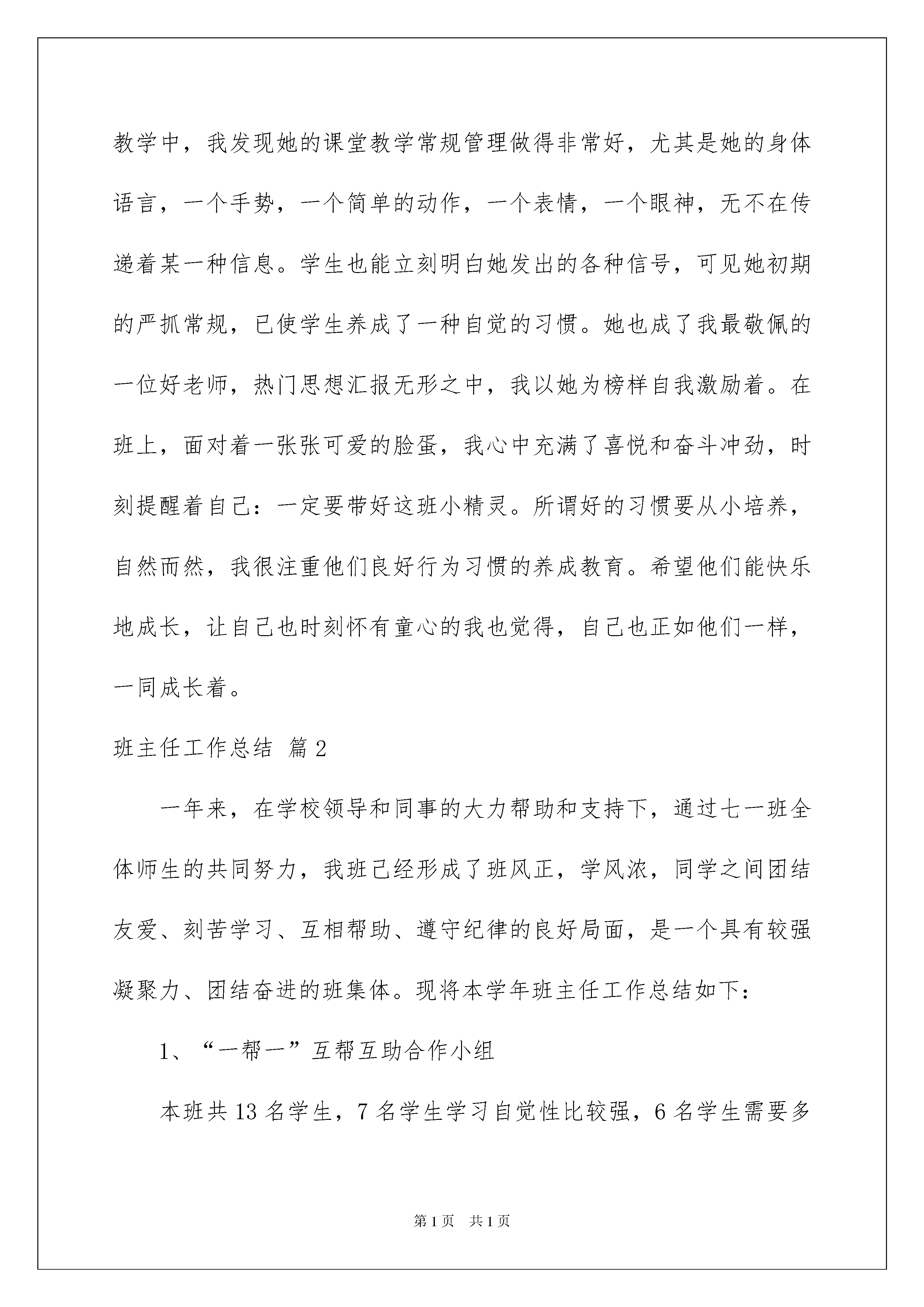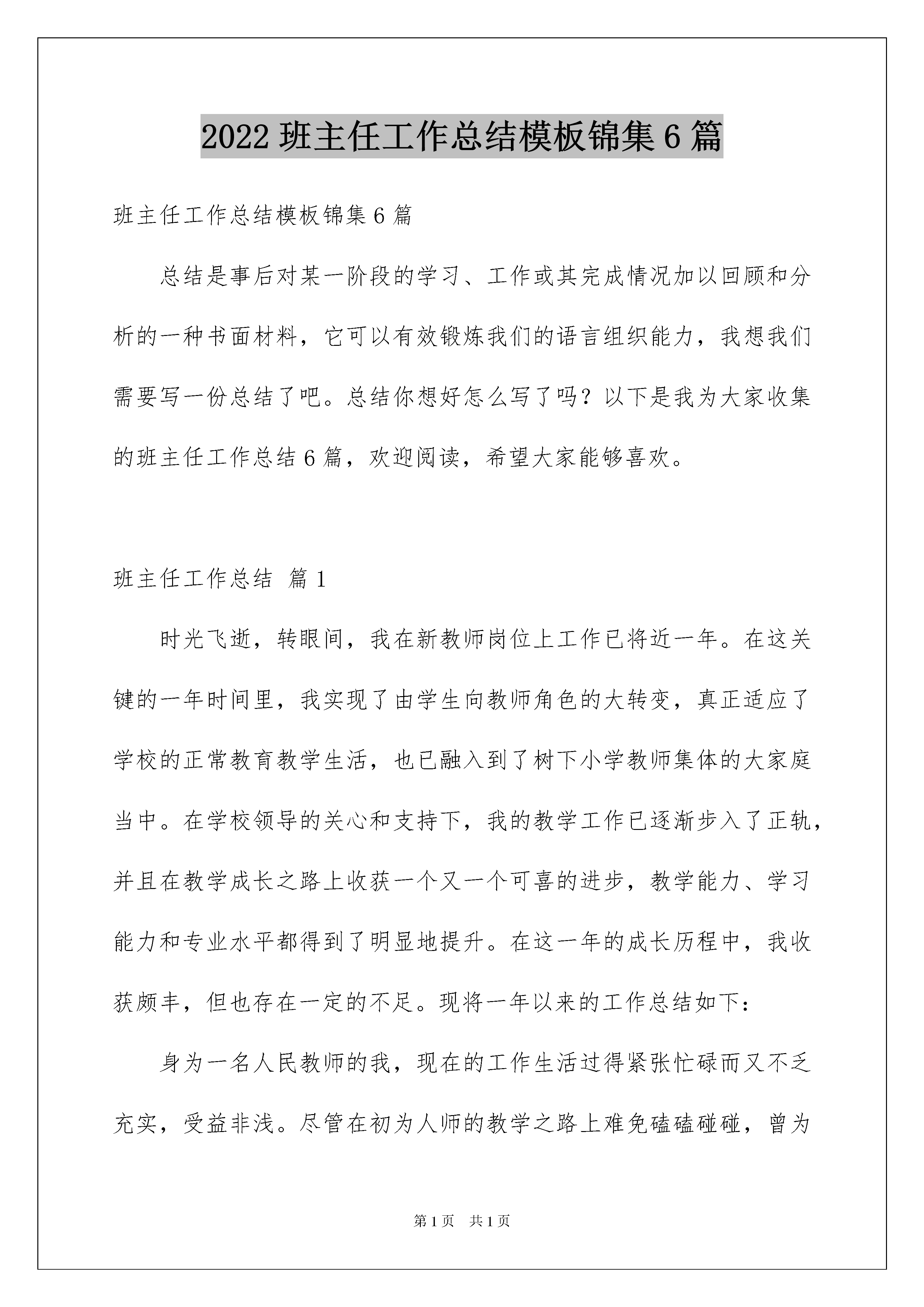 2022班主任工作总结模板锦集6篇班主任工作总结模板锦集6篇总结是事后对某一阶段的学习、工作或其完成情况加以回顾和分析的一种书面材料,它可以有效锻炼我们的语言组织能力,我想我们需要写一份总结了吧。总结你想好怎么写了吗?以下是我为大家收集的班主任工作总结6篇,欢迎阅读,希望大家能够喜欢。班主任工作总结篇1时光飞逝,转眼间,我在新教师岗位上工作已将近一年。在这关键的一年时间里,我实现了由学生向教师角色的大转变,真正适应了学校的正常教育教学生活,也已融入到了树下小学教师集体的大家庭当中。在学校领导的关心和支持下,我的教学工作已逐渐步入了正轨,并且在教学成长之路上收获一个又一个可喜的进步,教学能力、学习能力和专业水平都得到了明显地提升。在这一年的成长历程中,我收获颇丰,但也存在一定的不足。现将一年以来的工作总结如下:身为一名人民教师的我,现在的工作生活过得紧张忙碌而又不乏充实,受益非浅。尽管在初为人师的教学之路上难免磕磕碰碰,曾为学生的不努力而担忧,抑或是为自己缺乏教学经验,特别是班级管理经验而感到纳闷,曾为学生对自己的辛勤辅导当成是老师的自作多情而懊恼……一切的一切,都还需要我不断地去努力,去学习、研究和探索教学经验和班级管理经验,了解学生,认真备好课,上好课,认真辅导,尽心尽力,以求问心无愧,期许尽早成为一名教学能手直至教学骨干,获得长足的进步,获取宝贵的经验。我担任四年级和五年级以及六年级这三个中高年级的美术教学,同时还兼任学校幼儿班的班主任。对于一位刚踏进教师行列的新老师来说,我面对的是一大堆的未知和茫然。起初,我将它当成是对自我的一次大挑战,尽自己的最大努力去尝试,不断去适应和探索,同时还向老教师请教经验。一路下来,我觉得兼顾三个年级的美术教学,很多时候觉得力不从心,六年级的学生两级分化严重,学习好的同学比较自觉和勤奋,但另一方面,基础比较差的学生也比较多,无心向学、懒惰成性,上课喜欢讲话,搞小动作,让我变成在三个年级两边转,两头忙,一来要管理好幼儿班,整理琐碎的班级事务管理,应对幼儿的好动和纪律管理,还要负责对高年级差生及时的辅导,有时真的感到很累。此时自己也会用阿q的精神来自我安慰和调节:要是自己有分身术就好了!自我认为,面对这一局面,讲究方法非常重要,时间和多种因素也要充分考虑在内,尽管有些因素是无法把握和控制的。在教学工作总结上,我努力钻研教材,写教案,认真备课等。在研究教材方面,对于课程的教学重难点,起初把握不是很精当,但在老教师的指导帮助下,通过对教师教学用书的反复研读和学习,我逐步对教学重难点的把握有了一定的领悟。在教学工作中,读懂、读透教材非常重要,这一直是我的指导老师对我的谆谆教导。只有把教材吃透,理解消化了,教学的效果和质量才能得到保证和提升。从教育的角度看,美术课程是一门对学生的发展具有重要促进作用的课程。然而由于各种原因,目前人们对美术课程的重视还远远没有达到应有的程度。美术课在中小学课程中,依然处于弱势地位。认清这一点,有助于我制定切合实际的美术教学标准。理想的美术课程应该尽量使每个学生积极参与美术学习,并且促使每个学生在各自的基础上获得不同程度的发展,因此我想方设法去调动学生的学习积极性,倡导愉快教学,让学生在课堂学习中获得乐趣。遵循着这一教育理念,我一直在努力着。在课堂教学中,注重灵活地选择教学方法,并注意围绕教学目标来开展教学活动,注重培养学生的课前预习、课后复习良好学习习惯。本着“一课一评,在评中求反思,在反思中求提升”原则,我都会认真听取其他听课老师提出的宝贵意见和建议,认真反思并改进。自己也认为,只有善于进行教学反思才能使自己成长得更快。在班主任个人工作计划中,我因为缺乏班级管理经验,同时又是幼儿的班主任,所以感到甚是吃力,多亏了学校领导和各位老师的帮助和指导。但面对着一班小家伙,我有时候还真是感到束手无策,一大堆繁琐的事情等着我去操心,一大堆繁琐的工作等着我去身体力行,一大堆班级小矛盾等着我去处理。对于班级的有效管理,在我向其他老师取经的过程中,我懂得了要当好一名班主任,要有信心、耐心和爱心,这三心在班级后进生的转化工作中表现得极为重要。当班主任给我的最大感触就是深刻体会到了“爱心”和“责任”的力量。对于幼儿小朋友,他们有的才刚刚入学,面对陌生的大集体,或许有许多的不适应,我更要认真地给予引导和鼓励。在这里,我特别要感谢何文琴老师给我的鼓励和帮助,她毫不保留地将她十几年来的班级管理经验传授给我,让我懂得了班级课堂教学常规管理在班级管理中的重要性,于是我根据她的经验作法来常抓学生的常规工作,在她的课堂教学中,我发现她的课堂教学常规管