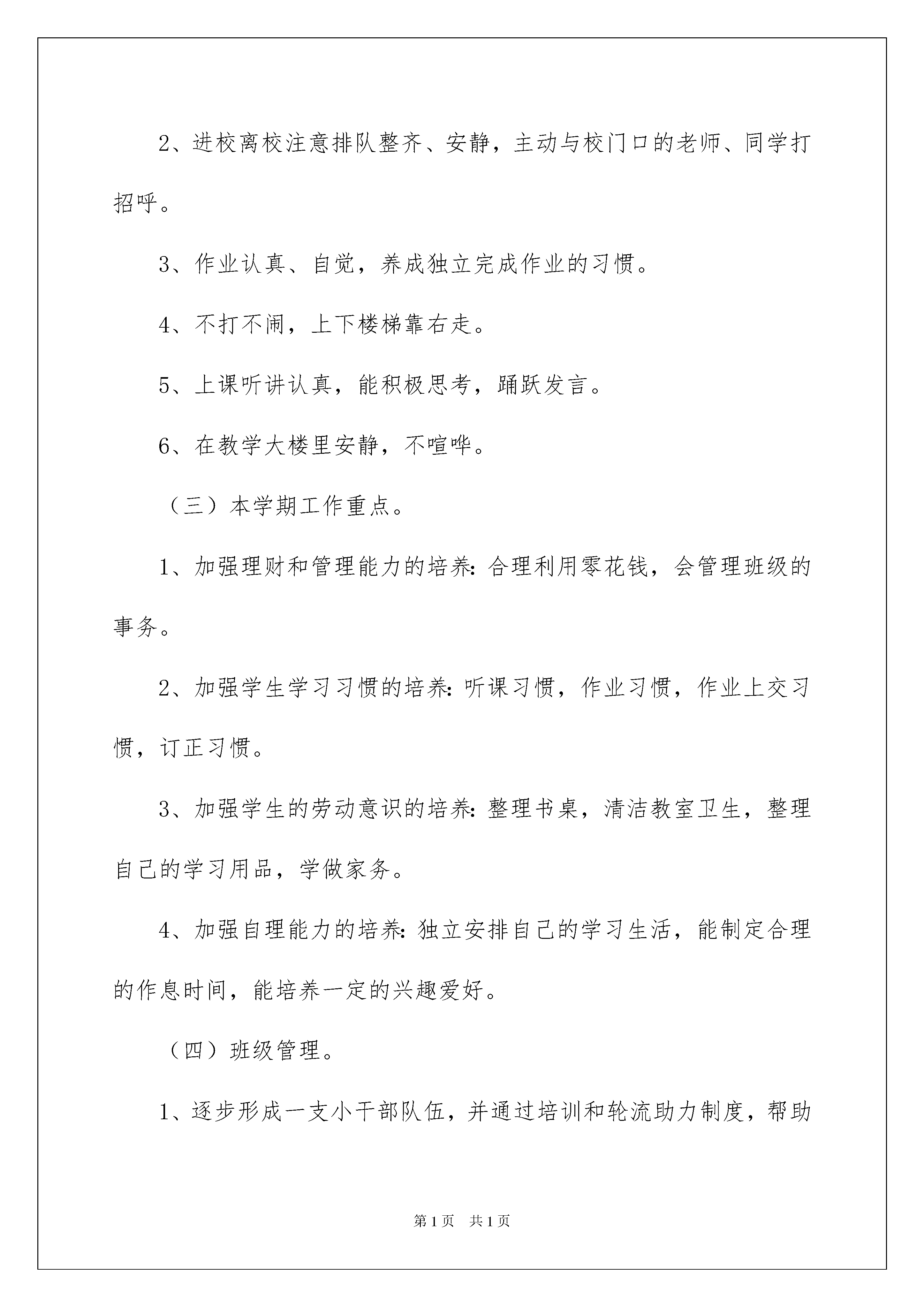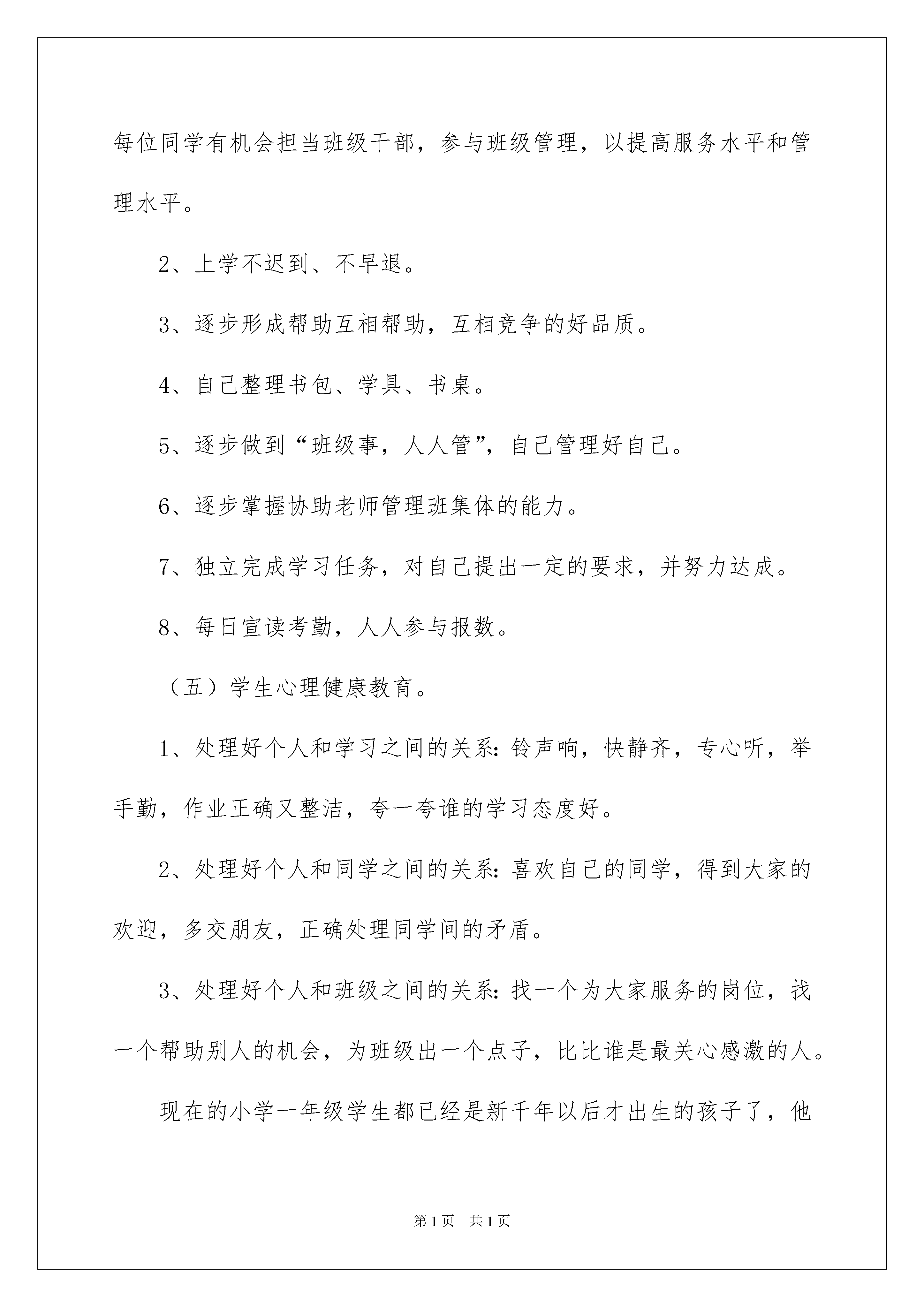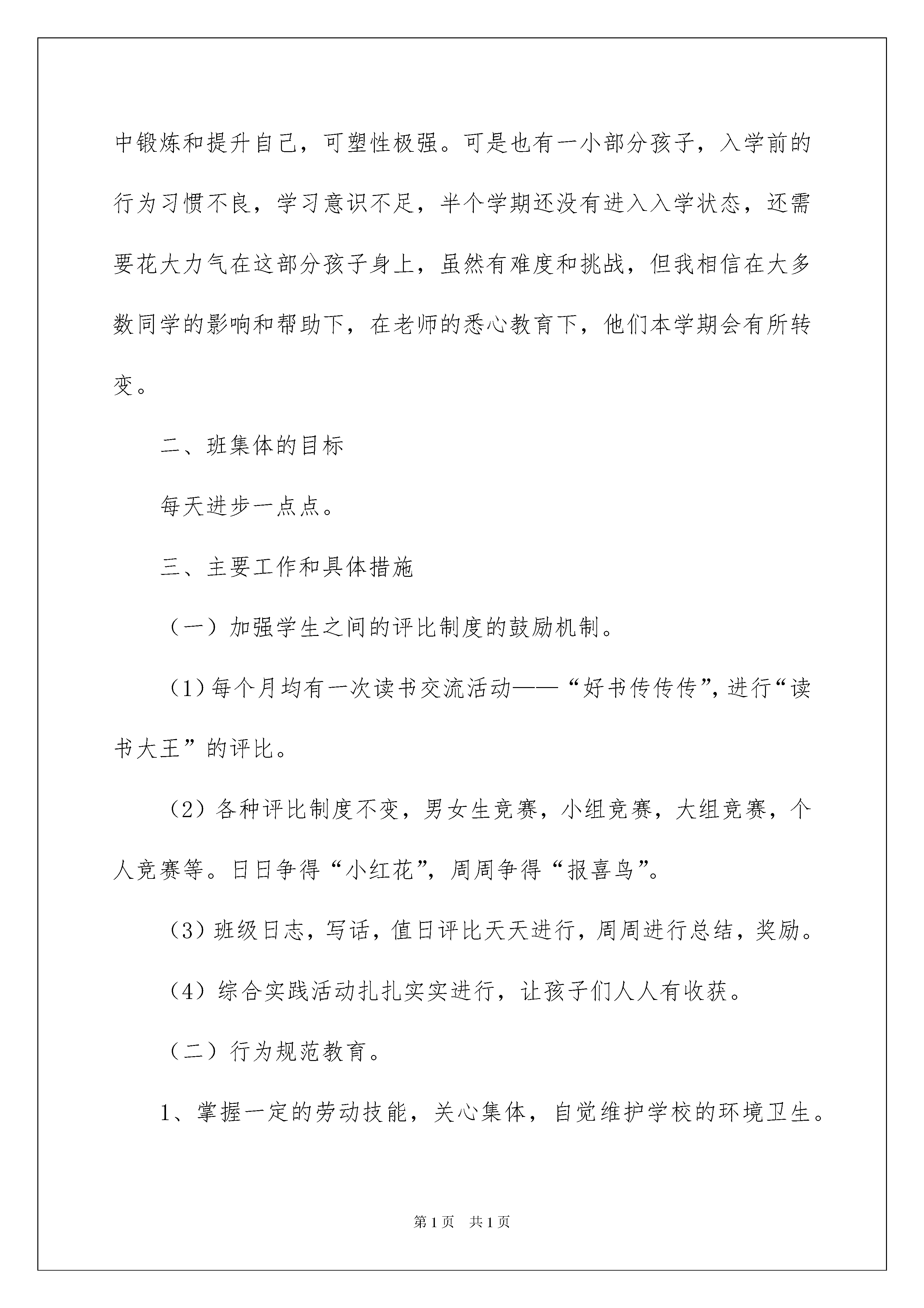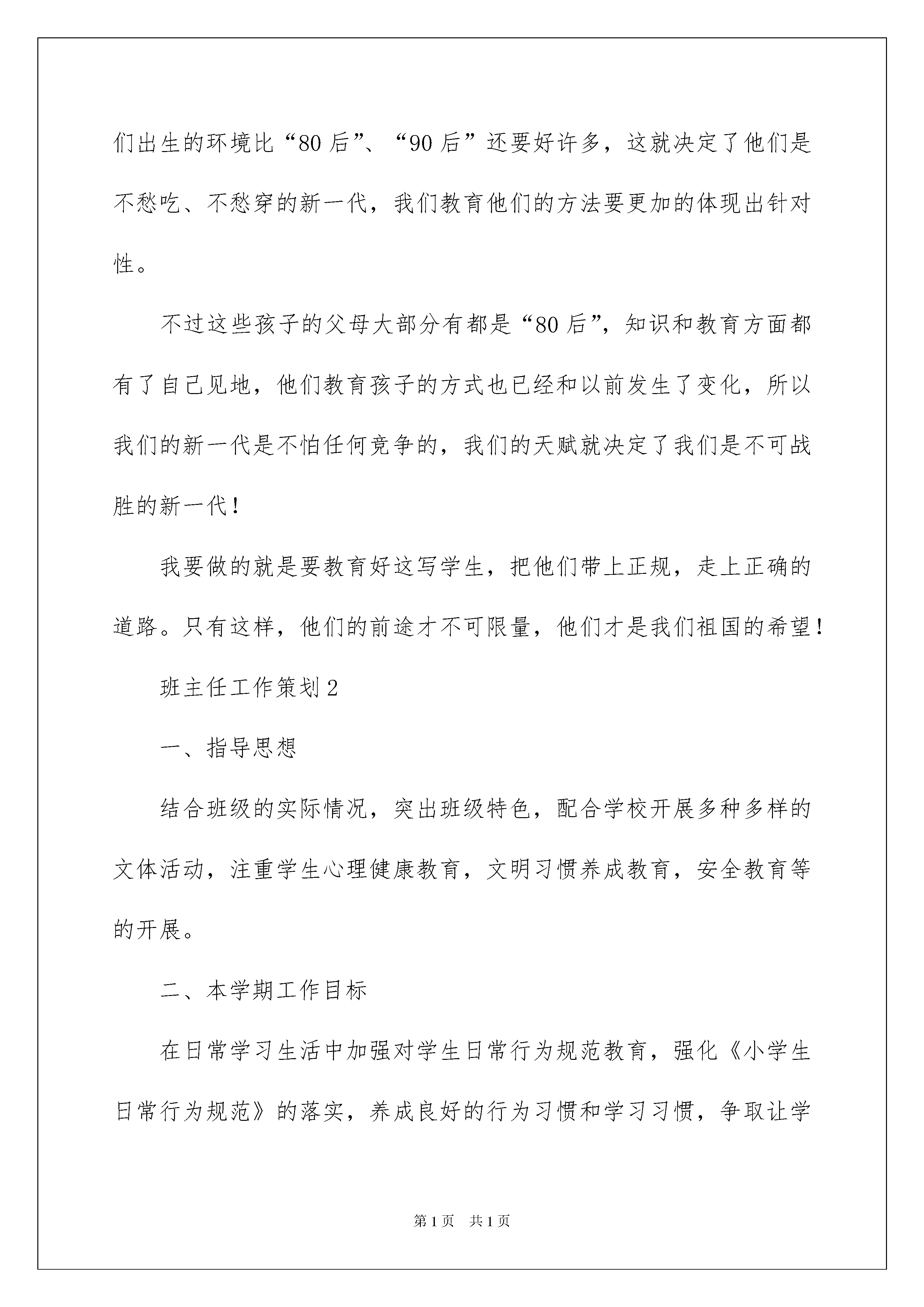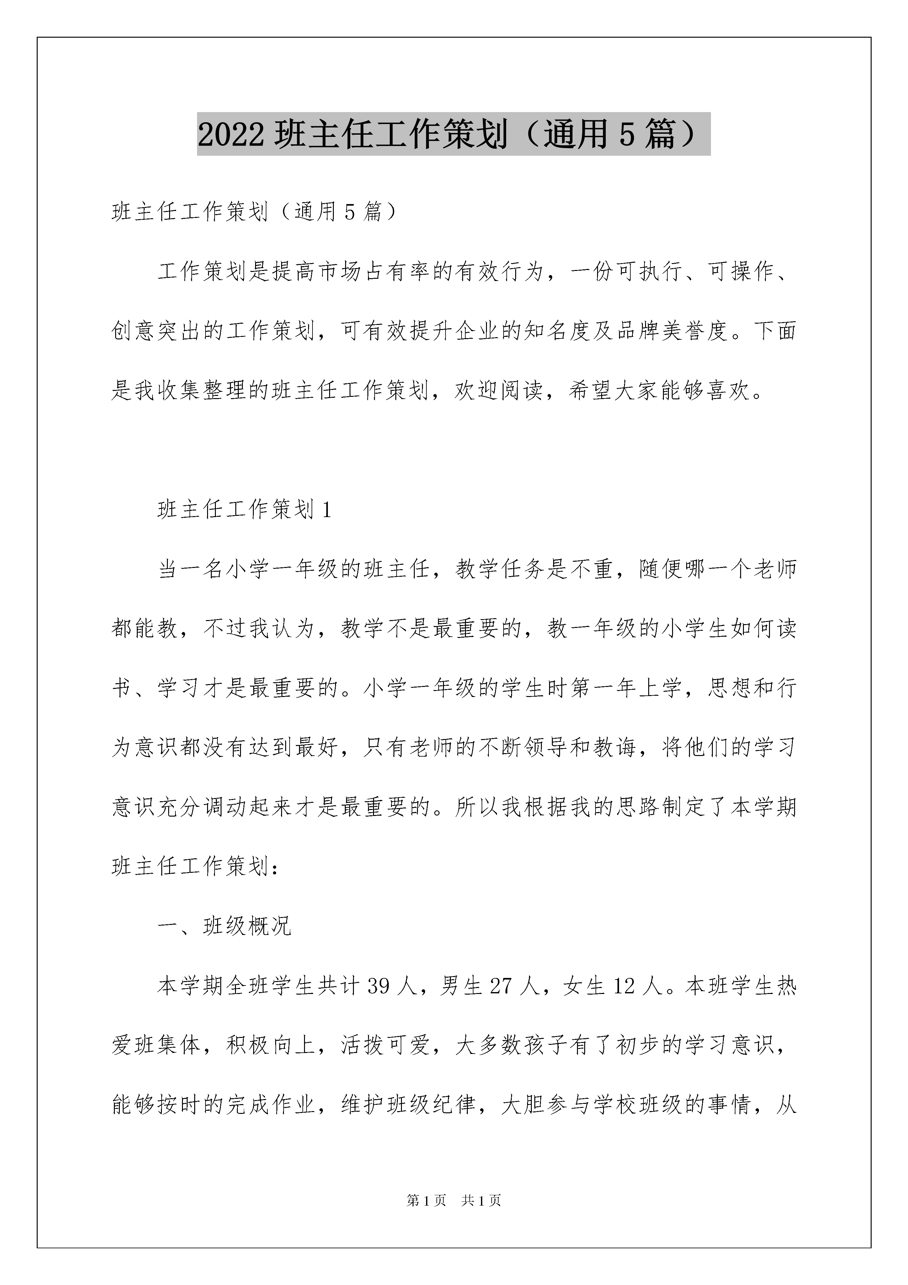 2022班主任工作策划(通用5篇)班主任工作策划(通用5篇)工作策划是提高市场占有率的有效行为,一份可执行、可操作、创意突出的工作策划,可有效提升企业的知名度及品牌美誉度。下面是我收集整理的班主任工作策划,欢迎阅读,希望大家能够喜欢。班主任工作策划1当一名小学一年级的班主任,教学任务是不重,随便哪一个老师都能教,不过我认为,教学不是最重要的,教一年级的小学生如何读书、学习才是最重要的。小学一年级的学生时第一年上学,思想和行为意识都没有达到最好,只有老师的不断领导和教诲,将他们的学习意识充分调动起来才是最重要的。所以我根据我的思路制定了本学期班主任工作策划:一、班级概况本学期全班学生共计39人,男生27人,女生12人。本班学生热爱班集体,积极向上,活拨可爱,大多数孩子有了初步的学习意识,能够按时的完成作业,维护班级纪律,大胆参与学校班级的事情,从中锻炼和提升自己,可塑性极强。可是也有一小部分孩子,入学前的行为习惯不良,学习意识不足,半个学期还没有进入入学状态,还需要花大力气在这部分孩子身上,虽然有难度和挑战,但我相信在大多数同学的影响和帮助下,在老师的悉心教育下,他们本学期会有所转变。二、班集体的目标每天进步一点点。三、主要工作和具体措施(一)加强学生之间的评比制度的鼓励机制。(1)每个月均有一次读书交流活动——“好书传传传”,进行“读书大王”的评比。(2)各种评比制度不变,男女生竞赛,小组竞赛,大组竞赛,个人竞赛等。日日争得“小红花”,周周争得“报喜鸟”。(3)班级日志,写话,值日评比天天进行,周周进行总结,奖励。(4)综合实践活动扎扎实实进行,让孩子们人人有收获。(二)行为规范教育。1、掌握一定的劳动技能,关心集体,自觉维护学校的环境卫生。2、进校离校注意排队整齐、安静,主动与校门口的老师、同学打招呼。3、作业认真、自觉,养成独立完成作业的习惯。4、不打不闹,上下楼梯靠右走。5、上课听讲认真,能积极思考,踊跃发言。6、在教学大楼里安静,不喧哗。(三)本学期工作重点。1、加强理财和管理能力的培养:合理利用零花钱,会管理班级的事务。2、加强学生学习习惯的培养:听课习惯,作业习惯,作业上交习惯,订正习惯。3、加强学生的劳动意识的培养:整理书桌,清洁教室卫生,整理自己的学习用品,学做家务。4、加强自理能力的培养:独立安排自己的学习生活,能制定合理的作息时间,能培养一定的兴趣爱好。(四)班级管理。1、逐步形成一支小干部队伍,并通过培训和轮流助力制度,帮助每位同学有机会担当班级干部,参与班级管理,以提高服务水平和管理水平。2、上学不迟到、不早退。3、逐步形成帮助互相帮助,互相竞争的好品质。4、自己整理书包、学具、书桌。5、逐步做到“班级事,人人管”,自己管理好自己。6、逐步掌握协助老师管理班集体的能力。7、独立完成学习任务,对自己提出一定的要求,并努力达成。8、每日宣读考勤,人人参与报数。(五)学生心理健康教育。1、处理好个人和学习之间的关系:铃声响,快静齐,专心听,举手勤,作业正确又整洁,夸一夸谁的学习态度好。2、处理好个人和同学之间的关系:喜欢自己的同学,得到大家的欢迎,多交朋友,正确处理同学间的矛盾。3、处理好个人和班级之间的关系:找一个为大家服务的岗位,找一个帮助别人的机会,为班级出一个点子,比比谁是最关心感激的人。现在的小学一年级学生都已经是新千年以后才出生的孩子了,他们出生的环境比“80后”、“90后”还要好许多,这就决定了他们是不愁吃、不愁穿的新一代,我们教育他们的方法要更加的体现出针对性。不过这些孩子的父母大部分有都是“80后”,知识和教育方面都有了自己见地,他们教育孩子的方式也已经和以前发生了变化,所以我们的新一代是不怕任何竞争的,我们的天赋就决定了我们是不可战胜的新一代!我要做的就是要教育好这写学生,把他们带上正规,走上正确的道路。只有这样,他们的前途才不可限量,他们才是我们祖国的希望!班主任工作策划2一、指导思想结合班级的实际情况,突出班级特色,配合学校开展多种多样的文体活动,注重学生心理健康教育,文明习惯养成教育,安全教育等的开展。二、本学期工作目标在日常学习生活中加强对学生日常行为规范教育,强化《小学生日常行为规范》的落实,养成良好的行为习惯和学习习惯,争取让学生形成自律意识,自己管理自己,全体同学能树立明确的学习目标,形成良好的学习风气,弘扬良好的班级风貌,增强集体荣誉感,逐步形成守纪、进取、勤奋的班风班貌。三、主要工作及措施1、制定班集体的共同奋斗目标,发扬班训、班风;2、日常管理系统化,形成良好的学习生活习惯;3、制定周策划,循序渐进开展养成教育;4