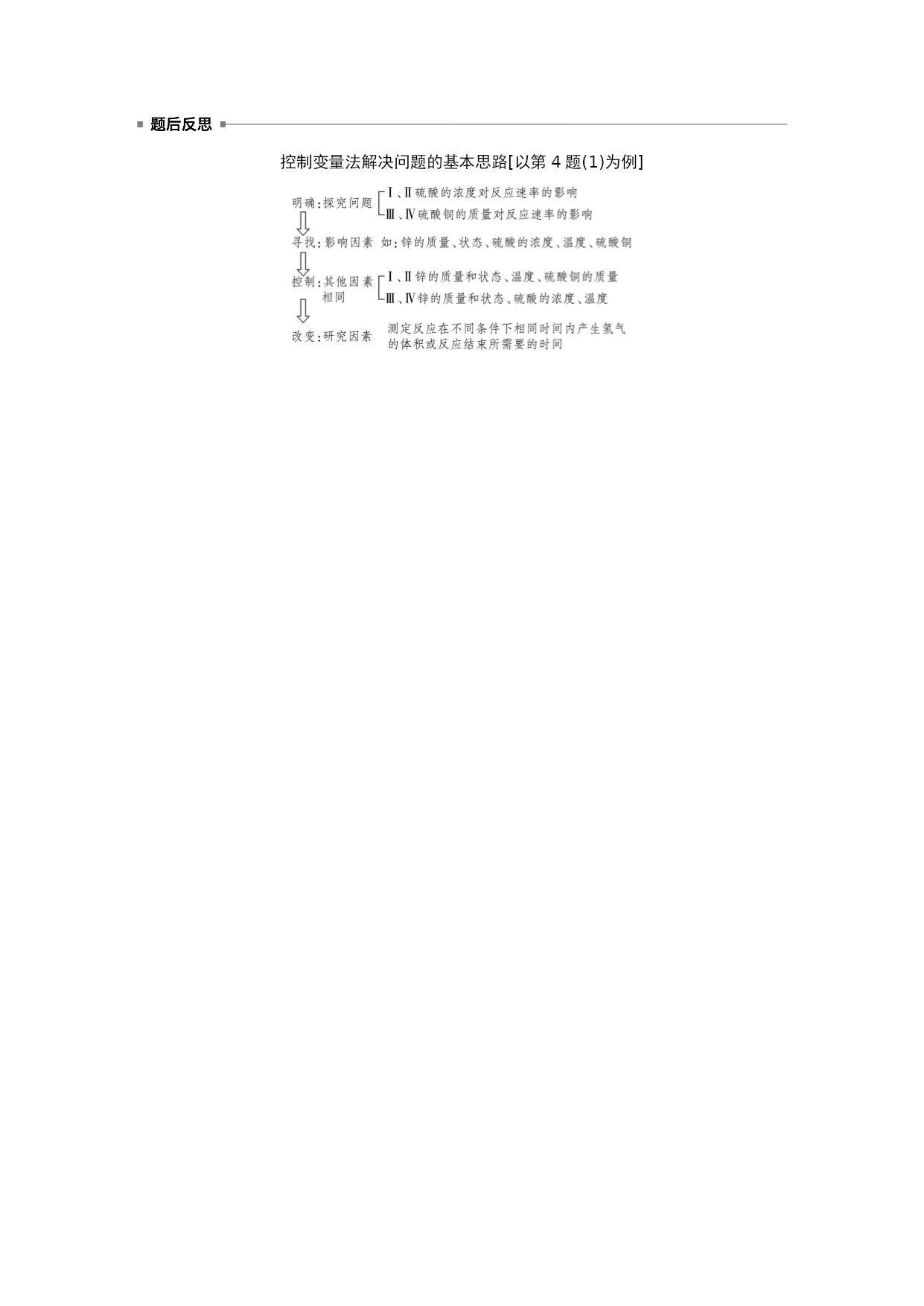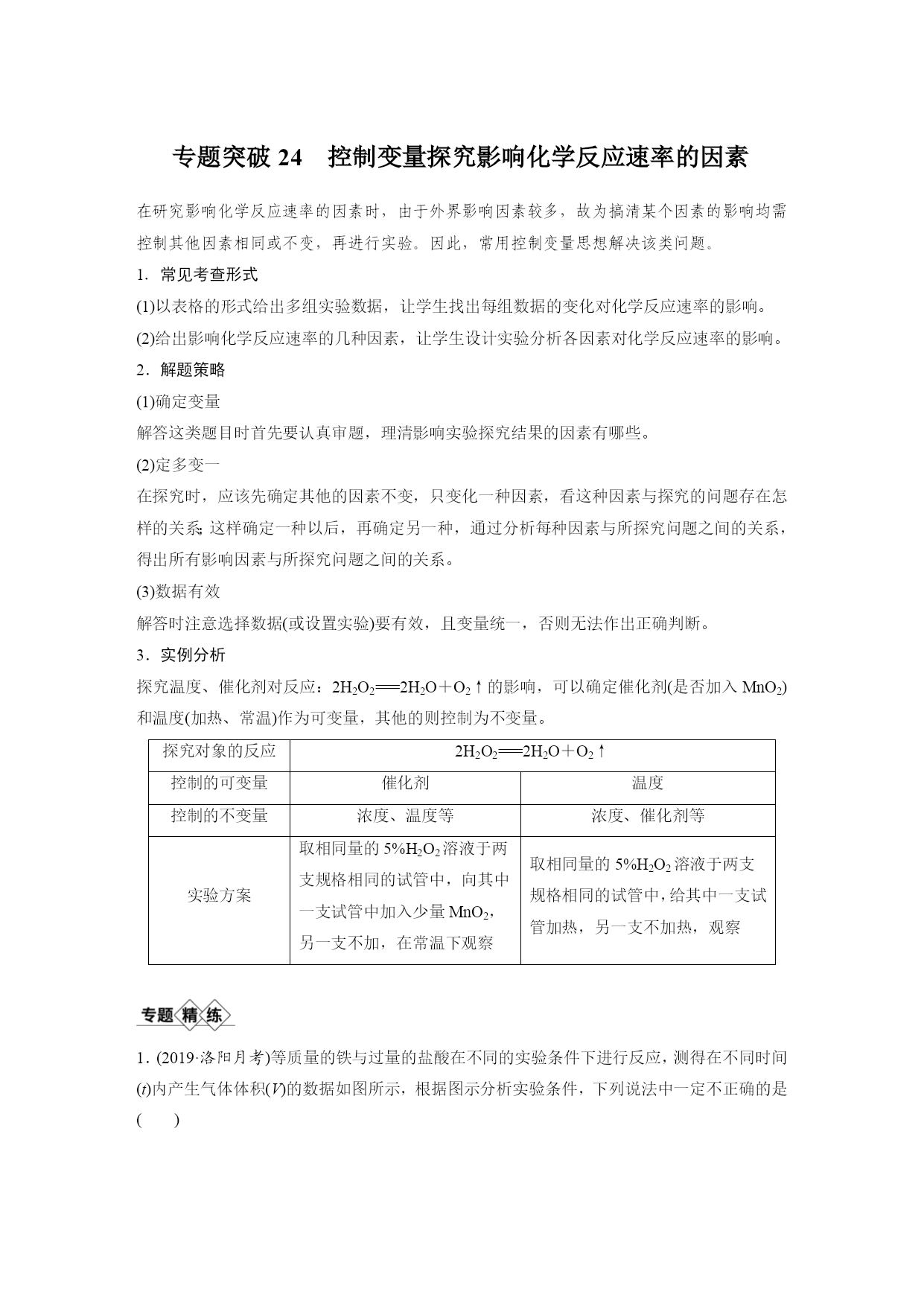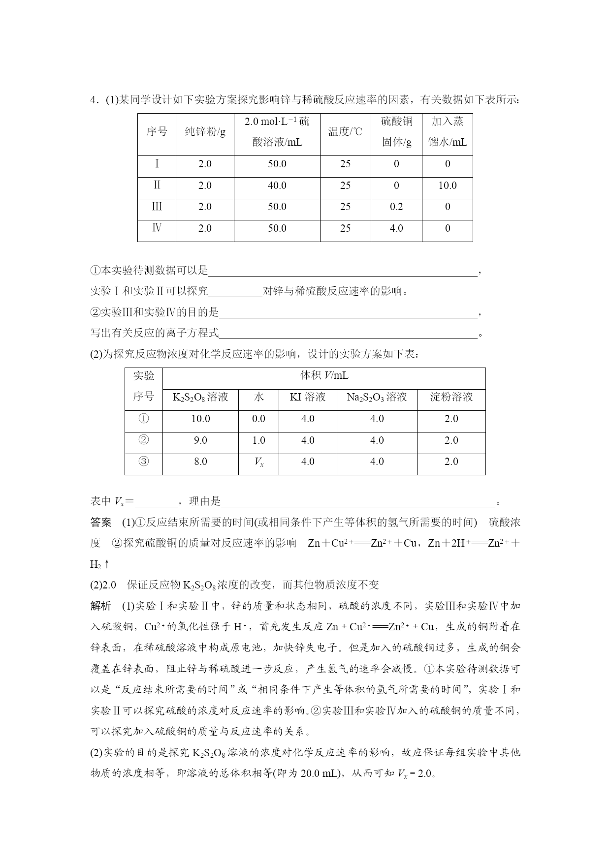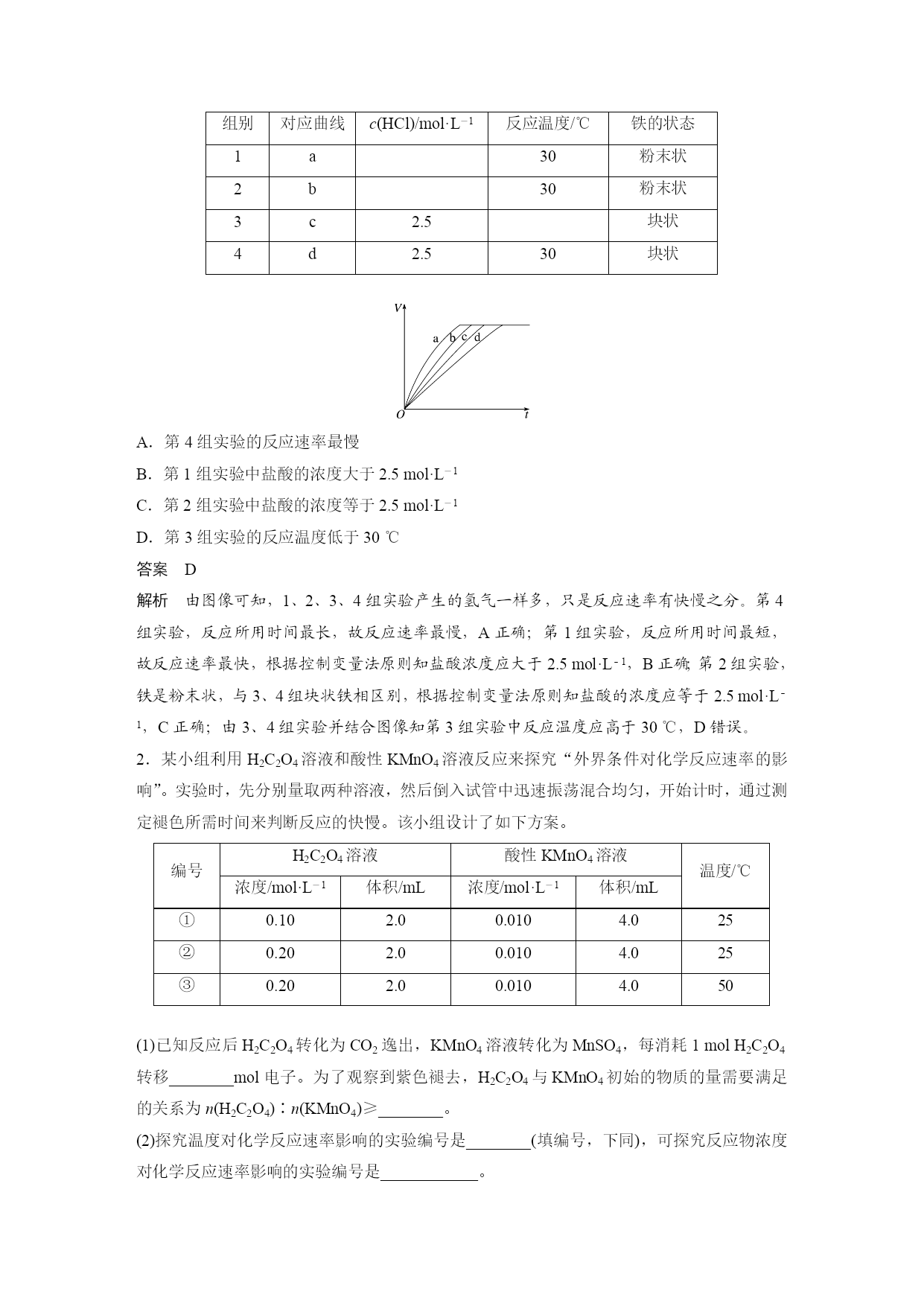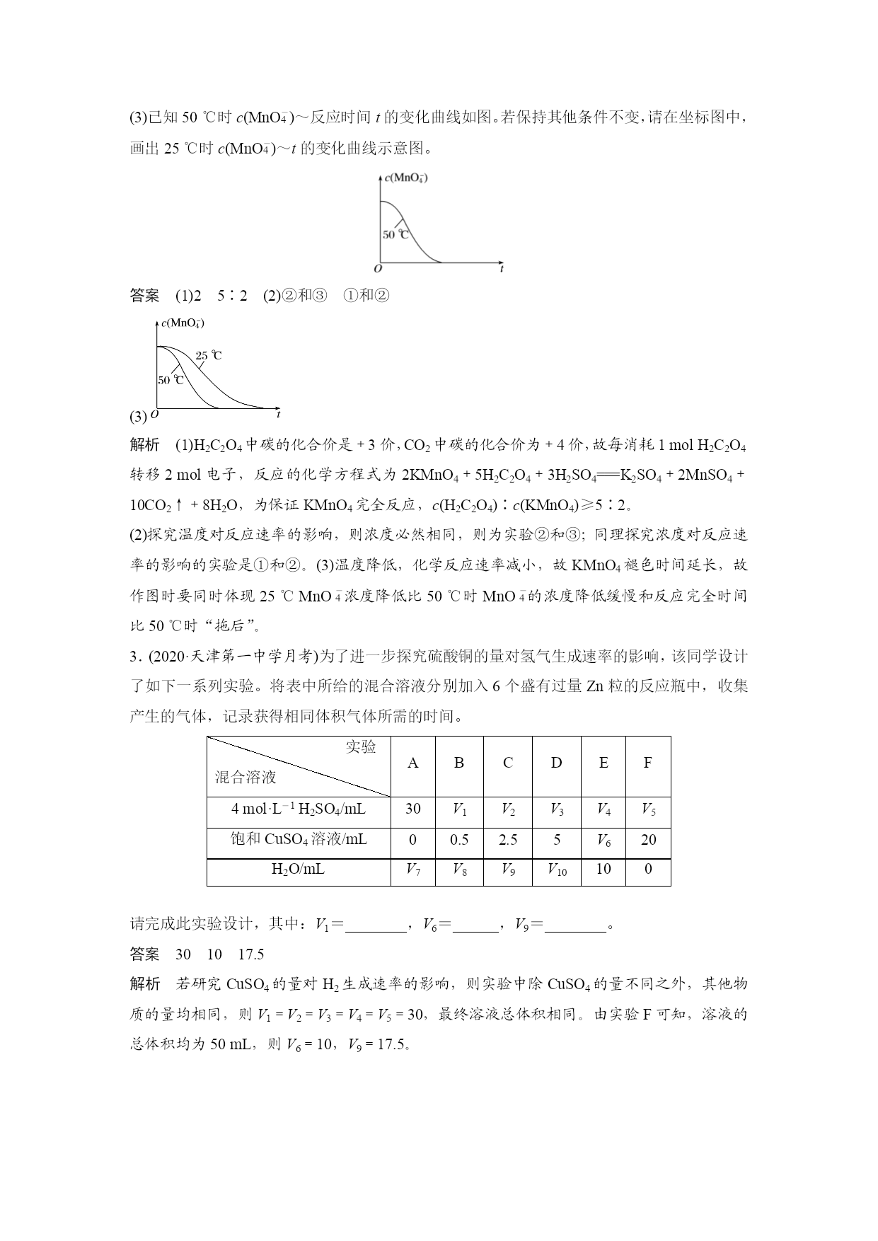 专题突破24控制变量探究影响化学反应速率的因素 在研究影响化学反应速率的因素时,由于外界影响因素较多,故为搞清某个因素的影响均需控制其他因素相同或不变,再进行实验。因此,常用控制变量思想解决该类问题。 1.常见考查形式 (1)以表格的形式给出多组实验数据,让学生找出每组数据的变化对化学反应速率的影响。 (2)给出影响化学反应速率的几种因素,让学生设计实验分析各因素对化学反应速率的影响。 2.解题策略 (1)确定变量 解答这类题目时首先要认真审题,理清影响实验探究结果的因素有哪些。 (2)定多变一 在探究时,应该先确定其他的因素不变,只变化一种因素,看这种因素与探究的问题存在怎样的关系;这样确定一种以后,再确定另一种,通过分析每种因素与所探究问题之间的关系,得出所有影响因素与所探究问题之间的关系。 (3)数据有效 解答时注意选择数据(或设置实验)要有效,且变量统一,否则无法作出正确判断。 3.实例分析 探究温度、催化剂对反应:2H2O2===2H2O+O2↑的影响,可以确定催化剂(是否加入MnO2)和温度(加热、常温)作为可变量,其他的则控制为不变量。 探究对象的反应2H2O2===2H2O+O2↑控制的可变量催化剂温度控制的不变量浓度、温度等浓度、催化剂等实验方案取相同量的5%H2O2溶液于两支规格相同的试管中,向其中一支试管中加入少量MnO2,另一支不加,在常温下观察取相同量的5%H2O2溶液于两支规格相同的试管中,给其中一支试管加热,另一支不加热,观察 1.(2019·洛阳月考)等质量的铁与过量的盐酸在不同的实验条件下进行反应,测得在不同时间(t)内产生气体体积(V)的数据如图所示,根据图示分析实验条件,下列说法中一定不正确的是() 组别对应曲线c(HCl)/mol·L-1反应温度/℃铁的状态1a30粉末状2b30粉末状3c2.5块状4d2.530块状 A.第4组实验的反应速率最慢 B.第1组实验中盐酸的浓度大于2.5mol·L-1 C.第2组实验中盐酸的浓度等于2.5mol·L-1 D.第3组实验的反应温度低于30℃ 答案D 解析由图像可知,1、2、3、4组实验产生的氢气一样多,只是反应速率有快慢之分。第4组实验,反应所用时间最长,故反应速率最慢,A正确;第1组实验,反应所用时间最短,故反应速率最快,根据控制变量法原则知盐酸浓度应大于2.5mol·L-1,B正确;第2组实验,铁是粉末状,与3、4组块状铁相区别,根据控制变量法原则知盐酸的浓度应等于2.5mol·L-1,C正确;由3、4组实验并结合图像知第3组实验中反应温度应高于30℃,D错误。 2.某小组利用H2C2O4溶液和酸性KMnO4溶液反应来探究“外界条件对化学反应速率的影响”。实验时,先分别量取两种溶液,然后倒入试管中迅速振荡混合均匀,开始计时,通过测定褪色所需时间来判断反应的快慢。该小组设计了如下方案。 编号H2C2O4溶液酸性KMnO4溶液温度/℃浓度/mol·L-1体积/mL浓度/mol·L-1体积/mL①0.102.00.0104.025②0.202.00.0104.025③0.202.00.0104.050 (1)已知反应后H2C2O4转化为CO2逸出,KMnO4溶液转化为MnSO4,每消耗1molH2C2O4转移________mol电子。为了观察到紫色褪去,H2C2O4与KMnO4初始的物质的量需要满足的关系为n(H2C2O4)∶n(KMnO4)≥________。 (2)探究温度对化学反应速率影响的实验编号是________(填编号,下同),可探究反应物浓度对化学反应速率影响的实验编号是____________。 (3)已知50℃时c(MnOeq\o\al(-,4))~反应时间t的变化曲线如图。若保持其他条件不变,请在坐标图中,画出25℃时c(MnOeq\o\al(-,4))~t的变化曲线示意图。 答案(1)25∶2(2)②和③①和② (3) 解析(1)H2C2O4中碳的化合价是+3价,CO2中碳的化合价为+4价,故每消耗1molH2C2O4转移2mol电子,反应的化学方程式为2KMnO4+5H2C2O4+3H2SO4===K2SO4+2MnSO4+10CO2↑+8H2O,为保证KMnO4完全反应,c(H2C2O4)∶c(KMnO4)≥5∶2。 (2)探究温度对反应速率的影响,则浓度必然相同,则为实验②和③;同理探究浓度对反应速率的影响的实验是①和②。(3)温度降低,化学反应速率减小,故KMnO4褪色时间延长,故作图时要同时体现25℃MnOeq\o\al(-,4)浓度降低比50℃时MnOeq\o\al(-,4)的浓度降低缓慢和反应完全时间比50℃时“拖后”。 3.(2020·天津第一中学月考)为了进一步探究硫酸铜的