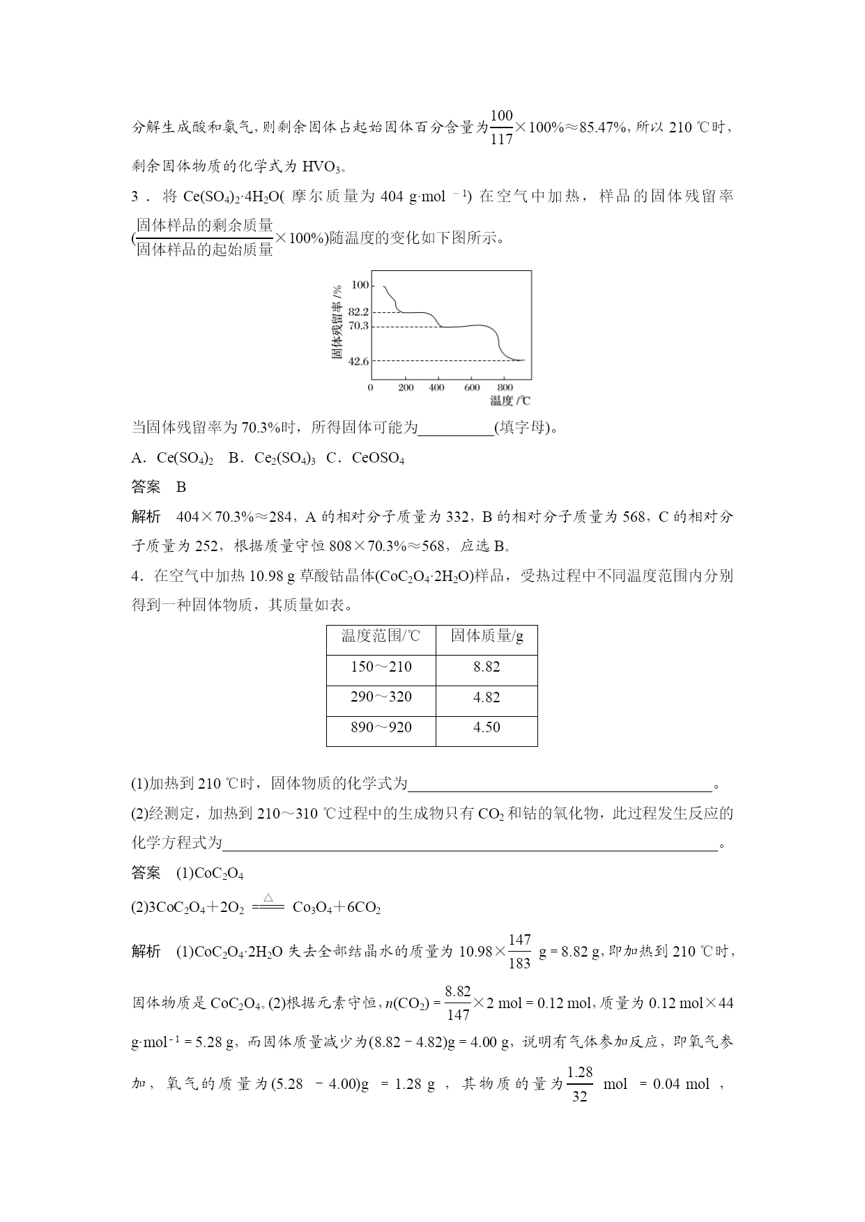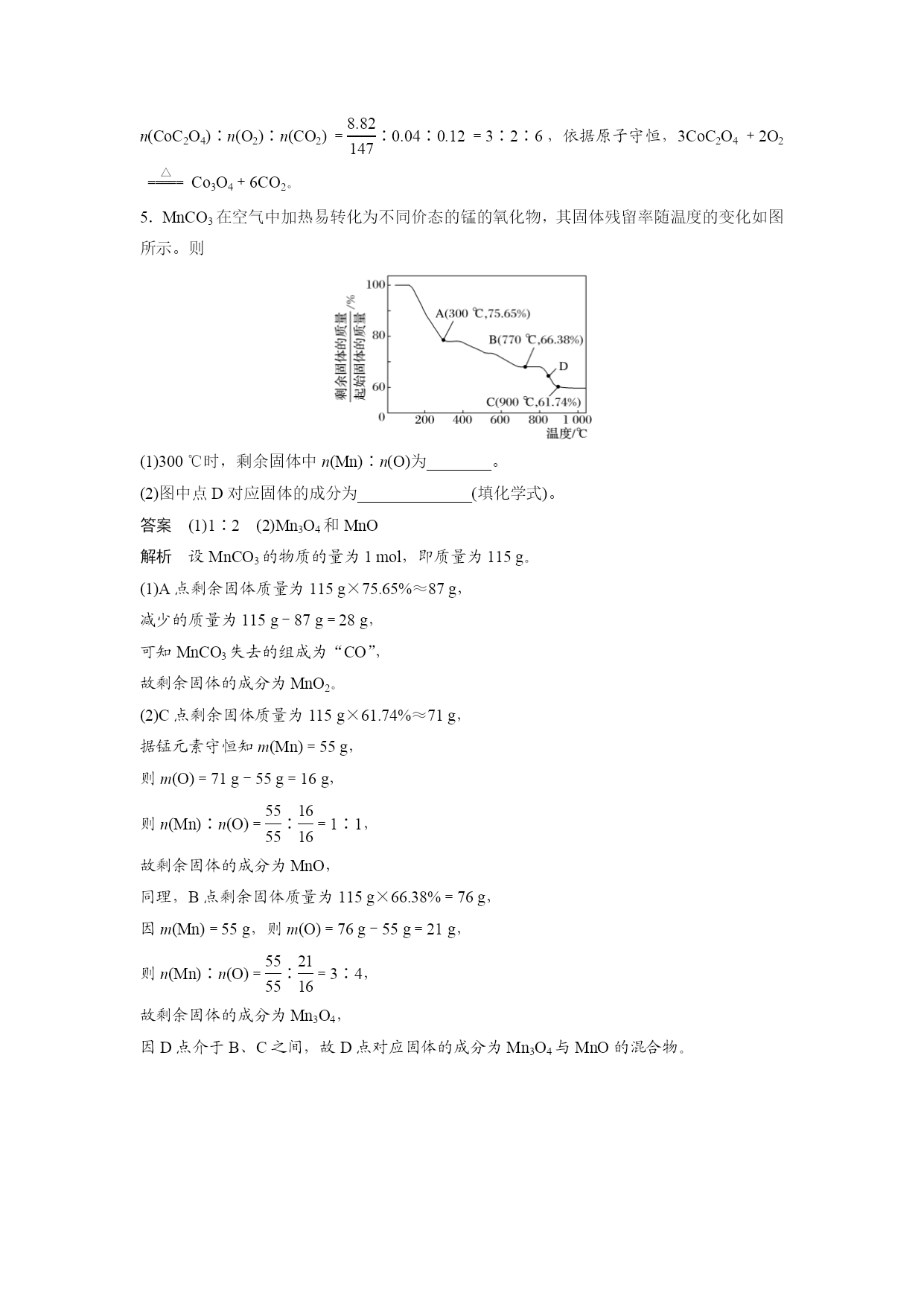 专题突破14热重分析判断物质成分 方法思路 1.设晶体为1mol,其质量为m。 2.失重一般是先失水,再失非金属氧化物。 3.计算每步固体剩余的质量(m余) eq\f(m余,m)×100%=固体残留率。 4.晶体中金属质量不再减少,仍在m余中。 5.失重最后一般为金属氧化物,由质量守恒得m氧,由n金属∶n氧,即可求出失重后物质的化学式。 1.PbO2受热会随温度升高逐步分解。称取23.9gPbO2,将其加热分解,受热分解过程中固体质量随温度的变化如下图所示。 A点与C点对应物质的化学式分别为________、________。 答案Pb2O3PbO 解析二氧化铅是0.1mol,其中氧原子是0.2mol。A点,固体减少0.8g,则剩余氧原子的物质的量是0.15mol,此时剩余的铅和氧原子的个数之比是2∶3,A点对应的物质是Pb2O3。同理可得出C点对应物质是PbO。 2.在焙烧NH4VO3的过程中,固体质量的减少值(纵坐标)随温度变化的曲线如图所示,210℃时,剩余固体物质的化学式为________。 答案HVO3 解析NH4VO3分解的过程中生成氨气和HVO3,HVO3进一步分解生成V2O5,210℃时若分解生成酸和氨气,则剩余固体占起始固体百分含量为eq\f(100,117)×100%≈85.47%,所以210℃时,剩余固体物质的化学式为HVO3。 3.将Ce(SO4)2·4H2O(摩尔质量为404g·mol-1)在空气中加热,样品的固体残留率(eq\f(固体样品的剩余质量,固体样品的起始质量)×100%)随温度的变化如下图所示。 当固体残留率为70.3%时,所得固体可能为__________(填字母)。 A.Ce(SO4)2B.Ce2(SO4)3C.CeOSO4 答案B 解析404×70.3%≈284,A的相对分子质量为332,B的相对分子质量为568,C的相对分子质量为252,根据质量守恒808×70.3%≈568,应选B。 4.在空气中加热10.98g草酸钴晶体(CoC2O4·2H2O)样品,受热过程中不同温度范围内分别得到一种固体物质,其质量如表。 温度范围/℃固体质量/g150~2108.82290~3204.82890~9204.50 (1)加热到210℃时,固体物质的化学式为________________________________________。 (2)经测定,加热到210~310℃过程中的生成物只有CO2和钴的氧化物,此过程发生反应的化学方程式为_________________________________________________________________。 答案(1)CoC2O4 (2)3CoC2O4+2O2eq\o(=====,\s\up7(△))Co3O4+6CO2 解析(1)CoC2O4·2H2O失去全部结晶水的质量为10.98×eq\f(147,183)g=8.82g,即加热到210℃时,固体物质是CoC2O4。(2)根据元素守恒,n(CO2)=eq\f(8.82,147)×2mol=0.12mol,质量为0.12mol×44g·mol-1=5.28g,而固体质量减少为(8.82-4.82)g=4.00g,说明有气体参加反应,即氧气参加,氧气的质量为(5.28-4.00)g=1.28g,其物质的量为eq\f(1.28,32)mol=0.04mol,n(CoC2O4)∶n(O2)∶n(CO2)=eq\f(8.82,147)∶0.04∶0.12=3∶2∶6,依据原子守恒,3CoC2O4+2O2eq\o(=====,\s\up7(△))Co3O4+6CO2。 5.MnCO3在空气中加热易转化为不同价态的锰的氧化物,其固体残留率随温度的变化如图所示。则 (1)300℃时,剩余固体中n(Mn)∶n(O)为________。 (2)图中点D对应固体的成分为______________(填化学式)。 答案(1)1∶2(2)Mn3O4和MnO 解析设MnCO3的物质的量为1mol,即质量为115g。 (1)A点剩余固体质量为115g×75.65%≈87g, 减少的质量为115g-87g=28g, 可知MnCO3失去的组成为“CO”, 故剩余固体的成分为MnO2。 (2)C点剩余固体质量为115g×61.74%≈71g, 据锰元素守恒知m(Mn)=55g, 则m(O)=71g-55g=16g, 则n(Mn)∶n(O)=eq\f(55,55)∶eq\f(16,16)=1∶1, 故剩余固体的成分为MnO, 同理,B点剩余固体质量为115g×66.38%=76g, 因m(Mn)=55g,则m(O)=76g-55g=21g
