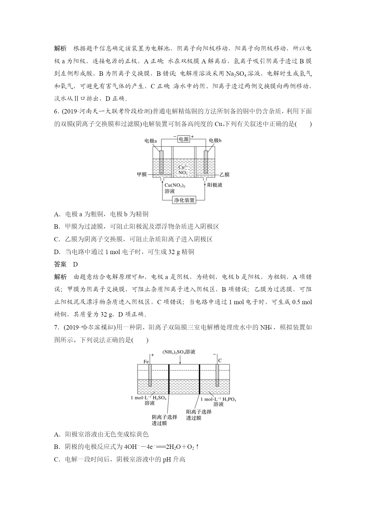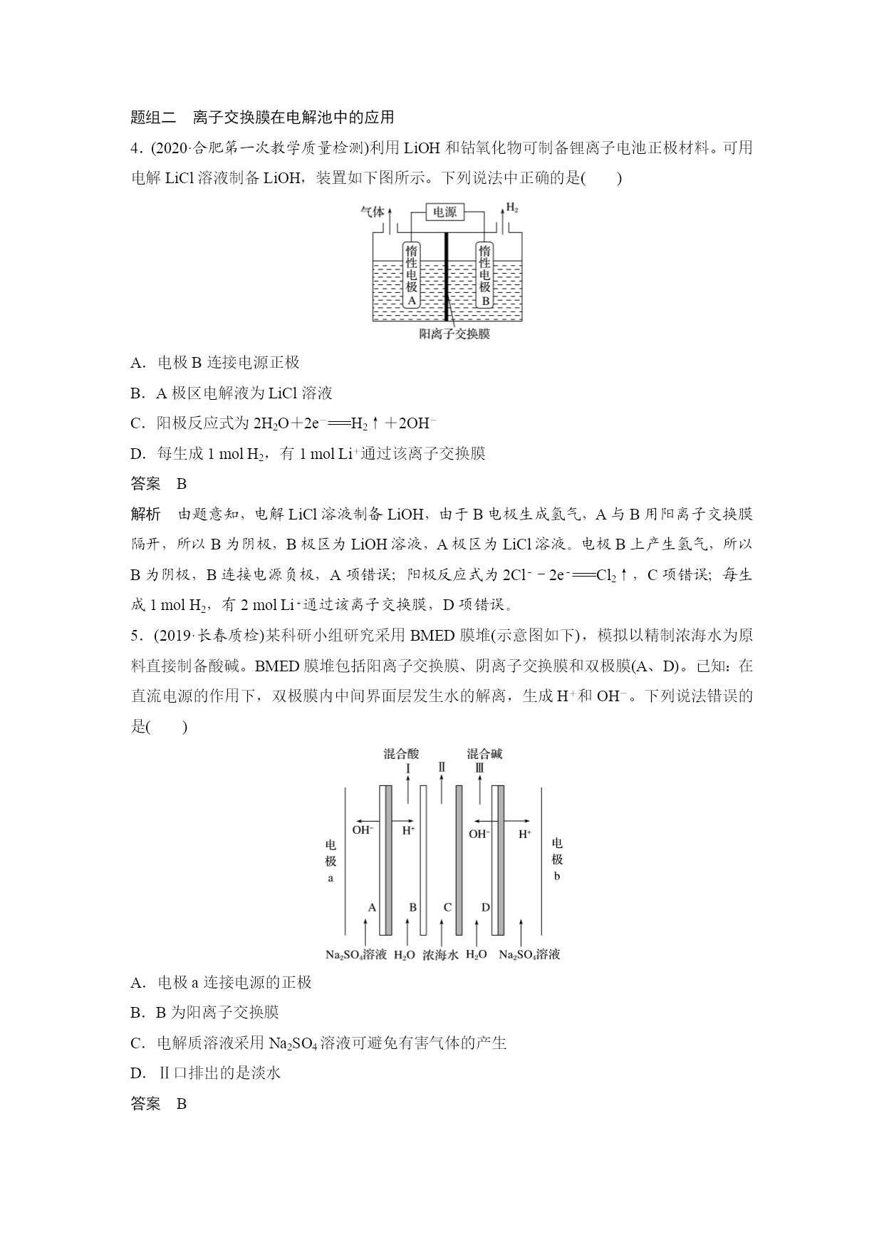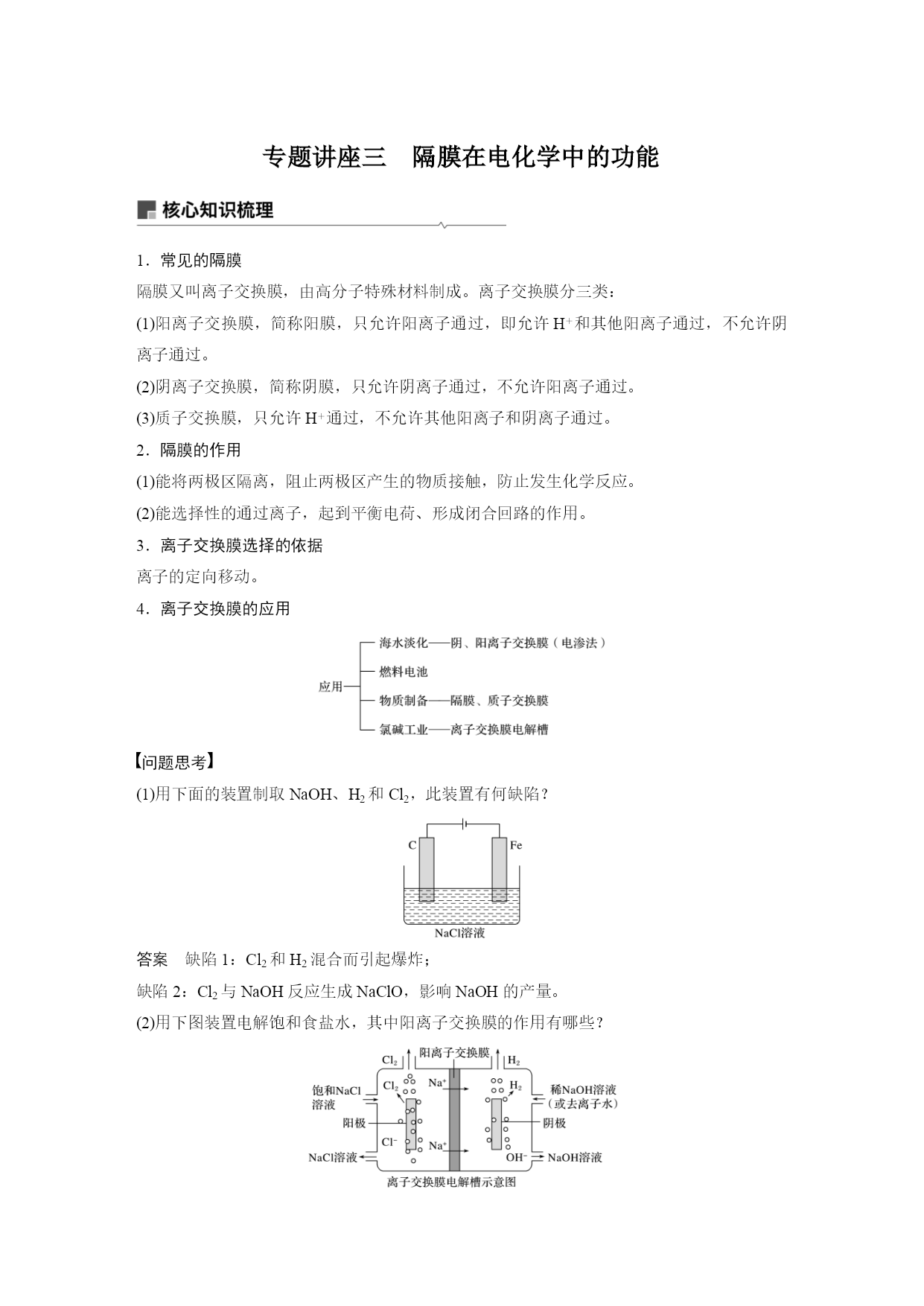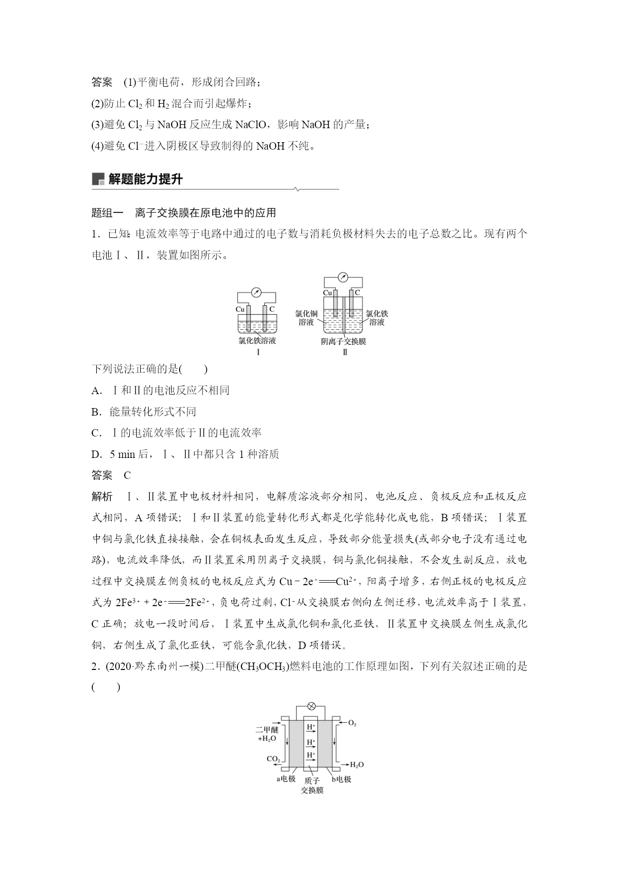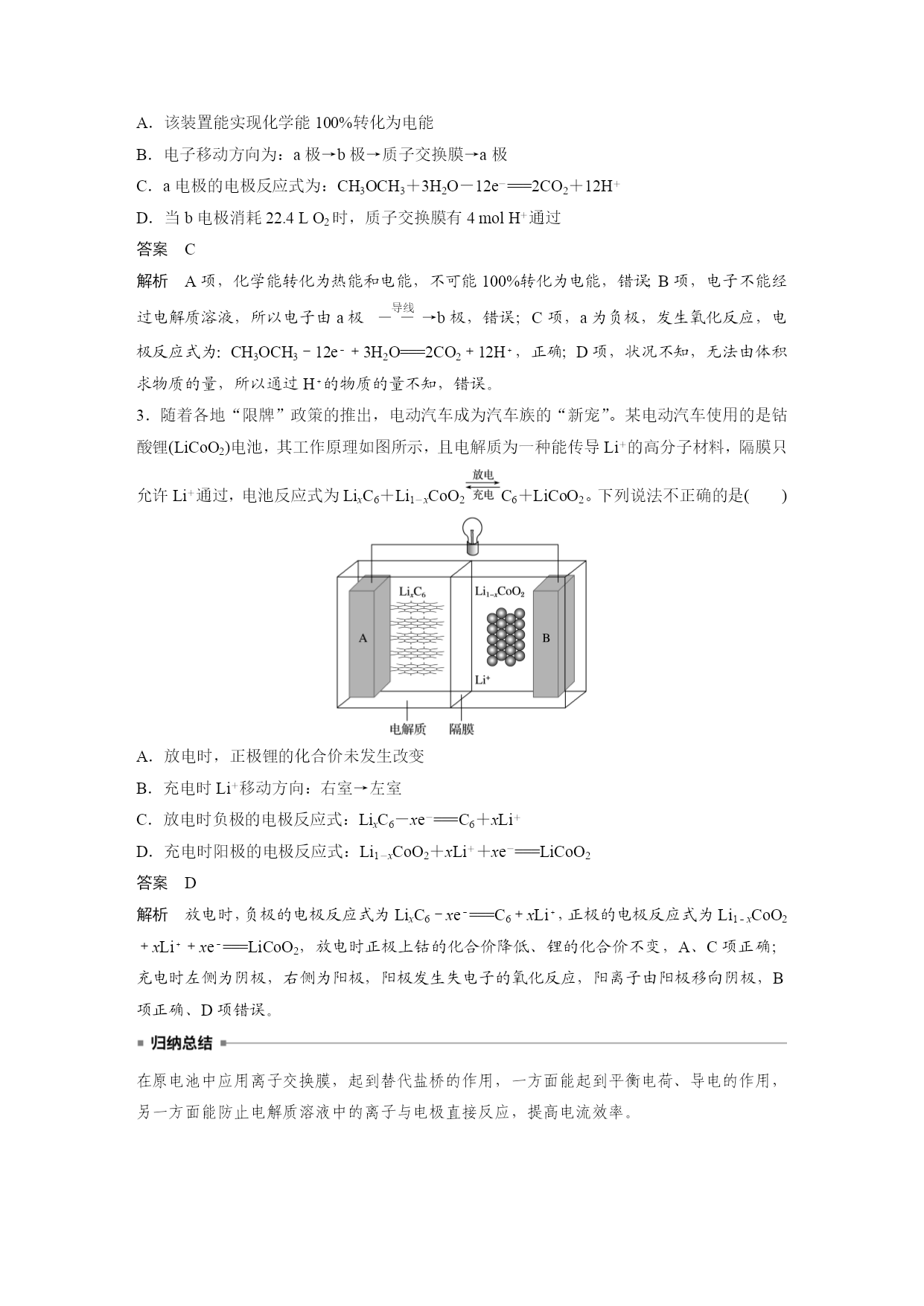专题讲座三隔膜在电化学中的功能 1.常见的隔膜 隔膜又叫离子交换膜,由高分子特殊材料制成。离子交换膜分三类: (1)阳离子交换膜,简称阳膜,只允许阳离子通过,即允许H+和其他阳离子通过,不允许阴离子通过。 (2)阴离子交换膜,简称阴膜,只允许阴离子通过,不允许阳离子通过。 (3)质子交换膜,只允许H+通过,不允许其他阳离子和阴离子通过。 2.隔膜的作用 (1)能将两极区隔离,阻止两极区产生的物质接触,防止发生化学反应。 (2)能选择性的通过离子,起到平衡电荷、形成闭合回路的作用。 3.离子交换膜选择的依据 离子的定向移动。 4.离子交换膜的应用 问题思考 (1)用下面的装置制取NaOH、H2和Cl2,此装置有何缺陷? 答案缺陷1:Cl2和H2混合而引起爆炸; 缺陷2:Cl2与NaOH反应生成NaClO,影响NaOH的产量。 (2)用下图装置电解饱和食盐水,其中阳离子交换膜的作用有哪些? 答案(1)平衡电荷,形成闭合回路; (2)防止Cl2和H2混合而引起爆炸; (3)避免Cl2与NaOH反应生成NaClO,影响NaOH的产量; (4)避免Cl-进入阴极区导致制得的NaOH不纯。 题组一离子交换膜在原电池中的应用 1.已知:电流效率等于电路中通过的电子数与消耗负极材料失去的电子总数之比。现有两个电池Ⅰ、Ⅱ,装置如图所示。 下列说法正确的是() A.Ⅰ和Ⅱ的电池反应不相同 B.能量转化形式不同 C.Ⅰ的电流效率低于Ⅱ的电流效率 D.5min后,Ⅰ、Ⅱ中都只含1种溶质 答案C 解析Ⅰ、Ⅱ装置中电极材料相同,电解质溶液部分相同,电池反应、负极反应和正极反应式相同,A项错误;Ⅰ和Ⅱ装置的能量转化形式都是化学能转化成电能,B项错误;Ⅰ装置中铜与氯化铁直接接触,会在铜极表面发生反应,导致部分能量损失(或部分电子没有通过电路),电流效率降低,而Ⅱ装置采用阴离子交换膜,铜与氯化铜接触,不会发生副反应,放电过程中交换膜左侧负极的电极反应式为Cu-2e-===Cu2+,阳离子增多,右侧正极的电极反应式为2Fe3++2e-===2Fe2+,负电荷过剩,Cl-从交换膜右侧向左侧迁移,电流效率高于Ⅰ装置,C正确;放电一段时间后,Ⅰ装置中生成氯化铜和氯化亚铁,Ⅱ装置中交换膜左侧生成氯化铜,右侧生成了氯化亚铁,可能含氯化铁,D项错误。 2.(2020·黔东南州一模)二甲醚(CH3OCH3)燃料电池的工作原理如图,下列有关叙述正确的是() A.该装置能实现化学能100%转化为电能 B.电子移动方向为:a极→b极→质子交换膜→a极 C.a电极的电极反应式为:CH3OCH3+3H2O-12e-===2CO2+12H+ D.当b电极消耗22.4LO2时,质子交换膜有4molH+通过 答案C 解析A项,化学能转化为热能和电能,不可能100%转化为电能,错误;B项,电子不能经过电解质溶液,所以电子由a极eq\o(――→,\s\up7(导线))b极,错误;C项,a为负极,发生氧化反应,电极反应式为:CH3OCH3-12e-+3H2O===2CO2+12H+,正确;D项,状况不知,无法由体积求物质的量,所以通过H+的物质的量不知,错误。 3.随着各地“限牌”政策的推出,电动汽车成为汽车族的“新宠”。某电动汽车使用的是钴酸锂(LiCoO2)电池,其工作原理如图所示,且电解质为一种能传导Li+的高分子材料,隔膜只允许Li+通过,电池反应式为LixC6+Li1-xCoO2C6+LiCoO2。下列说法不正确的是() A.放电时,正极锂的化合价未发生改变 B.充电时Li+移动方向:右室→左室 C.放电时负极的电极反应式:LixC6-xe-===C6+xLi+ D.充电时阳极的电极反应式:Li1-xCoO2+xLi++xe-===LiCoO2 答案D 解析放电时,负极的电极反应式为LixC6-xe-===C6+xLi+,正极的电极反应式为Li1-xCoO2+xLi++xe-===LiCoO2,放电时正极上钴的化合价降低、锂的化合价不变,A、C项正确;充电时左侧为阴极,右侧为阳极,阳极发生失电子的氧化反应,阳离子由阳极移向阴极,B项正确、D项错误。 在原电池中应用离子交换膜,起到替代盐桥的作用,一方面能起到平衡电荷、导电的作用,另一方面能防止电解质溶液中的离子与电极直接反应,提高电流效率。 题组二离子交换膜在电解池中的应用 4.(2020·合肥第一次教学质量检测)利用LiOH和钴氧化物可制备锂离子电池正极材料。可用电解LiCl溶液制备LiOH,装置如下图所示。下列说法中正确的是() A.电极B连接电源正极 B.A极区电解液为LiCl溶液 C.阳极反应式为2H2O+2e-===H2↑+2OH- D.每生成1molH2,有1molLi+通过该离子交换膜 答案B
