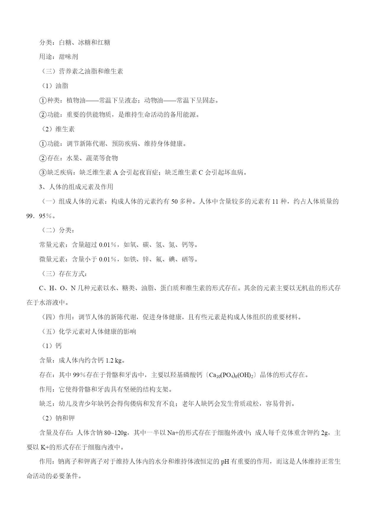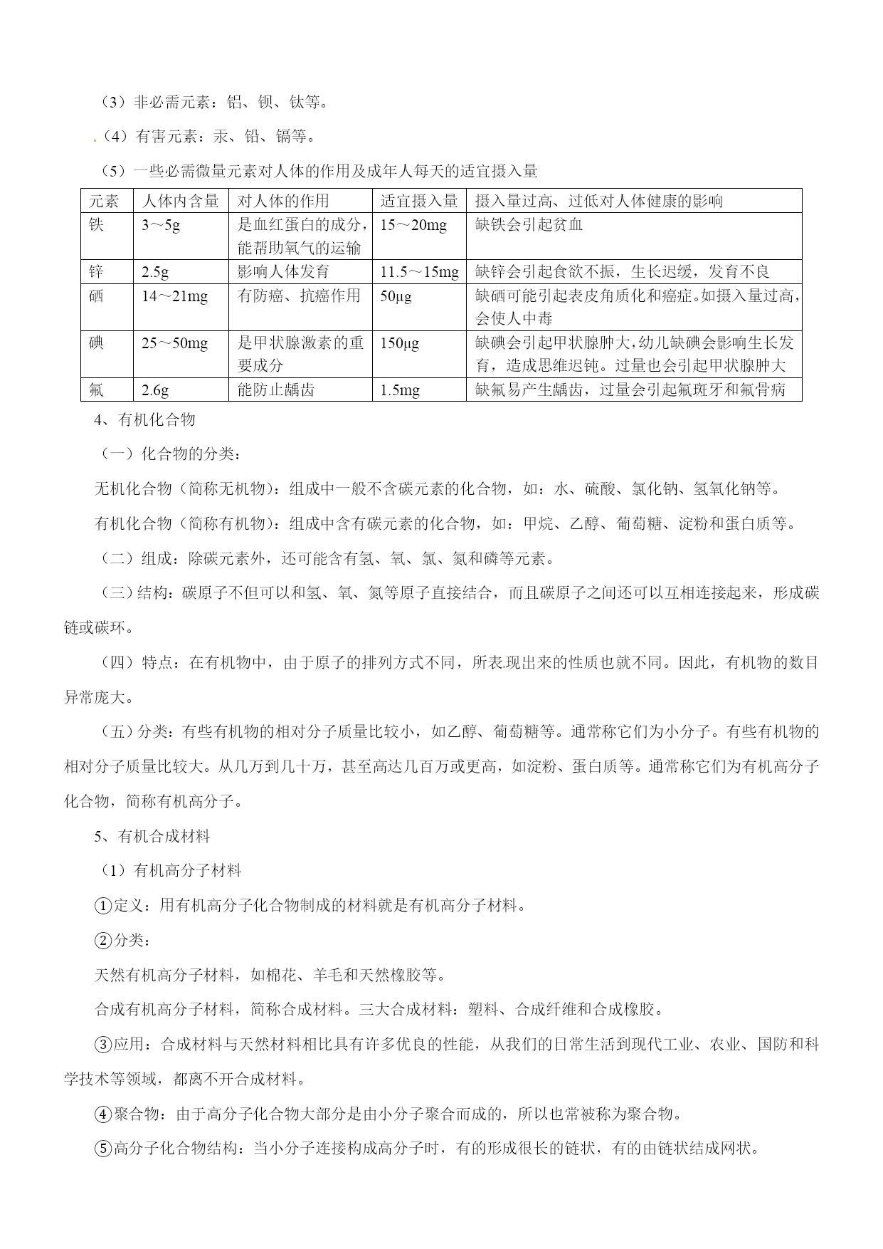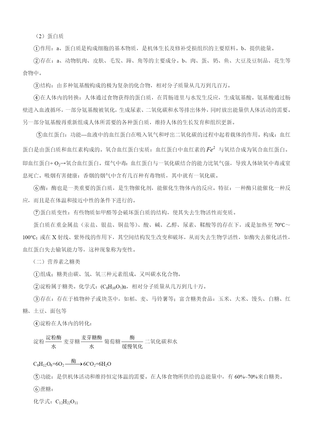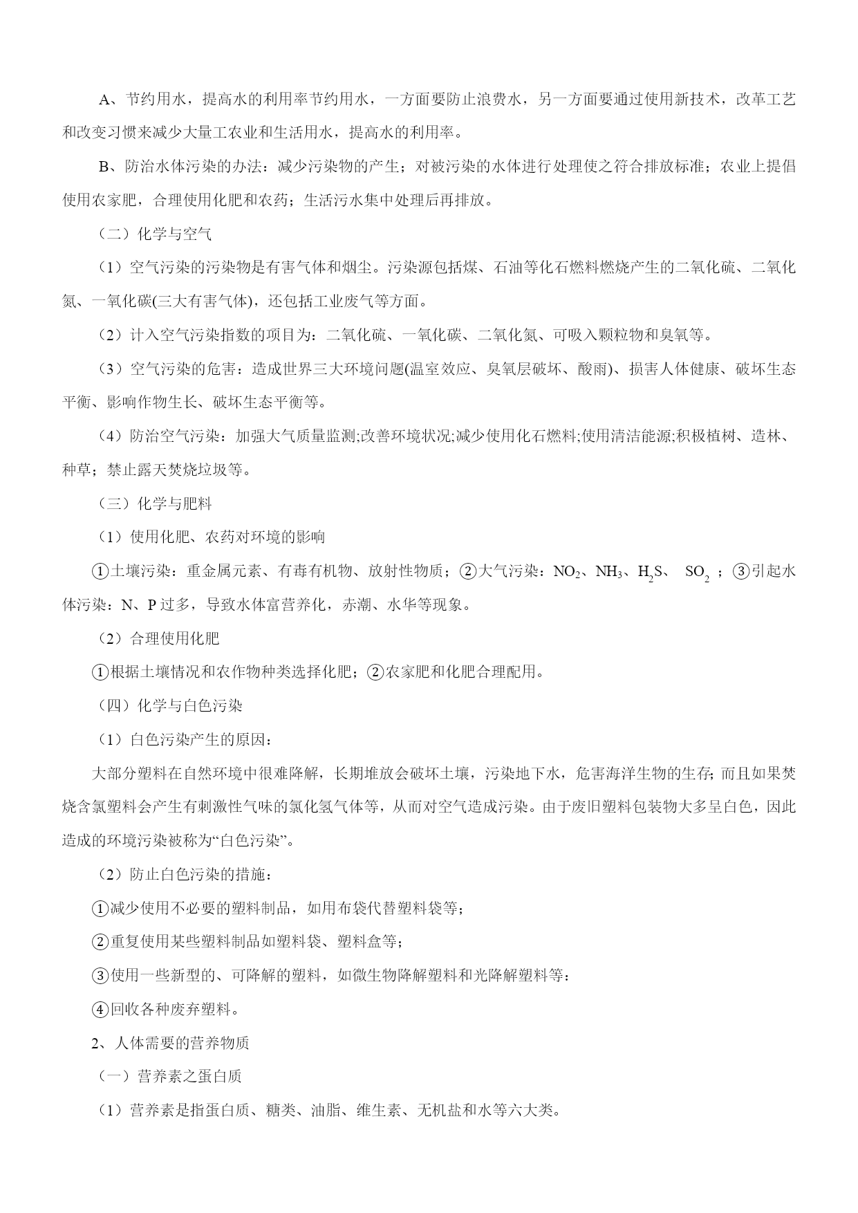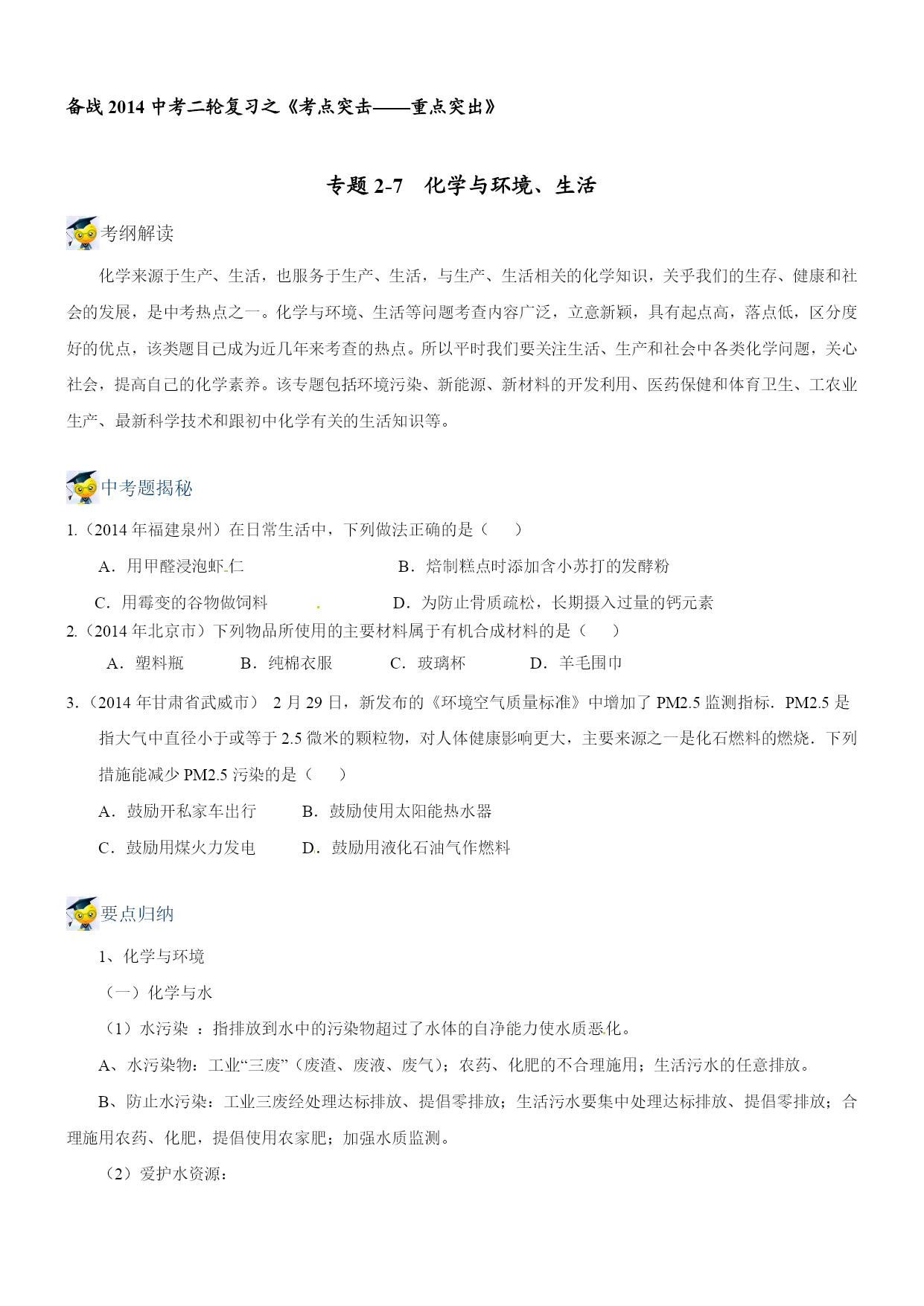 备战2014中考二轮复习之《考点突击——重点突出》 专题2-7化学与环境、生活 考纲解读 化学来源于生产、生活,也服务于生产、生活,与生产、生活相关的化学知识,关乎我们的生存、健康和社会的发展,是中考热点之一。化学与环境、生活等问题考查内容广泛,立意新颖,具有起点高,落点低,区分度好的优点,该类题目已成为近几年来考查的热点。所以平时我们要关注生活、生产和社会中各类化学问题,关心社会,提高自己的化学素养。该专题包括环境污染、新能源、新材料的开发利用、医药保健和体育卫生、工农业生产、最新科学技术和跟初中化学有关的生活知识等。 中考题揭秘 1.(2014年福建泉州)在日常生活中,下列做法正确的是() A.用甲醛浸泡虾仁B.焙制糕点时添加含小苏打的发酵粉 C.用霉变的谷物做饲料D.为防止骨质疏松,长期摄入过量的钙元素 2.(2014年北京市)下列物品所使用的主要材料属于有机合成材料的是() A.塑料瓶B.纯棉衣服C.玻璃杯 D.羊毛围巾 3.(2014年甘肃省武威市)2月29日,新发布的《环境空气质量标准》中增加了PM2.5监测指标.PM2.5是指大气中直径小于或等于2.5微米的颗粒物,对人体健康影响更大,主要来源之一是化石燃料的燃烧.下列措施能减少PM2.5污染的是() A.鼓励开私家车出行 B.鼓励使用太阳能热水器 C.鼓励用煤火力发电 D.鼓励用液化石油气作燃料 要点归纳 1、化学与环境 (一)化学与水 (1)水污染:指排放到水中的污染物超过了水体的自净能力使水质恶化。 A、水污染物:工业“三废”(废渣、废液、废气);农药、化肥的不合理施用;生活污水的任意排放。 B、防止水污染:工业三废经处理达标排放、提倡零排放;生活污水要集中处理达标排放、提倡零排放;合理施用农药、化肥,提倡使用农家肥;加强水质监测。 (2)爱护水资源: A、节约用水,提高水的利用率节约用水,一方面要防止浪费水,另一方面要通过使用新技术,改革工艺和改变习惯来减少大量工农业和生活用水,提高水的利用率。 B、防治水体污染的办法:减少污染物的产生;对被污染的水体进行处理使之符合排放标准;农业上提倡使用农家肥,合理使用化肥和农药;生活污水集中处理后再排放。 化学与空气 (1)空气污染的污染物是有害气体和烟尘。污染源包括煤、石油等化石燃料燃烧产生的二氧化硫、二氧化氮、一氧化碳(三大有害气体),还包括工业废气等方面。 (2)计入空气污染指数的项目为:二氧化硫、一氧化碳、二氧化氮、可吸入颗粒物和臭氧等。 (3)空气污染的危害:造成世界三大环境问题(温室效应、臭氧层破坏、酸雨)、损害人体健康、破坏生态平衡、影响作物生长、破坏生态平衡等。 (4)防治空气污染:加强大气质量监测;改善环境状况;减少使用化石燃料;使用清洁能源;积极植树、造林、种草;禁止露天焚烧垃圾等。 化学与肥料 (1)使用化肥、农药对环境的影响 ①土壤污染:重金属元素、有毒有机物、放射性物质;②大气污染:NO2、NH3、H2S、SO2;③引起水体污染:N、P过多,导致水体富营养化,赤潮、水华等现象。 (2)合理使用化肥 ①根据土壤情况和农作物种类选择化肥;②农家肥和化肥合理配用。 化学与白色污染 (1)白色污染产生的原因: 大部分塑料在自然环境中很难降解,长期堆放会破坏土壤,污染地下水,危害海洋生物的生存;而且如果焚烧含氯塑料会产生有刺激性气味的氯化氢气体等,从而对空气造成污染。由于废旧塑料包装物大多呈白色,因此造成的环境污染被称为“白色污染”。 (2)防止白色污染的措施: ①减少使用不必要的塑料制品,如用布袋代替塑料袋等; ②重复使用某些塑料制品如塑料袋、塑料盒等; ③使用一些新型的、可降解的塑料,如微生物降解塑料和光降解塑料等: ④回收各种废弃塑料。 2、人体需要的营养物质 (一)营养素之蛋白质 (1)营养素是指蛋白质、糖类、油脂、维生素、无机盐和水等六大类。 (2)蛋白质 ①作用:a、蛋白质是构成细胞的基本物质,是机体生长及修补受损组织的主要原料。b、提供能量。 ②存在:a、动物肌肉、皮肤、毛发、蹄、角等的主要成分。b、肉、蛋、奶、鱼、大豆及豆制品、花生等食物中。 ③结构:由多种氨基酸构成的极为复杂的化合物,相对分子质量从几万到几百万。 ④在人体内的转换:人体通过食物获得的蛋白质,在胃肠道里与水发生反应,生成氨基酸。氨基酸通过肠壁进入血液循环,一部分氨基酸被氧化,生成尿素、二氧化碳和水等排出体外,同时放出能量供人体活动的需要。另一部分氨基酸再重新组成人体所需要的各种蛋白质,维持人体的生长发育和组织更新。 ⑤血红蛋白:功能—血液中的血红蛋白在吸入氧气和呼出二氧化碳的过程中起着载体的作用。构成:血红蛋白是由蛋白质和血红素构成的。氧合血红蛋白实质:血红蛋白中血红素的与氧结合成为氧合血红蛋白。即血红蛋白+O2