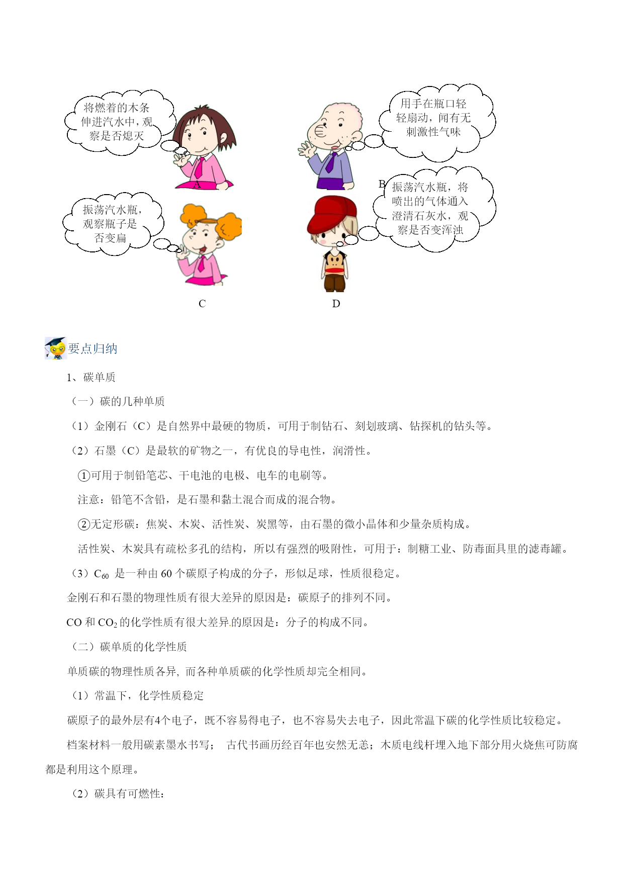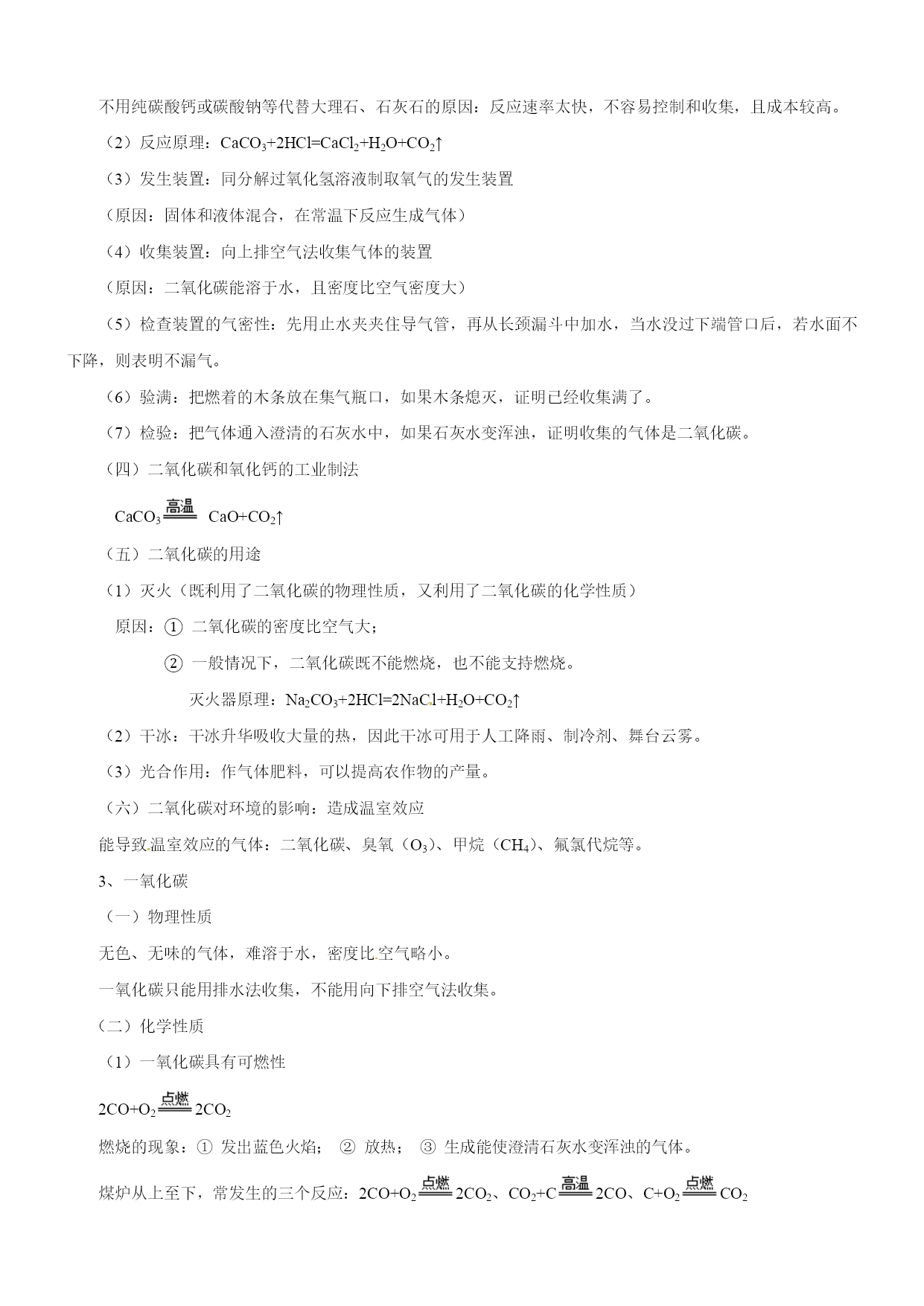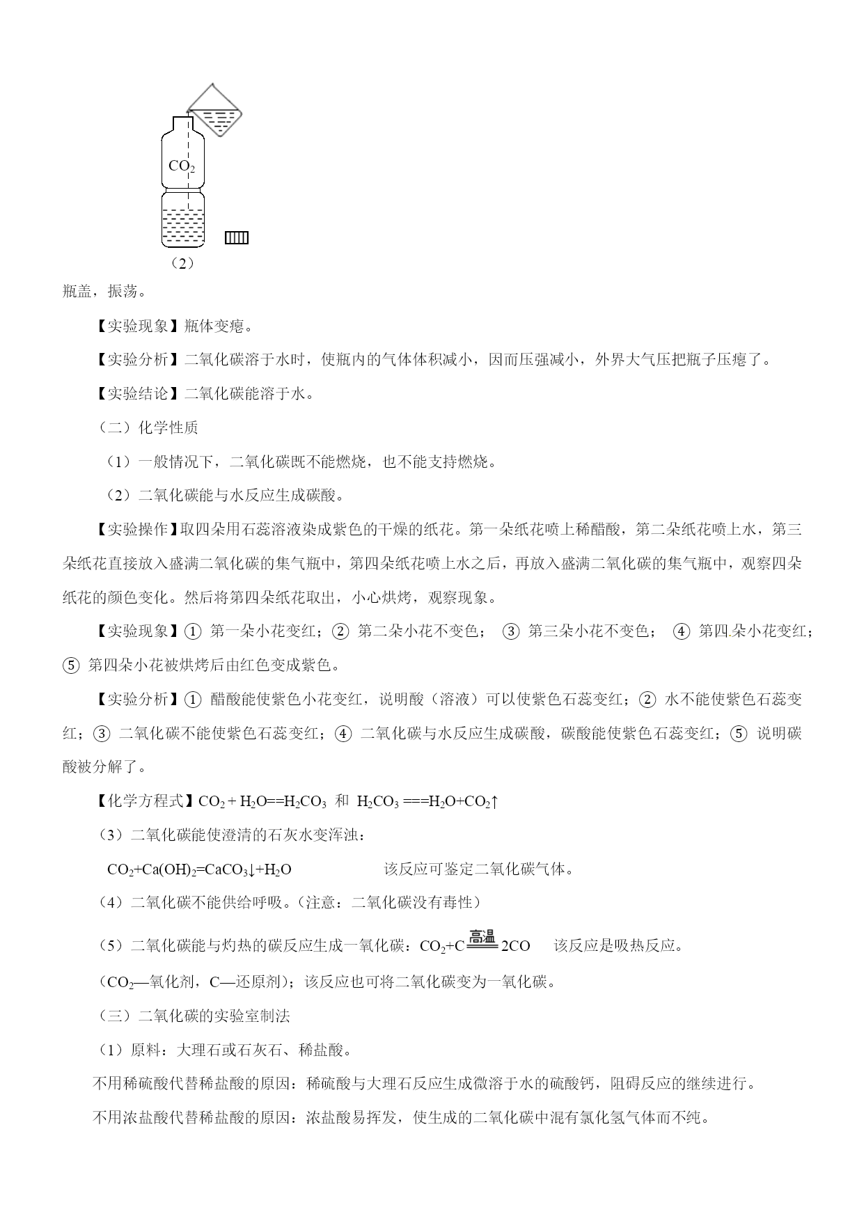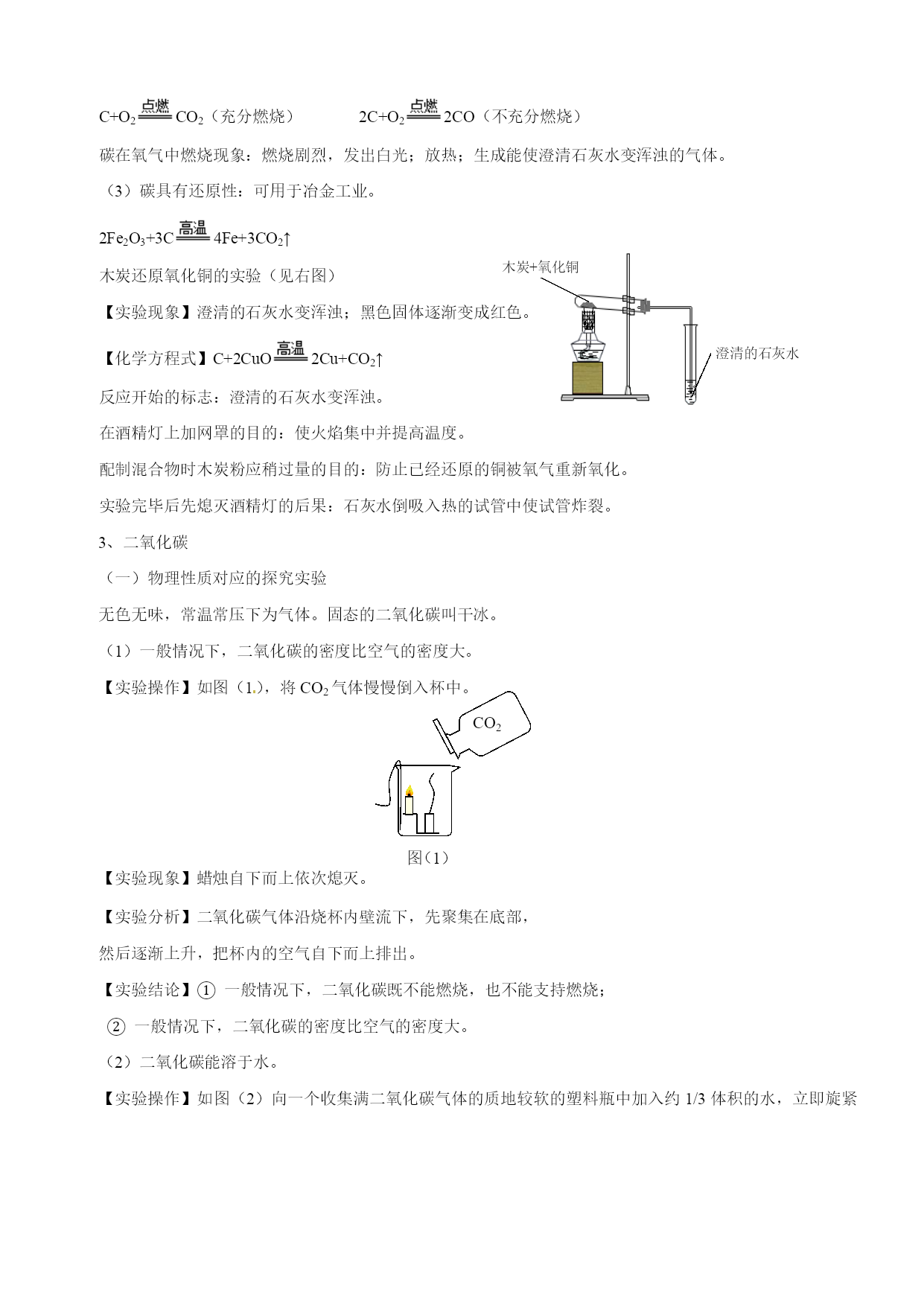 备战2017中考二轮复习之《考点突击——重点突出》 专题2-2碳和碳的化合物 考纲解读 碳和碳的化合物种类繁多,况且也是学习有机物的基础,涉及的知识点较多,在初中化学基本概念和基本理论知识模块中占有极其重要的地位,是历年中考的热点,也是每年中考的必考内容。有关碳和碳的化合物这一考点有:碳的不同单质的结构、性质及应用;一氧化碳、二氧化碳的性质及用途;二氧化碳的实验室制法;含碳物质的计算,碳的循环等。在中考命题中形式多样,主要考查学生环保低碳意识,对化学基本概念的理解和实验探究能力,考查学生运用知识解决生活、生产中的实际问题的能力。 中考题揭秘 1.(2014年重庆市A)“碳海绵”是已知最轻的固体材料,主要成分是石墨烯和碳纳米管(两者都是碳单质),具有疏松多孔结构。下列关于“碳海绵”性质的推测一定有错误的是()[来源:学_科_网][来源:学科网ZXXK][来源:Z+xx+k.Com] A.碳海绵有吸附作用B.碳海绵是灰黑色固体 C.碳海绵易溶解于水D.碳海绵燃烧会产生二氧化碳 2.(2014年湖南省益阳市)下图是实验室依次制备、收集、验证、验满CO2的装置,其中正确的是 A B C D 3.(2014年浙江省台州市)证明汽水中含有CO2气体,最合理的做法是 将燃着的木条伸进汽水中,观察是否熄灭 用手在瓶口轻轻扇动,闻有无刺激性气味 [来源:学科网ZXXK] 振荡汽水瓶,将喷出的气体通入澄清石灰水,观察是否变浑浊 振荡汽水瓶,观察瓶子是否变扁 AB CD 要点归纳 1、碳单质 (一)碳的几种单质 (1)金刚石(C)是自然界中最硬的物质,可用于制钻石、刻划玻璃、钻探机的钻头等。 (2)石墨(C)是最软的矿物之一,有优良的导电性,润滑性。 ①可用于制铅笔芯、干电池的电极、电车的电刷等。 注意:铅笔不含铅,是石墨和黏土混合而成的混合物。 ②无定形碳:焦炭、木炭、活性炭、炭黑等,由石墨的微小晶体和少量杂质构成。 活性炭、木炭具有疏松多孔的结构,所以有强烈的吸附性,可用于:制糖工业、防毒面具里的滤毒罐。 C60是一种由60个碳原子构成的分子,形似足球,性质很稳定。 金刚石和石墨的物理性质有很大差异的原因是:碳原子的排列不同。 CO和CO2的化学性质有很大差异的原因是:分子的构成不同。 碳单质的化学性质 单质碳的物理性质各异,而各种单质碳的化学性质却完全相同。 (1)常温下,化学性质稳定 碳原子的最外层有4个电子,既不容易得电子,也不容易失去电子,因此常温下碳的化学性质比较稳定。 档案材料一般用碳素墨水书写;古代书画历经百年也安然无恙;木质电线杆埋入地下部分用火烧焦可防腐都是利用这个原理。 (2)碳具有可燃性: C+O2CO2(充分燃烧) 2C+O22CO(不充分燃烧) 碳在氧气中燃烧现象:燃烧剧烈,发出白光;放热;生成能使澄清石灰水变浑浊的气体。 (3)碳具有还原性:可用于冶金工业。 木炭+氧化铜 澄清的石灰水 2Fe2O3+3C4Fe+3CO2↑ 木炭还原氧化铜的实验(见右图) 【实验现象】澄清的石灰水变浑浊;黑色固体逐渐变成红色。 【化学方程式】C+2CuO2Cu+CO2↑ 反应开始的标志:澄清的石灰水变浑浊。 在酒精灯上加网罩的目的:使火焰集中并提高温度。 配制混合物时木炭粉应稍过量的目的:防止已经还原的铜被氧气重新氧化。 实验完毕后先熄灭酒精灯的后果:石灰水倒吸入热的试管中使试管炸裂。 3、二氧化碳 (一)物理性质对应的探究实验 无色无味,常温常压下为气体。固态的二氧化碳叫干冰。 (1)一般情况下,二氧化碳的密度比空气的密度大。 【实验操作】如图(1),将CO2气体慢慢倒入杯中。 【实验现象】蜡烛自下而上依次熄灭。CO2 图(1) 【实验分析】二氧化碳气体沿烧杯内壁流下,先聚集在底部, 然后逐渐上升,把杯内的空气自下而上排出。 【实验结论】①一般情况下,二氧化碳既不能燃烧,也不能支持燃烧; ②一般情况下,二氧化碳的密度比空气的密度大。 (2)二氧化碳能溶于水。 【实验操作】如图(2)向一个收集满二氧化碳气体的质地较软的塑料瓶中加入约1/3体积的水,立即旋紧瓶盖,振荡。CO2 (2) 【实验现象】瓶体变瘪。 【实验分析】二氧化碳溶于水时,使瓶内的气体体积减小,因而压强减小,外界大气压把瓶子压瘪了。 【实验结论】二氧化碳能溶于水。 化学性质 (1)一般情况下,二氧化碳既不能燃烧,也不能支持燃烧。 (2)二氧化碳能与水反应生成碳酸。 【实验操作】取四朵用石蕊溶液染成紫色的干燥的纸花。第一朵纸花喷上稀醋酸,第二朵纸花喷上水,第三朵纸花直接放入盛满二氧化碳的集气瓶中,第四朵纸花喷上水之后,再放入盛满二氧化碳的集气瓶中,观察四朵纸花的颜色变化。然后将第四朵纸花取出,小心烘烤,观察现象。 【实验现象】①第一