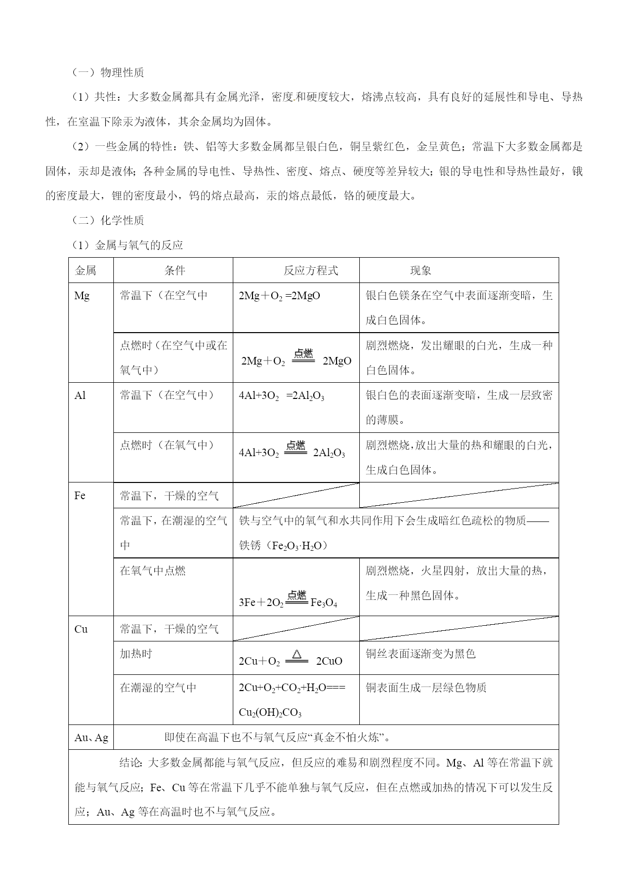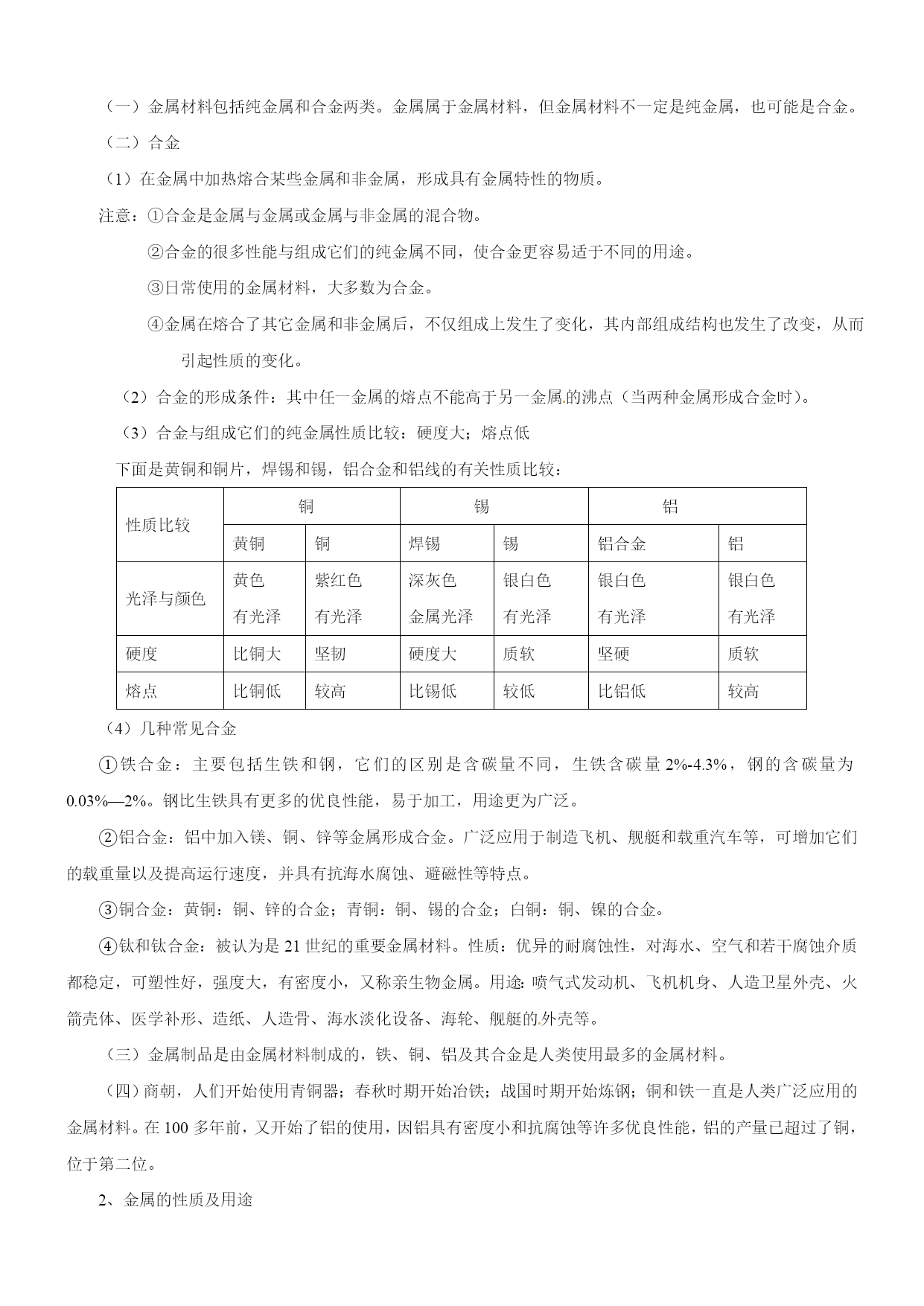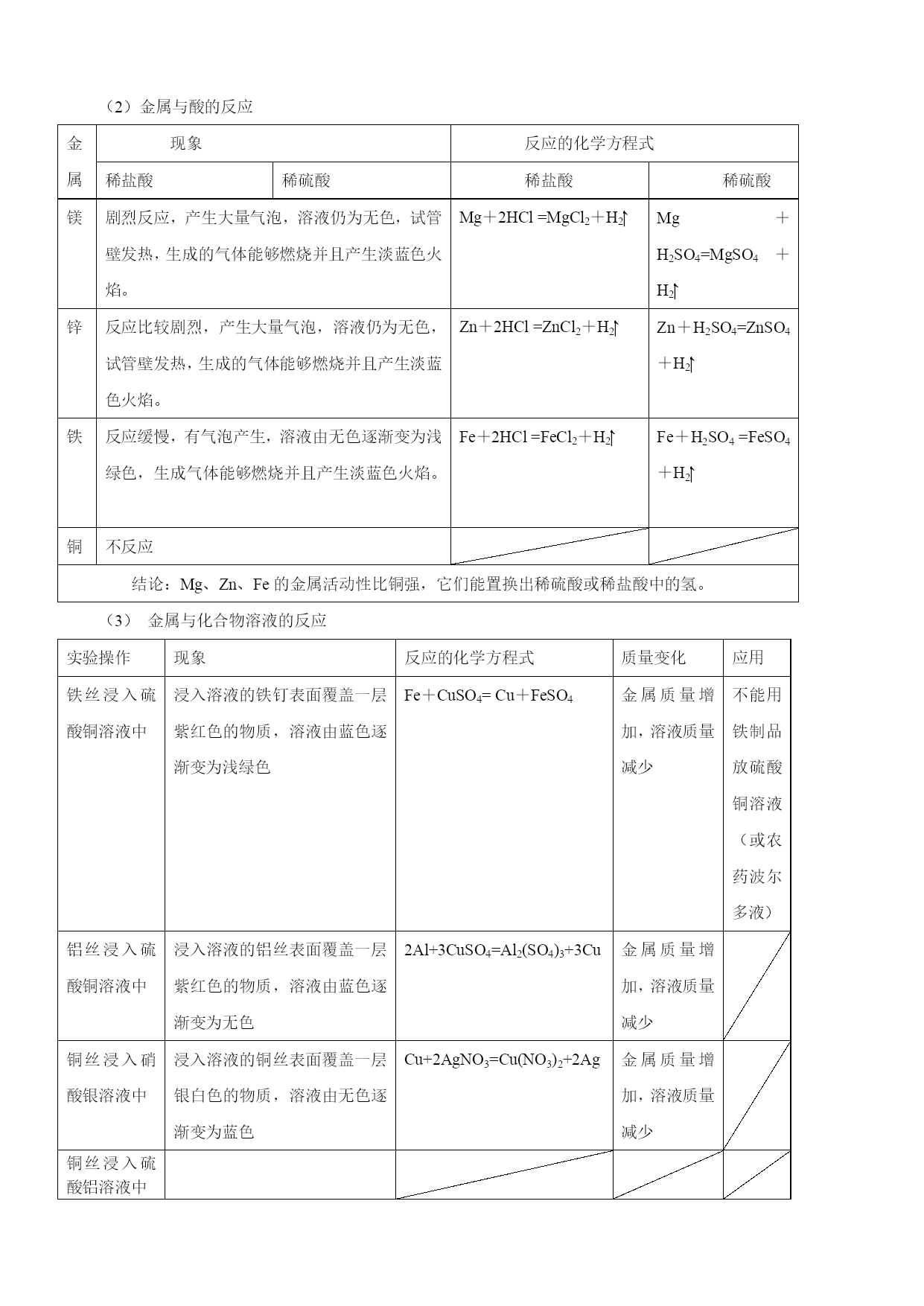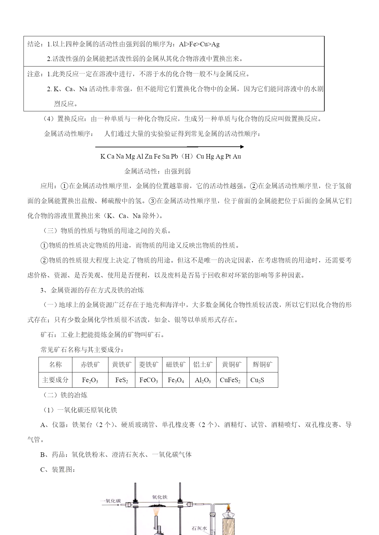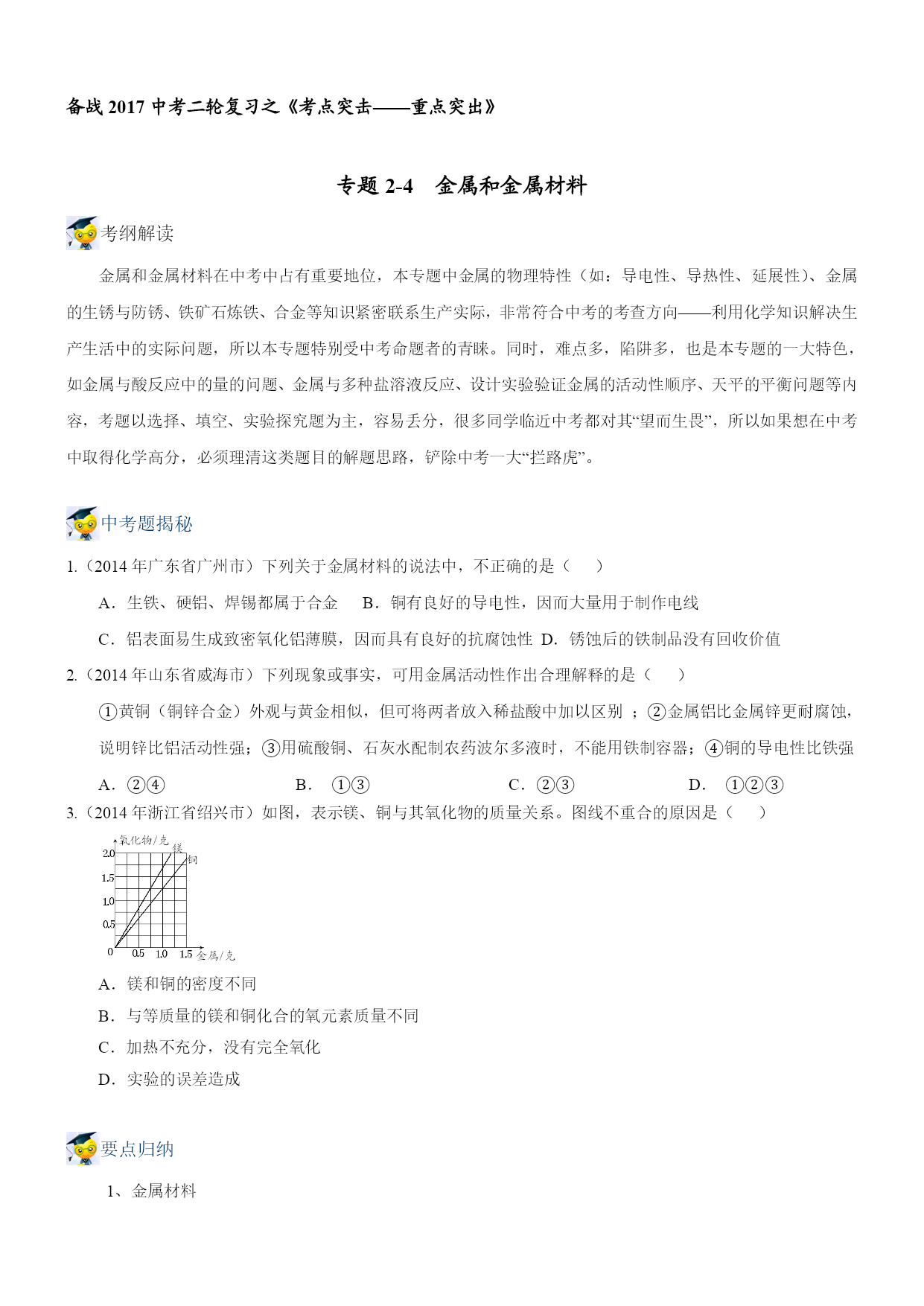备战2017中考二轮复习之《考点突击——重点突出》 专题2-4金属和金属材料 考纲解读 金属和金属材料在中考中占有重要地位,本专题中金属的物理特性(如:导电性、导热性、延展性)、金属的生锈与防锈、铁矿石炼铁、合金等知识紧密联系生产实际,非常符合中考的考查方向——利用化学知识解决生产生活中的实际问题,所以本专题特别受中考命题者的青睐。同时,难点多,陷阱多,也是本专题的一大特色,如金属与酸反应中的量的问题、金属与多种盐溶液反应、设计实验验证金属的活动性顺序、天平的平衡问题等内容,考题以选择、填空、实验探究题为主,容易丢分,很多同学临近中考都对其“望而生畏”,所以如果想在中考中取得化学高分,必须理清这类题目的解题思路,铲除中考一大“拦路虎”。 中考题揭秘 1.(2014年广东省广州市)下列关于金属材料的说法中,不正确的是() A.生铁、硬铝、焊锡都属于合金B.铜有良好的导电性,因而大量用于制作电线 C.铝表面易生成致密氧化铝薄膜,因而具有良好的抗腐蚀性D.锈蚀后的铁制品没有回收价值 2.(2014年山东省威海市)下列现象或事实,可用金属活动性作出合理解释的是() ①黄铜(铜锌合金)外观与黄金相似,但可将两者放入稀盐酸中加以区别;②金属铝比金属锌更耐腐蚀,说明锌比铝活动性强;③用硫酸铜、石灰水配制农药波尔多液时,不能用铁制容器;④铜的导电性比铁强 A.②④B.①③C.②③D.①②③ 3.(2014年浙江省绍兴市)如图,表示镁、铜与其氧化物的质量关系。图线不重合的原因是() A.镁和铜的密度不同 B.与等质量的镁和铜化合的氧元素质量不同 C.加热不充分,没有完全氧化 D.实验的误差造成 要点归纳 1、金属材料 金属材料包括纯金属和合金两类。金属属于金属材料,但金属材料不一定是纯金属,也可能是合金。 合金 (1)在金属中加热熔合某些金属和非金属,形成具有金属特性的物质。 注意:①合金是金属与金属或金属与非金属的混合物。 ②合金的很多性能与组成它们的纯金属不同,使合金更容易适于不同的用途。 ③日常使用的金属材料,大多数为合金。 ④金属在熔合了其它金属和非金属后,不仅组成上发生了变化,其内部组成结构也发生了改变,从而引起性质的变化。 (2)合金的形成条件:其中任一金属的熔点不能高于另一金属的沸点(当两种金属形成合金时)。 (3)合金与组成它们的纯金属性质比较:硬度大;熔点低 下面是黄铜和铜片,焊锡和锡,铝合金和铝线的有关性质比较: 性质比较铜[来源:Z,xx,k.Com]锡[来源:学科网][来源:Zxxk.Com]铝[来源:Z_xx_k.Com]黄铜铜焊锡锡铝合金铝光泽与颜色黄色 有光泽紫红色 有光泽深灰色 金属光泽银白色 有光泽银白色 有光泽银白色 有光泽硬度比铜大坚韧硬度大质软坚硬质软熔点比铜低较高比锡低较低比铝低较高(4)几种常见合金 ①铁合金:主要包括生铁和钢,它们的区别是含碳量不同,生铁含碳量2%-4.3%,钢的含碳量为0.03%—2%。钢比生铁具有更多的优良性能,易于加工,用途更为广泛。 ②铝合金:铝中加入镁、铜、锌等金属形成合金。广泛应用于制造飞机、舰艇和载重汽车等,可增加它们的载重量以及提高运行速度,并具有抗海水腐蚀、避磁性等特点。 ③铜合金:黄铜:铜、锌的合金;青铜:铜、锡的合金;白铜:铜、镍的合金。 ④钛和钛合金:被认为是21世纪的重要金属材料。性质:优异的耐腐蚀性,对海水、空气和若干腐蚀介质都稳定,可塑性好,强度大,有密度小,又称亲生物金属。用途:喷气式发动机、飞机机身、人造卫星外壳、火箭壳体、医学补形、造纸、人造骨、海水淡化设备、海轮、舰艇的外壳等。 (三)金属制品是由金属材料制成的,铁、铜、铝及其合金是人类使用最多的金属材料。 (四)商朝,人们开始使用青铜器;春秋时期开始冶铁;战国时期开始炼钢;铜和铁一直是人类广泛应用的金属材料。在100多年前,又开始了铝的使用,因铝具有密度小和抗腐蚀等许多优良性能,铝的产量已超过了铜,位于第二位。 2、金属的性质及用途 (一)物理性质 (1)共性:大多数金属都具有金属光泽,密度和硬度较大,熔沸点较高,具有良好的延展性和导电、导热性,在室温下除汞为液体,其余金属均为固体。 (2)一些金属的特性:铁、铝等大多数金属都呈银白色,铜呈紫红色,金呈黄色;常温下大多数金属都是固体,汞却是液体;各种金属的导电性、导热性、密度、熔点、硬度等差异较大;银的导电性和导热性最好,锇的密度最大,锂的密度最小,钨的熔点最高,汞的熔点最低,铬的硬度最大。 (二)化学性质 (1)金属与氧气的反应 金属条件反应方程式现象Mg常温下(在空气中2Mg+O2=2MgO银白色镁条在空气中表面逐渐变暗,生成白色固体。点燃时(在空气中或在氧气中)2Mg+O22MgO剧烈燃烧,发出耀眼的白光,生成一种白色固体。Al常温