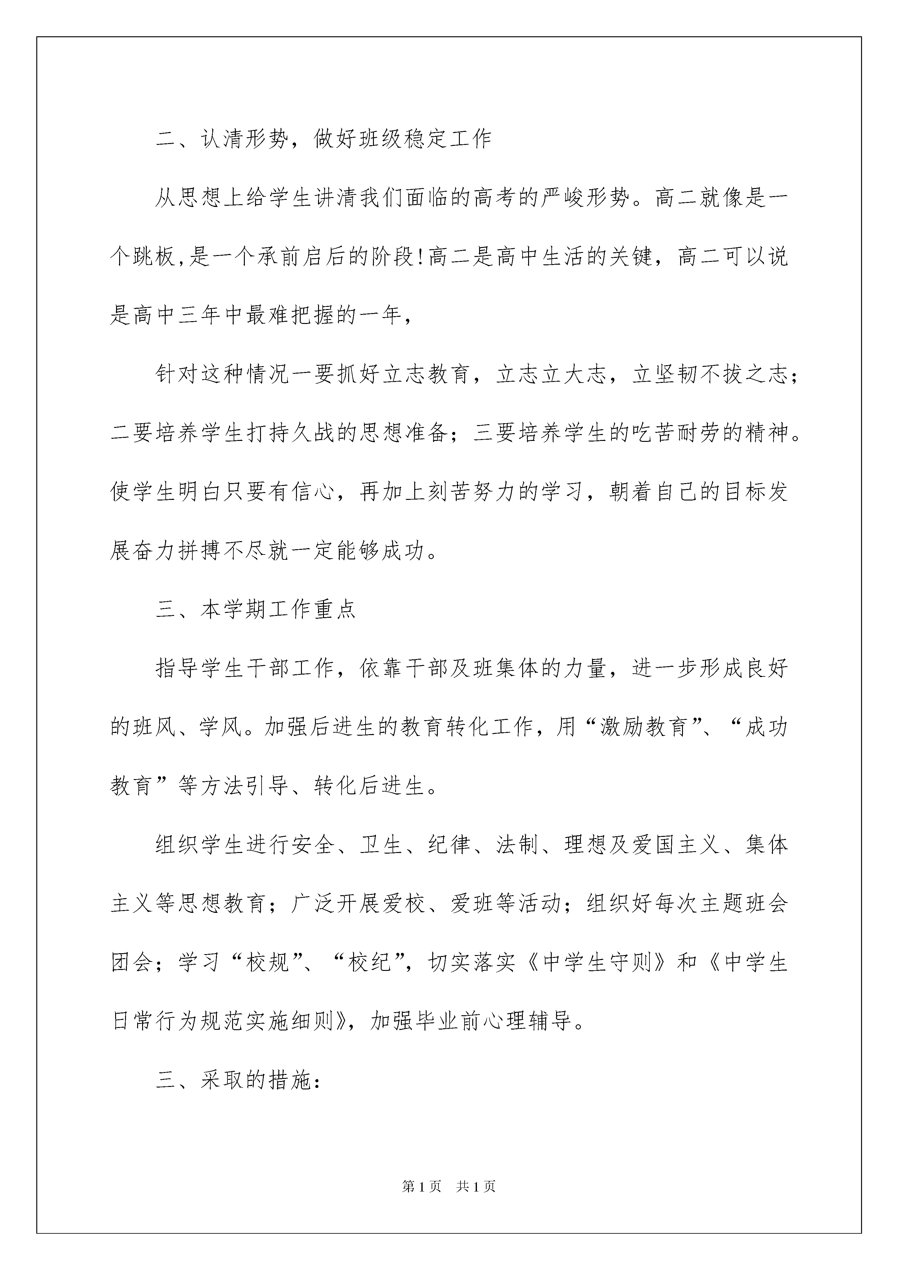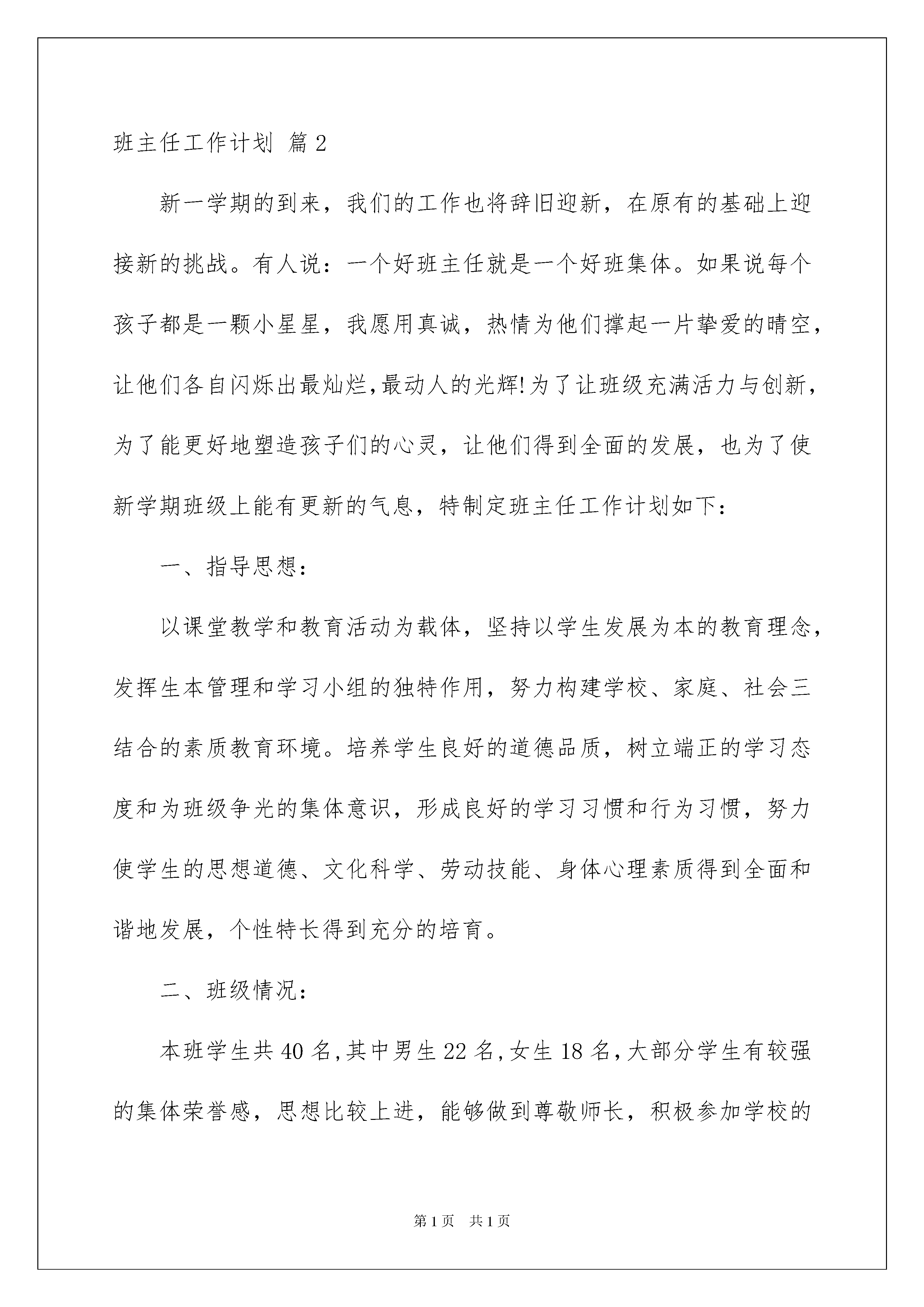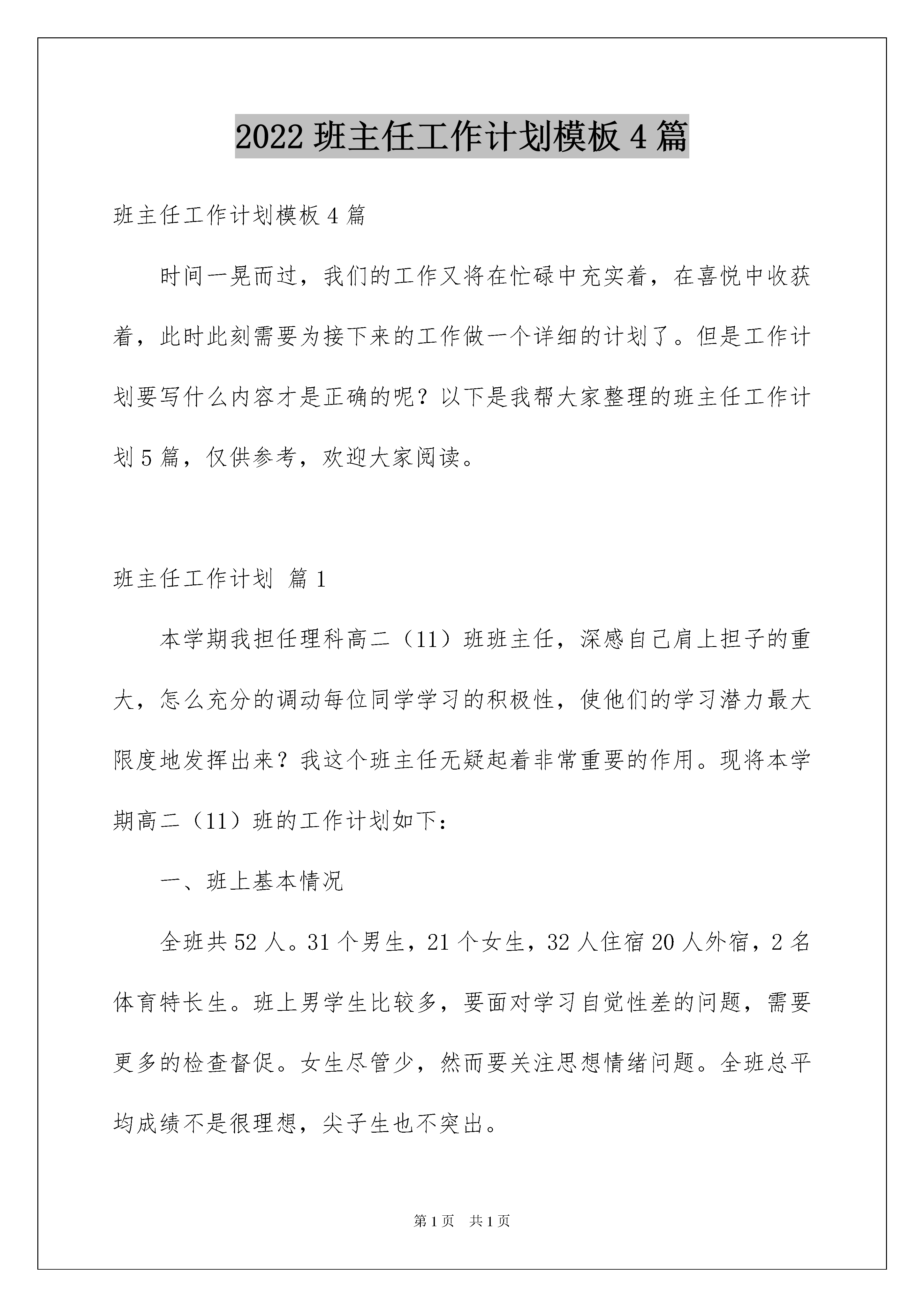 2022班主任工作计划模板4篇班主任工作计划模板4篇时间一晃而过,我们的工作又将在忙碌中充实着,在喜悦中收获着,此时此刻需要为接下来的工作做一个详细的计划了。但是工作计划要写什么内容才是正确的呢?以下是我帮大家整理的班主任工作计划5篇,仅供参考,欢迎大家阅读。班主任工作计划篇1本学期我担任理科高二(11)班班主任,深感自己肩上担子的重大,怎么充分的调动每位同学学习的积极性,使他们的学习潜力最大限度地发挥出来?我这个班主任无疑起着非常重要的作用。现将本学期高二(11)班的工作计划如下:一、班上基本情况全班共52人。31个男生,21个女生,32人住宿20人外宿,2名体育特长生。班上男学生比较多,要面对学习自觉性差的问题,需要更多的检查督促。女生尽管少,然而要关注思想情绪问题。全班总平均成绩不是很理想,尖子生也不突出。二、认清形势,做好班级稳定工作从思想上给学生讲清我们面临的高考的严峻形势。高二就像是一个跳板,是一个承前启后的阶段!高二是高中生活的关键,高二可以说是高中三年中最难把握的一年,针对这种情况一要抓好立志教育,立志立大志,立坚韧不拔之志;二要培养学生打持久战的思想准备;三要培养学生的吃苦耐劳的精神。使学生明白只要有信心,再加上刻苦努力的学习,朝着自己的目标发展奋力拼搏不尽就一定能够成功。三、本学期工作重点指导学生干部工作,依靠干部及班集体的力量,进一步形成良好的班风、学风。加强后进生的教育转化工作,用“激励教育”、“成功教育”等方法引导、转化后进生。组织学生进行安全、卫生、纪律、法制、理想及爱国主义、集体主义等思想教育;广泛开展爱校、爱班等活动;组织好每次主题班会团会;学习“校规”、“校纪”,切实落实《中学生守则》和《中学生日常行为规范实施细则》,加强毕业前心理辅导。三、采取的措施:1.重视养成教育:养成良好的学习习惯和生活习惯,对学生的成长进步是十分必要的,良好的行为习惯使一个人的终生发展受益非浅。因此,在班级进行良好品德的养成教育是十分必要的。根据学生的思想实际情况,与学校的德育工作密切配合,本学期,将从不同的方面和角度对学生进行规律性的常规训练。重点落实好《中学生日常行为规范》,使学生逐步形成良好的道德品质,行为习惯,学习习惯和积极的学习态度,不使一个学生掉队。2、加强后进生管理:面向全体学生,分类施教,加强对后进生的辅导,要从关心、爱护学生的角度出发,了解关心学生。多与学生和家长交流及时了解学生的心理变化,掌握他们成长道路上的发展情况。3、及时了解学情:准确把握学生对知识的掌握,因材施教,在重点难点上下工夫,以促进全班成绩的平稳、扎实地上升。4、家教结合:经常保持与否学生家长联系,使学校教育和家庭教育有机地结合起来。要不厌其烦的做好后进生的转化工作,抓两头,促中间,使全班真正成为一个团结向上的班集体。5、培养班级干部:及时召开班干部会议,针对他们在工作中出现的问题,教给他们工作方法,使他们明确自己的职责,指出他们的优缺点和今后努力工作的方向。同时,还要求他们注意班干部成员之间的合作,齐心协力,拧成一股绳,尽力在同学之间树立他们的威信,创造机会,锻炼和培养他们的能力。6、重视关怀教育:要关心学生的生活,及时和家长联系,体贴他们的冷暖,了解他们的心理,建立平等和谐的师生关系,做学生的知心朋友,以使班主任工作做的更好。7、抓好团队工作:班级工作的一个重要部分,就是班主任工作,是充分发挥学生特长、张扬学生个性的有效途径。本学期将积极配合学校,结合实际搞好各项活动。8、加强心理辅导:高二年级是学生成长的一个分水岭,学生思想问题多,有部分学生很紧张,有部分学生高一基础不好,现在跟不上就有点自曝自弃,有部分学生自认为聪明,学习动力不强,原地踏步。在工作中通过多种渠道,了解学生,多与学生谈心,找到问题所在,力争让学生放下包袱,轻装上阵。总之,做好的本学期的工作就能为下学期打下坚实的基础。认真从学习质量,学习效率,学习方法上引导学生,顺利度过这个学期,工作要走到前面,任何事都当成一件大事认真处理,尽量做好。班主任工作计划篇2新一学期的到来,我们的工作也将辞旧迎新,在原有的基础上迎接新的挑战。有人说:一个好班主任就是一个好班集体。如果说每个孩子都是一颗小星星,我愿用真诚,热情为他们撑起一片挚爱的晴空,让他们各自闪烁出最灿烂,最动人的光辉!为了让班级充满活力与创新,为了能更好地塑造孩子们的心灵,让他们得到全面的发展,也为了使新学期班级上能有更新的气息,特制定班主任工作计划如下:一、指导思想:以课堂教学和教育活动为载体,坚持以学生发展为本的教育理念,发挥生本管理和学习小组的独特作用,