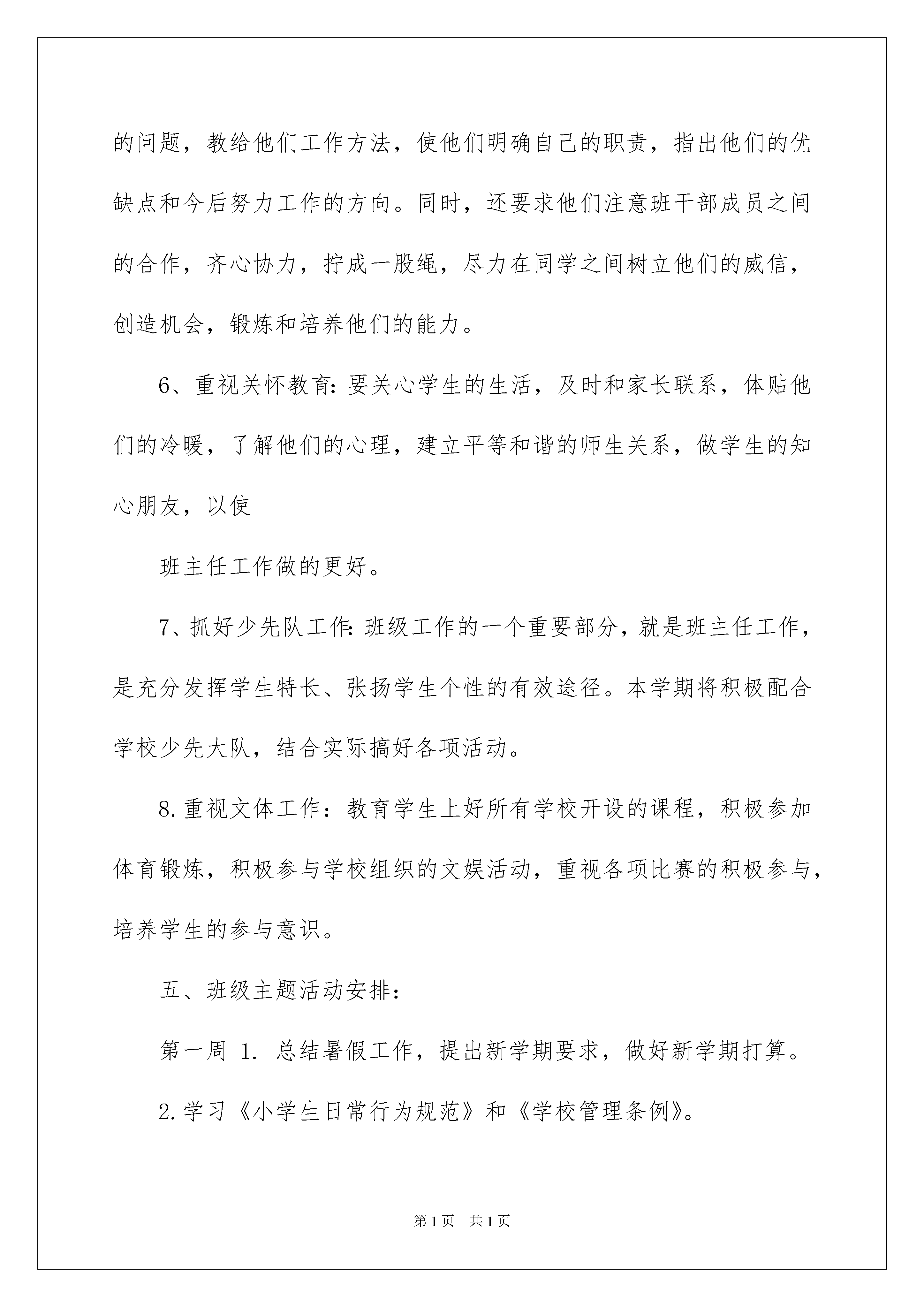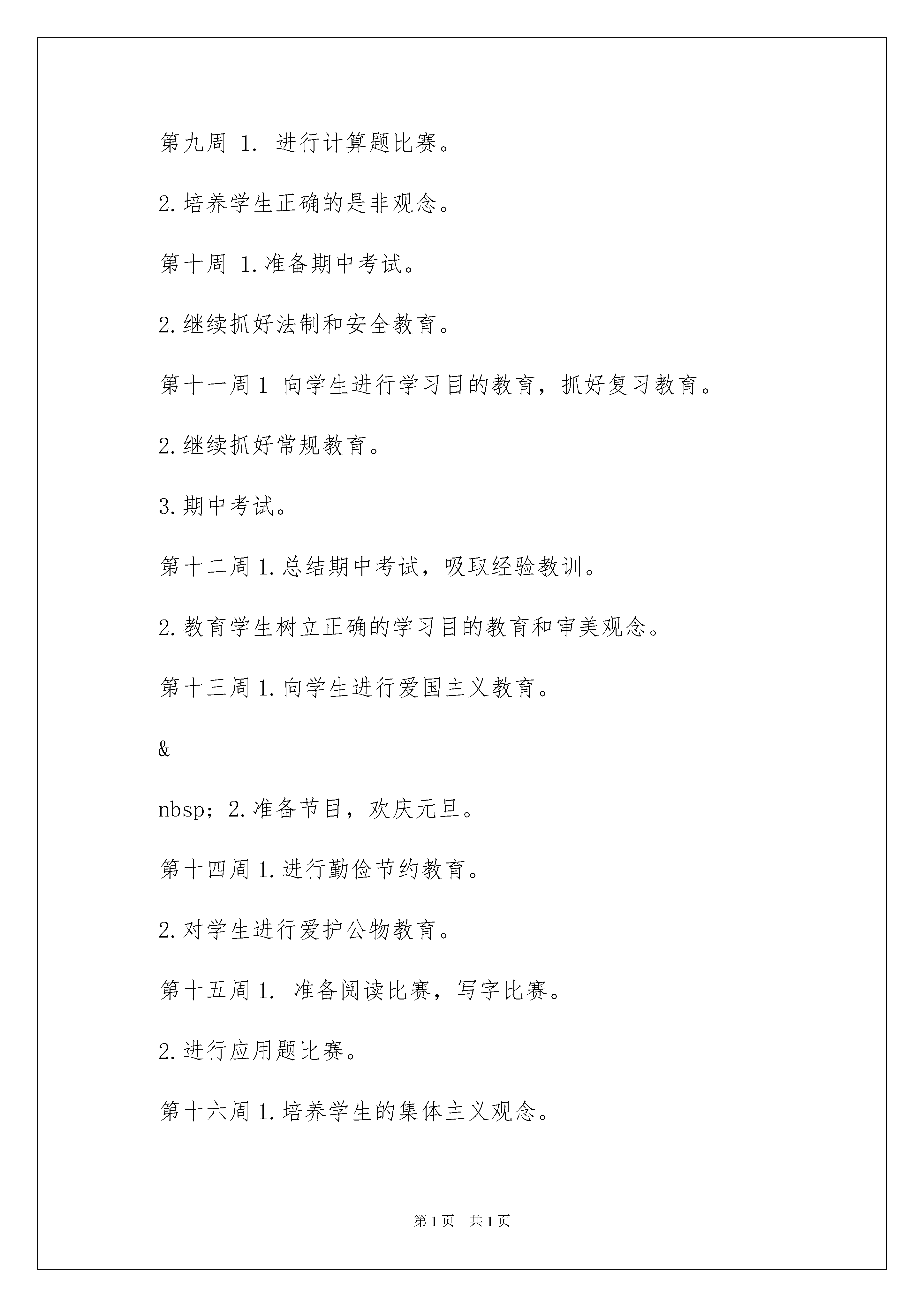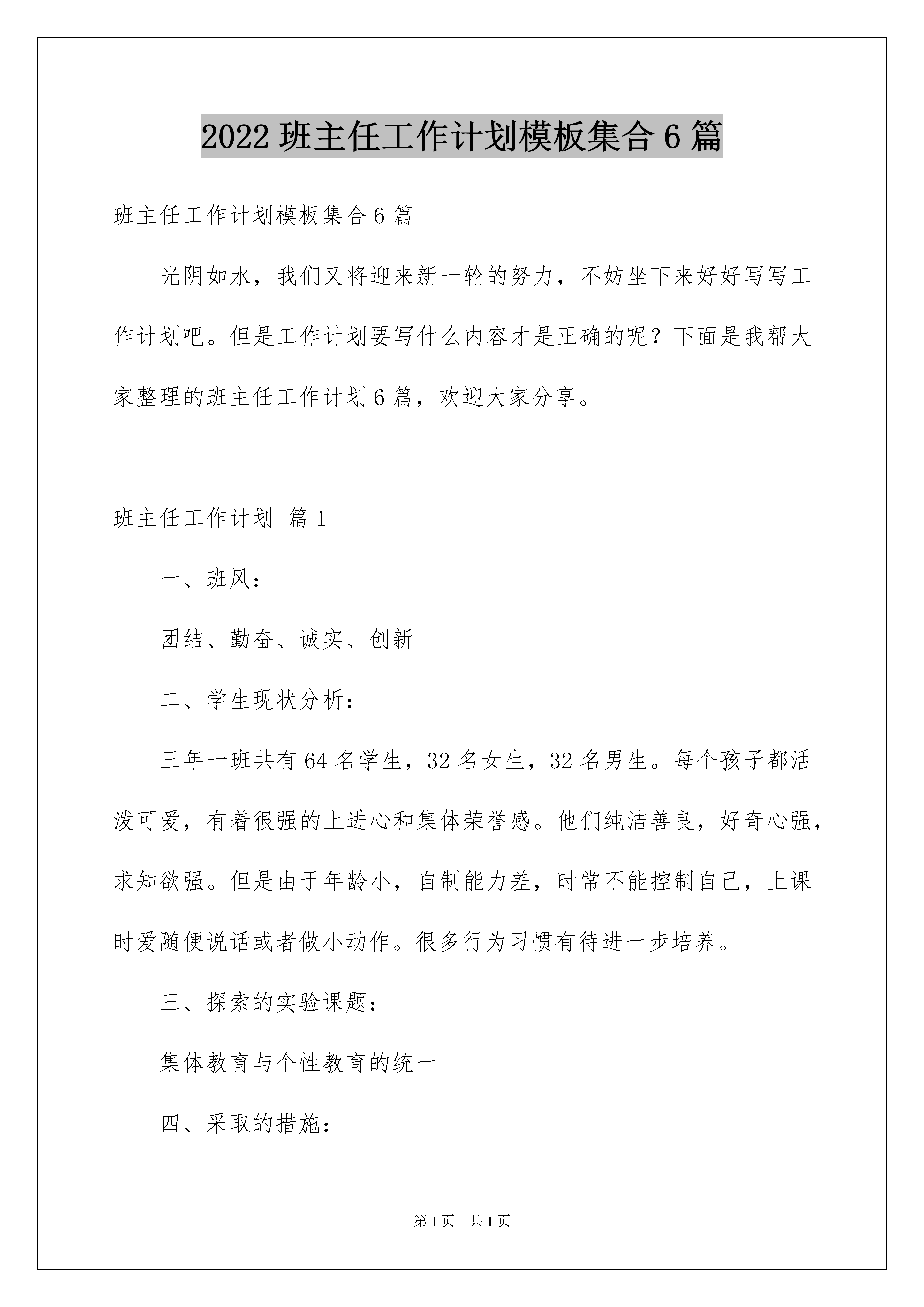 2022班主任工作计划模板集合6篇班主任工作计划模板集合6篇光阴如水,我们又将迎来新一轮的努力,不妨坐下来好好写写工作计划吧。但是工作计划要写什么内容才是正确的呢?下面是我帮大家整理的班主任工作计划6篇,欢迎大家分享。班主任工作计划篇1一、班风:团结、勤奋、诚实、创新二、学生现状分析:三年一班共有64名学生,32名女生,32名男生。每个孩子都活泼可爱,有着很强的上进心和集体荣誉感。他们纯洁善良,好奇心强,求知欲强。但是由于年龄小,自制能力差,时常不能控制自己,上课时爱随便说话或者做小动作。很多行为习惯有待进一步培养。三、探索的实验课题:集体教育与个性教育的统一四、采取的措施:1.重视养成教育:养成良好的学习习惯和生活习惯,对学生的成长进步是十分必要的,良好的行为习惯使一个人的终生发展受益非浅。因此,在班级进行良好品德的养成教育是十分必要的。根据学生的思想实际情况,与学校的德育工作密切配合,本学期,将从不同的方面和角度对学生进行规律性的常规训练。重点落实好《小学生日常行为规范》,使学生逐步形成良好的道德品质,行为习惯,学习习惯和积极的学习态度,不使一个学生掉队2、加强后进生管理:面向全体学生,分类施教,加强对后进生的辅导,要从关心、爱护学生的角度出发,了解关心学生。及时了解学生的心理变化,掌握他们成长道路上的发展情况。3、及时了解学情:准确把握学生对知识的掌握,因材施教,在重点难点上下工夫,以促进全班成绩的平稳、扎实地上升。4、家教结合:经常保持与否学生家长联系,使学校教育和家庭教育有机地结合起来,本学期,力争把所有的家长走访一次,甚至多次。要不厌其烦的做好后进生的转化工作,抓两头,促中间,使全班形成一盘棋,真正成为一个团结向上的班集体。5、培养班级干部:及时召开班干部会议,针对他们在工作中出现的问题,教给他们工作方法,使他们明确自己的职责,指出他们的优缺点和今后努力工作的方向。同时,还要求他们注意班干部成员之间的合作,齐心协力,拧成一股绳,尽力在同学之间树立他们的威信,创造机会,锻炼和培养他们的能力。6、重视关怀教育:要关心学生的生活,及时和家长联系,体贴他们的冷暖,了解他们的心理,建立平等和谐的师生关系,做学生的知心朋友,以使班主任工作做的更好。7、抓好少先队工作:班级工作的一个重要部分,就是班主任工作,是充分发挥学生特长、张扬学生个性的有效途径。本学期将积极配合学校少先大队,结合实际搞好各项活动。8.重视文体工作:教育学生上好所有学校开设的课程,积极参加体育锻炼,积极参与学校组织的文娱活动,重视各项比赛的积极参与,培养学生的参与意识。五、班级主题活动安排:第一周1.总结暑假工作,提出新学期要求,做好新学期打算。2.学习《小学生日常行为规范》和《学校管理条例》。3.抓好学生常规,早日进入正常秩序。第二周1.组织好教师节主题班队会活动。2.进行习惯养成教育,形成良好行为习惯。3.继续抓好常规教育,进行常规训练。第三周1.继续巩固上两周的活动内容。2.加强劳动观念教育,搞好个人和集体卫生。第四周1.进行班级写字比赛。2.继续抓好常规教育。第五周1.庆“十一”,进行爱国主义教育。2.进行班级口算比赛。第六周1.对学生进行安全教育。2.培养学生的参与意识和集体主义精神。第七周1.继续抓好纪律和学习目的教育。2.进行班级朗读比赛。第八周1.继续抓好课堂常规教育。2.进行尊敬父母的教育。第九周1.进行计算题比赛。2.培养学生正确的是非观念。第十周1.准备期中考试。2.继续抓好法制和安全教育。第十一周1向学生进行学习目的教育,抓好复习教育。2.继续抓好常规教育。3.期中考试。第十二周1.总结期中考试,吸取经验教训。2.教育学生树立正确的学习目的教育和审美观念。第十三周1.向学生进行爱国主义教育。 2.准备节目,欢庆元旦。第十四周1.进行勤俭节约教育。2.对学生进行爱护公物教育。第十五周1.准备阅读比赛,写字比赛。2.进行应用题比赛。第十六周1.培养学生的集体主义观念。2.教育学生早睡早起,不能因天冷而贪眠。第十七周1.再次进行学习目的的教育。2.评选班级文明学生。第十八周1.继续巩固上周活动内容。2.举行班级庆元旦演出。第十九周1.制定复习计划,鼓励学生努力学习。2.学习三好学生评选条件,准备评比。第二十周1.搞好各类评比,树立榜样。2.加强安全教育,做好放假前的准备工作。班主任工作计划篇2一、常规教育方面二年级的小学生,对于学校的日常生活和学习还未完全适应,每一项规章制度对于他们来说是有些陌生的。为了使学生能够及早进入角色,适应学校的生活,这就要班主任在日常生活中能有序的