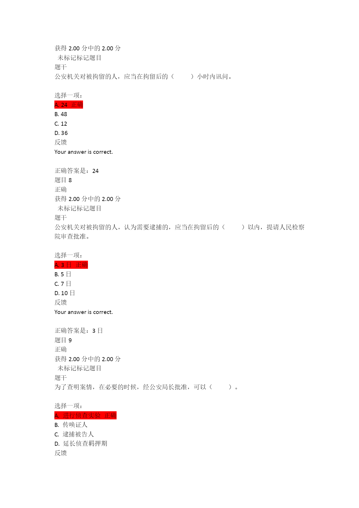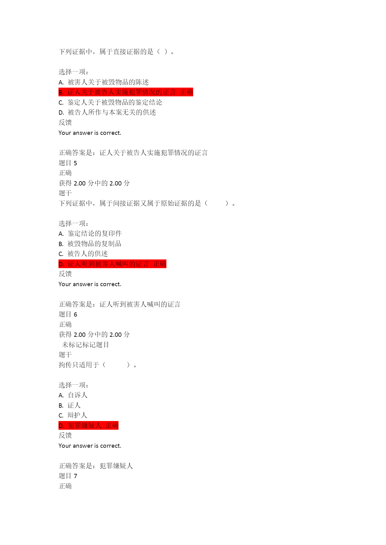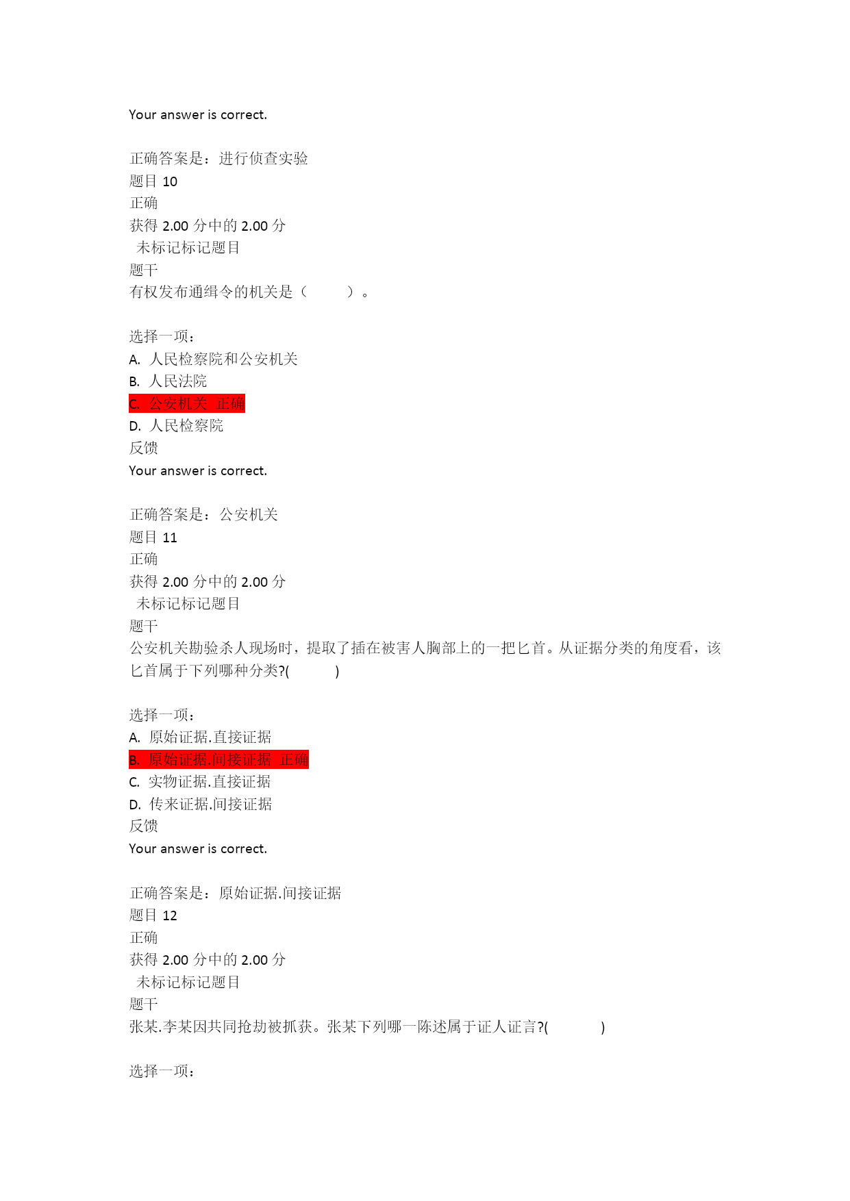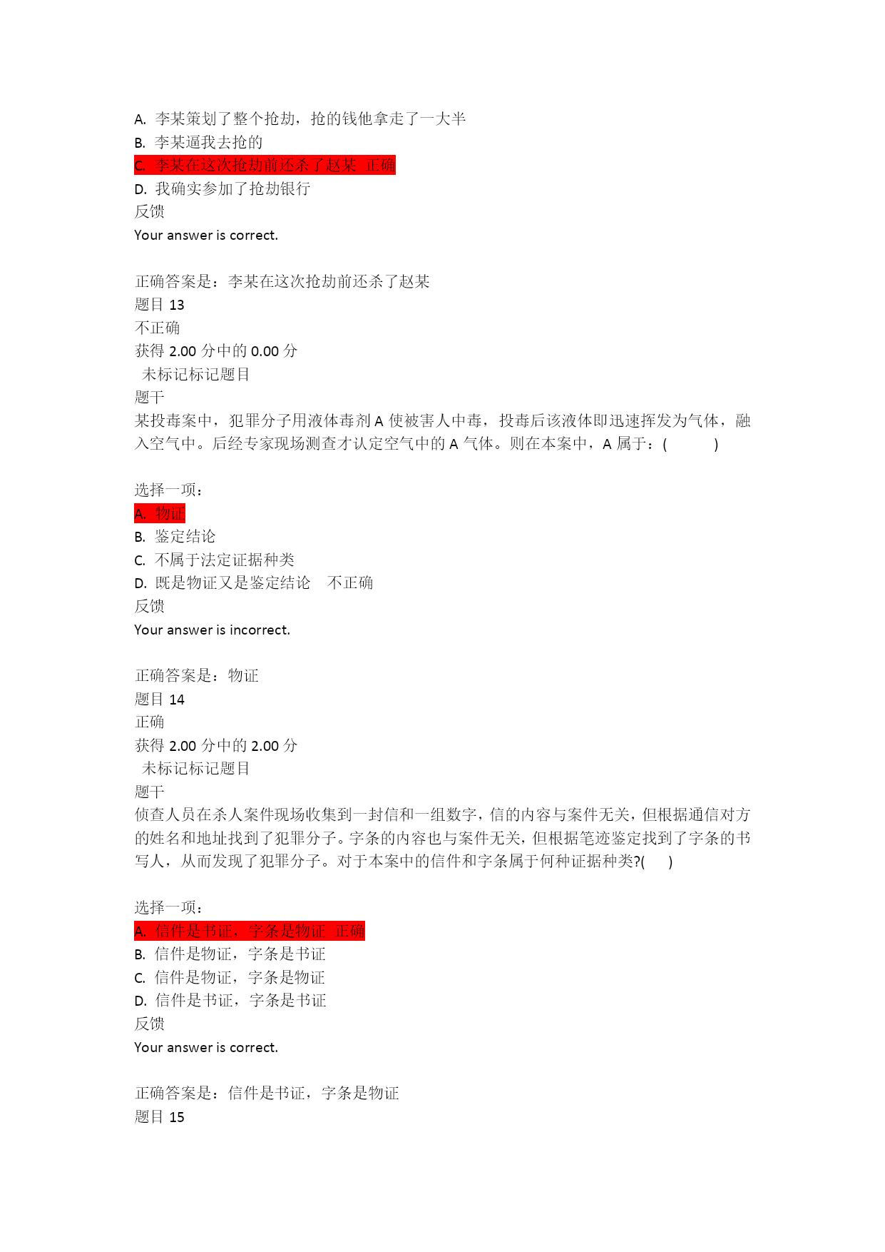 1、在我国刑事诉讼中,对公诉案件应承担证明责任的是()。 选择一项: A.被害人 B.证人 C.被告人 D.公诉机关正确 反馈 Youransweriscorrect. 正确答案是:公诉机关 题目2 正确 获得2.00分中的2.00分 未标记标记题目 题干 下列证据中可以成为直接证据的是()。 选择一项: A.被害人陈述正确 B.指纹 C.杀人凶器 D.血迹 反馈 Youransweriscorrect. 正确答案是:被害人陈述 题目3 题干 下列证据中不能成为直接证据的是()。 选择一项: A.被告人供述 B.鉴定结论 C.证人证言 D.被害人陈述不正确 反馈 Youranswerisincorrect. 正确答案是:被告人供述 题目4 正确 获得2.00分中的2.00分 题干 下列证据中,属于直接证据的是()。 选择一项: A.被害人关于被毁物品的陈述 B.证人关于被告人实施犯罪情况的证言正确 C.鉴定人关于被毁物品的鉴定结论 D.被告人所作与本案无关的供述 反馈 Youransweriscorrect. 正确答案是:证人关于被告人实施犯罪情况的证言 题目5 正确 获得2.00分中的2.00分 题干 下列证据中,属于间接证据又属于原始证据的是()。 选择一项: A.鉴定结论的复印件 B.被毁物品的复制品 C.被告人的供述 D.证人听到被害人喊叫的证言正确 反馈 Youransweriscorrect. 正确答案是:证人听到被害人喊叫的证言 题目6 正确 获得2.00分中的2.00分 未标记标记题目 题干 拘传只适用于()。 选择一项: A.自诉人 B.证人 C.辩护人 D.犯罪嫌疑人正确 反馈 Youransweriscorrect. 正确答案是:犯罪嫌疑人 题目7 正确 获得2.00分中的2.00分 未标记标记题目 题干 公安机关对被拘留的人,应当在拘留后的()小时内讯问。 选择一项: A.24正确 B.48 C.12 D.36 反馈 Youransweriscorrect. 正确答案是:24 题目8 正确 获得2.00分中的2.00分 未标记标记题目 题干 公安机关对被拘留的人,认为需要逮捕的,应当在拘留后的()以内,提请人民检察院审查批准。 选择一项: A.3日正确 B.5日 C.7日 D.10日 反馈 Youransweriscorrect. 正确答案是:3日 题目9 正确 获得2.00分中的2.00分 未标记标记题目 题干 为了查明案情,在必要的时候,经公安局长批准,可以()。 选择一项: A.进行侦查实验正确 B.传唤证人 C.逮捕被告人 D.延长侦查羁押期 反馈 Youransweriscorrect. 正确答案是:进行侦查实验 题目10 正确 获得2.00分中的2.00分 未标记标记题目 题干 有权发布通缉令的机关是()。 选择一项: A.人民检察院和公安机关 B.人民法院 C.公安机关正确 D.人民检察院 反馈 Youransweriscorrect. 正确答案是:公安机关 题目11 正确 获得2.00分中的2.00分 未标记标记题目 题干 公安机关勘验杀人现场时,提取了插在被害人胸部上的一把匕首。从证据分类的角度看,该匕首属于下列哪种分类?() 选择一项: A.原始证据.直接证据 B.原始证据.间接证据正确 C.实物证据.直接证据 D.传来证据.间接证据 反馈 Youransweriscorrect. 正确答案是:原始证据.间接证据 题目12 正确 获得2.00分中的2.00分 未标记标记题目 题干 张某.李某因共同抢劫被抓获。张某下列哪一陈述属于证人证言?() 选择一项: A.李某策划了整个抢劫,抢的钱他拿走了一大半 B.李某逼我去抢的 C.李某在这次抢劫前还杀了赵某正确 D.我确实参加了抢劫银行 反馈 Youransweriscorrect. 正确答案是:李某在这次抢劫前还杀了赵某 题目13 不正确 获得2.00分中的0.00分 未标记标记题目 题干 某投毒案中,犯罪分子用液体毒剂A使被害人中毒,投毒后该液体即迅速挥发为气体,融入空气中。后经专家现场测查才认定空气中的A气体。则在本案中,A属于:() 选择一项: A.物证 B.鉴定结论 C.不属于法定证据种类 D.既是物证又是鉴定结论不正确 反馈 Youranswerisincorrect. 正确答案是:物证 题目14 正确 获得2.00分中的2.00分 未标记标记题目 题干 侦查人员在杀人案件现场收集到一封信和一组数字,信的内容与案件无关,但根据通信对方的姓名和地址找到了犯罪分子。字条的内容也与案件无关,但根据笔迹鉴定找到了字条的书写人,从而发现了犯罪分子。对于本案中的信件和字条属于何种证据种类?