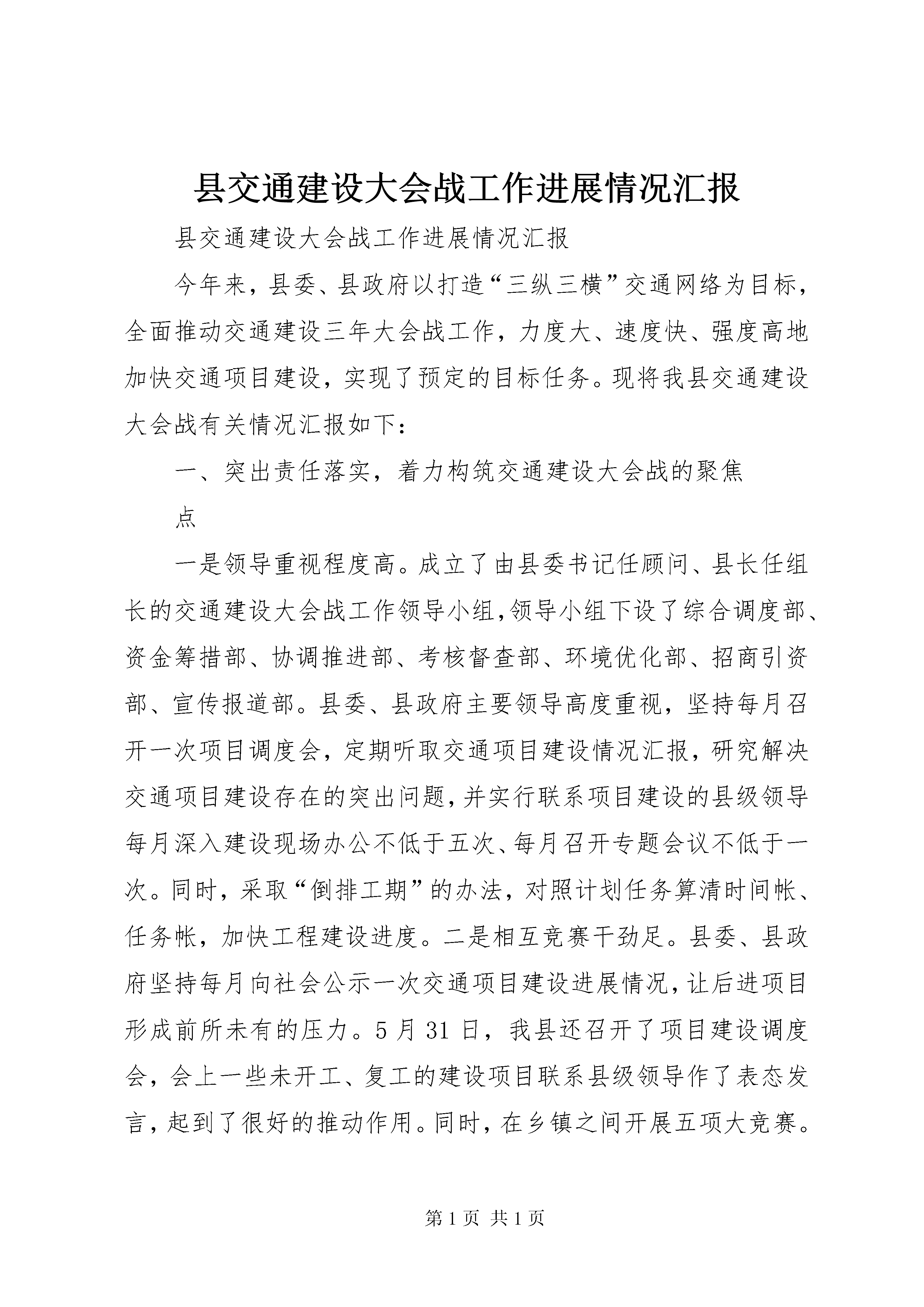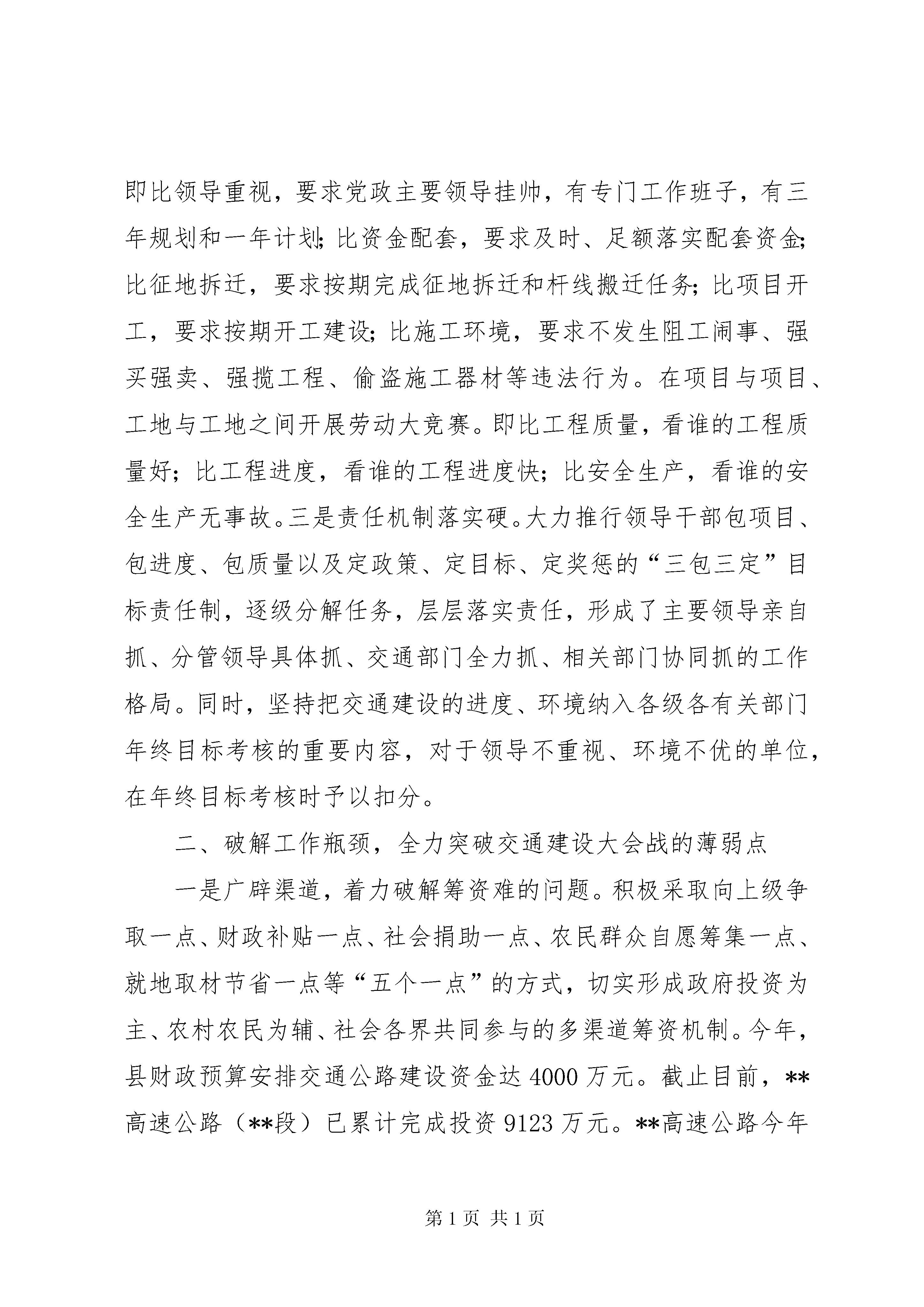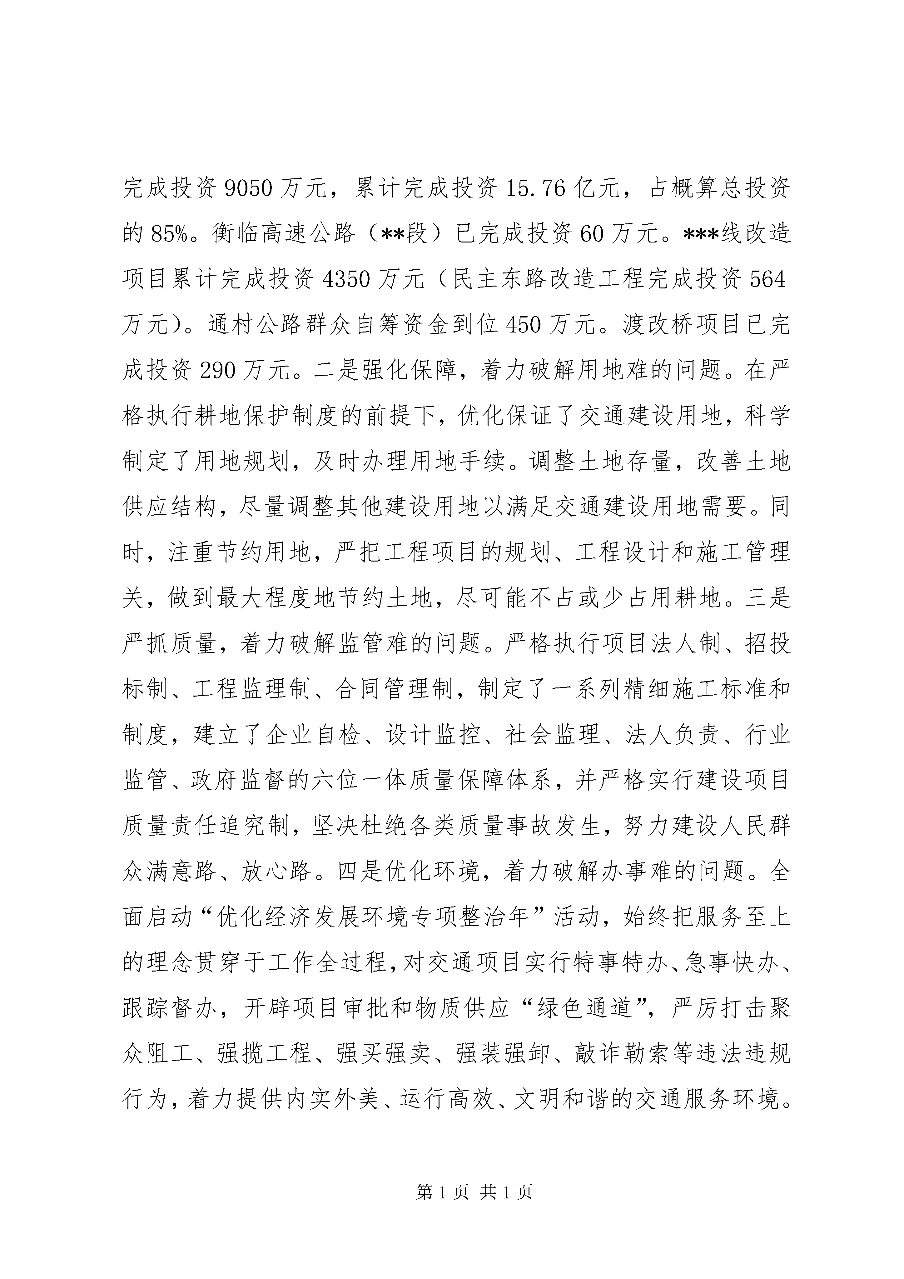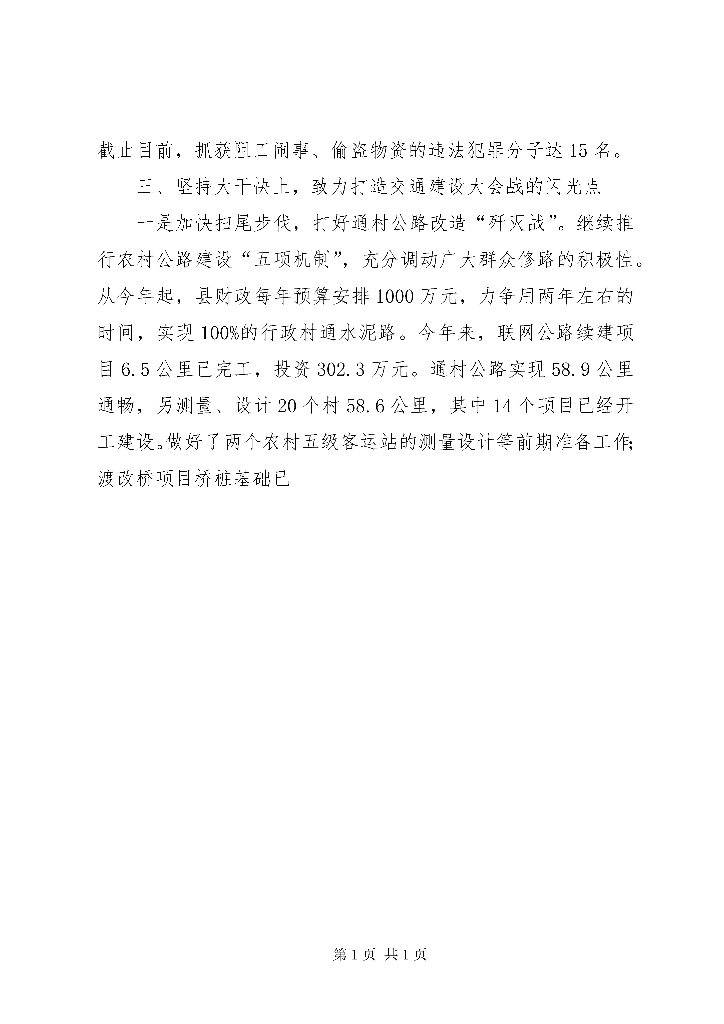 县交通建设大会战工作进展情况汇报县交通建设大会战工作进展情况汇报今年来,县委、县政府以打造“三纵三横”交通网络为目标,全面推动交通建设三年大会战工作,力度大、速度快、强度高地加快交通项目建设,实现了预定的目标任务。现将我县交通建设大会战有关情况汇报如下:一、突出责任落实,着力构筑交通建设大会战的聚焦点一是领导重视程度高。成立了由县委书记任顾问、县长任组长的交通建设大会战工作领导小组,领导小组下设了综合调度部、资金筹措部、协调推进部、考核督查部、环境优化部、招商引资部、宣传报道部。县委、县政府主要领导高度重视,坚持每月召开一次项目调度会,定期听取交通项目建设情况汇报,研究解决交通项目建设存在的突出问题,并实行联系项目建设的县级领导每月深入建设现场办公不低于五次、每月召开专题会议不低于一次。同时,采取“倒排工期”的办法,对照计划任务算清时间帐、任务帐,加快工程建设进度。二是相互竞赛干劲足。县委、县政府坚持每月向社会公示一次交通项目建设进展情况,让后进项目形成前所未有的压力。5月31日,我县还召开了项目建设调度会,会上一些未开工、复工的建设项目联系县级领导作了表态发言,起到了很好的推动作用。同时,在乡镇之间开展五项大竞赛。即比领导重视,要求党政主要领导挂帅,有专门工作班子,有三年规划和一年计划;比资金配套,要求及时、足额落实配套资金;比征地拆迁,要求按期完成征地拆迁和杆线搬迁任务;比项目开工,要求按期开工建设;比施工环境,要求不发生阻工闹事、强买强卖、强揽工程、偷盗施工器材等违法行为。在项目与项目、工地与工地之间开展劳动大竞赛。即比工程质量,看谁的工程质量好;比工程进度,看谁的工程进度快;比安全生产,看谁的安全生产无事故。三是责任机制落实硬。大力推行领导干部包项目、包进度、包质量以及定政策、定目标、定奖惩的“三包三定”目标责任制,逐级分解任务,层层落实责任,形成了主要领导亲自抓、分管领导具体抓、交通部门全力抓、相关部门协同抓的工作格局。同时,坚持把交通建设的进度、环境纳入各级各有关部门年终目标考核的重要内容,对于领导不重视、环境不优的单位,在年终目标考核时予以扣分。二、破解工作瓶颈,全力突破交通建设大会战的薄弱点一是广辟渠道,着力破解筹资难的问题。积极采取向上级争取一点、财政补贴一点、社会捐助一点、农民群众自愿筹集一点、就地取材节省一点等“五个一点”的方式,切实形成政府投资为主、农村农民为辅、社会各界共同参与的多渠道筹资机制。今年,县财政预算安排交通公路建设资金达4000万元。截止目前,**高速公路(**段)已累计完成投资9123万元。**高速公路今年完成投资9050万元,累计完成投资15.76亿元,占概算总投资的85%。衡临高速公路(**段)已完成投资60万元。***线改造项目累计完成投资4350万元(民主东路改造工程完成投资564万元)。通村公路群众自筹资金到位450万元。渡改桥项目已完成投资290万元。二是强化保障,着力破解用地难的问题。在严格执行耕地保护制度的前提下,优化保证了交通建设用地,科学制定了用地规划,及时办理用地手续。调整土地存量,改善土地供应结构,尽量调整其他建设用地以满足交通建设用地需要。同时,注重节约用地,严把工程项目的规划、工程设计和施工管理关,做到最大程度地节约土地,尽可能不占或少占用耕地。三是严抓质量,着力破解监管难的问题。严格执行项目法人制、招投标制、工程监理制、合同管理制,制定了一系列精细施工标准和制度,建立了企业自检、设计监控、社会监理、法人负责、行业监管、政府监督的六位一体质量保障体系,并严格实行建设项目质量责任追究制,坚决杜绝各类质量事故发生,努力建设人民群众满意路、放心路。四是优化环境,着力破解办事难的问题。全面启动“优化经济发展环境专项整治年”活动,始终把服务至上的理念贯穿于工作全过程,对交通项目实行特事特办、急事快办、跟踪督办,开辟项目审批和物质供应“绿色通道”,严厉打击聚众阻工、强揽工程、强买强卖、强装强卸、敲诈勒索等违法违规行为,着力提供内实外美、运行高效、文明和谐的交通服务环境。截止目前,抓获阻工闹事、偷盗物资的违法犯罪分子达15名。三、坚持大干快上,致力打造交通建设大会战的闪光点一是加快扫尾步伐,打好通村公路改造“歼灭战”。继续推行农村公路建设“五项机制”,充分调动广大群众修路的积极性。从今年起,县财政每年预算安排1000万元,力争用两年左右的时间,实现100%的行政村通水泥路。今年来,联网公路续建项目6.5公里已完工,投资302.3万元。通村公路实现58.9公里通畅,另测量、设计20个村58.6公里,其中14个项目已经开工建设。做好了两个农村五级客运站的测量设计等前期准备工作;渡改桥项目桥桩基础已
