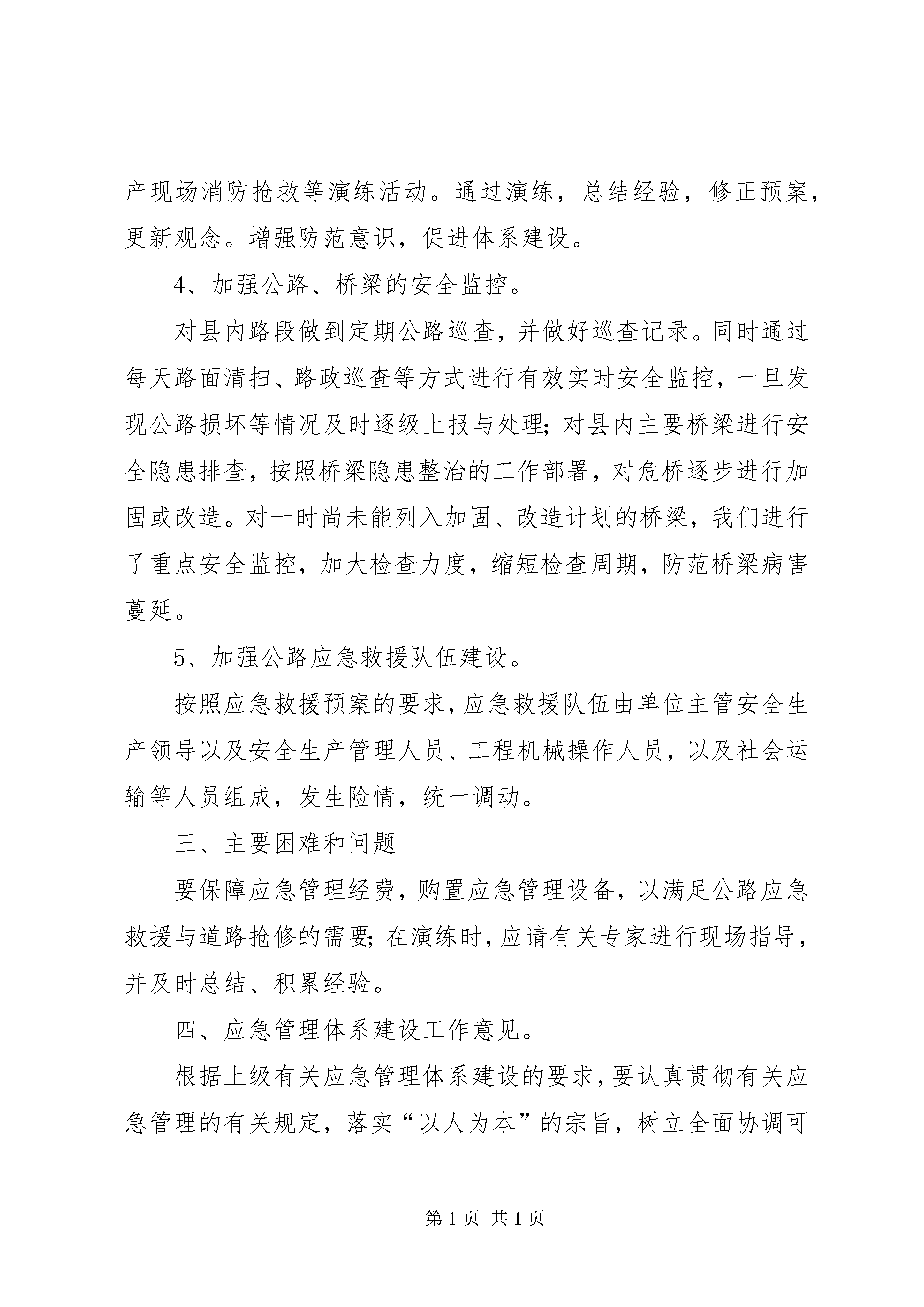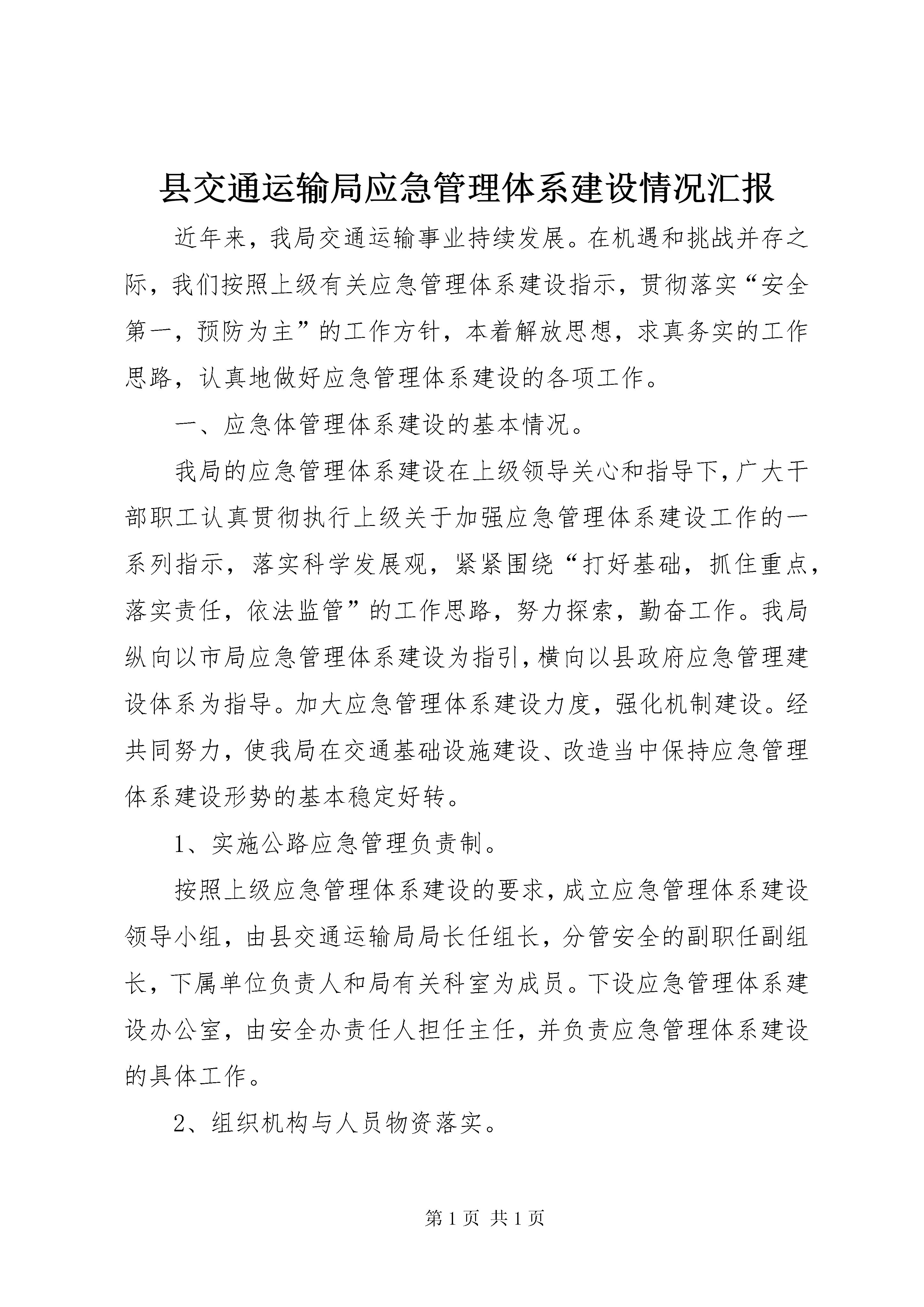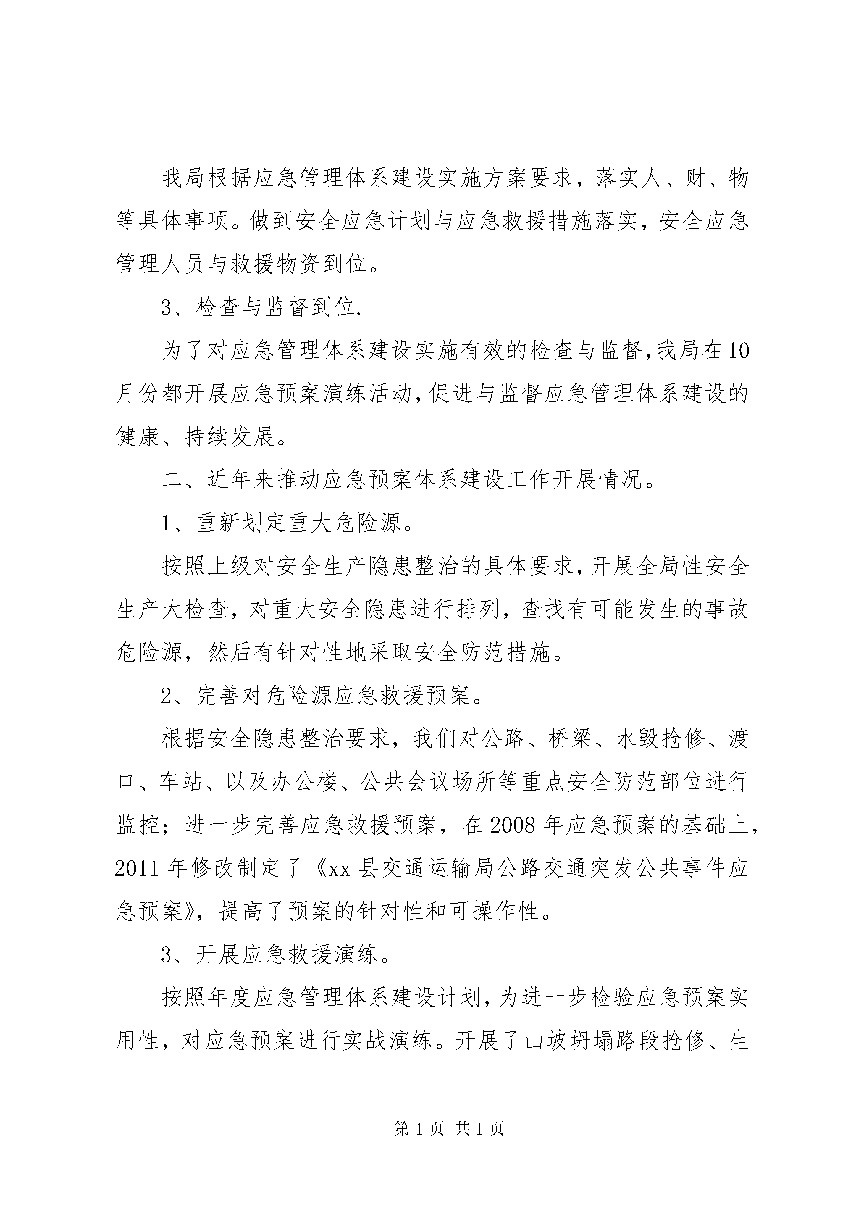 县交通运输局应急管理体系建设情况汇报近年来,我局交通运输事业持续发展。在机遇和挑战并存之际,我们按照上级有关应急管理体系建设指示,贯彻落实“安全第一,预防为主”的工作方针,本着解放思想,求真务实的工作思路,认真地做好应急管理体系建设的各项工作。一、应急体管理体系建设的基本情况。我局的应急管理体系建设在上级领导关心和指导下,广大干部职工认真贯彻执行上级关于加强应急管理体系建设工作的一系列指示,落实科学发展观,紧紧围绕“打好基础,抓住重点,落实责任,依法监管”的工作思路,努力探索,勤奋工作。我局纵向以市局应急管理体系建设为指引,横向以县政府应急管理建设体系为指导。加大应急管理体系建设力度,强化机制建设。经共同努力,使我局在交通基础设施建设、改造当中保持应急管理体系建设形势的基本稳定好转。1、实施公路应急管理负责制。按照上级应急管理体系建设的要求,成立应急管理体系建设领导小组,由县交通运输局局长任组长,分管安全的副职任副组长,下属单位负责人和局有关科室为成员。下设应急管理体系建设办公室,由安全办责任人担任主任,并负责应急管理体系建设的具体工作。2、组织机构与人员物资落实。我局根据应急管理体系建设实施方案要求,落实人、财、物等具体事项。做到安全应急计划与应急救援措施落实,安全应急管理人员与救援物资到位。3、检查与监督到位.为了对应急管理体系建设实施有效的检查与监督,我局在10月份都开展应急预案演练活动,促进与监督应急管理体系建设的健康、持续发展。二、近年来推动应急预案体系建设工作开展情况。1、重新划定重大危险源。按照上级对安全生产隐患整治的具体要求,开展全局性安全生产大检查,对重大安全隐患进行排列,查找有可能发生的事故危险源,然后有针对性地采取安全防范措施。2、完善对危险源应急救援预案。根据安全隐患整治要求,我们对公路、桥梁、水毁抢修、渡口、车站、以及办公楼、公共会议场所等重点安全防范部位进行监控;进一步完善应急救援预案,在2008年应急预案的基础上,2011年修改制定了《xx县交通运输局公路交通突发公共事件应急预案》,提高了预案的针对性和可操作性。3、开展应急救援演练。按照年度应急管理体系建设计划,为进一步检验应急预案实用性,对应急预案进行实战演练。开展了山坡坍塌路段抢修、生产现场消防抢救等演练活动。通过演练,总结经验,修正预案,更新观念。增强防范意识,促进体系建设。4、加强公路、桥梁的安全监控。对县内路段做到定期公路巡查,并做好巡查记录。同时通过每天路面清扫、路政巡查等方式进行有效实时安全监控,一旦发现公路损坏等情况及时逐级上报与处理;对县内主要桥梁进行安全隐患排查,按照桥梁隐患整治的工作部署,对危桥逐步进行加固或改造。对一时尚未能列入加固、改造计划的桥梁,我们进行了重点安全监控,加大检查力度,缩短检查周期,防范桥梁病害蔓延。5、加强公路应急救援队伍建设。按照应急救援预案的要求,应急救援队伍由单位主管安全生产领导以及安全生产管理人员、工程机械操作人员,以及社会运输等人员组成,发生险情,统一调动。三、主要困难和问题要保障应急管理经费,购置应急管理设备,以满足公路应急救援与道路抢修的需要;在演练时,应请有关专家进行现场指导,并及时总结、积累经验。四、应急管理体系建设工作意见。根据上级有关应急管理体系建设的要求,要认真贯彻有关应急管理的有关规定,落实“以人为本”的宗旨,树立全面协调可持续的科学发展观,坚持“安全第一,预防为主”的方针,围绕“打好基础,抓住重点,落实责任,依法监管”的工作思路,开拓创新,扎实工作,发展稳定的应急管理体系建设工作新局面。