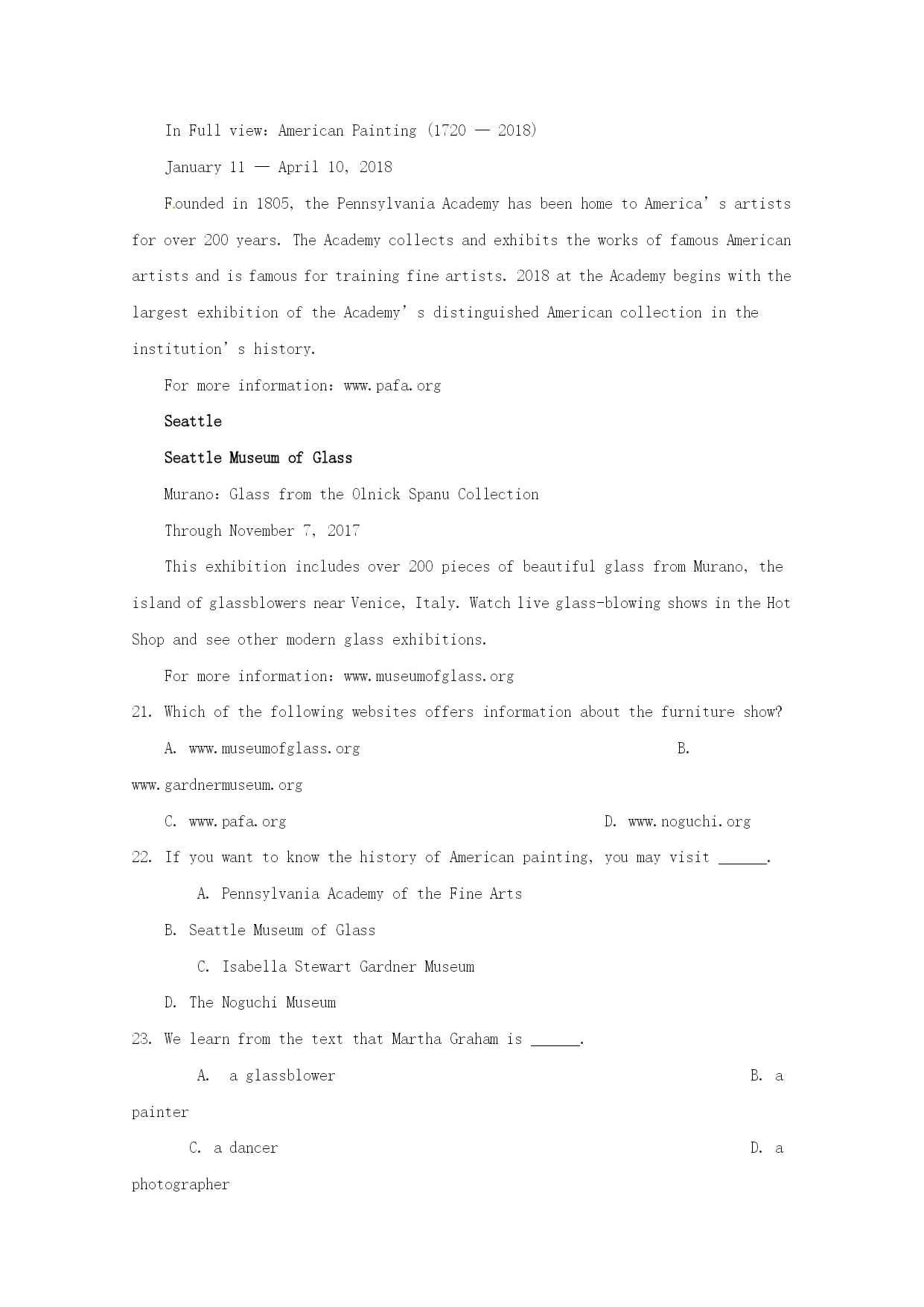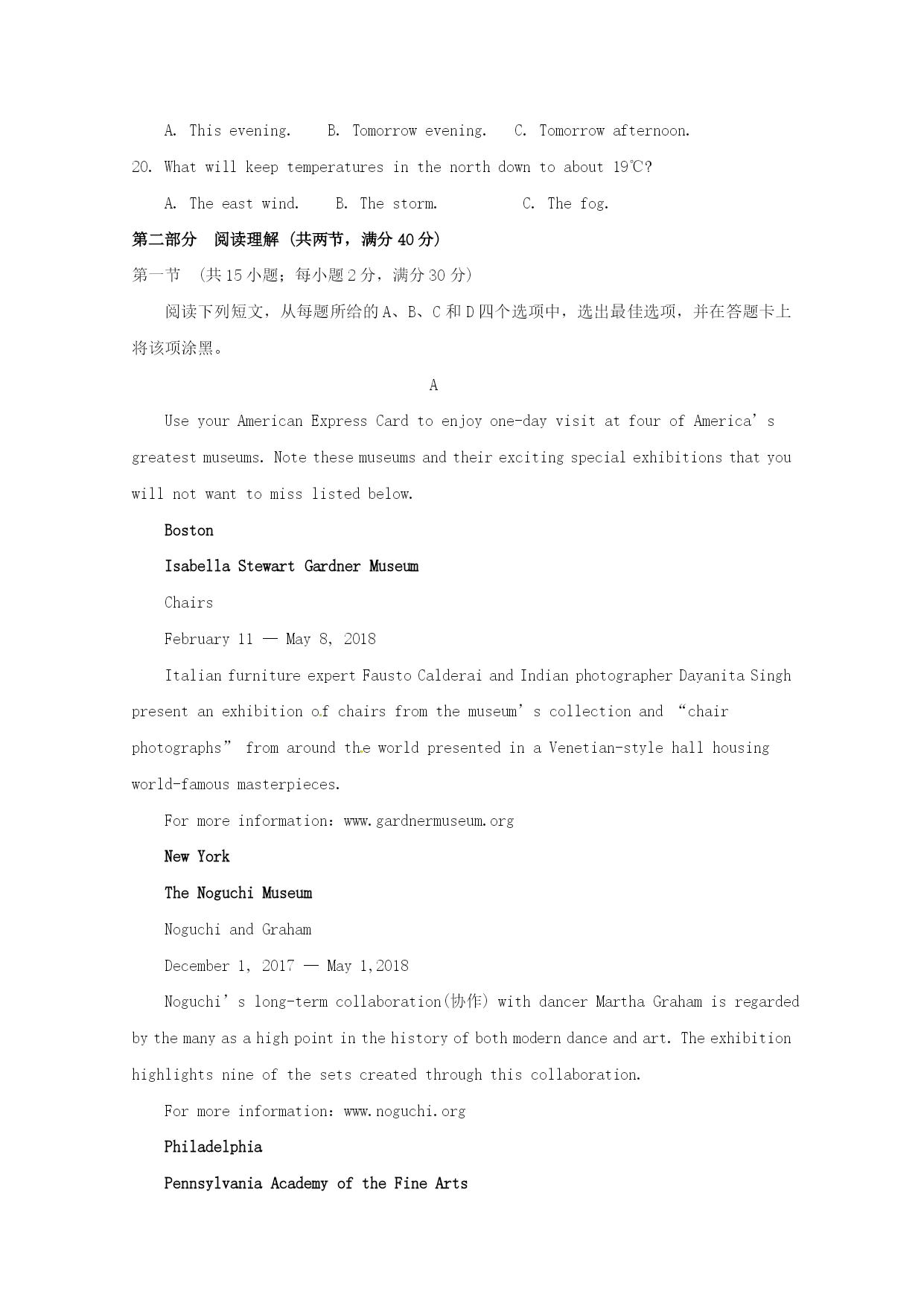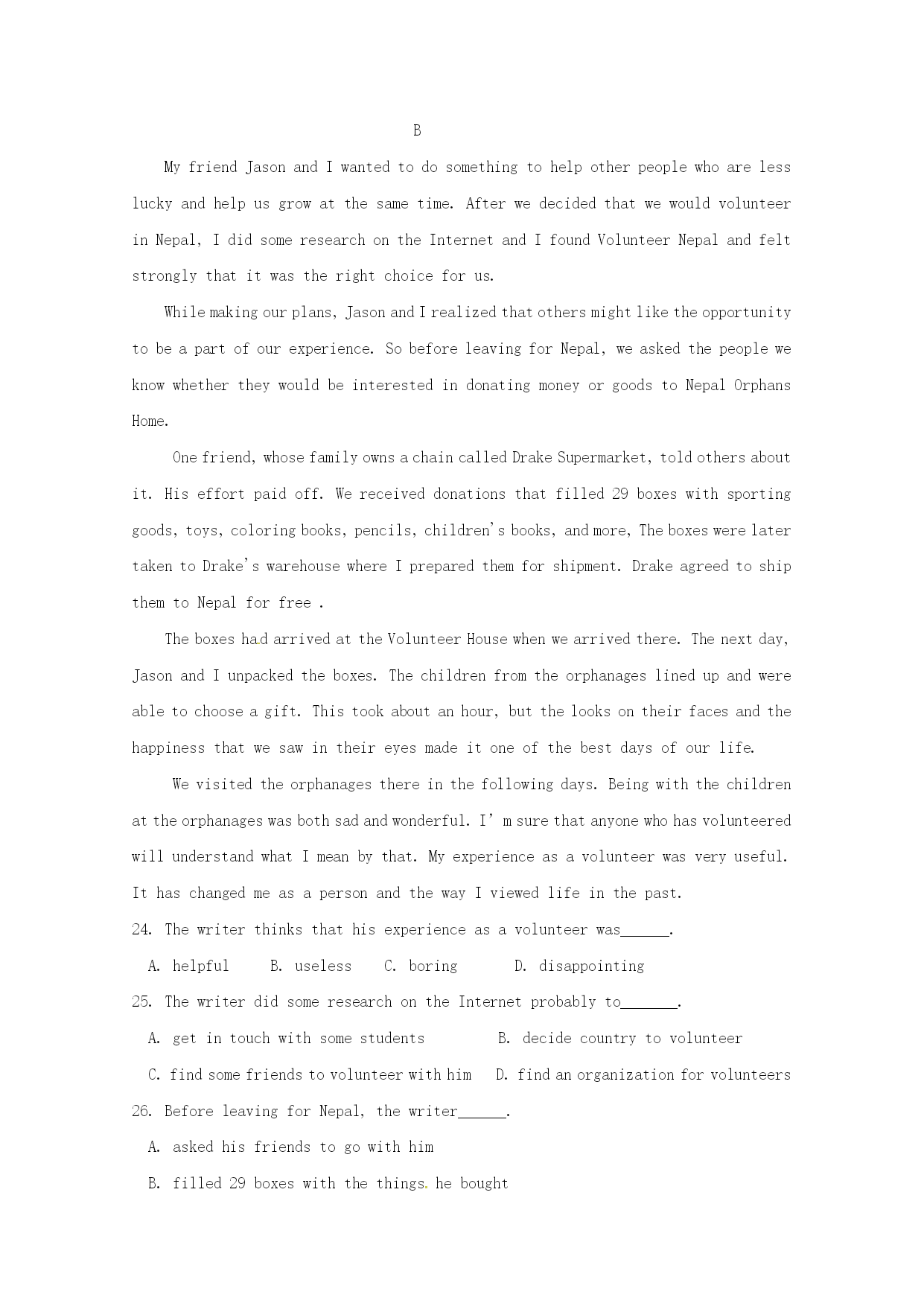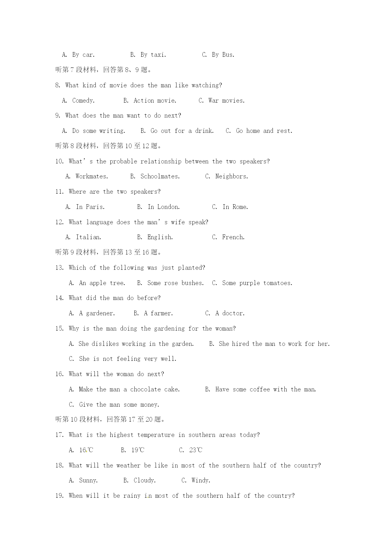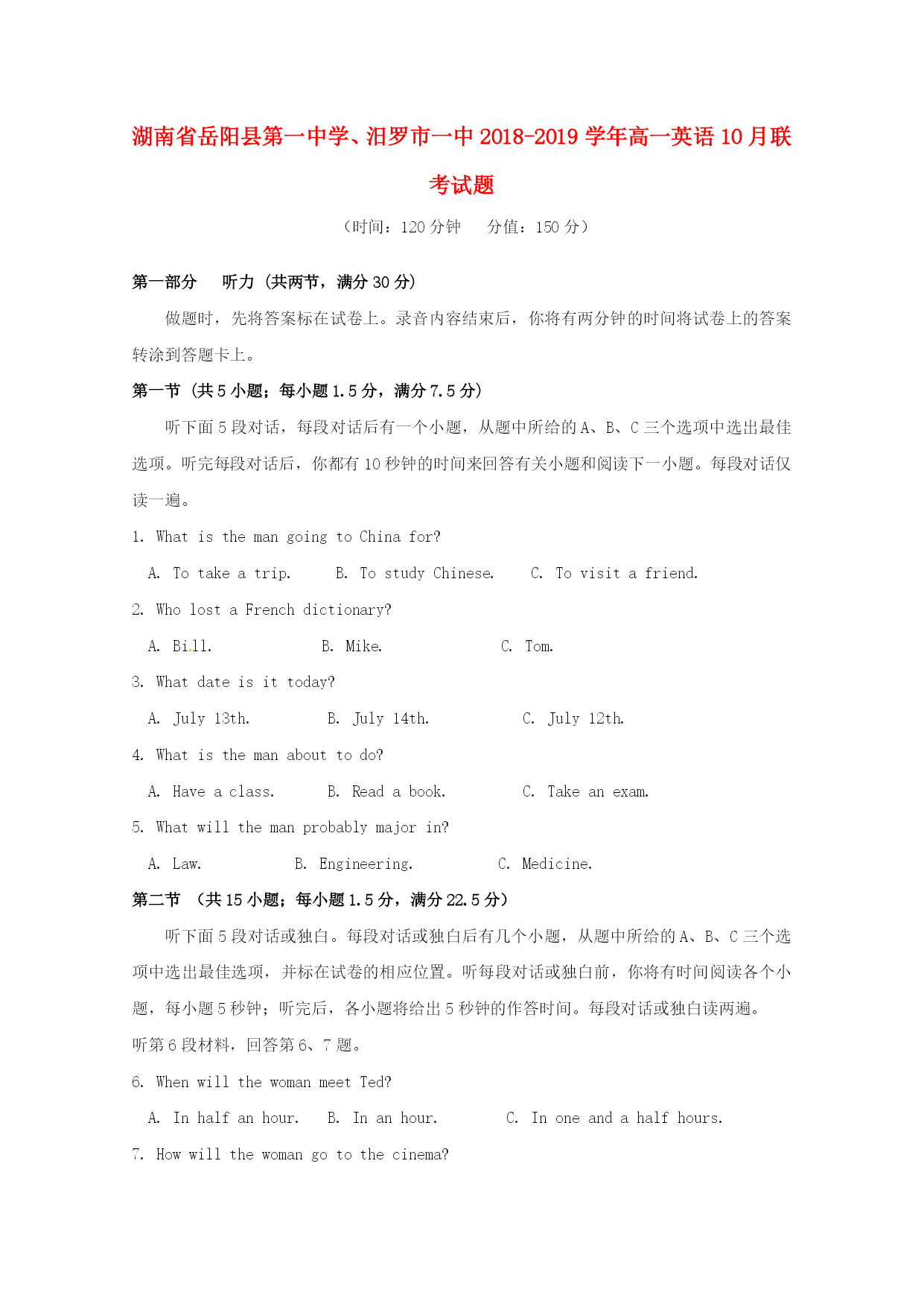 湖南省岳阳县第一中学、汨罗市一中2018-2019学年高一英语10月联考试题 (时间:120分钟分值:150分) 第一部分听力(共两节,满分30分) 做题时,先将答案标在试卷上。录音内容结束后,你将有两分钟的时间将试卷上的答案转涂到答题卡上。 第一节(共5小题;每小题1.5分,满分7.5分) 听下面5段对话,每段对话后有一个小题,从题中所给的A、B、C三个选项中选出最佳选项。听完每段对话后,你都有10秒钟的时间来回答有关小题和阅读下一小题。每段对话仅读一遍。 WhatisthemangoingtoChinafor? A.Totakeatrip.B.TostudyChinese.C.Tovisitafriend. 2.WholostaFrenchdictionary? A.Bill.B.Mike.C.Tom. 3.Whatdateisittoday? A.July13th.B.July14th.C.July12th. 4.Whatisthemanabouttodo? A.Haveaclass.B.Readabook.C.Takeanexam. 5.Whatwillthemanprobablymajorin? A.Law.B.Engineering.C.Medicine. 第二节(共15小题;每小题1.5分,满分22.5分) 听下面5段对话或独白。每段对话或独白后有几个小题,从题中所给的A、B、C三个选项中选出最佳选项,并标在试卷的相应位置。听每段对话或独白前,你将有时间阅读各个小题,每小题5秒钟;听完后,各小题将给出5秒钟的作答时间。每段对话或独白读两遍。 听第6段材料,回答第6、7题。 6.WhenwillthewomanmeetTed? A.Inhalfanhour.B.Inanhour.C.Inoneandahalfhours. 7.Howwillthewomangotothecinema? A.Bycar.B.Bytaxi.C.ByBus. 听第7段材料,回答第8、9题。 8.Whatkindofmoviedoesthemanlikewatching? A.Comedy.B.Actionmovie.C.Warmovies. 9.Whatdoesthemanwanttodonext? A.Dosomewriting.B.Gooutforadrink.C.Gohomeandrest. 听第8段材料,回答第10至12题。 10.What’stheprobablerelationshipbetweenthetwospeakers? A.Workmates.B.Schoolmates.C.Neighbors. 11.Wherearethetwospeakers? A.InParis.B.InLondon.C.InRome. 12.Whatlanguagedoestheman’swifespeak? A.Italian.B.English.C.French. 听第9段材料,回答第13至16题。 13.Whichofthefollowingwasjustplanted? A.Anappletree.B.Somerosebushes.C.Somepurpletomatoes. 14.Whatdidthemandobefore? A.Agardener.B.Afarmer.C.Adoctor. 15.Whyisthemandoingthegardeningforthewoman? A.Shedislikesworkinginthegarden.B.Shehiredthemantoworkforher. C.Sheisnotfeelingverywell. 16.Whatwillthewomandonext? A.Makethemanachocolatecake.B.Havesomecoffeewiththeman. C.Givethemansomemoney. 听第10段材料,回答第17至20题。 17.Whatisthehighesttemperatureinsouthernareastoday? A.16℃B.19℃C.23℃ 18.Whatwilltheweatherbelikeinmostofthesouthernhalfofthecountry? A.Sunny.B.Cloudy.C.Windy. 19.Whenwillitberainyinmostofthesouthernhalfofthecountry? A.Thisevening.B.Tomorrowevening.C.Tomorrowafternoon. 20.Whatwillkeeptemperaturesinthenorthdowntoabout19℃?