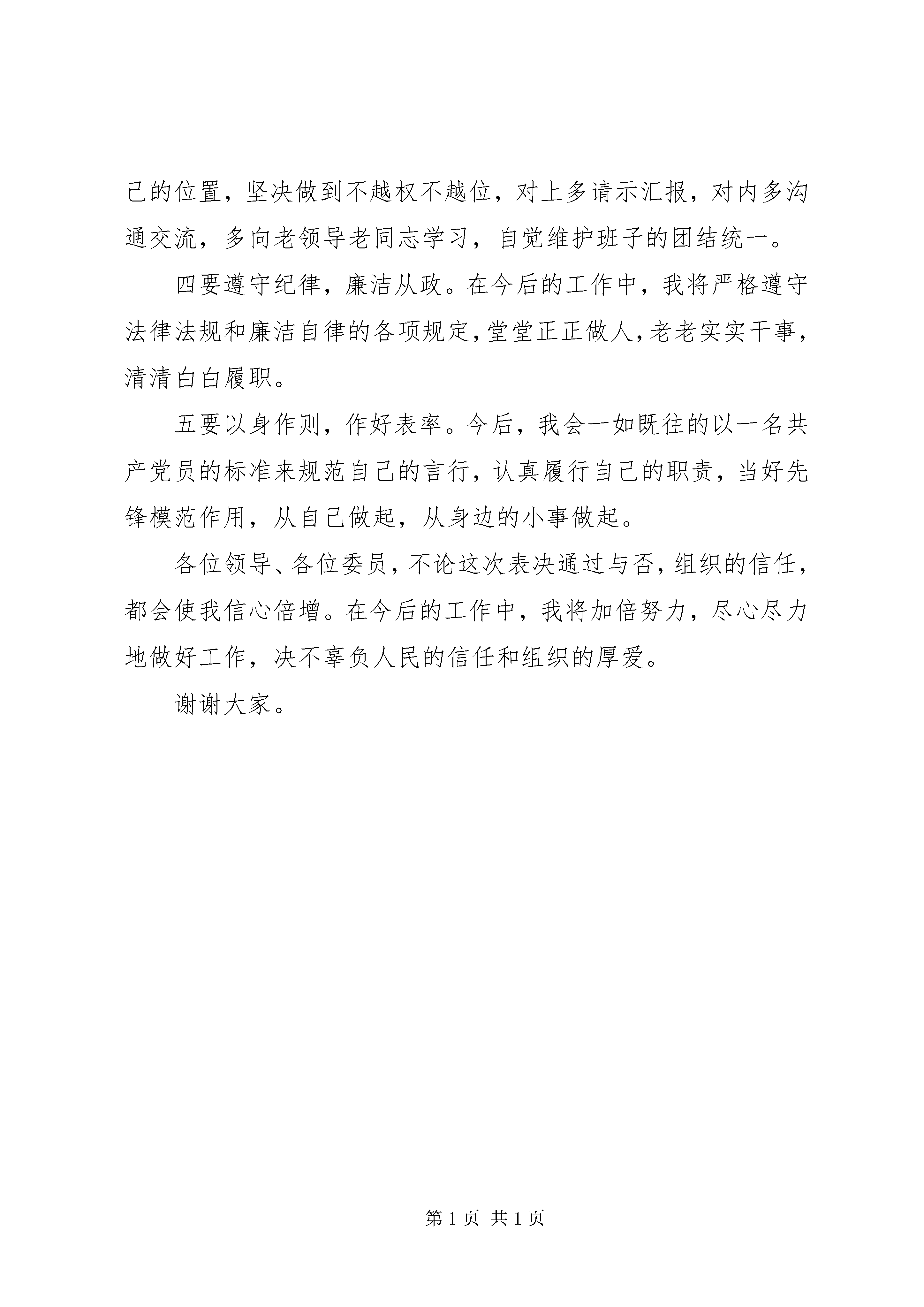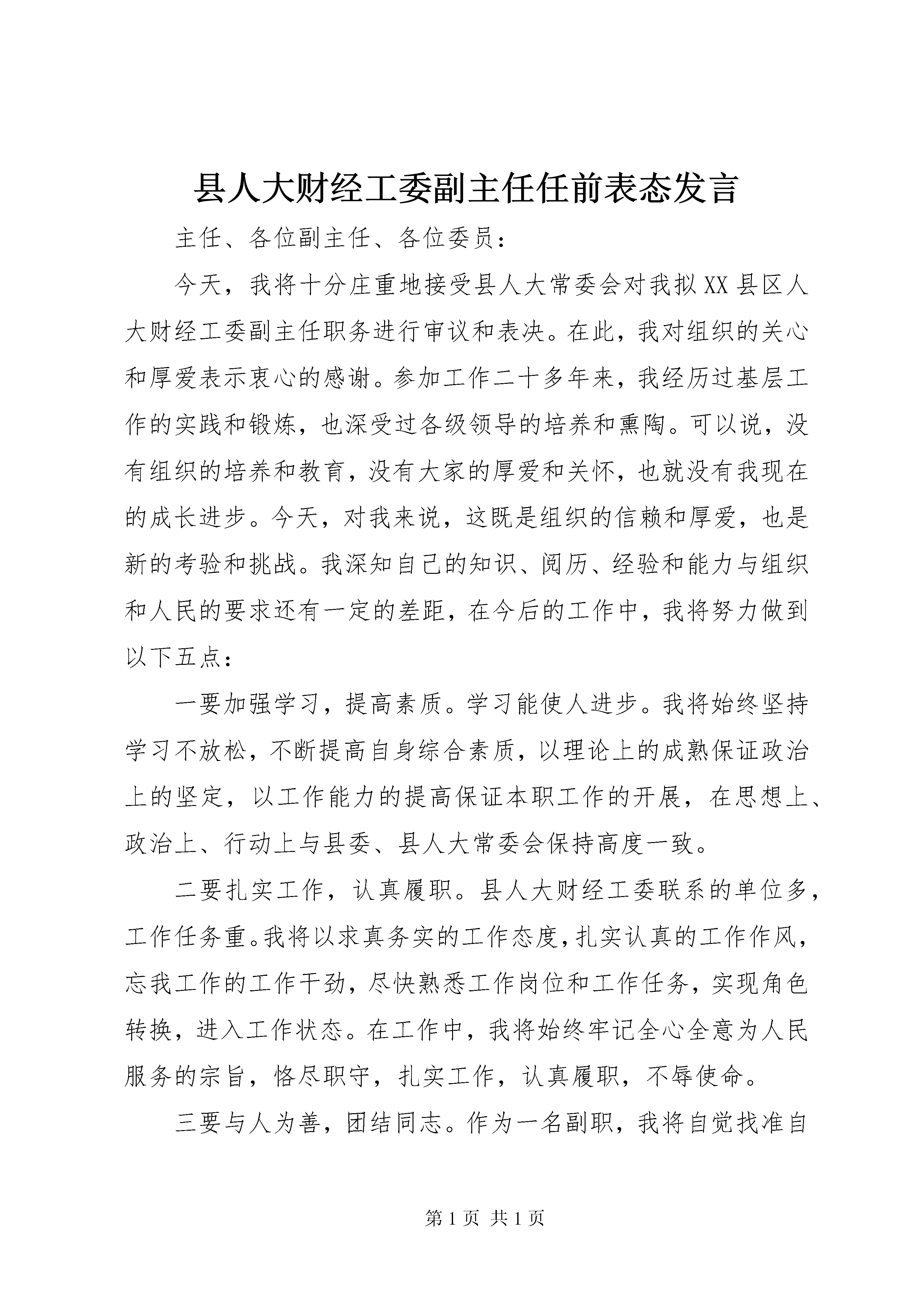县人大财经工委副主任任前表态发言主任、各位副主任、各位委员:今天,我将十分庄重地接受县人大常委会对我拟XX县区人大财经工委副主任职务进行审议和表决。在此,我对组织的关心和厚爱表示衷心的感谢。参加工作二十多年来,我经历过基层工作的实践和锻炼,也深受过各级领导的培养和熏陶。可以说,没有组织的培养和教育,没有大家的厚爱和关怀,也就没有我现在的成长进步。今天,对我来说,这既是组织的信赖和厚爱,也是新的考验和挑战。我深知自己的知识、阅历、经验和能力与组织和人民的要求还有一定的差距,在今后的工作中,我将努力做到以下五点:一要加强学习,提高素质。学习能使人进步。我将始终坚持学习不放松,不断提高自身综合素质,以理论上的成熟保证政治上的坚定,以工作能力的提高保证本职工作的开展,在思想上、政治上、行动上与县委、县人大常委会保持高度一致。二要扎实工作,认真履职。县人大财经工委联系的单位多,工作任务重。我将以求真务实的工作态度,扎实认真的工作作风,忘我工作的工作干劲,尽快熟悉工作岗位和工作任务,实现角色转换,进入工作状态。在工作中,我将始终牢记全心全意为人民服务的宗旨,恪尽职守,扎实工作,认真履职,不辱使命。三要与人为善,团结同志。作为一名副职,我将自觉找准自己的位置,坚决做到不越权不越位,对上多请示汇报,对内多沟通交流,多向老领导老同志学习,自觉维护班子的团结统一。四要遵守纪律,廉洁从政。在今后的工作中,我将严格遵守法律法规和廉洁自律的各项规定,堂堂正正做人,老老实实干事,清清白白履职。五要以身作则,作好表率。今后,我会一如既往的以一名共产党员的标准来规范自己的言行,认真履行自己的职责,当好先锋模范作用,从自己做起,从身边的小事做起。各位领导、各位委员,不论这次表决通过与否,组织的信任,都会使我信心倍增。在今后的工作中,我将加倍努力,尽心尽力地做好工作,决不辜负人民的信任和组织的厚爱。谢谢大家。