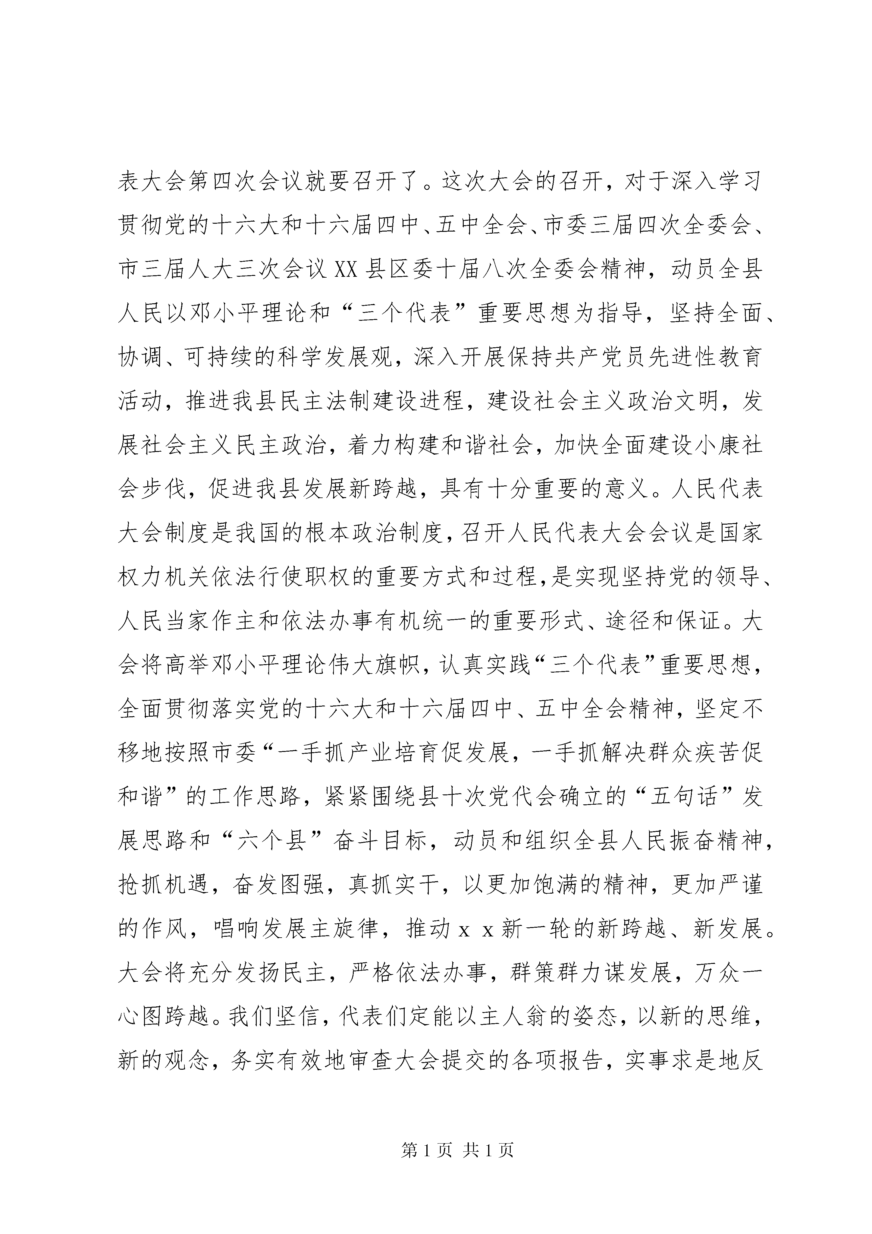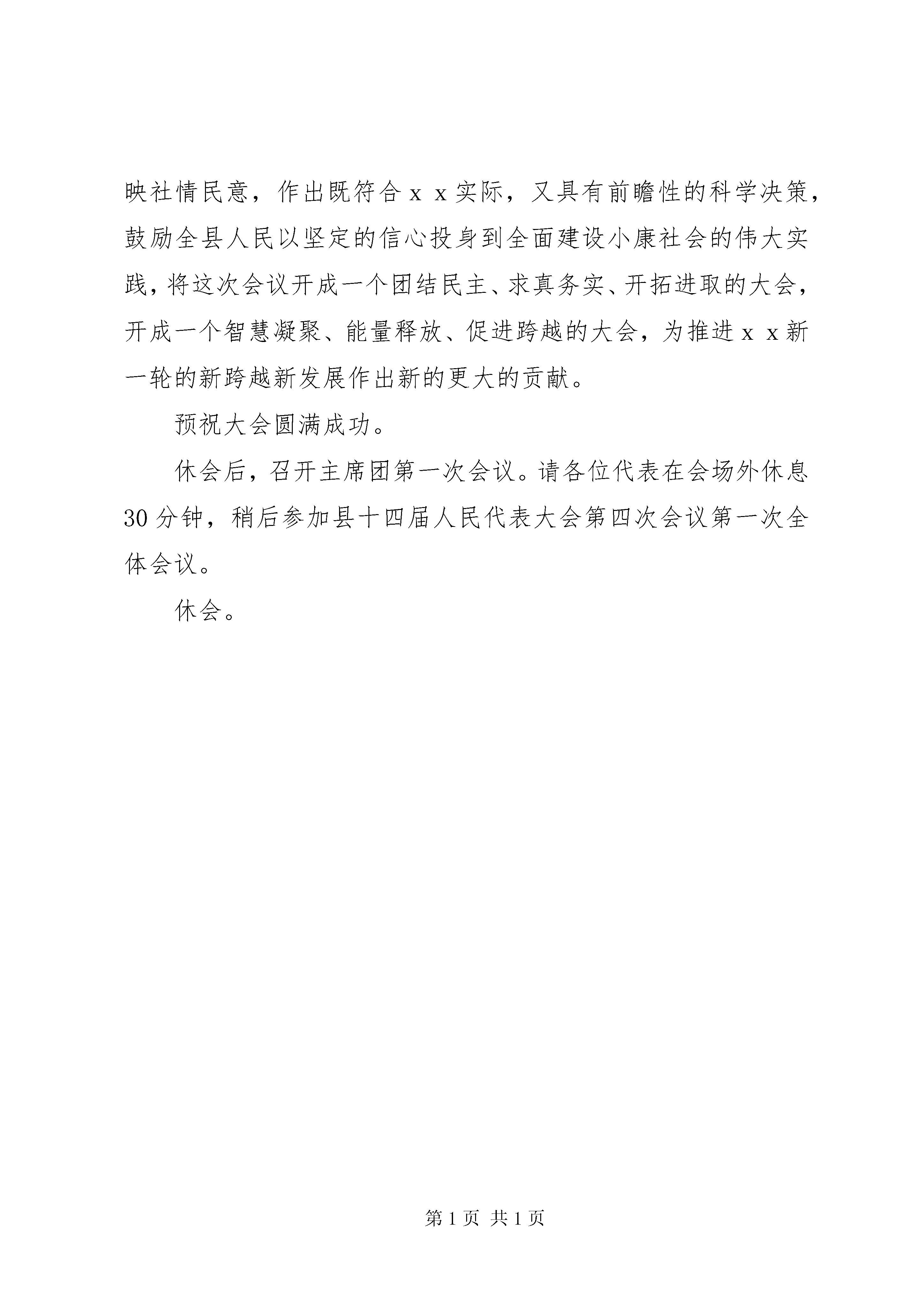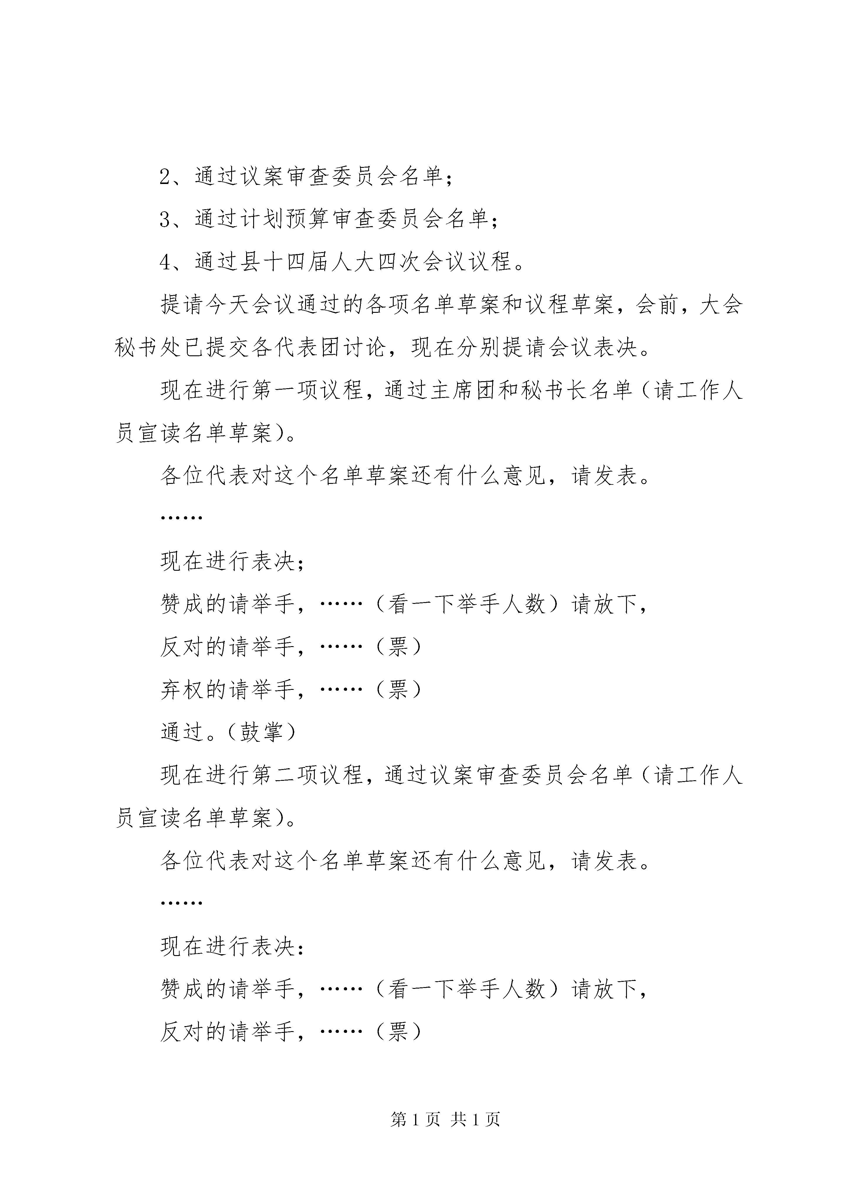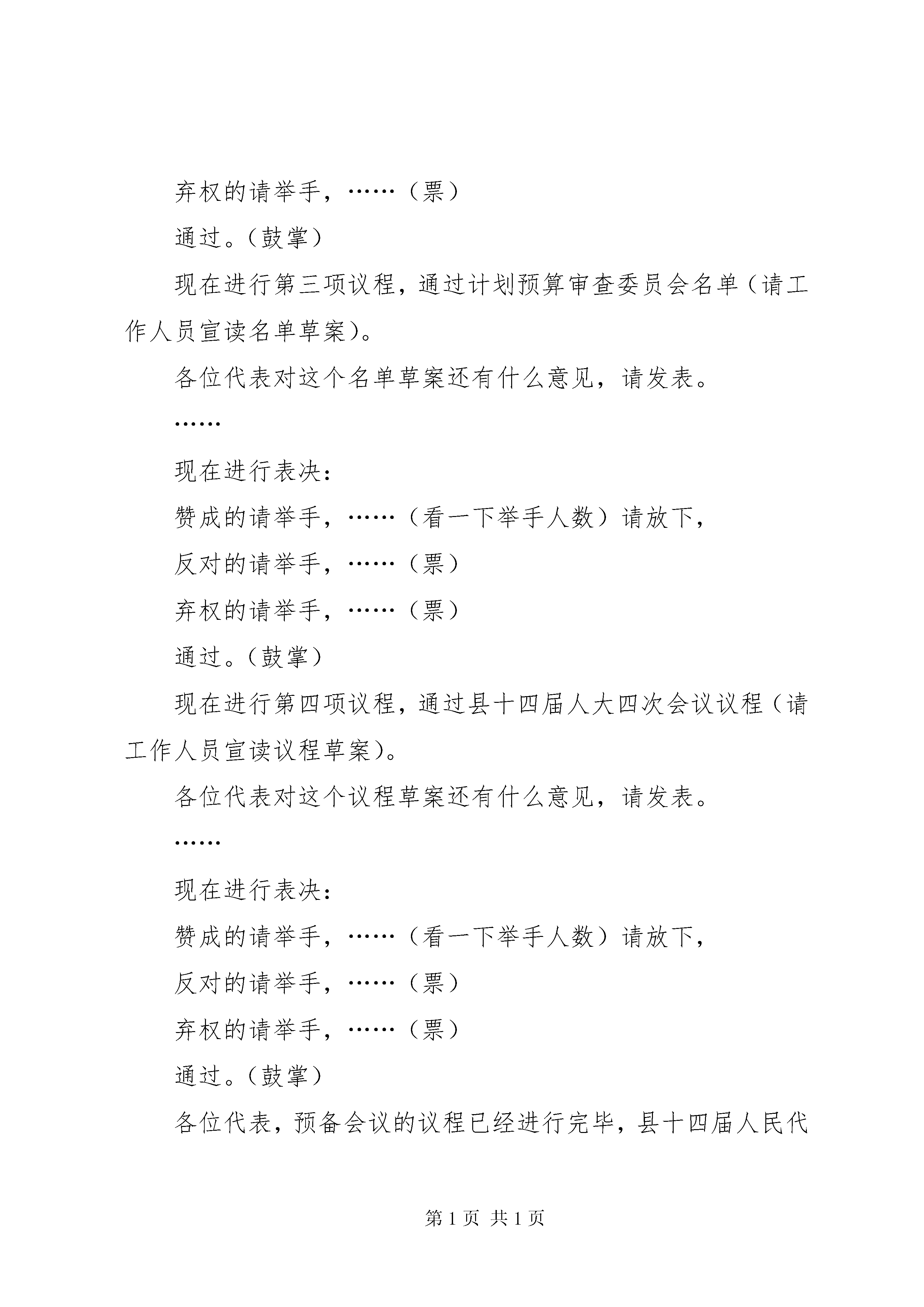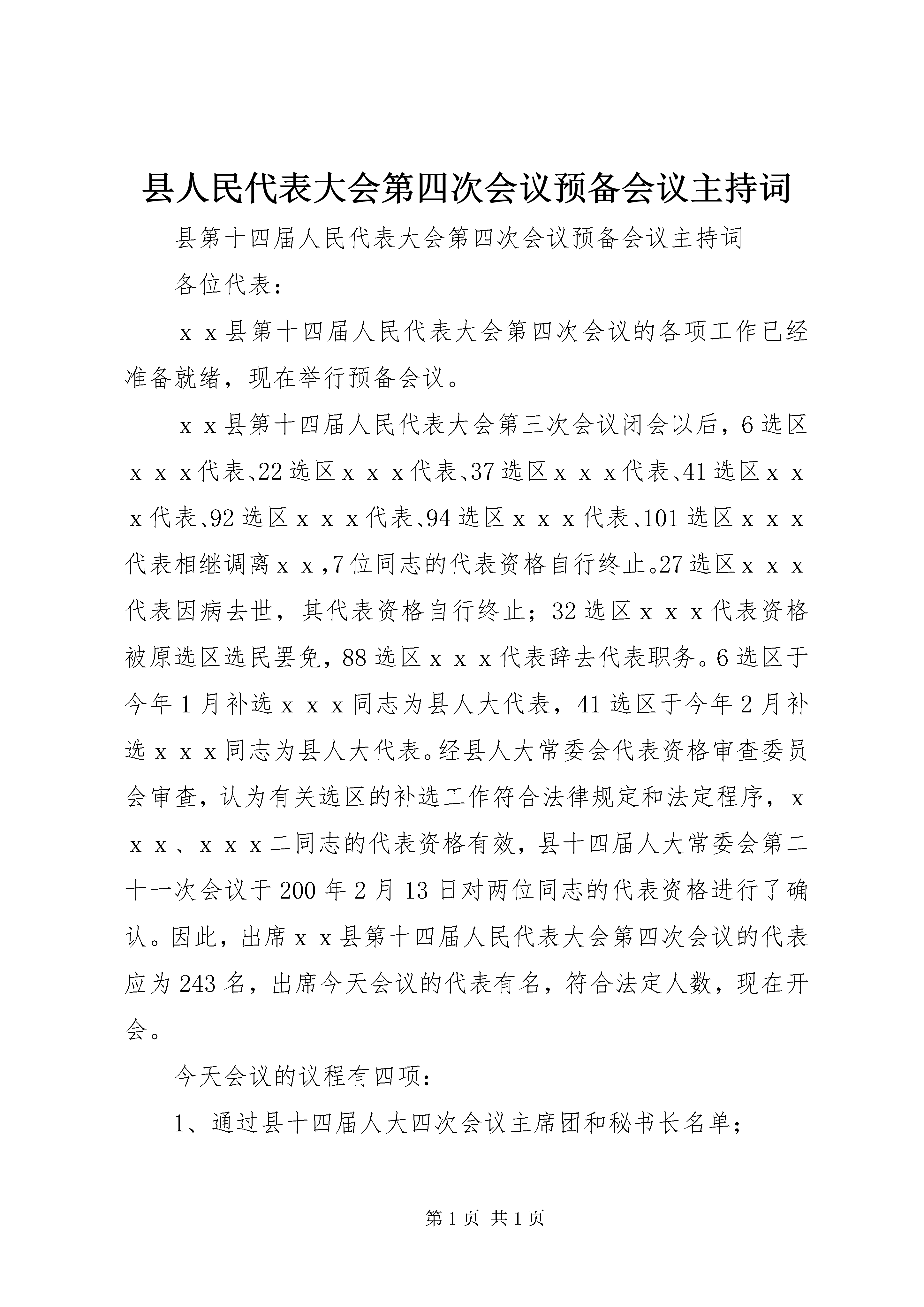 县人民代表大会第四次会议预备会议主持词县第十四届人民代表大会第四次会议预备会议主持词各位代表:xx县第十四届人民代表大会第四次会议的各项工作已经准备就绪,现在举行预备会议。xx县第十四届人民代表大会第三次会议闭会以后,6选区xxx代表、22选区xxx代表、37选区xxx代表、41选区xxx代表、92选区xxx代表、94选区xxx代表、101选区xxx代表相继调离xx,7位同志的代表资格自行终止。27选区xxx代表因病去世,其代表资格自行终止;32选区xxx代表资格被原选区选民罢免,88选区xxx代表辞去代表职务。6选区于今年1月补选xxx同志为县人大代表,41选区于今年2月补选xxx同志为县人大代表。经县人大常委会代表资格审查委员会审查,认为有关选区的补选工作符合法律规定和法定程序,xxx、xxx二同志的代表资格有效,县十四届人大常委会第二十一次会议于200年2月13日对两位同志的代表资格进行了确认。因此,出席xx县第十四届人民代表大会第四次会议的代表应为243名,出席今天会议的代表有名,符合法定人数,现在开会。今天会议的议程有四项:1、通过县十四届人大四次会议主席团和秘书长名单;2、通过议案审查委员会名单;3、通过计划预算审查委员会名单;4、通过县十四届人大四次会议议程。提请今天会议通过的各项名单草案和议程草案,会前,大会秘书处已提交各代表团讨论,现在分别提请会议表决。现在进行第一项议程,通过主席团和秘书长名单(请工作人员宣读名单草案)。各位代表对这个名单草案还有什么意见,请发表。……现在进行表决;赞成的请举手,……(看一下举手人数)请放下,反对的请举手,……(票)弃权的请举手,……(票)通过。(鼓掌)现在进行第二项议程,通过议案审查委员会名单(请工作人员宣读名单草案)。各位代表对这个名单草案还有什么意见,请发表。……现在进行表决:赞成的请举手,……(看一下举手人数)请放下,反对的请举手,……(票)弃权的请举手,……(票)通过。(鼓掌)现在进行第三项议程,通过计划预算审查委员会名单(请工作人员宣读名单草案)。各位代表对这个名单草案还有什么意见,请发表。……现在进行表决:赞成的请举手,……(看一下举手人数)请放下,反对的请举手,……(票)弃权的请举手,……(票)通过。(鼓掌)现在进行第四项议程,通过县十四届人大四次会议议程(请工作人员宣读议程草案)。各位代表对这个议程草案还有什么意见,请发表。……现在进行表决:赞成的请举手,……(看一下举手人数)请放下,反对的请举手,……(票)弃权的请举手,……(票)通过。(鼓掌)各位代表,预备会议的议程已经进行完毕,县十四届人民代表大会第四次会议就要召开了。这次大会的召开,对于深入学习贯彻党的十六大和十六届四中、五中全会、市委三届四次全委会、市三届人大三次会议XX县区委十届八次全委会精神,动员全县人民以邓小平理论和“三个代表”重要思想为指导,坚持全面、协调、可持续的科学发展观,深入开展保持共产党员先进性教育活动,推进我县民主法制建设进程,建设社会主义政治文明,发展社会主义民主政治,着力构建和谐社会,加快全面建设小康社会步伐,促进我县发展新跨越,具有十分重要的意义。人民代表大会制度是我国的根本政治制度,召开人民代表大会会议是国家权力机关依法行使职权的重要方式和过程,是实现坚持党的领导、人民当家作主和依法办事有机统一的重要形式、途径和保证。大会将高举邓小平理论伟大旗帜,认真实践“三个代表”重要思想,全面贯彻落实党的十六大和十六届四中、五中全会精神,坚定不移地按照市委“一手抓产业培育促发展,一手抓解决群众疾苦促和谐”的工作思路,紧紧围绕县十次党代会确立的“五句话”发展思路和“六个县”奋斗目标,动员和组织全县人民振奋精神,抢抓机遇,奋发图强,真抓实干,以更加饱满的精神,更加严谨的作风,唱响发展主旋律,推动xx新一轮的新跨越、新发展。大会将充分发扬民主,严格依法办事,群策群力谋发展,万众一心图跨越。我们坚信,代表们定能以主人翁的姿态,以新的思维,新的观念,务实有效地审查大会提交的各项报告,实事求是地反映社情民意,作出既符合xx实际,又具有前瞻性的科学决策,鼓励全县人民以坚定的信心投身到全面建设小康社会的伟大实践,将这次会议开成一个团结民主、求真务实、开拓进取的大会,开成一个智慧凝聚、能量释放、促进跨越的大会,为推进xx新一轮的新跨越新发展作出新的更大的贡献。预祝大会圆满成功。休会后,召开主席团第一次会议。请各位代表在会场外休息30分钟,稍后参加县十四届人民代表大会第四次会议第一次全体会议。休会。