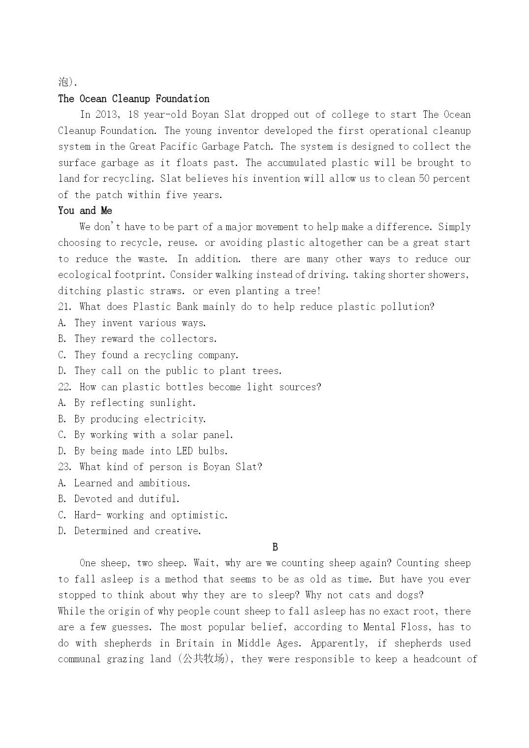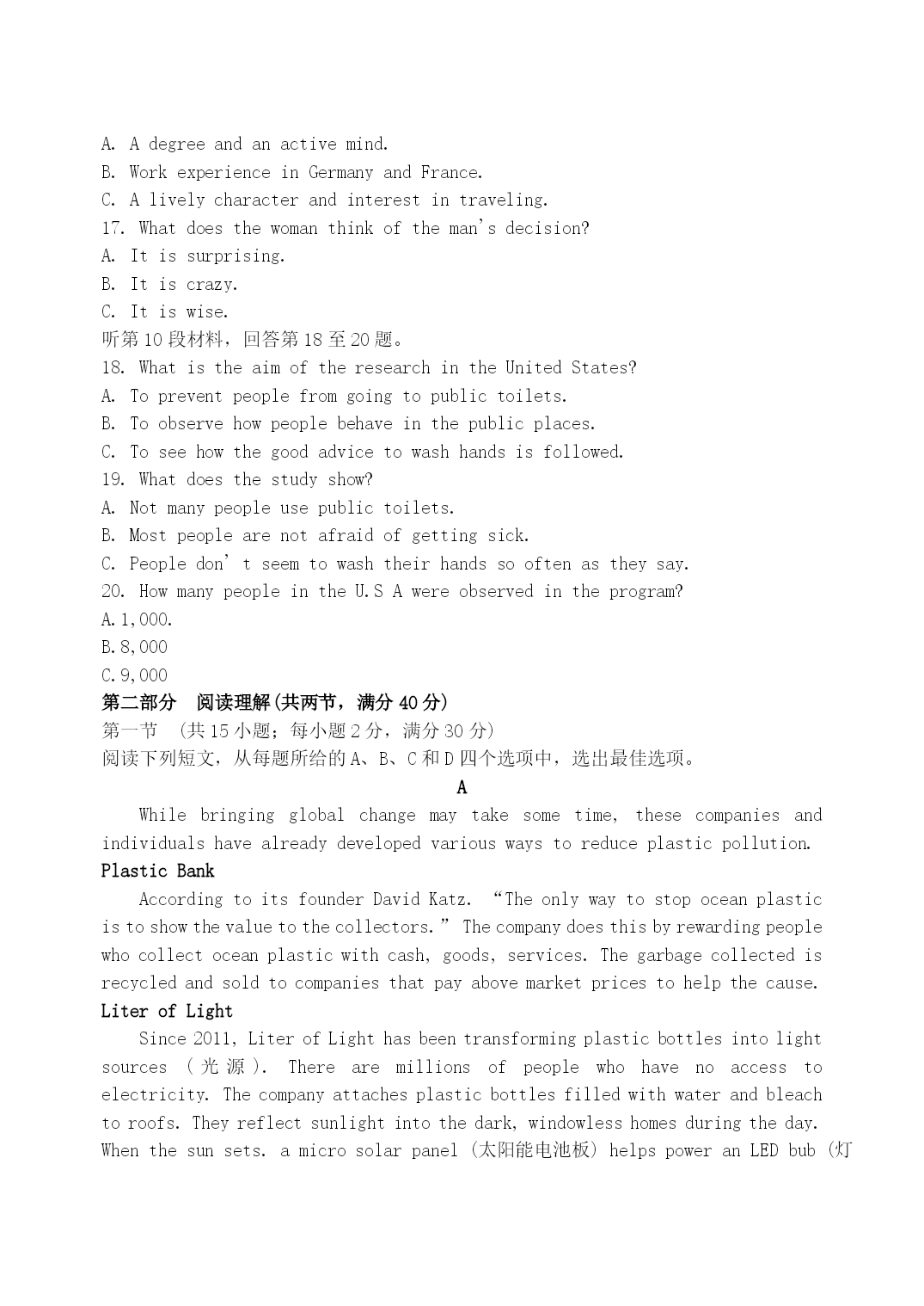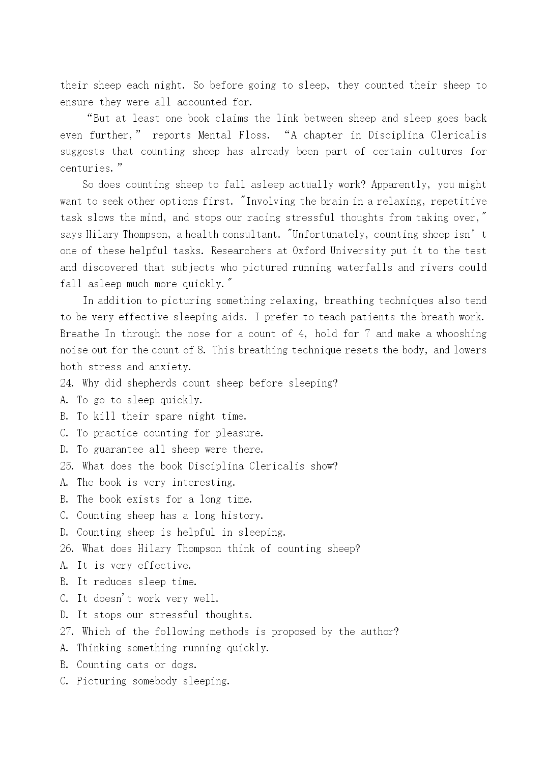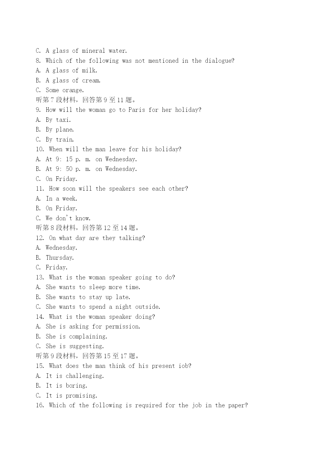 吉林省洮南一中2021届高三英语上学期第三次月考试题 第一部分听力(共两节,满分30分) 第一节,听下面5段对话。每段对话后有一个小题,从题中所给的A、B、C三个选项中选出最佳选项,并标在试卷的相应位置。听完每段对话后,你将有10秒钟的时间来回答有关小题和阅读下一小题。每段对话仅读一遍。 1.WhatarethestudentsaskedtodobeforeTuesday? A.Dosomereading. B.Listentosomeradioprograms. C.TalkabouttheOlympicGames. 2.Wheredoesthisconversationprobablytakeplace? A.Atthegraduationceremony. B.Athome. C.Inacompetition. 3.Whydoestheguestcomplainaboutthefood? A.Thefoodtastedterrible. B.Thefoodcametoolate. C.Itwasnotwhatheordered. 4.Whatdoesthemanseemtoworryaboutmost? A.Pleasingthewoman. B.Thenumberofbedrooms. C.Thepricetofittheirbudget. 5.Whatdoesthemanmean? A.Hewon’tbeabletohelpthewoman. B.Thelibraryisclosedtonight. C.Jeanisusinghiscar. 第二节,听下面5段对话或独白。每段对话或独白后有几个小题,从题中所给的A、B、C三个选项中选最佳选项,并标在试卷的相应位置。听每段对话或独白前,你将有时间阅读各个小题,每小题5秒钟;听完后,各小题将给出5秒钟的作答时间。每段对话或独白读两遍。听第6段材料,回答第6至8题。 6.Whydidthegirlwanttohavedinnerintherestaurant? A.Shewasveryhungryandthirsty. B.Thefoodtherewascheapandtastedgood. C.Thefoodtherewasbetterthantheothers. 7.Whatdidtheboyneedfirst? A.Somethingtoeat. B.Somethingtodrink. C.Aglassofmineralwater. 8.Whichofthefollowingwasnotmentionedinthedialogue? A.Aglassofmilk. B.Aglassofcream. C.Someorange. 听第7段材料,回答第9至11题。 9.HowwillthewomangotoParisforherholiday? A.Bytaxi. B.Byplane. C.Bytrain. 10.Whenwillthemanleaveforhisholiday? A.At9:15p.m.onWednesday. B.At9:50p.m.onWednesday. C.OnFriday. 11.Howsoonwillthespeakersseeeachother? A.Inaweek. B.OnFriday. C.Wedon'tknow. 听第8段材料,回答第12至14题。 12.Onwhatdayaretheytalking? A.Wednesday. Thursday. Friday. 13.Whatisthewomanspeakergoingtodo? A.Shewantstosleepmoretime. B.Shewantstostayuplate. C.Shewantstospendanightoutside. 14.Whatisthewomanspeakerdoing? A.Sheisaskingforpermission. B.Sheiscomplaining. C.Sheissuggesting. 听第9段材料,回答第15至17题。 15.Whatdoesthemanthinkofhispresentiob? A.Itischallenging. B.Itisboring. C.Itispromising. 16.Whichofthefollowingisrequiredforthejobinthepaper? A.Adegreeandanactivemind. B.WorkexperienceinGermanyandFrance. C.Alivelycharacterandinterestintraveling. 17.Whatdoesthe