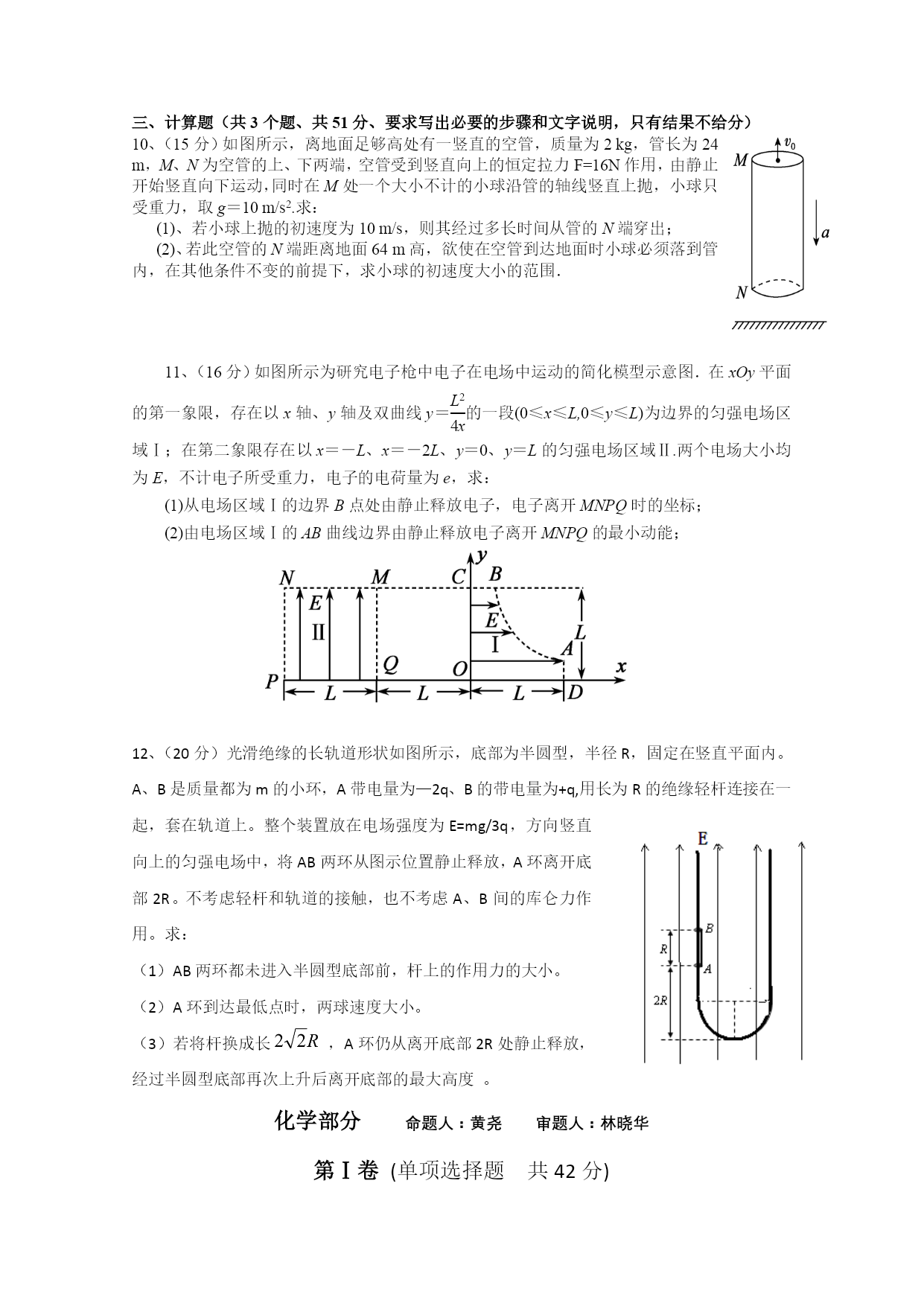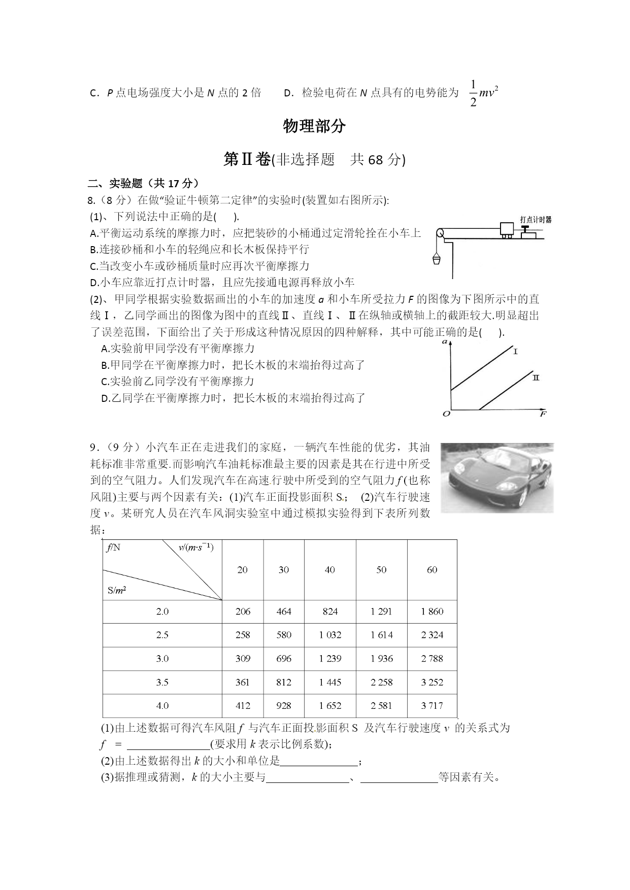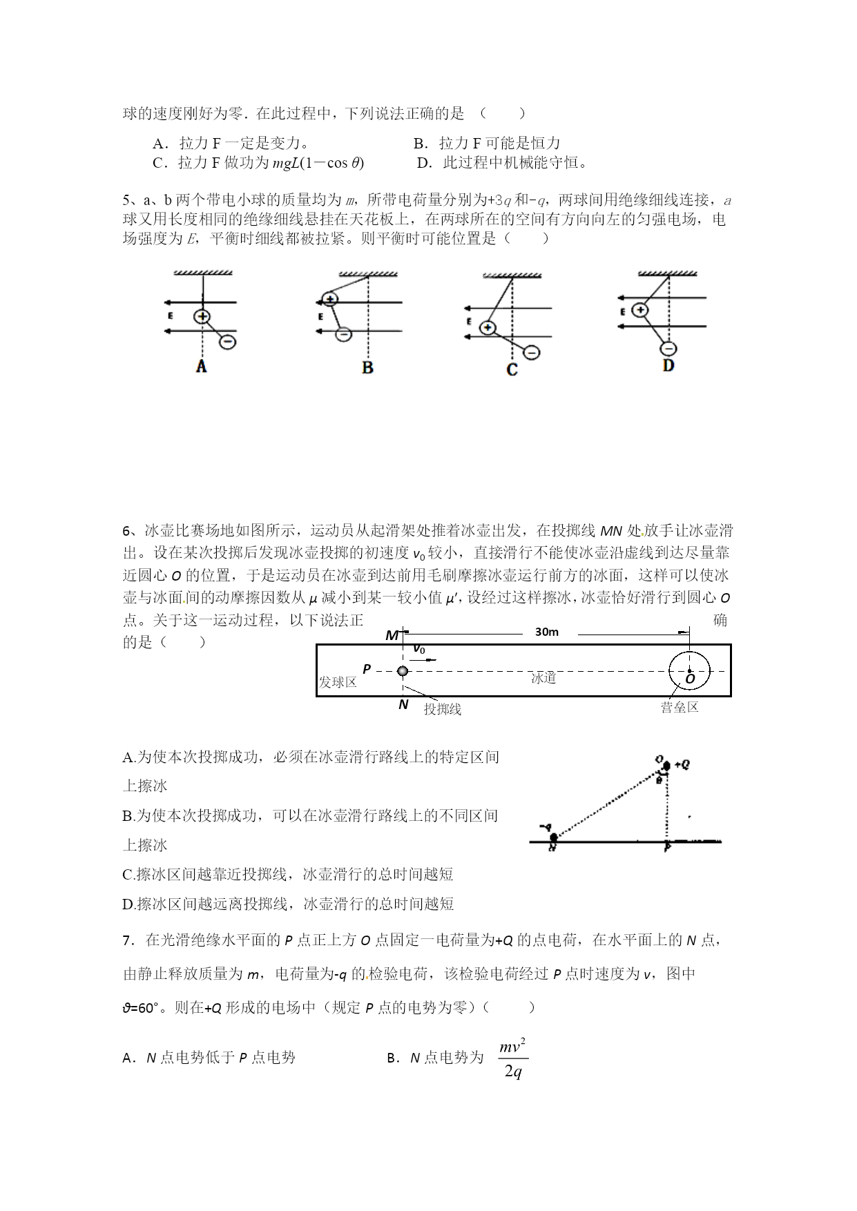 成都外国语学校高2013级高三11月月考试题 理科综合试题 试题分物理、化学、生物三部分。满分300分,考试时间150分钟。 注意事项: 1.答题前,考试务必先认真核对条形码上的姓名,准考证号和座位号,无误后将本人姓名、准考证号和座位号填写在相应位置, 2.答选择题时,必须使用2B铅笔将答题卡上对应题目的答案标号涂黑。如需改动,用橡皮擦干净后,再选涂其它答案标号; 3.答题时,必须使用黑色签字笔,将答案规范、整洁地书写在答题卡规定的位置上; 4.所有题目必须在答题卡上作答,在试题卷上答题无效; 5.考试结束后将答题卡交回,不得折叠、损毁答题卡。 物理部分命题人:王建文审题人:王建文 第Ⅰ卷(选择题共42分) 一、选择题(本题7小题。每小题给出的四个选项中,有的只有一个选项正确,有的有多个选项正确,全部选对的得6分,选对但不全的得3分,有选错的、不选的得0分) 1、关于物体运动状态的改变,下列说法中正确的是() A.运动物体的加速度不变,则其运动状态一定不变 B.物体的位置不断变化,则其运动状态一定在不断变化 C.做直线运动的物体,其运动状态可能不变D.做曲线运动的物体,其运动状态可能不变 2、如图所示,滑板运动员在水平地面上向前滑行,在横杆前相对于滑板竖直向上起跳,人与滑板分离,分别从杆的上、下通过,忽略人和滑板在运动中受到的阻力.则运动员() A.起跳时脚对滑板的作用力斜向后 B.在空中水平方向先加速后减速 C.在空中轨迹为抛物线D.越过杆后仍落在滑板起跳的位置 3、北京时间2012年2月25日凌晨0时12分,中国在西昌卫星发射中心用“长征三号丙”运载火箭,将第十一颗北斗导航卫星成功送人太空轨道。这是一颗地球同步卫星,也是中国2012年发射的首颗北斗导航系统组网卫星。2020年左右,将建成由30余颗卫星组成的北斗卫星导航系统,提供覆盖全球的高精度、高可靠的定位、导航和授时服务。下列关于第十一颗北斗导航卫星说法正确的是() A.运行速度大于7.9km/sB.离地面的高度一定,相对地面静止 C.比月球的角速度大D.与地球赤道上的物体的向心加速度相等 4、如图所示,质量为m的小球用长L的细线悬挂而静止在竖直位置.现用水平拉力F将小球拉到细线与竖直方向成θ角的位置.而且拉到该位置时小球的速度刚好为零.在此过程中,下列说法正确的是() A.拉力F一定是变力。B.拉力F可能是恒力 C.拉力F做功为mgL(1-cosθ)D.此过程中机械能守恒。 5、a、b两个带电小球的质量均为m,所带电荷量分别为+3q和-q,两球间用绝缘细线连接,a球又用长度相同的绝缘细线悬挂在天花板上,在两球所在的空间有方向向左的匀强电场,电场强度为E,平衡时细线都被拉紧。则平衡时可能位置是() 投掷线 营垒区 30m O N M v0 发球区 P 冰道 6、冰壶比赛场地如图所示,运动员从起滑架处推着冰壶出发,在投掷线MN处放手让冰壶滑出。设在某次投掷后发现冰壶投掷的初速度v0较小,直接滑行不能使冰壶沿虚线到达尽量靠近圆心O的位置,于是运动员在冰壶到达前用毛刷摩擦冰壶运行前方的冰面,这样可以使冰壶与冰面间的动摩擦因数从μ减小到某一较小值μ′,设经过这样擦冰,冰壶恰好滑行到圆心O点。关于这一运动过程,以下说法正确的是() A.为使本次投掷成功,必须在冰壶滑行路线上的特定区间上擦冰 B.为使本次投掷成功,可以在冰壶滑行路线上的不同区间上擦冰 C.擦冰区间越靠近投掷线,冰壶滑行的总时间越短 D.擦冰区间越远离投掷线,冰壶滑行的总时间越短 7.在光滑绝缘水平面的P点正上方O点固定一电荷量为+Q的点电荷,在水平面上的N点,由静止释放质量为m,电荷量为-q的检验电荷,该检验电荷经过P点时速度为v,图中θ=60°。则在+Q形成的电场中(规定P点的电势为零)() A.N点电势低于P点电势B.N点电势为 C.P点电场强度大小是N点的2倍D.检验电荷在N点具有的电势能为 物理部分 第Ⅱ卷(非选择题共68分) 二、实验题(共17分) 8.(8分)在做“验证牛顿第二定律”的实验时(装置如右图所示): (1)、下列说法中正确的是(). A.平衡运动系统的摩擦力时,应把装砂的小桶通过定滑轮拴在小车上 B.连接砂桶和小车的轻绳应和长木板保持平行 C.当改变小车或砂桶质量时应再次平衡摩擦力 D.小车应靠近打点计时器,且应先接通电源再释放小车 (2)、甲同学根据实验数据画出的小车的加速度a和小车所受拉力F的图像为下图所示中的直线Ⅰ,乙同学画出的图像为图中的直线Ⅱ、直线Ⅰ、Ⅱ在纵轴或横轴上的截距较大.明显超出了误差范围,下面给出了关于形成这种情况原因的四种解释,其中可能正确的是(). A.实验前甲同学没有平衡摩擦力 B.甲同学在平衡摩擦力时,把长木板的末端抬得过高了