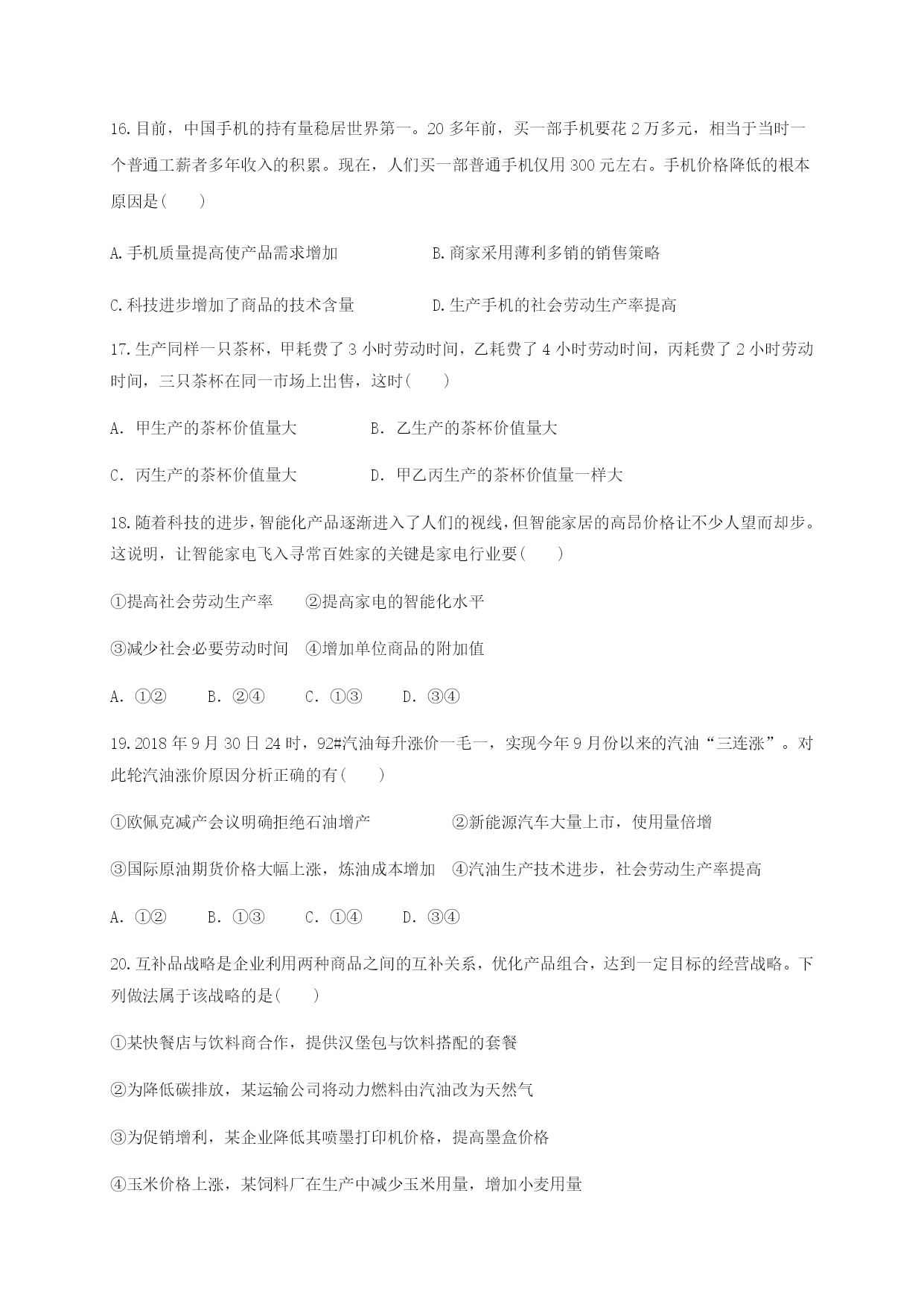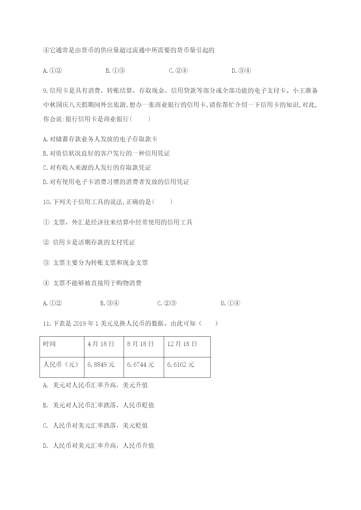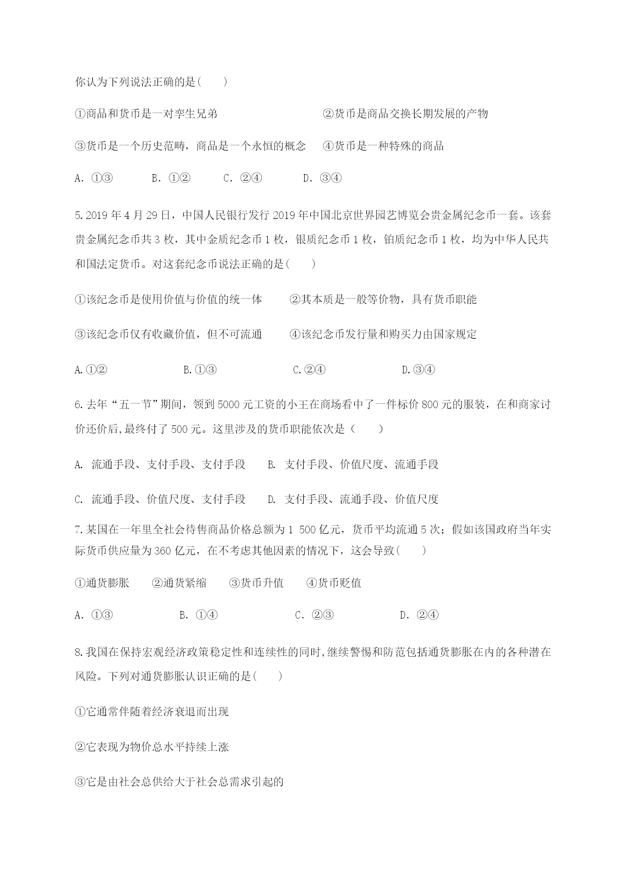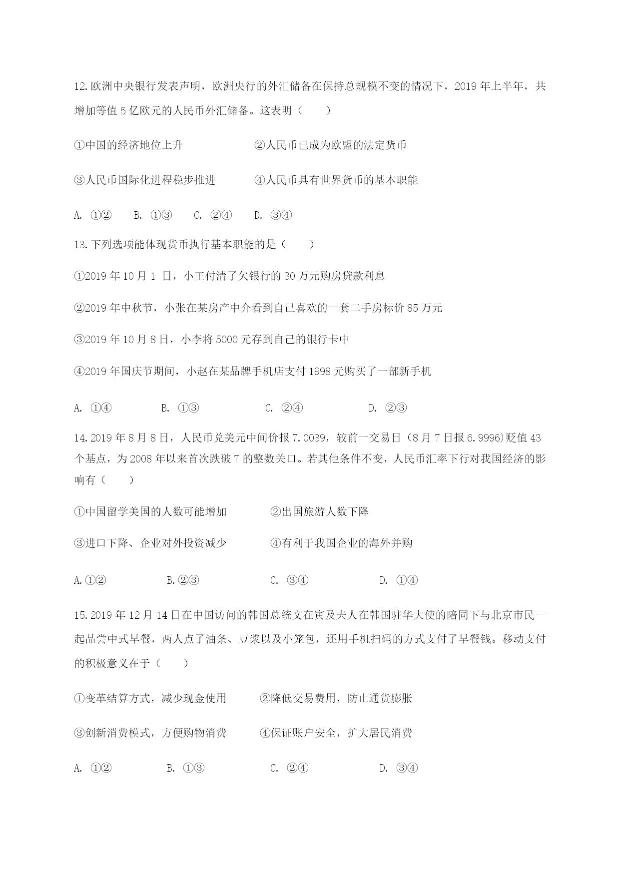 四川省成都外国语学校2020-2021学年高一政治10月月考试题 一、单项选择题(本大题共有30小题,每小题2分,共60分。每题只有一个正确选项) 1.2019年夏季,影片《哪吒之魔童降世》火爆全国,票房收入超过50亿元。作为中国动漫电影里程碑之作,《哪吒之魔童降世》点燃了大众对于中国动漫的关注和希望。该影片() ①是商品,因为它是用于交换的劳动产品 ②没有价值,只有使用价值 ③不是商品,因为它是无形的劳动产品 ④既有使用价值又有价值 A.①② B.②③ C.①④ D.③④ 2.随着华为5G网络在英国成功试水,华为在欧洲市场打响了名气。随后,德国、法国、西班牙相继与华为展开5G合作,毕竟谁也不愿拒绝更好的服务与更低的价格。华为的成功表明() ①消费者总是寻求价值和使用价值的最佳结合点 ②生产者重视商品的使用价值有利于实现商品的价值 ③生产出来的产品只有用于交换才能实现其使用价值 ④只要坚持科技创新就能创造出物美价廉的商品 A.①② B.①③ C.②④ D.③④ 3.2020年初,新型冠状病毒在我国湖北武汉地区爆发,为了遏制新型冠状病毒的进一步传播,在党中央的统一领导和部署之下,湖北地区紧急采取封城举措,为了缓解抗疫物资匮乏的局面,社会各界纷纷伸出援手,向湖北捐款捐物。对捐赠的抗疫物资的表述正确的是() A.不是商品,因为没有用于交换B.不是商品,因为不是劳动产品 C.是商品,因为有使用价值D.是商品,因为是劳动产品 4.在现实生活中,人们生产商品并不是为了自己享用,而是拿到市场上去换货币,然后再用货币去买各种商品,以满足自己生产和生活的需要。货币和商品关系非常密切,总是“形影不离”。对此,你认为下列说法正确的是() ①商品和货币是一对孪生兄弟②货币是商品交换长期发展的产物 ③货币是一个历史范畴,商品是一个永恒的概念④货币是一种特殊的商品 A.①③B.①②C.②④ D.③④ 5.2019年4月29日,中国人民银行发行2019年中国北京世界园艺博览会贵金属纪念币一套。该套贵金属纪念币共3枚,其中金质纪念币1枚,银质纪念币1枚,铂质纪念币1枚,均为中华人民共和国法定货币。对这套纪念币说法正确的是() ①该纪念币是使用价值与价值的统一体②其本质是一般等价物,具有货币职能 ③该纪念币仅有收藏价值,但不可流通④该纪念币发行量和购买力由国家规定 A.①② B.①③ C.②④ D.③④ 6.去年“五一节”期间,领到5000元工资的小王在商场看中了一件标价800元的服装,在和商家讨价还价后,最终付了500元。这里涉及的货币职能依次是() A.流通手段、支付手段、支付手段B.支付手段、价值尺度、流通手段 C.流通手段、价值尺度、支付手段D.支付手段、流通手段、价值尺度 7.某国在一年里全社会待售商品价格总额为1500亿元,货币平均流通5次;假如该国政府当年实际货币供应量为360亿元,在不考虑其他因素的情况下,这会导致() ①通货膨胀②通货紧缩③货币升值④货币贬值 A.①③B.①④C.②③D.②④ 8.我国在保持宏观经济政策稳定性和连续性的同时,继续警惕和防范包括通货膨胀在内的各种潜在风险。下列对通货膨胀认识正确的是() ①它通常伴随着经济衰退而出现 ②它表现为物价总水平持续上涨 ③它是由社会总供给大于社会总需求引起的 ④它通常是由货币的供应量超过流通中所需要的货币量引起的 A.①② B.①③ C.②④ D.③④ 9.信用卡是具有消费、转账结算、存取现金、信用贷款等部分或全部功能的电子支付卡。小王准备中秋国庆八天假期间外出旅游,想办一张商业银行的信用卡,请你帮忙介绍一下信用卡的知识,对此,你会说:银行信用卡是商业银行() A.对储蓄存款业务人发放的电子存取款卡 B.对资信状况良好的客户发行的一种信用凭证 C.对有收入来源的人发行的存取款凭证 D.对有使用电子卡消费习惯的消费者发放的信用凭证 10.下列关于信用工具的说法,正确的是() ①支票、外汇是经济往来结算中经常使用的信用工具 ②信用卡是活期存款的支付凭证 ③支票主要分为转账支票和现金支票 ④支票不能够被直接用于购物消费 A.①②B.③④C.②③D.①④ 11.下表是2019年1美元兑换人民币的数据。由此可知() 时间4月18日8月18日12月18日人民币(元)6.8849元6.6744元6.6162元美元对人民币汇率升高,美元升值 B.美元对人民币汇率跌落,人民币贬值 C.人民币对美元汇率跌落,美元贬值 D.人民币对美元汇率升高,人民币升值 12.欧洲中央银行发表声明,欧洲央行的外汇储备在保持总规模不变的情况下,2019年上半年,共增加等值5亿欧元的人民币外汇储备。这表明() ①中国的经济地位上升②人民币已成为欧盟的法定货币 ③人民币国际化进程稳步推进④人民币具有世界货币的基本职能 A.①②B