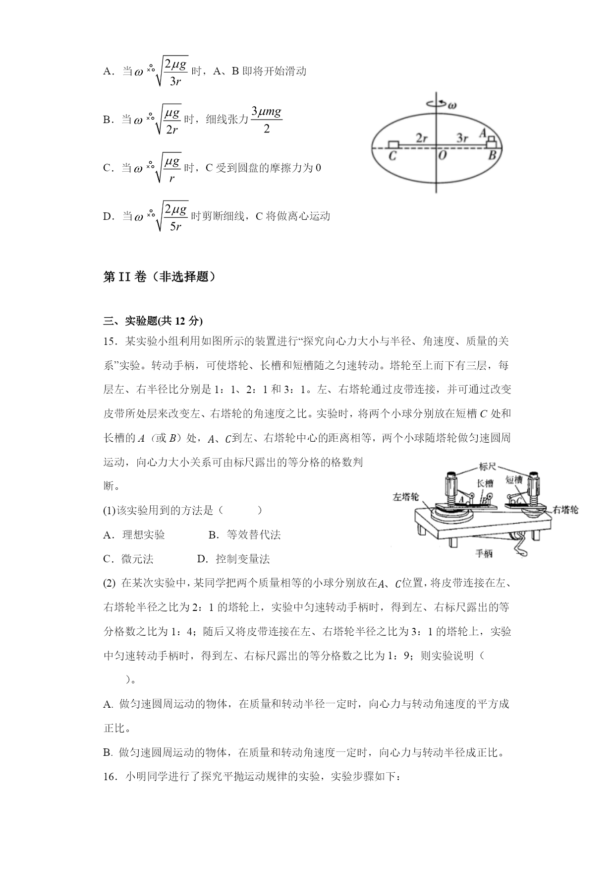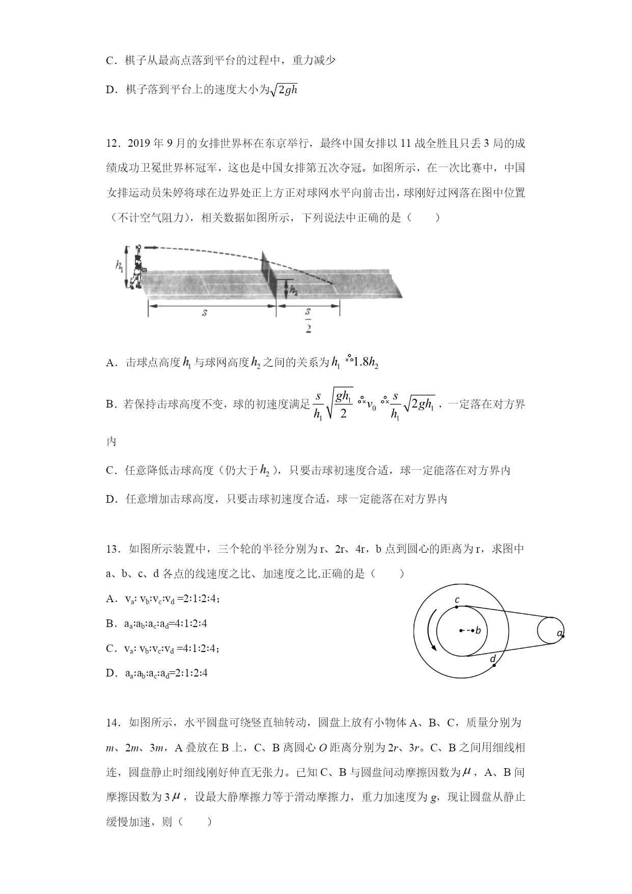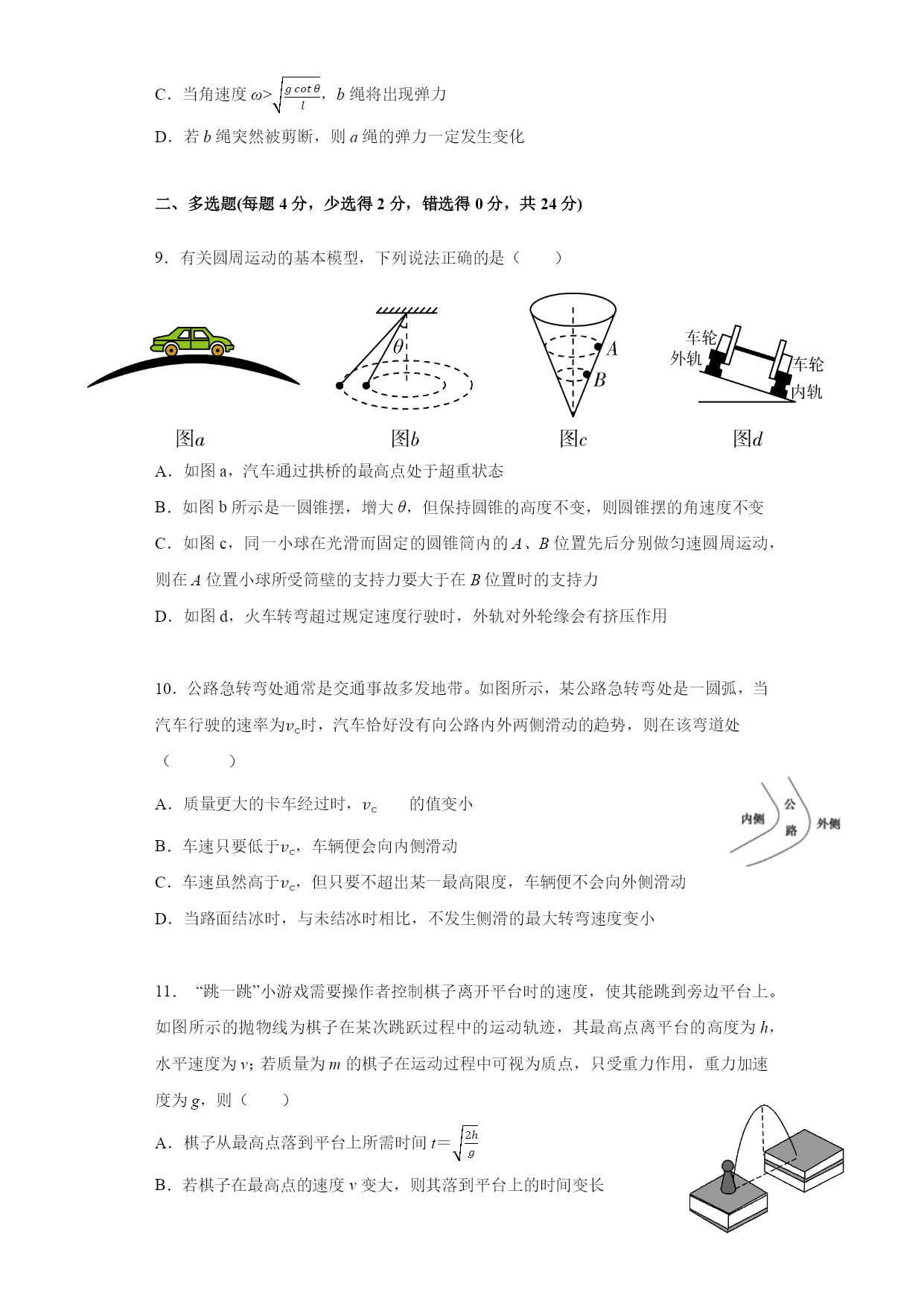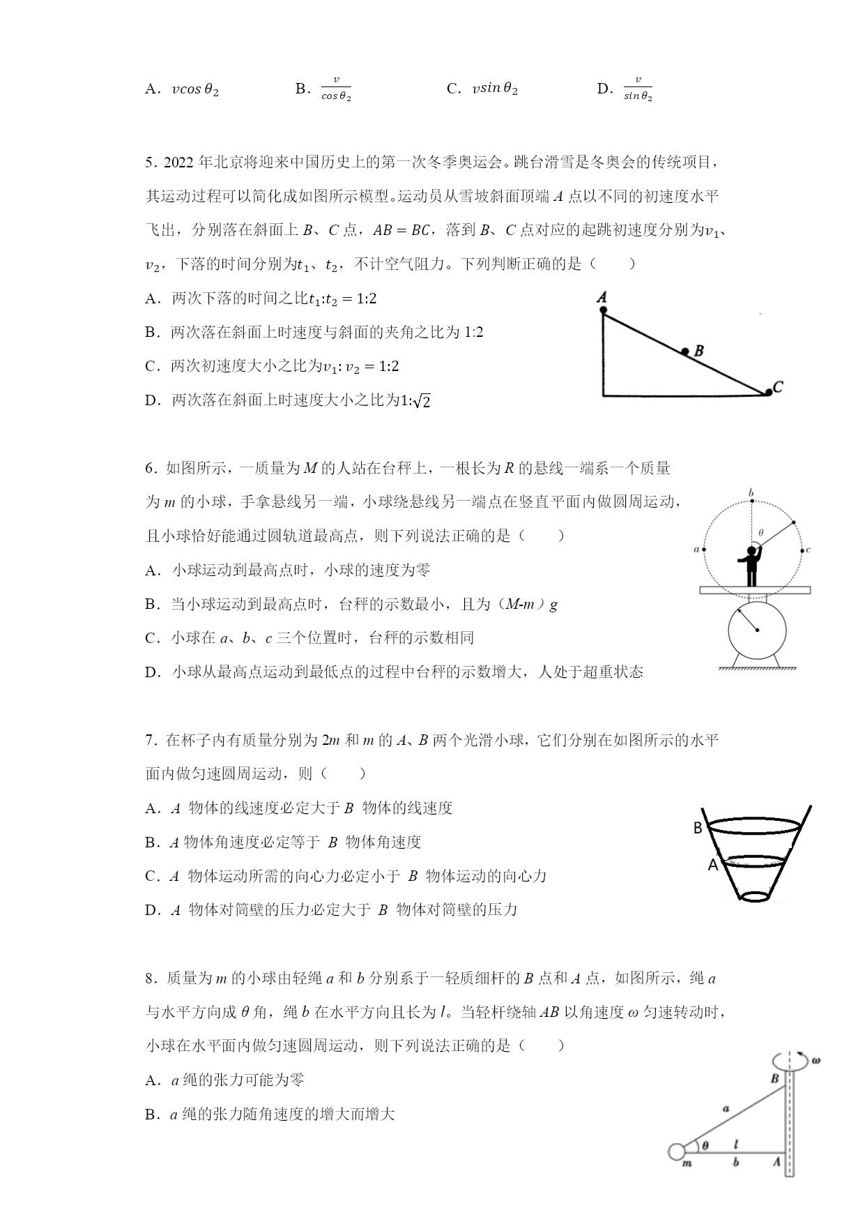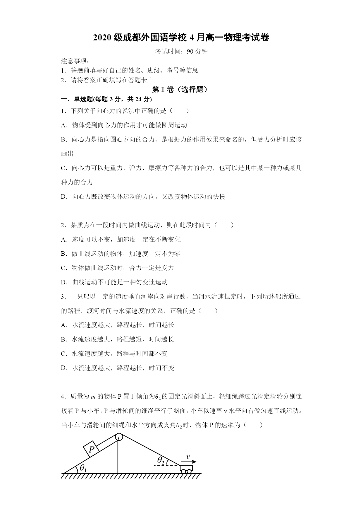 2020级成都外国语学校4月高一物理考试卷 考试时间:90分钟 注意事项: 1.答题前填写好自己的姓名、班级、考号等信息 2.请将答案正确填写在答题卡上 第I卷(选择题) 一、单选题(每题3分,共24分) 1.下列关于向心力的说法中正确的是() A.物体受到向心力的作用才可能做圆周运动 B.向心力是指向圆心方向的合力,是根据力的作用效果来命名的,但受力分析时应该画出 C.向心力可以是重力、弹力、摩擦力等各种力的合力,也可以是其中某一种力或某几种力的合力 D.向心力既改变物体运动的方向,又改变物体运动的快慢 2.某质点在一段时间内做曲线运动,则在此段时间内() A.速度可以不变,加速度一定在不断变化 B.做曲线运动的物体,加速度一定不为零 C.物体做曲线运动时,合力一定是变力 D.曲线运动不可能是一种匀变速运动 3.一只船以一定的速度垂直河岸向对岸行驶,当河水流速恒定时,下列所述船所通过的路程、渡河时间与水流速度的关系,正确的是() A.水流速度越大,路程越长,时间越长 B.水流速度越大,路程越短,时间越长 C.水流速度越大,路程与时间都不变 D.水流速度越大,路程越长,时间不变 4.质量为m的物体P置于倾角为θ1的固定光滑斜面上,轻细绳跨过光滑定滑轮分别连接着P与小车,P与滑轮间的细绳平行于斜面,小车以速率v水平向右做匀速直线运动。当小车与滑轮间的细绳和水平方向成夹角θ2时,物体P的速率为() A.vcosθ2 B.vcosθ2 C.vsinθ2 D.vsinθ2 5.2022年北京将迎来中国历史上的第一次冬季奥运会。跳台滑雪是冬奥会的传统项目,其运动过程可以简化成如图所示模型。运动员从雪坡斜面顶端A点以不同的初速度水平飞出,分别落在斜面上B、C点,AB=BC,落到B、C点对应的起跳初速度分别为v1、v2,下落的时间分别为t1、t2,不计空气阻力。下列判断正确的是() A.两次下落的时间之比t1:t2=1:2 B.两次落在斜面上时速度与斜面的夹角之比为1:2 C.两次初速度大小之比为v1:v2=1:2 D.两次落在斜面上时速度大小之比为1:2 6.如图所示,一质量为M的人站在台秤上,一根长为R的悬线一端系一个质量为m的小球,手拿悬线另一端,小球绕悬线另一端点在竖直平面内做圆周运动,且小球恰好能通过圆轨道最高点,则下列说法正确的是() A.小球运动到最高点时,小球的速度为零 B.当小球运动到最高点时,台秤的示数最小,且为(M-m)g C.小球在a、b、c三个位置时,台秤的示数相同 D.小球从最高点运动到最低点的过程中台秤的示数增大,人处于超重状态 7.在杯子内有质量分别为2m和m的A、B两个光滑小球,它们分别在如图所示的水平面内做匀速圆周运动,则() A.A物体的线速度必定大于B物体的线速度 B.A物体角速度必定等于B物体角速度 C.A物体运动所需的向心力必定小于B物体运动的向心力 D.A物体对筒壁的压力必定大于B物体对筒壁的压力 8.质量为m的小球由轻绳a和b分别系于一轻质细杆的B点和A点,如图所示,绳a与水平方向成θ角,绳b在水平方向且长为l。当轻杆绕轴AB以角速度ω匀速转动时,小球在水平面内做匀速圆周运动,则下列说法正确的是() A.a绳的张力可能为零 B.a绳的张力随角速度的增大而增大 C.当角速度ω>gcotθl,b绳将出现弹力 D.若b绳突然被剪断,则a绳的弹力一定发生变化 二、多选题(每题4分,少选得2分,错选得0分,共24分) 9.有关圆周运动的基本模型,下列说法正确的是() A.如图a,汽车通过拱桥的最高点处于超重状态 B.如图b所示是一圆锥摆,增大θ,但保持圆锥的高度不变,则圆锥摆的角速度不变 C.如图c,同一小球在光滑而固定的圆锥筒内的A、B位置先后分别做匀速圆周运动,则在A位置小球所受筒壁的支持力要大于在B位置时的支持力 D.如图d,火车转弯超过规定速度行驶时,外轨对外轮缘会有挤压作用 10.公路急转弯处通常是交通事故多发地带。如图所示,某公路急转弯处是一圆弧,当汽车行驶的速率为vc时,汽车恰好没有向公路内外两侧滑动的趋势,则在该弯道处() A.质量更大的卡车经过时,vc的值变小 B.车速只要低于vc,车辆便会向内侧滑动 C.车速虽然高于vc,但只要不超出某一最高限度,车辆便不会向外侧滑动 D.当路面结冰时,与未结冰时相比,不发生侧滑的最大转弯速度变小 11.“跳一跳”小游戏需要操作者控制棋子离开平台时的速度,使其能跳到旁边平台上。如图所示的抛物线为棋子在某次跳跃过程中的运动轨迹,其最高点离平台的高度为h,水平速度为v;若质量为m的棋子在运动过程中可视为质点,只受重力作用,重力加速度为g,则() A.棋子从最高点落到平台上所需时间t=2ℎg B.若棋子在最高点的速度v变大,则其落到平
