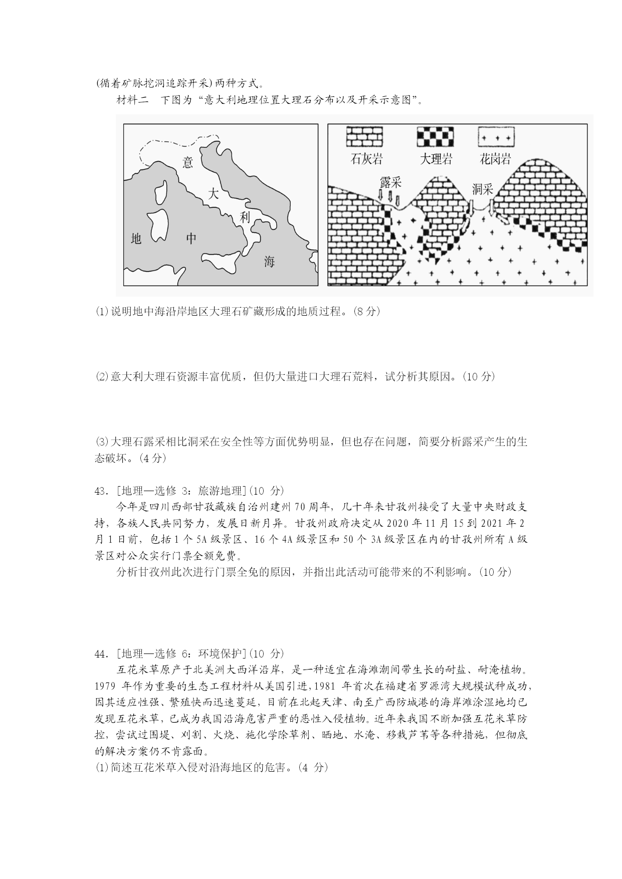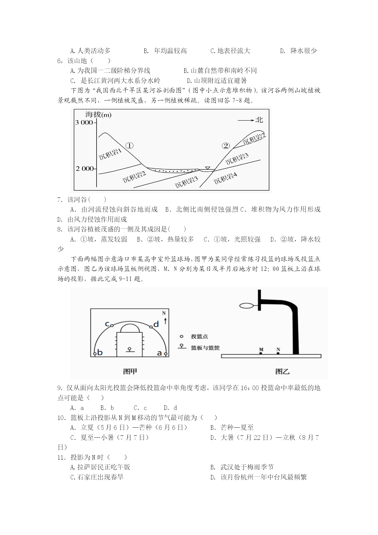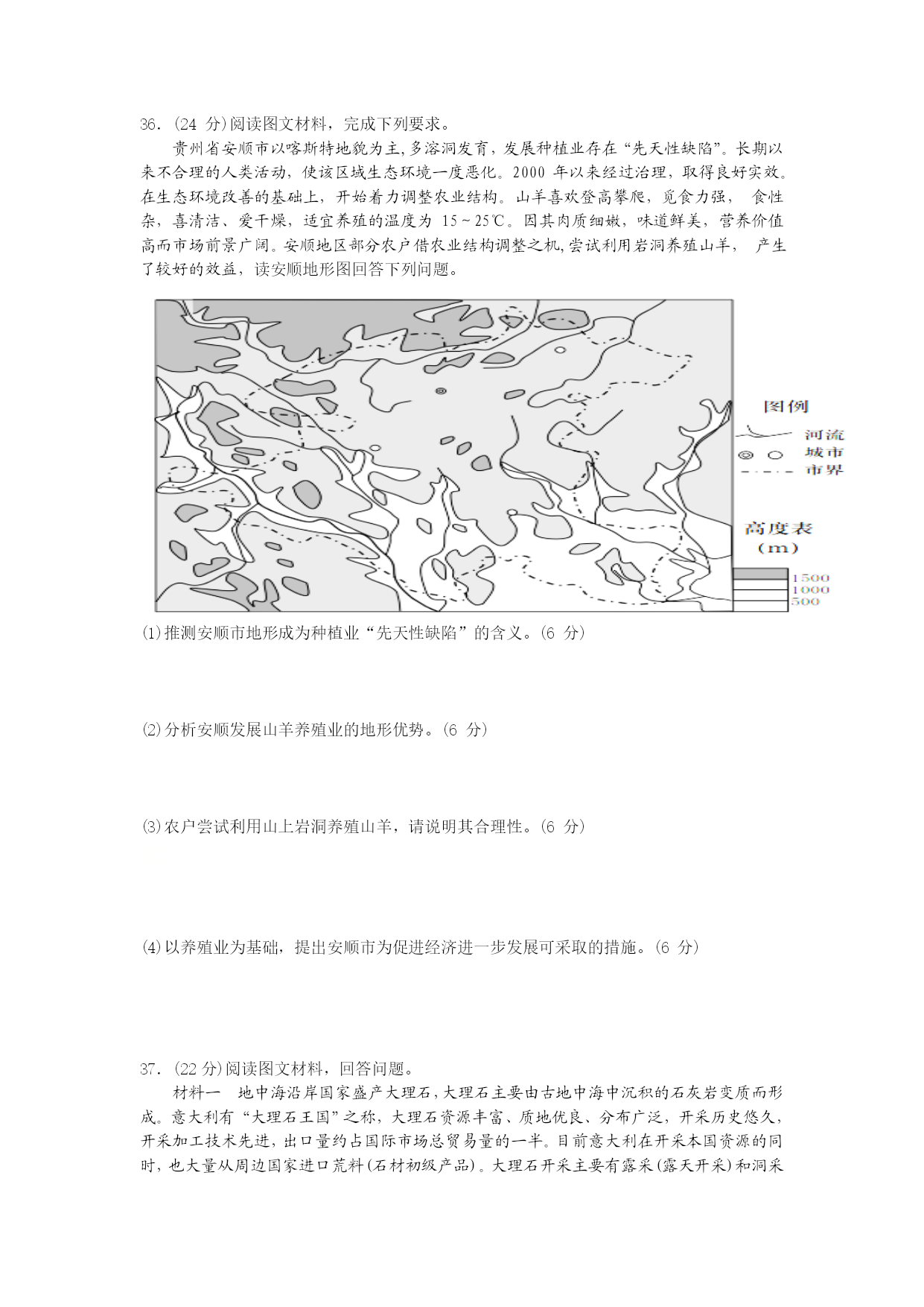 复杂多样的地理环境孕育了我国丰富多彩的民族文化。“垦山而种、地瘠则去之”,“藏彝走廊”是众多民族或族群南来北往、频繁迁徙流动的场所。藏、羌、傈僳、怒、彝、纳西等民族的传统民居——木楞房(完全是由木头进行拼接搭建的,外部墙壁是由一根根木料横排叠加垒起,每根木料所刻字均不同)。图左为“藏彝走廊”位置示意图,图右为木楞房外部墙壁局部示意图。据此回答1-3题。 1.“藏彝走廊”村落规模普遍偏小(如怒族的村落最大者在150户左右,小的只有几户,单家独户者也不少),原因主要是() A.便于营造亲近自然的居住环境 B.少数民族人口少,土地资源丰富 C.海拔高,气候不适宜居住 D.土地贫瘠、可耕地少 2.跟我国大多数民居坐北朝南不同,怒族民居的门多向东方、上方或雄伟的山峰,最合理的解释是() A.这些方位在怒族文化中有特殊寓意 B.有利于调控室内的温度和湿度 C.受地形影响 D.主要是为了便于出入 3.关于右图中屋壁圆木上的字,说法正确的是() A.用于记录一年重要的祭祀节日 B.用于记录一年重要的生产活动 C.可能是该名族的某种信仰 D.方便迁徙时进行拆装 蓄水能力是评价土壤水源涵养、调节水循环能力的主要指标之一。林地土壤蓄洪作用主要反映在毛管孔隙水的贮存能力上。饱和持水量是指土壤孔隙全部充满水分时的最大含水量。土壤持水量饱和后会产生地表和地下径流。下表为四川盆地东部海拔350米~951米某山不同林地土壤孔隙度和持水性资料。据此,回答第4-6题。 林地类型孔隙度(%)有机质含量(%)饱和持水量 (吨公顷)总孔隙非毛管孔毛管孔针阔混交林5914454.62503常绿阔叶林6316473.18648楠竹林5212402.08312灌木林7317567.7918334.产生径流所需时间最长的林 地类型是() A.针阔混交林 B.楠竹林 C.灌木林 D.常绿阔叶林 5.当地灌木林有机质和腐殖质 含量高,与其关联度相对 较大的是() A.人类活动多B.年均温较高C.地表径流大D.降水很少 6,该山地() A.为我国一二级阶梯分界线B.山麓自然带和南岭不同 C.是长江黄河两大水系分水岭D.山顶附近适宜避暑 下图为“我国西北干旱区某河谷剖面图”(图中小点示意堆积物)。该河谷两侧山坡植被景观截然不同,一侧植被茂盛,另一侧植被稀疏。读图回答7-8题。 7.该河谷() A.由河流侵蚀向斜谷地而成B.北侧比南侧侵蚀强烈C.堆积物为风力作用形成D.由风力侵蚀作用而成 8.该河谷植被茂盛的一侧及其成因是() A.①坡,蒸发较弱B.②坡,热量较多C.①坡,光照较强D.②坡,降水较少 下面两幅图示意海口市某高中室外篮球场,图甲为某同学经常练习投篮的球场及投篮点示意图,图乙为该球场篮板侧视图,M、N分别为某日及半月后地方时12:00篮板上沿在球场的投影,据此完成9-11题。 9.仅从面向太阳光投篮会降低投篮命中率角度考虑,该同学在16:00投篮命中率最低的地点可能是() A.a B.b C.c D.d 10.篮板上沿投影从N到M移动的节气最可能为() A.立夏(5月6日)—芒种(6月6日) B.芒种—夏至 C.夏至—小暑(7月7日) D.大暑(7月22日)—立秋(8月7日) 11.投影为N时() A.拉萨居民正吃午饭B.武汉处于梅雨季节 C.石家庄出现春旱D.该月份杭州一年中台风最频繁 36.(24分)阅读图文材料,完成下列要求。 贵州省安顺市以喀斯特地貌为主,多溶洞发育,发展种植业存在“先天性缺陷”。长期以来不合理的人类活动,使该区域生态环境一度恶化。2000年以来经过治理,取得良好实效。在生态环境改善的基础上,开始着力调整农业结构。山羊喜欢登高攀爬,觅食力强,食性杂,喜清洁、爱干燥,适宜养殖的温度为15~25℃。因其肉质细嫩,味道鲜美,营养价值高而市场前景广阔。安顺地区部分农户借农业结构调整之机,尝试利用岩洞养殖山羊,产生了较好的效益,读安顺地形图回答下列问题。 (1)推测安顺市地形成为种植业“先天性缺陷”的含义。(6分) (2)分析安顺发展山羊养殖业的地形优势。(6分) (3)农户尝试利用山上岩洞养殖山羊,请说明其合理性。(6分) (4)以养殖业为基础,提出安顺市为促进经济进一步发展可采取的措施。(6分) 37.(22分)阅读图文材料,回答问题。 材料一地中海沿岸国家盛产大理石,大理石主要由古地中海中沉积的石灰岩变质而形成。意大利有“大理石王国”之称,大理石资源丰富、质地优良、分布广泛,开采历史悠久,开采加工技术先进,出口量约占国际市场总贸易量的一半。目前意大利在开采本国资源的同时,也大量从周边国家进口荒料(石材初级产品)。大理石开采主要有露采(露天开采)和洞采(循着矿脉挖洞追踪开采)两种方式。 材料二下图为“意大利地理位置大理石