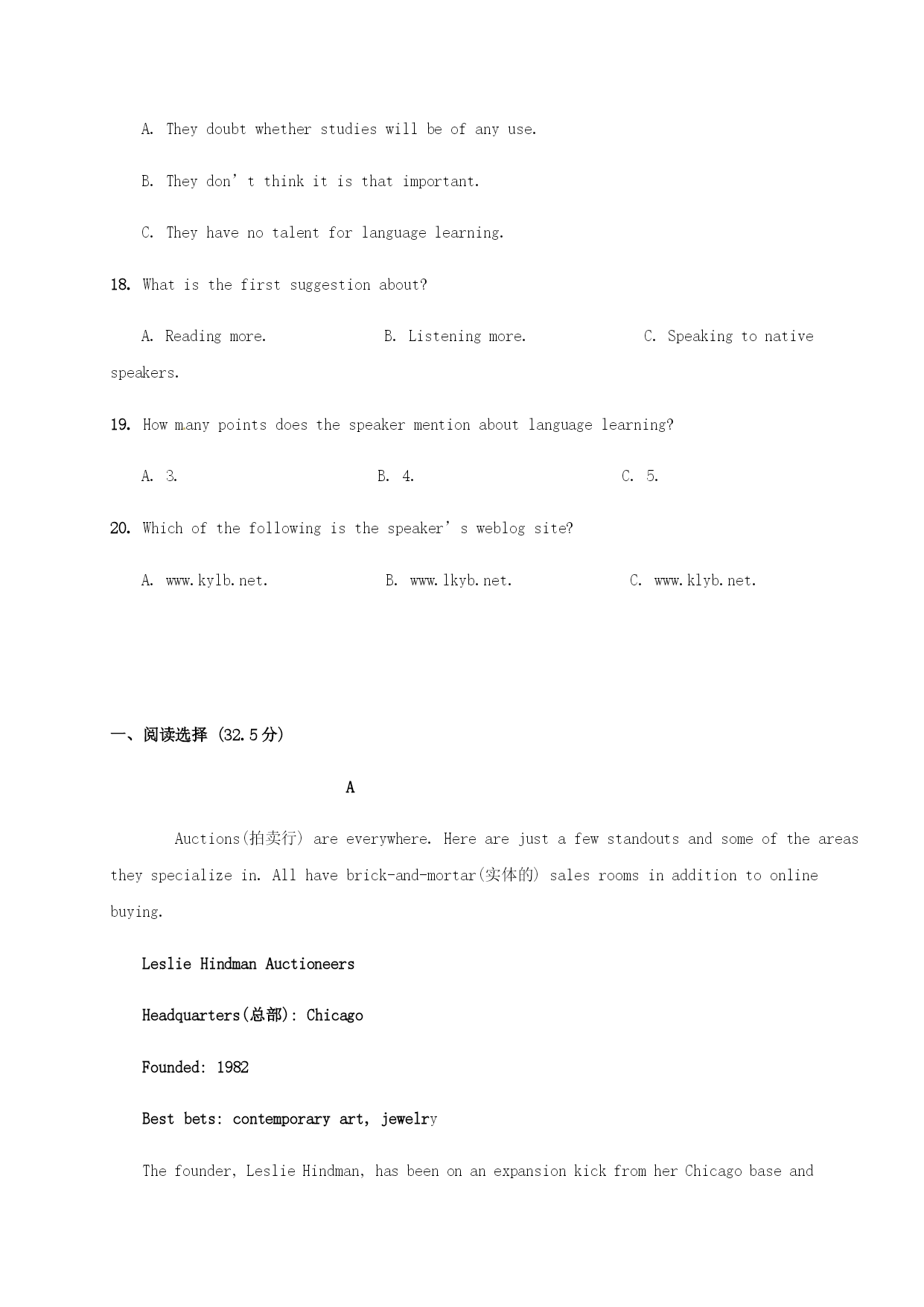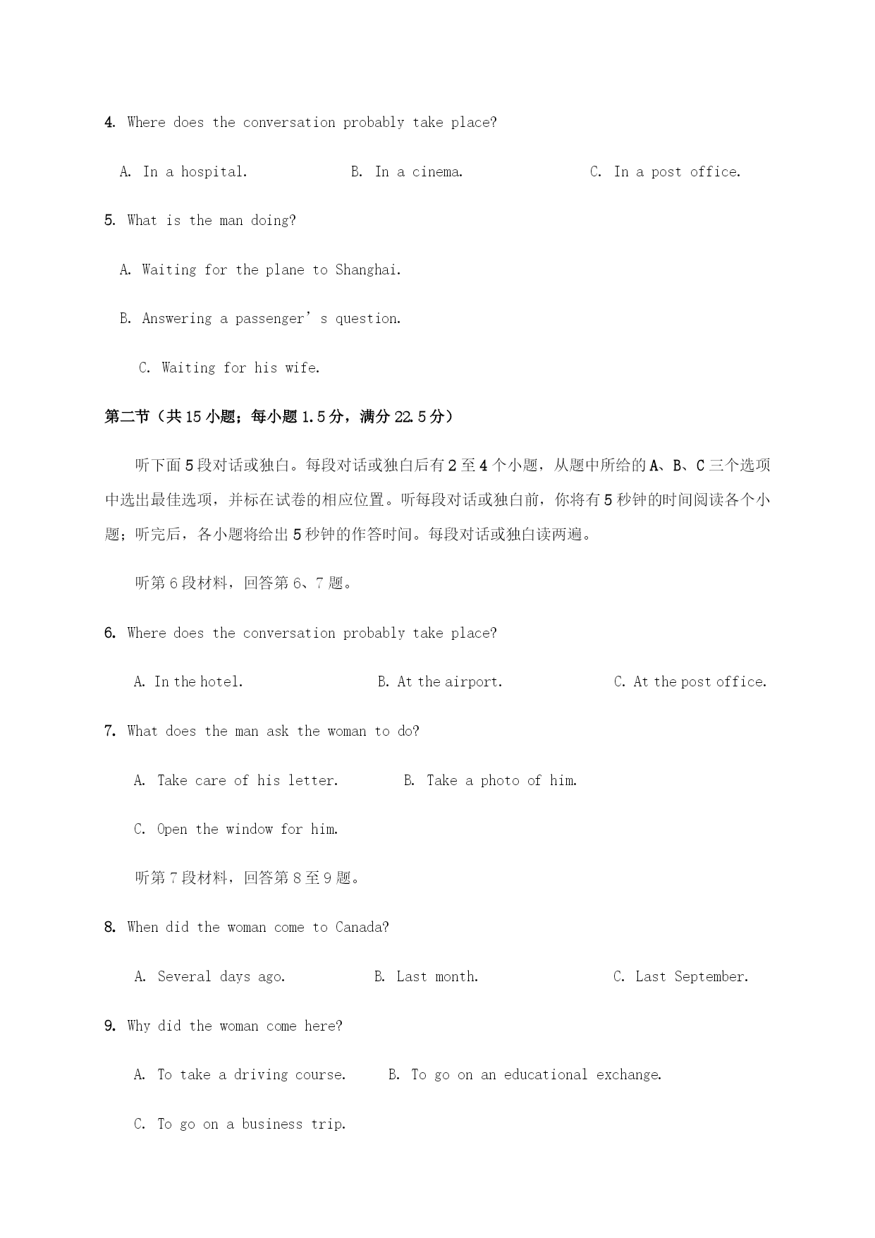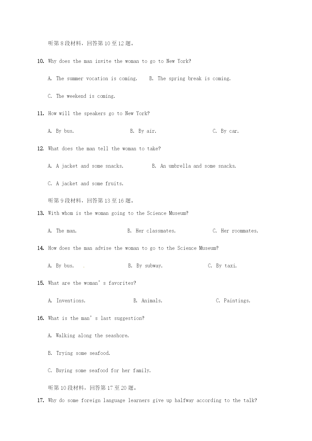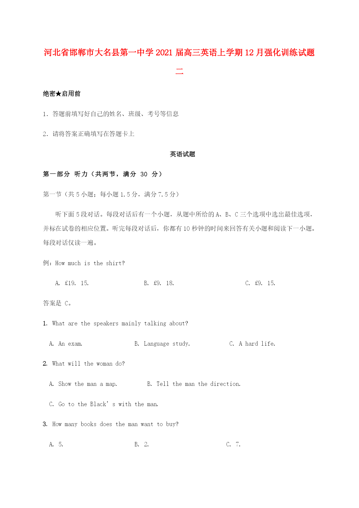 河北省邯郸市大名县第一中学2021届高三英语上学期12月强化训练试题二 绝密★启用前 1.答题前填写好自己的姓名、班级、考号等信息 2.请将答案正确填写在答题卡上 英语试题 第一部分听力(共两节,满分30分) 第一节(共5小题;每小题1.5分,满分7.5分) 听下面5段对话。每段对话后有一个小题,从题中所给的A、B、C三个选项中选出最佳选项,并标在试卷的相应位置。听完每段对话后,你都有10秒钟的时间来回答有关小题和阅读下一小题。每段对话仅读一遍。 例:Howmuchistheshirt? A.£19.15. B.£9.18. C.£9.15. 答案是C。 1.Whatarethespeakersmainlytalkingabout? A.Anexam.B.Languagestudy.C.Ahardlife. 2.Whatwillthewomando? A.Showthemanamap.B.Tellthemanthedirection. C.GototheBlack’swiththeman. 3.Howmanybooksdoesthemanwanttobuy? A.5.B.2.C.7. 4.Wheredoestheconversationprobablytakeplace? A.Inahospital.B.Inacinema.C.Inapostoffice. 5.Whatisthemandoing? A.WaitingfortheplanetoShanghai. B.Answeringapassenger’squestion. C.Waitingforhiswife. 第二节(共15小题;每小题1.5分,满分22.5分) 听下面5段对话或独白。每段对话或独白后有2至4个小题,从题中所给的A、B、C三个选项中选出最佳选项,并标在试卷的相应位置。听每段对话或独白前,你将有5秒钟的时间阅读各个小题;听完后,各小题将给出5秒钟的作答时间。每段对话或独白读两遍。 听第6段材料,回答第6、7题。 6.Wheredoestheconversationprobablytakeplace? A.Inthehotel.B.Attheairport.C.Atthepostoffice. 7.Whatdoesthemanaskthewomantodo? A.Takecareofhisletter.B.Takeaphotoofhim. C.Openthewindowforhim. 听第7段材料,回答第8至9题。 8.WhendidthewomancometoCanada? A.Severaldaysago.B.Lastmonth.C.LastSeptember. 9.Whydidthewomancomehere? A.Totakeadrivingcourse.B.Togoonaneducationalexchange. C.Togoonabusinesstrip. 听第8段材料,回答第10至12题。 10.WhydoesthemaninvitethewomantogotoNewYork? A.Thesummervocationiscoming.B.Thespringbreakiscoming. C.Theweekendiscoming. 11.HowwillthespeakersgotoNewYork? A.Bybus.B.Byair.C.Bycar. 12.Whatdoesthemantellthewomantotake? A.Ajacketandsomesnacks.B.Anumbrellaandsomesnacks. C.Ajacketandsomefruits. 听第9段材料,回答第13至16题。 13.WithwhomisthewomangoingtotheScienceMuseum? A.Theman.B.Herclassmates.C.Herroommates. 14.HowdoesthemanadvisethewomantogototheScienceMuseum? A.Bybus.B.Bysubway.C.Bytaxi. 15.Whatarethewoman’sfavorites? A.Inventions.B.Animals.C.Paintings. 16.Whatistheman’slastsuggestion? A.Walkingalongtheseashore. B.Tryingsomeseafood. C.Buyingsomeseafoodforherfamily. 听第10段材料,回答第17至20题。 17.Whydosomeforeignlanguagelearnersgiveuphalfwayaccor