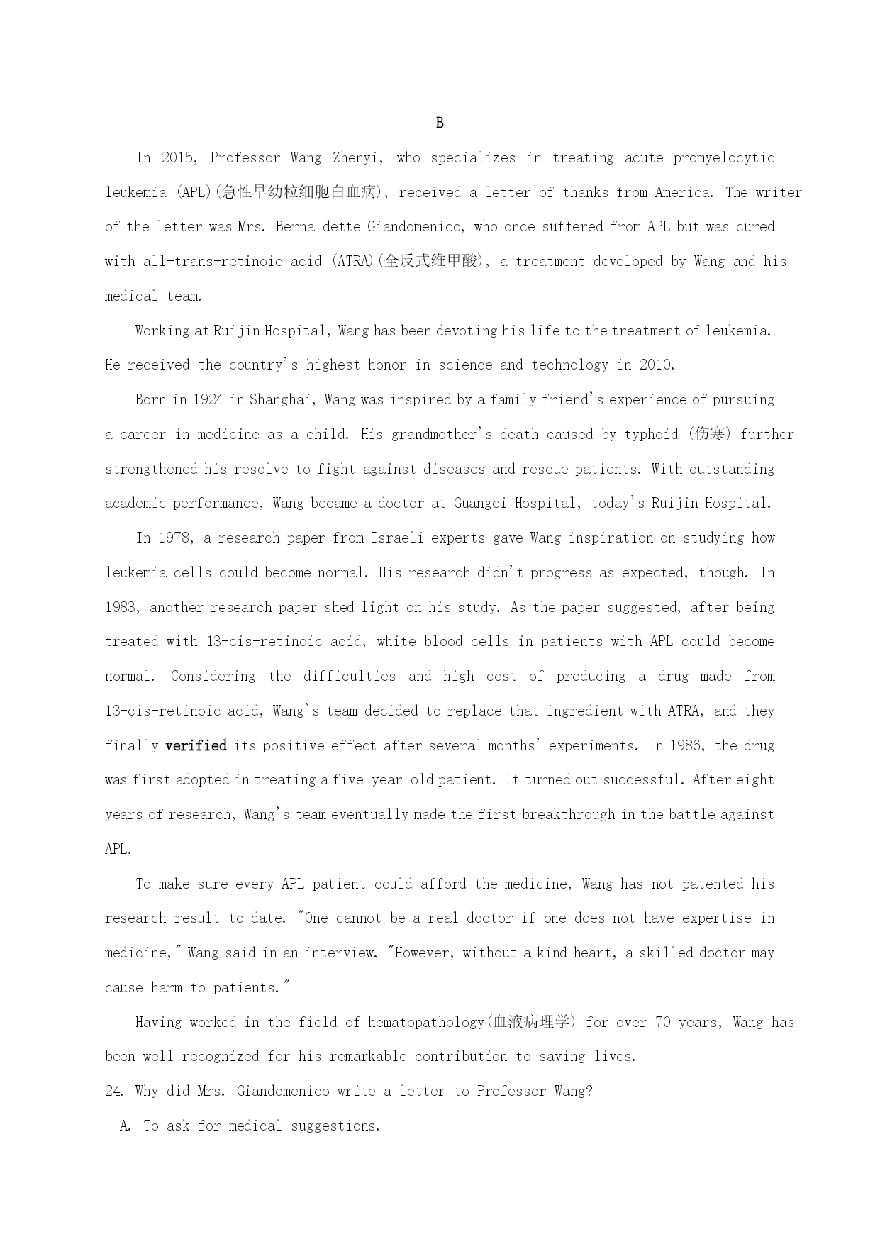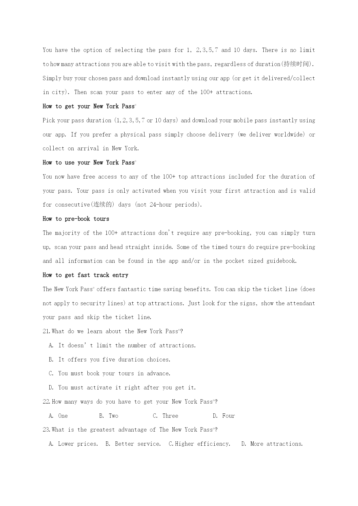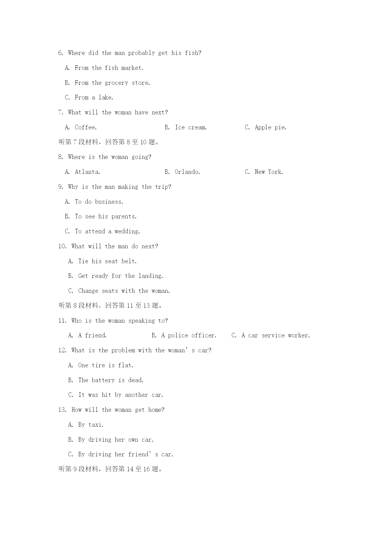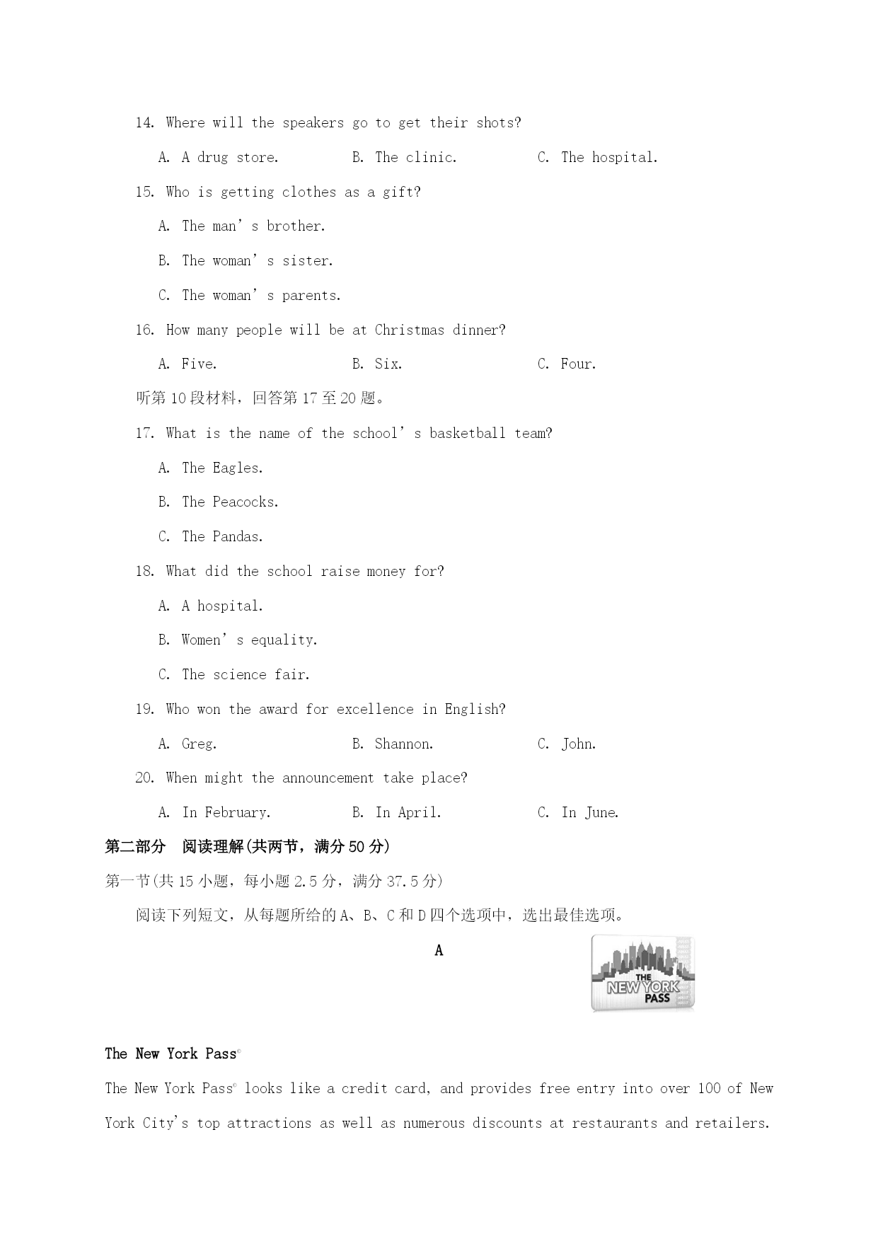 福建省福州市八县(市)一中2021届高三英语上学期期中联考试题 考试日期:11月13日完卷时间:120分钟满分:150分 第一部分听力(共两节,满分30分) 做题时,先将答案标在试卷上。录音内容结束后,你将有两分钟的时间将试卷上的答案转涂到答题卡上。 第一节(共5小题;每题1.5分,满分7.5分) 听下面5段对话。每段对话后有一个小题,从题中所给的A、B、C三个选项中选出最佳选项。听完每段对话后,你都有10秒钟的时间来回答有关小题和阅读下一小题。每段对话仅读一遍。 1.Whatdoesthemanaskthewomantodo? A.Lendhimabook. B.Returnabooktothelibrary. C.Showhimthewaytothelibrary. 2.WhichsectionisHarryreading? A.Thenews. B.Thesports. C.Thejob. 3.Wheremightthewomanbe? A.Onthestairs. B.Inalift. C.Atthefrontdoor. 4.Whatarethespeakersdoing? A.Settingthetable. B.Eatinginarestaurant. C.Shoppingforkitchenthings. 5.Whatisthemaintopicoftheconversation? A.Teachers. B.Universities. C.Grades. 第二节(共15小题;每题1.5分,满分22.5分) 听下面5段对话或独白。每段对话或独白后有几个小题,从题中所给的A、B、C三个选项中选出最佳选项。听每段对话或独白前,你将有时间阅读各个小题,每小题5秒钟;听完后,各小题将给出5秒钟的作答时间。每段对话或独白读两遍。 听第6段材料,回答第6、7题。 6.Wheredidthemanprobablygethisfish? A.Fromthefishmarket. B.Fromthegrocerystore. C.Fromalake. 7.Whatwillthewomanhavenext? A.Coffee. B.Icecream. C.Applepie. 听第7段材料,回答第8至10题。 8.Whereisthewomangoing? A.Atlanta. B.Orlando. C.NewYork. 9.Whyisthemanmakingthetrip? A.Todobusiness. B.Toseehisparents. C.Toattendawedding. 10.Whatwillthemandonext? A.Tiehisseatbelt. B.Getreadyforthelanding. C.Changeseatswiththewoman. 听第8段材料,回答第11至13题。 11.Whoisthewomanspeakingto? A.Afriend. B.Apoliceofficer. C.Acarserviceworker. 12.Whatistheproblemwiththewoman’scar? A.Onetireisflat. B.Thebatteryisdead. C.Itwashitbyanothercar. 13.Howwillthewomangethome? A.Bytaxi. B.Bydrivingherowncar. C.Bydrivingherfriend’scar. 听第9段材料,回答第14至16题。 14.Wherewillthespeakersgotogettheirshots? A.Adrugstore. B.Theclinic. C.Thehospital. 15.Whoisgettingclothesasagift? A.Theman’sbrother. B.Thewoman’ssister. C.Thewoman’sparents. 16.HowmanypeoplewillbeatChristmasdinner? A.Five. B.Six. C.Four. 听第10段材料,回答第17至20题。 17.Whatisthenameoftheschool’sbasketballteam? A.TheEagles. B.ThePeacocks. C.ThePandas. 18.Whatdidtheschoolraisemoneyfor? A.Ahospital. B.Women’sequality. C.Thesciencefair. 19.WhowontheawardforexcellenceinEnglish? A.Gre