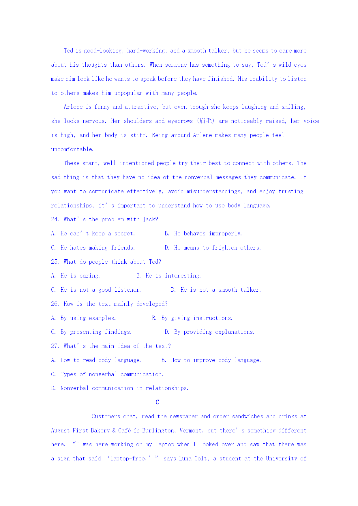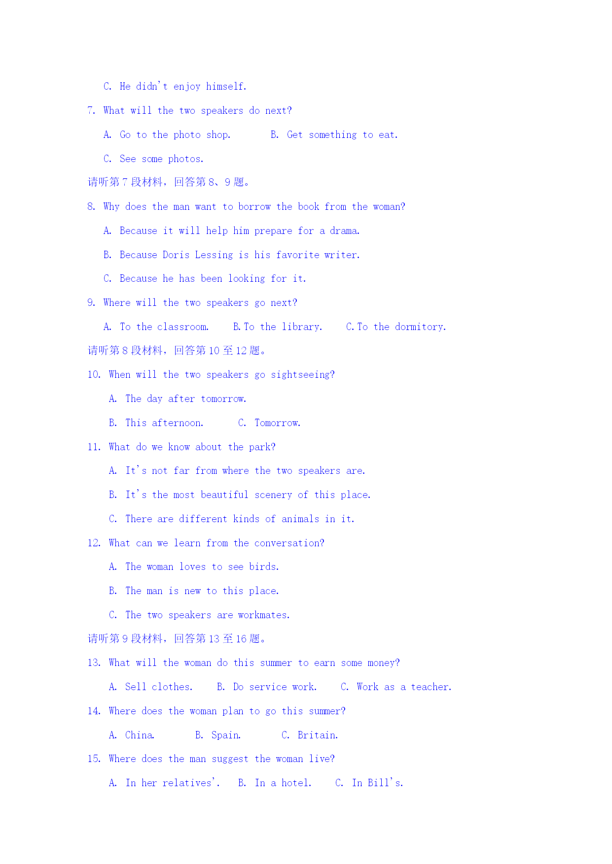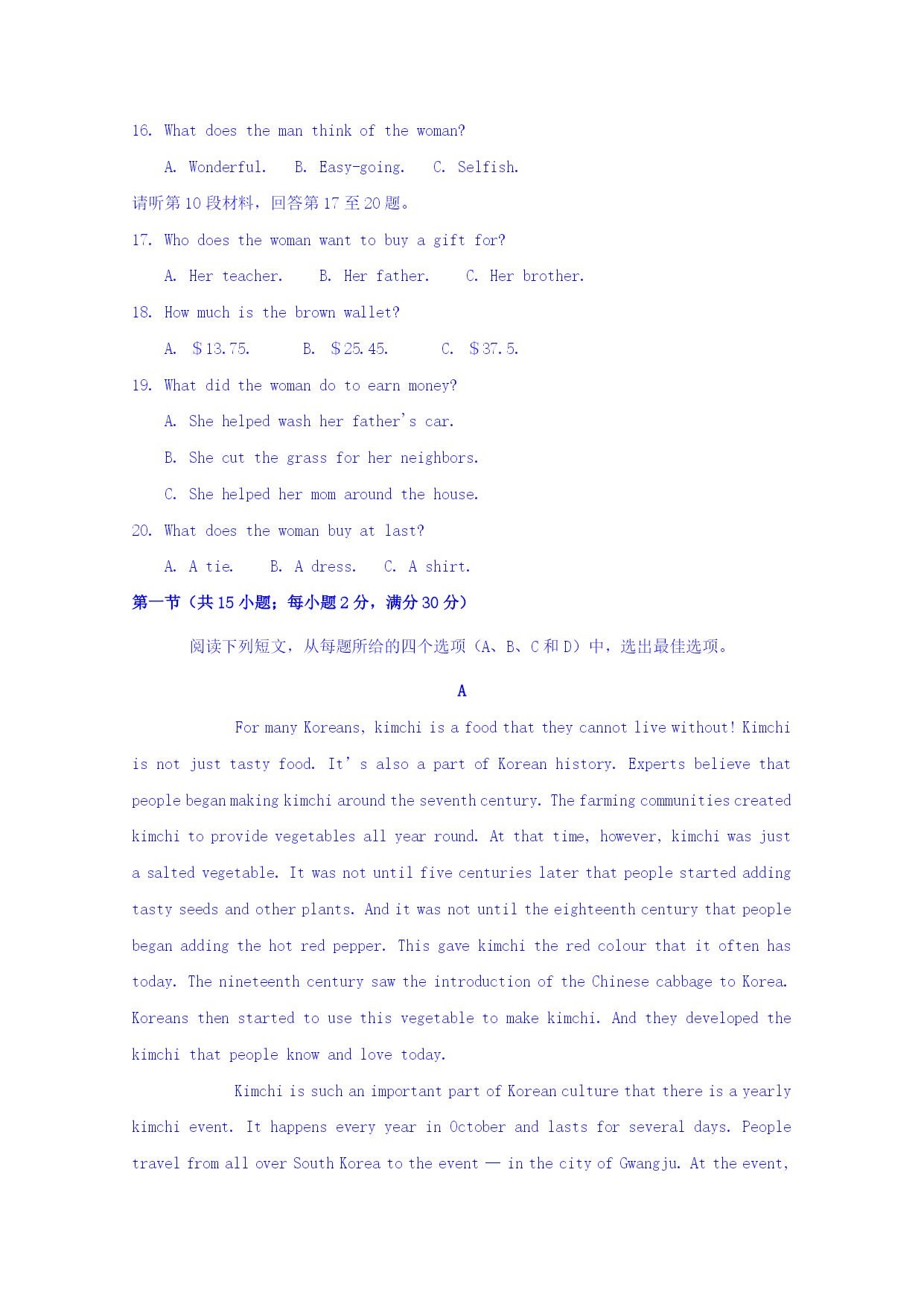 福州文博中学2016-2017学年高一年级第一次月考 英语学科题目卷 第一卷 一、听力(共20小题;每小题1.5分,满分30分) 第一节(共5小题;每小题1.5分,满分7.5分) 请听下面5段对话,选出最佳选项。 What'swrongwiththewoman? A.Herheadachesalot. B.Shecannotsleepwellrecently. C.Thereissomethingwrongwithherstomach. 2.What'sthemandoing? A.Askingaboutconcerttickets. B.Buyingconcerttickets. C.Changingconcerttickets. Wheredoestheconversationprobablytakeplace? A.Inarestaurant.B.Inacompany.C.Inafarm. Whatarethetwospeakerstalkingabout? A.Watchingaplay.B.Performingaplay.C.Writingaplay. Whatseemstobethewoman'sproblem? A.Themandoesn'tunderstandher. B.Sheisgettingfatterbutdoesn'tlikesports. C.Sheisgettingfatterbutdoesn'thavetimetoexercise. 第二节(共15小题;每小题1.5分,满分22.5分) 请听下面5段对话,选出最佳选项。 请听第6段材料,回答第6、7题。 Whatdoweknowabouttheman? A.HewenttotheseaduringSpringFestival. B.Hetraveledwithhisfriends. C.Hedidn'tenjoyhimself. Whatwillthetwospeakersdonext? A.Gotothephotoshop.B.Getsomethingtoeat. C.Seesomephotos. 请听第7段材料,回答第8、9题。 Whydoesthemanwanttoborrowthebookfromthewoman? A.Becauseitwillhelphimprepareforadrama. B.BecauseDorisLessingishisfavoritewriter. C.Becausehehasbeenlookingforit. Wherewillthetwospeakersgonext? A.Totheclassroom.B.Tothelibrary.C.Tothedormitory. 请听第8段材料,回答第10至12题。 Whenwillthetwospeakersgosightseeing? A.Thedayaftertomorrow. B.Thisafternoon.C.Tomorrow. Whatdoweknowaboutthepark? A.It'snotfarfromwherethetwospeakersare. B.It'sthemostbeautifulsceneryofthisplace. C.Therearedifferentkindsofanimalsinit. Whatcanwelearnfromtheconversation? A.Thewomanlovestoseebirds. B.Themanisnewtothisplace. C.Thetwospeakersareworkmates. 请听第9段材料,回答第13至16题。 Whatwillthewomandothissummertoearnsomemoney? Sellclothes.B.Doservicework.C.Workasateacher. Wheredoesthewomanplantogothissummer? A.China.B.Spain.C.Britain. 15.Wheredoesthemansuggestthewomanlive? A.Inherrelatives'.B.Inahotel.C.InBill's. Whatdoesthemanthinkofthewoman? A.Wonderful.B.Easy-going.C.Selfish. 请听第10段材料,回答第17至20题。 17.Whodoesthewomanwanttobuyagiftfor? A.Herteacher.B.Herfather.C.Herbrother. 18.Howmuchisthebrownwallet? A.$13.75.B.$25.45.