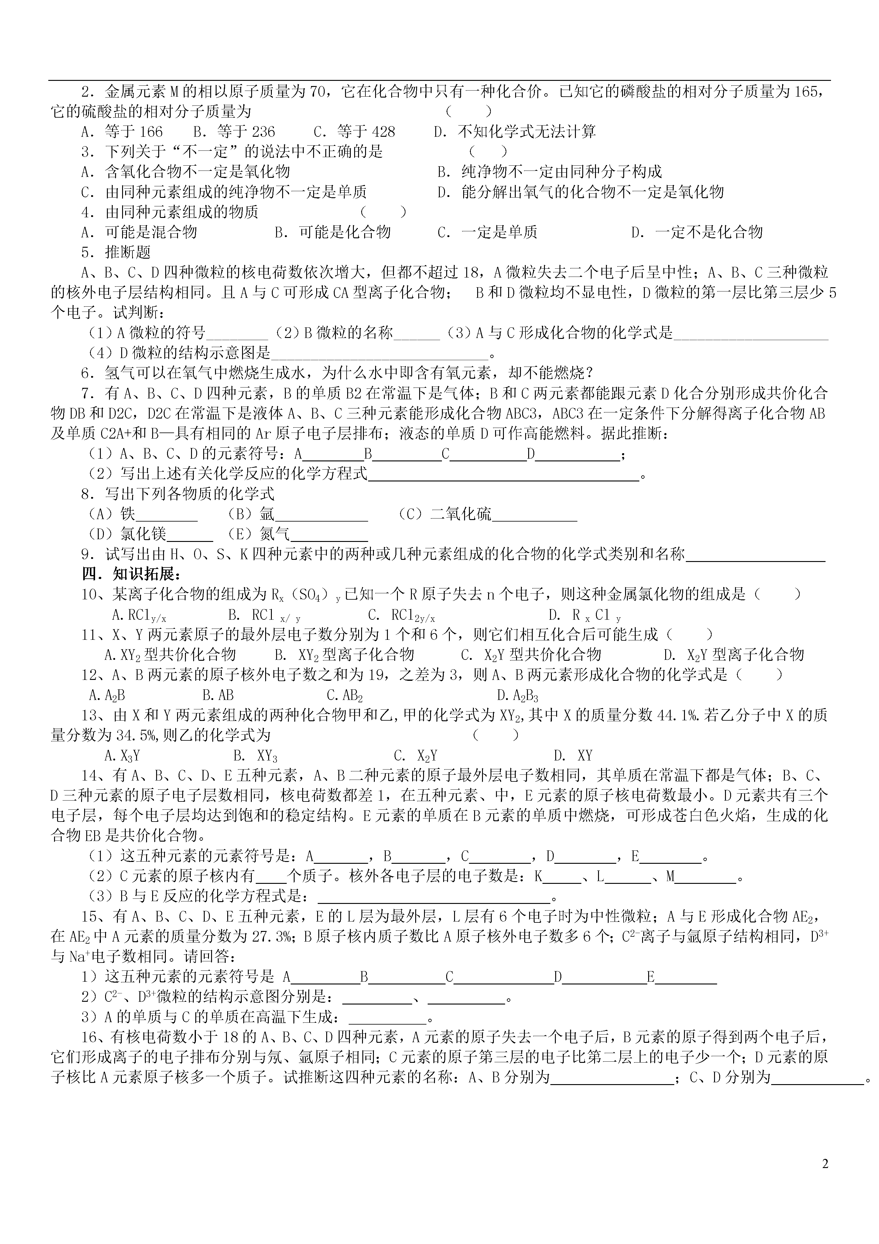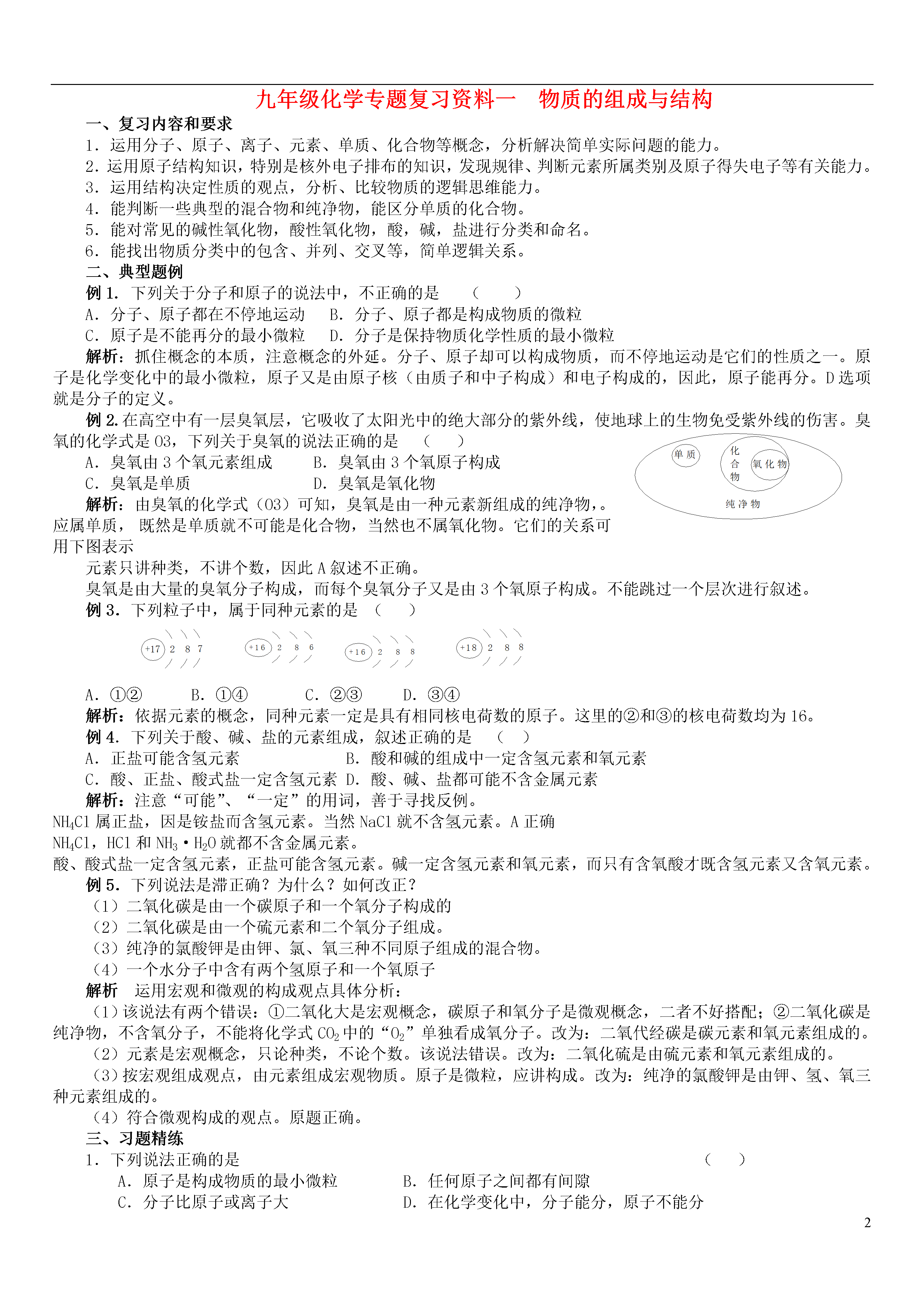 2九年级化学专题复习资料一物质的组成与结构一、复习内容和要求1.运用分子、原子、离子、元素、单质、化合物等概念,分析解决简单实际问题的能力。2.运用原子结构知识,特别是核外电子排布的知识,发现规律、判断元素所属类别及原子得失电子等有关能力。3.运用结构决定性质的观点,分析、比较物质的逻辑思维能力。4.能判断一些典型的混合物和纯净物,能区分单质的化合物。5.能对常见的碱性氧化物,酸性氧化物,酸,碱,盐进行分类和命名。6.能找出物质分类中的包含、并列、交叉等,简单逻辑关系。二、典型题例例1.下列关于分子和原子的说法中,不正确的是()A.分子、原子都在不停地运动B.分子、原子都是构成物质的微粒C.原子是不能再分的最小微粒D.分子是保持物质化学性质的最小微粒解析:抓住概念的本质,注意概念的外延。分子、原子却可以构成物质,而不停地运动是它们的性质之一。原子是化学变化中的最小微粒,原子又是由原子核(由质子和中子构成)和电子构成的,因此,原子能再分。D选项就是分子的定义。例2.在高空中有一层臭氧层,它吸收了太阳光中的绝大部分的紫外线,使地球上的生物免受紫外线的伤害。臭氧的化学式是O3,下列关于臭氧的说法正确的是()A.臭氧由3个氧元素组成B.臭氧由3个氧原子构成C.臭氧是单质D.臭氧是氧化物解析:由臭氧的化学式(O3)可知,臭氧是由一种元素新组成的纯净物,。应属单质,既然是单质就不可能是化合物,当然也不属氧化物。它们的关系可用下图表示元素只讲种类,不讲个数,因此A叙述不正确。臭氧是由大量的臭氧分子构成,而每个臭氧分子又是由3个氧原子构成。不能跳过一个层次进行叙述。例3.下列粒子中,属于同种元素的是()A.①②B.①④C.②③D.③④解析:依据元素的概念,同种元素一定是具有相同核电荷数的原子。这里的②和③的核电荷数均为16。例4.下列关于酸、碱、盐的元素组成,叙述正确的是()A.正盐可能含氢元素B.酸和碱的组成中一定含氢元素和氧元素C.酸、正盐、酸式盐一定含氢元素D.酸、碱、盐都可能不含金属元素解析:注意“可能”、“一定”的用词,善于寻找反例。NH4Cl属正盐,因是铵盐而含氢元素。当然NaCl就不含氢元素。A正确NH4Cl,HCl和NH3·H2O就都不含金属元素。酸、酸式盐一定含氢元素,正盐可能含氢元素。碱一定含氢元素和氧元素,而只有含氧酸才既含氢元素又含氧元素。例5.下列说法是滞正确?为什么?如何改正?(1)二氧化碳是由一个碳原子和一个氧分子构成的(2)二氧化碳是由一个硫元素和二个氧分子组成。(3)纯净的氯酸钾是由钾、氯、氧三种不同原子组成的混合物。(4)一个水分子中含有两个氢原子和一个氧原子解析运用宏观和微观的构成观点具体分析:(1)该说法有两个错误:①二氧化大是宏观概念,碳原子和氧分子是微观概念,二者不好搭配;②二氧化碳是纯净物,不含氧分子,不能将化学式CO2中的“O2”单独看成氧分子。改为:二氧代经碳是碳元素和氧元素组成的。(2)元素是宏观概念,只论种类,不论个数。该说法错误。改为:二氧化硫是由硫元素和氧元素组成的。(3)按宏观组成观点,由元素组成宏观物质。原子是微粒,应讲构成。改为:纯净的氯酸钾是由钾、氢、氧三种元素组成的。(4)符合微观构成的观点。原题正确。三、习题精练1.下列说法正确的是()A.原子是构成物质的最小微粒B.任何原子之间都有间隙C.分子比原子或离子大D.在化学变化中,分子能分,原子不能分2.金属元素M的相以原子质量为70,它在化合物中只有一种化合价。已知它的磷酸盐的相对分子质量为165,它的硫酸盐的相对分子质量为()A.等于166B.等于236C.等于428D.不知化学式无法计算3.下列关于“不一定”的说法中不正确的是()A.含氧化合物不一定是氧化物B.纯净物不一定由同种分子构成C.由同种元素组成的纯净物不一定是单质D.能分解出氧气的化合物不一定是氧化物4.由同种元素组成的物质()A.可能是混合物B.可能是化合物C.一定是单质D.一定不是化合物5.推断题A、B、C、D四种微粒的核电荷数依次增大,但都不超过18,A微粒失去二个电子后呈中性;A、B、C三种微粒的核外电子层结构相同。且A与C可形成CA型离子化合物;B和D微粒均不显电性,D微粒的第一层比第三层少5个电子。试判断:(1)A微粒的符号________(2)B微粒的名称______(3)A与C形成化合物的化学式是____________________(4)D微粒的结构示意图是____________________________。6.氢气可以在氧气中燃烧生成水,为什么水中即含有氧元素,却不能燃烧?7.有A、B、C、D四种元素,