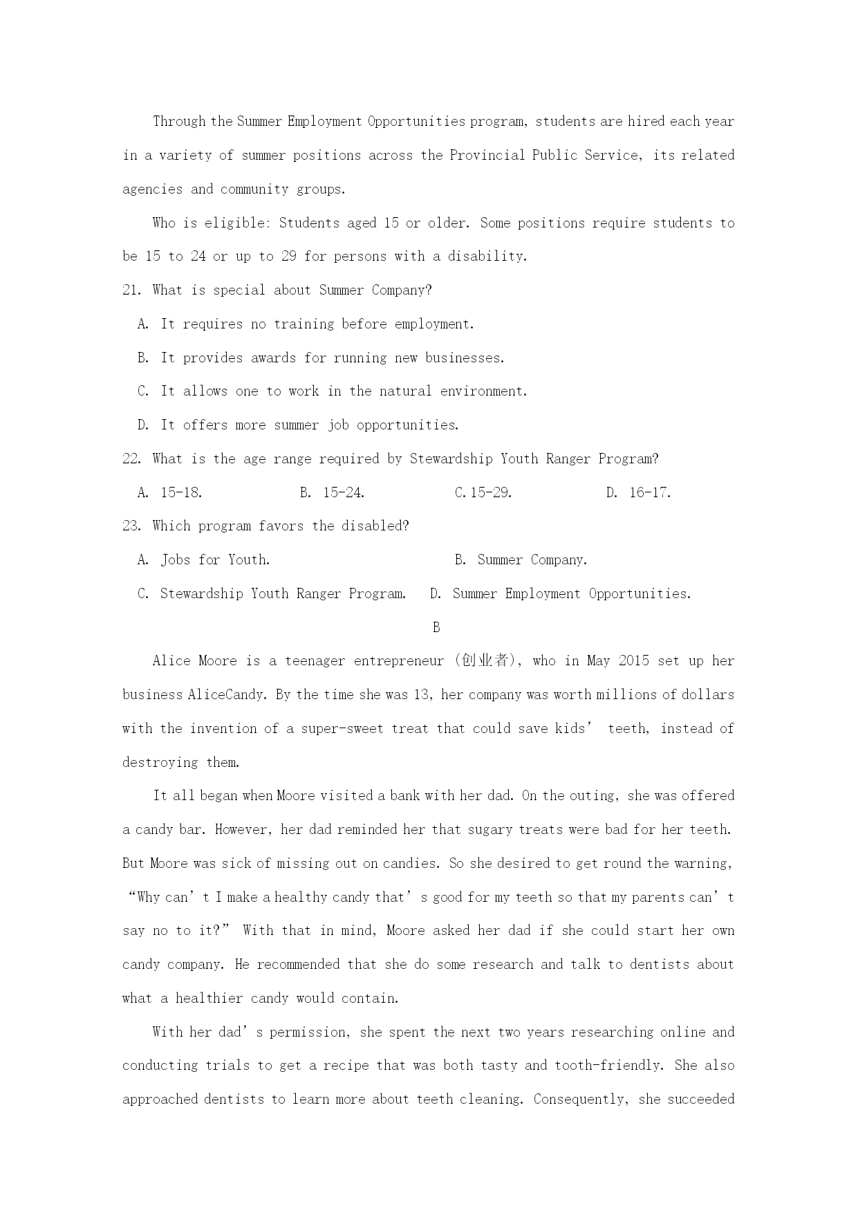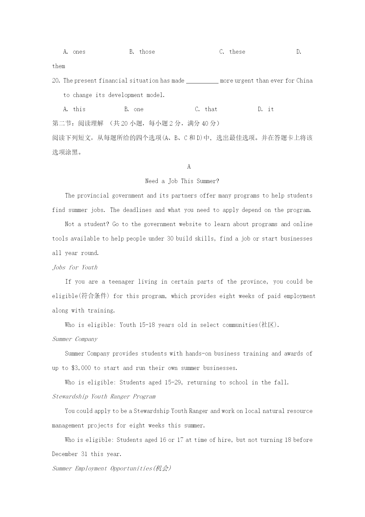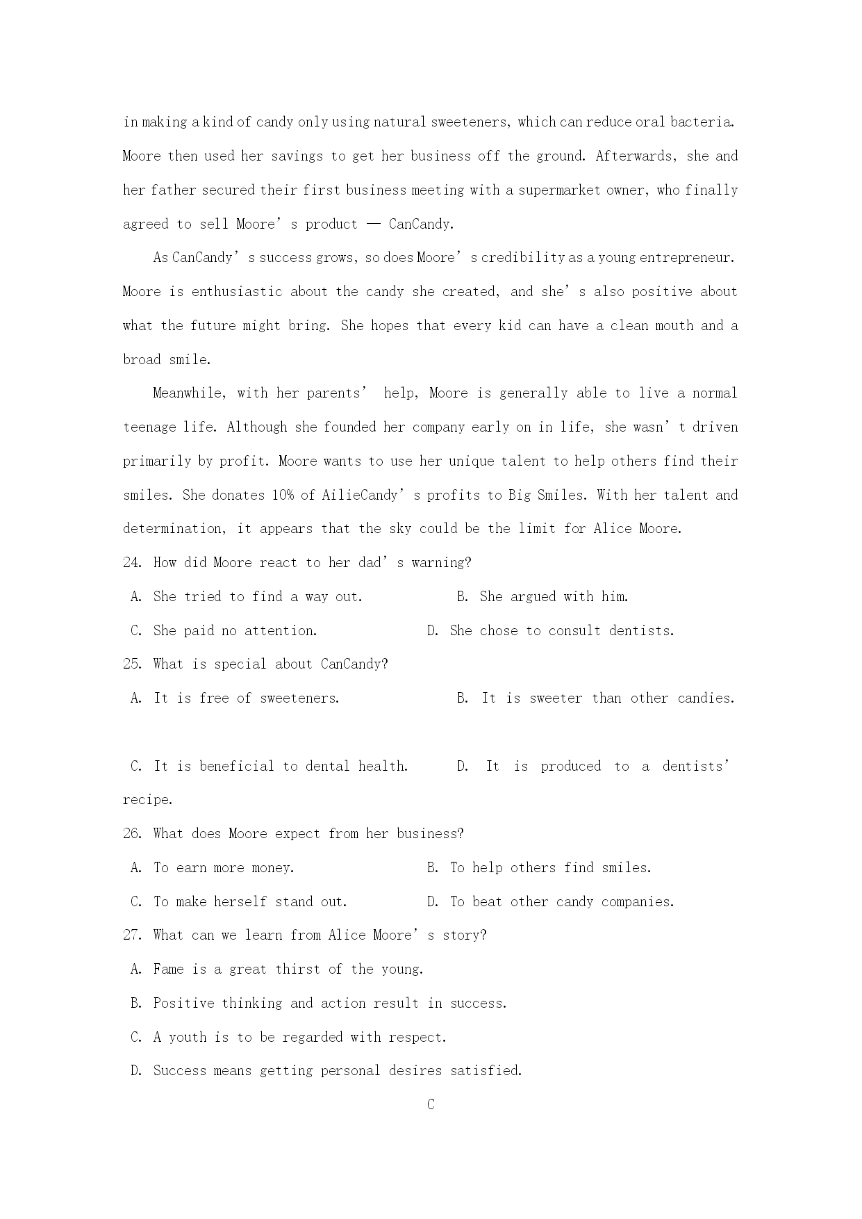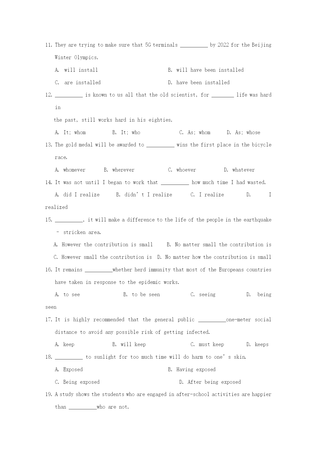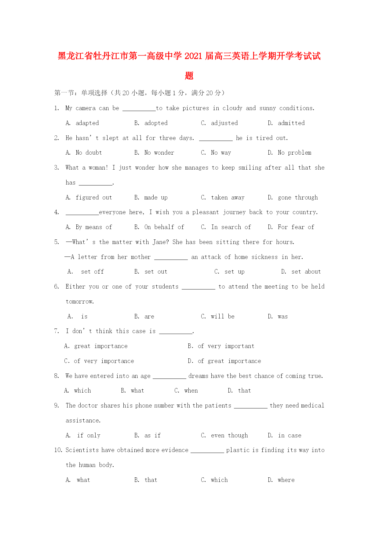 黑龙江省牡丹江市第一高级中学2021届高三英语上学期开学考试试题 第一节:单项选择(共20小题,每小题1分,满分20分) Mycameracanbe__________totakepicturesincloudyandsunnyconditions. A.adapted B.adopted C.adjusted D.admitted Hehasn’tsleptatallforthreedays.__________heistiredout. A.Nodoubt B.Nowonder C.Noway D.Noproblem Whatawoman!Ijustwonderhowshemanagestokeepsmilingafterallthatshehas__________. A.figuredout B.madeup C.takenaway D.gonethrough __________everyonehere,Iwishyouapleasantjourneybacktoyourcountry. A.Bymeansof B.Onbehalfof C.Insearchof D.Forfearof —What’sthematterwithJane?Shehasbeensittingthereforhours. —Aletterfromhermother__________anattackofhomesicknessinher. setoff B.setout C.setup D.setabout Eitheryouoroneofyourstudents__________toattendthemeetingtobeheldtomorrow. is B.are C.willbe D.was Idon’tthinkthiscaseis__________. A.greatimportance B.ofveryimportant C.ofveryimportance D.ofgreatimportance Wehaveenteredintoanage__________dreamshavethebestchanceofcomingtrue. A.which B.what C.when D.that Thedoctorshareshisphonenumberwiththepatients__________theyneedmedicalassistance. ifonly B.asif C.eventhough D.incase Scientistshaveobtainedmoreevidence__________plasticisfindingitswayintothehumanbody. what B.that C.which D.where Theyaretryingtomakesurethat5Gterminals__________by2022fortheBeijingWinterOlympics. willinstall B.willhavebeeninstalled areinstalled D.havebeeninstalled __________isknowntousallthattheoldscientist,for________lifewashardin thepast,stillworkshardinhiseighties. A.It;whom B.It;who C.As;whomD.As;whose Thegoldmedalwillbeawardedto__________winsthefirstplaceinthebicyclerace. A.whomever B.wherever C.whoever D.whatever ItwasnotuntilIbegantoworkthat__________howmuchtimeIhadwasted. A.didIrealizeB.didn’tIrealize C.Irealize D.Irealized __________,itwillmakeadifferencetothelifeofthepeopleintheearthquake–strickenarea. A.HoweverthecontributionissmallB.Nomattersmallthecontributionis C.HoweversmallthecontributionisD.Nomatterhowthecontributionissmall Itremains__________wheth