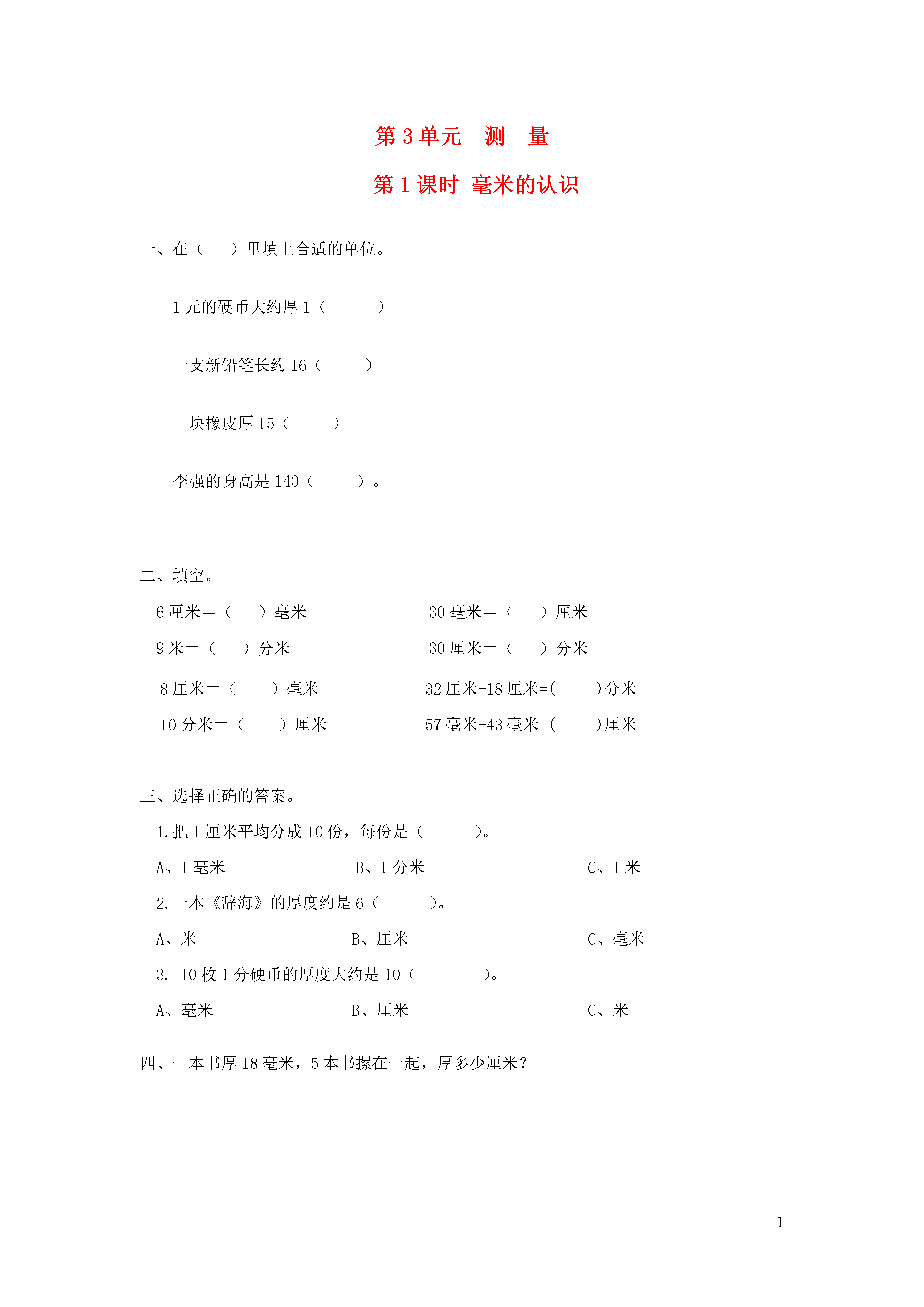 1第3单元测量第1课时毫米的认识一、在()里填上合适的单位。1元的硬币大约厚1()一支新铅笔长约16()一块橡皮厚15()李强的身高是140()。二、填空。6厘米=()毫米30毫米=()厘米9米=()分米30厘米=()分米8厘米=()毫米32厘米+18厘米=()分米10分米=()厘米57毫米+43毫米=()厘米三、选择正确的答案。1.把1厘米平均分成10份,每份是()。A、1毫米B、1分米C、1米2.一本《辞海》的厚度约是6()。A、米B、厘米C、毫米3.10枚1分硬币的厚度大约是10()。A、毫米B、厘米C、米四、一本书厚18毫米,5本书摞在一起,厚多少厘米?
