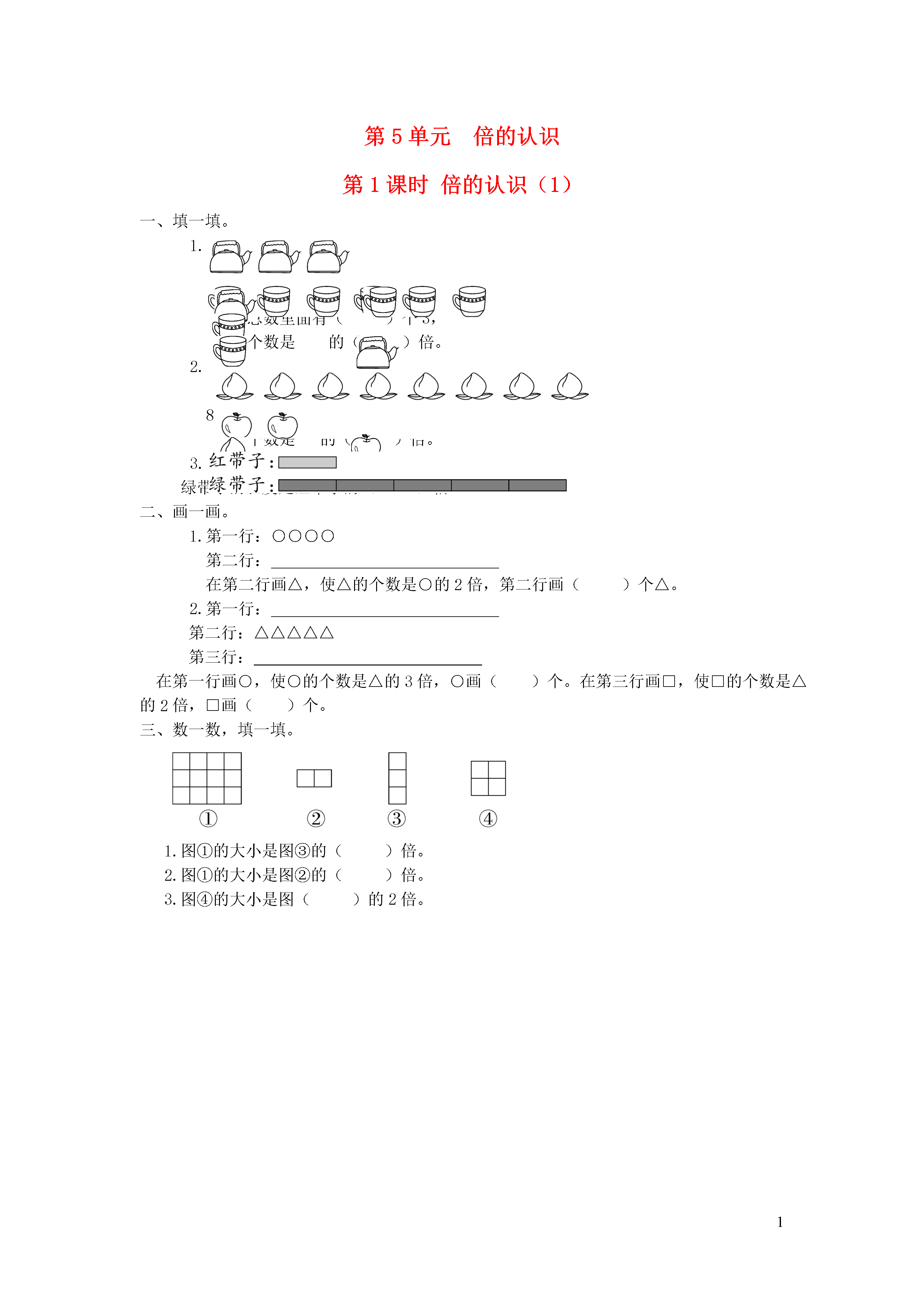 1第5单元倍的认识第1课时倍的认识(1)一、填一填。1.有3个,有()个,的总数里面有()个3,的个数是的()倍。2.8里面有()个2,的个数是的()倍。绿带子的长度是红带子的()倍。二、画一画。1.第一行:○○○○第二行:在第二行画△,使△的个数是○的2倍,第二行画()个△。第一行:第二行:△△△△△第三行:在第一行画○,使○的个数是△的3倍,○画()个。在第三行画□,使□的个数是△的2倍,□画()个。三、数一数,填一填。1.图①的大小是图③的()倍。2.图①的大小是图②的()倍。3.图④的大小是图()的2倍。