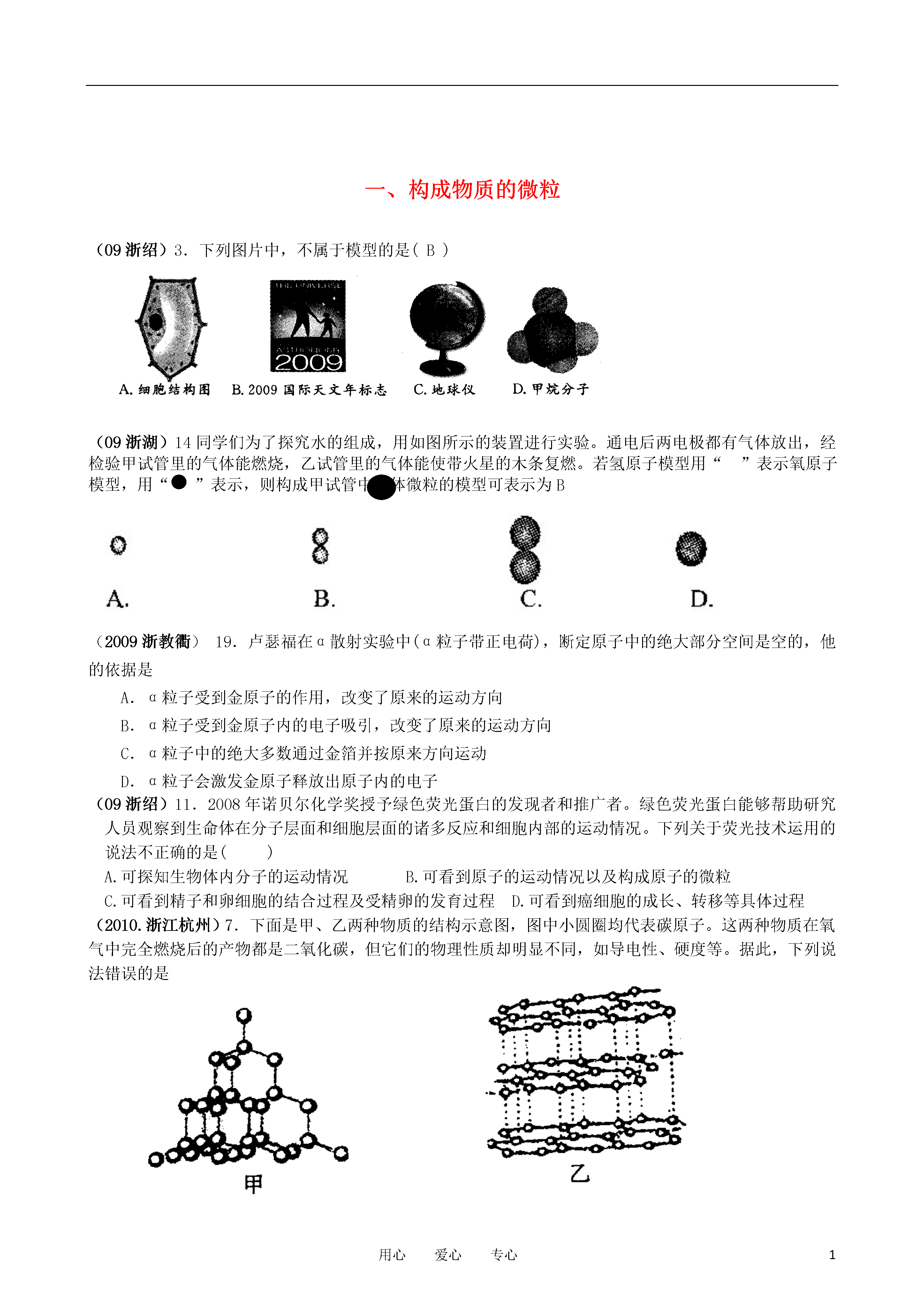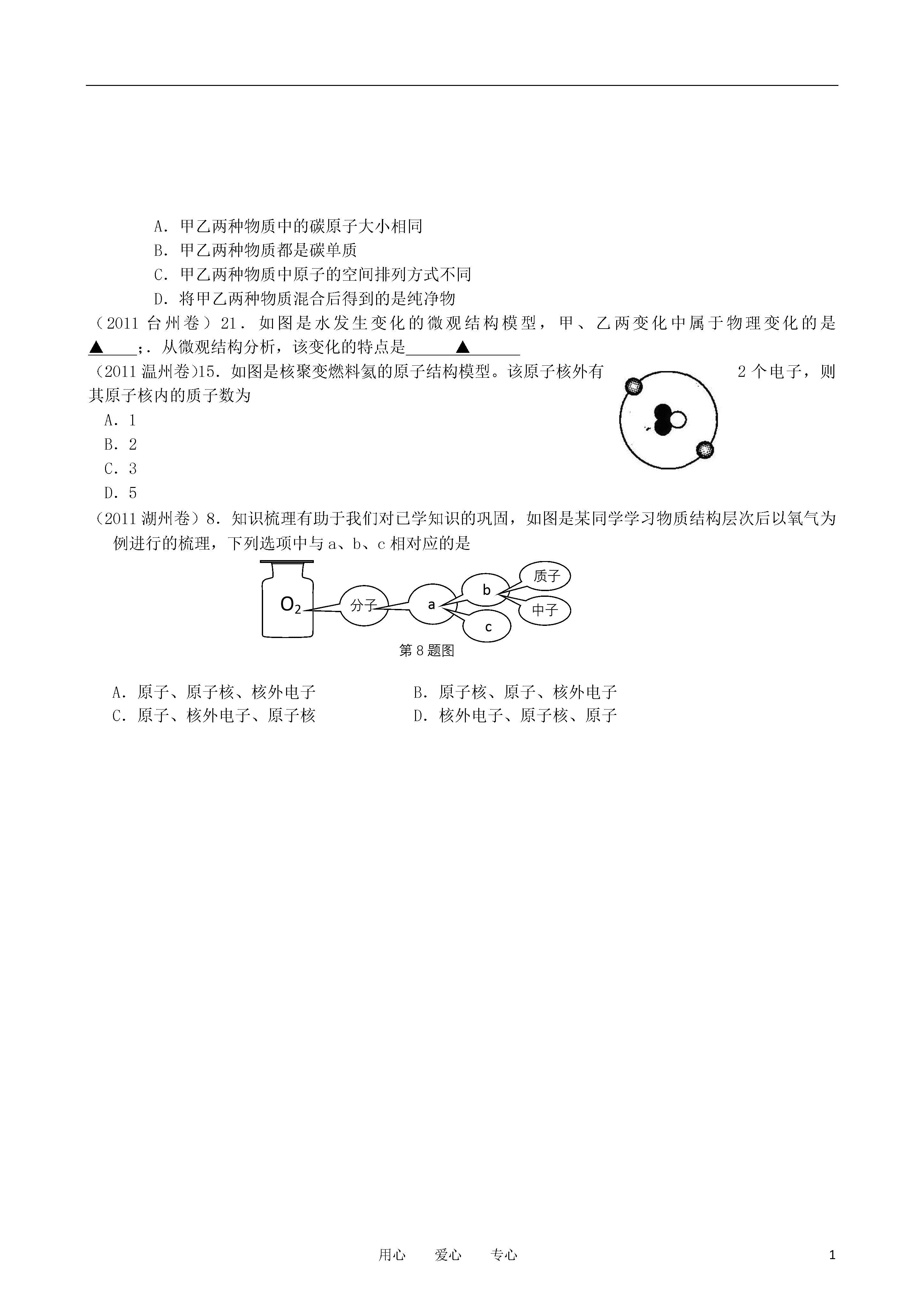 1用心爱心专心一、构成物质的微粒(09浙绍)3.下列图片中,不属于模型的是(B)(09浙湖)14同学们为了探究水的组成,用如图所示的装置进行实验。通电后两电极都有气体放出,经检验甲试管里的气体能燃烧,乙试管里的气体能使带火星的木条复燃。若氢原子模型用“”表示氧原子模型,用“”表示,则构成甲试管中气体微粒的模型可表示为B(2009浙教衢)19.卢瑟福在α散射实验中(α粒子带正电荷),断定原子中的绝大部分空间是空的,他的依据是A.α粒子受到金原子的作用,改变了原来的运动方向B.α粒子受到金原子内的电子吸引,改变了原来的运动方向C.α粒子中的绝大多数通过金箔并按原来方向运动D.α粒子会激发金原子释放出原子内的电子(09浙绍)11.2008年诺贝尔化学奖授予绿色荧光蛋白的发现者和推广者。绿色荧光蛋白能够帮助研究人员观察到生命体在分子层面和细胞层面的诸多反应和细胞内部的运动情况。下列关于荧光技术运用的说法不正确的是()A.可探知生物体内分子的运动情况B.可看到原子的运动情况以及构成原子的微粒C.可看到精子和卵细胞的结合过程及受精卵的发育过程D.可看到癌细胞的成长、转移等具体过程(2010.浙江杭州)7.下面是甲、乙两种物质的结构示意图,图中小圆圈均代表碳原子。这两种物质在氧气中完全燃烧后的产物都是二氧化碳,但它们的物理性质却明显不同,如导电性、硬度等。据此,下列说法错误的是A.甲乙两种物质中的碳原子大小相同B.甲乙两种物质都是碳单质C.甲乙两种物质中原子的空间排列方式不同D.将甲乙两种物质混合后得到的是纯净物(2011台州卷)21.如图是水发生变化的微观结构模型,甲、乙两变化中属于物理变化的是▲;.从微观结构分析,该变化的特点是▲(2011温州卷)15.如图是核聚变燃料氦的原子结构模型。该原子核外有2个电子,则其原子核内的质子数为A.1B.2C.3D.5(2011湖州卷)8.知识梳理有助于我们对已学知识的巩固,如图是某同学学习物质结构层次后以氧气为例进行的梳理,下列选项中与a、b、c相对应的是O2第8题图分子abc中子质子aA.原子、原子核、核外电子B.原子核、原子、核外电子C.原子、核外电子、原子核D.核外电子、原子核、原子