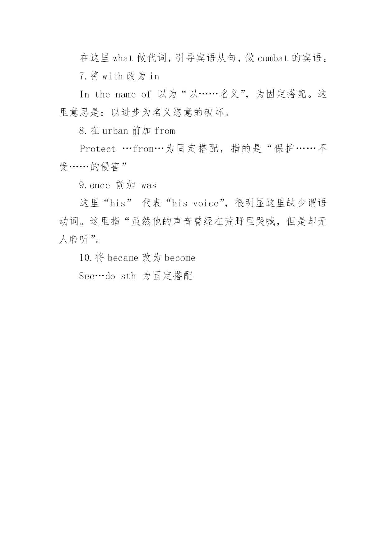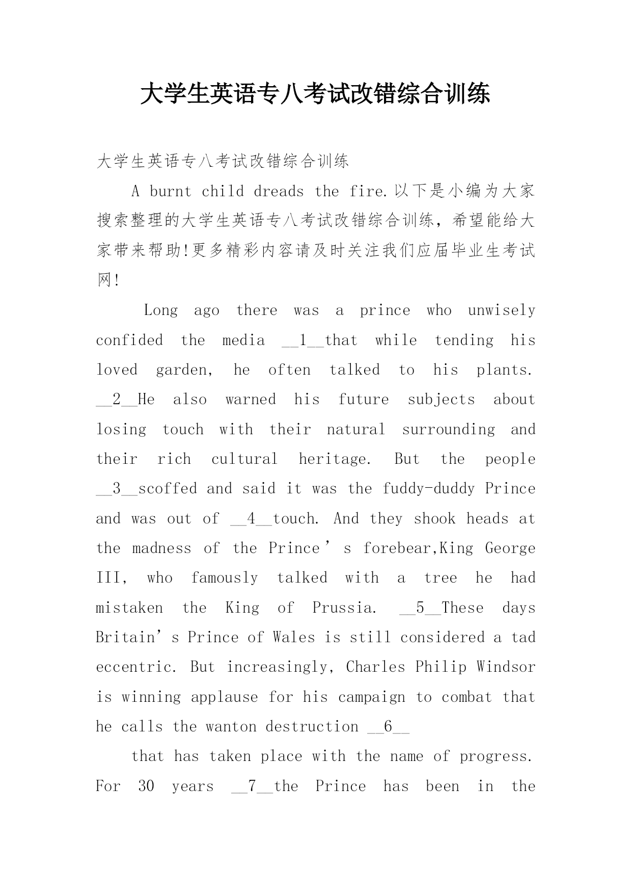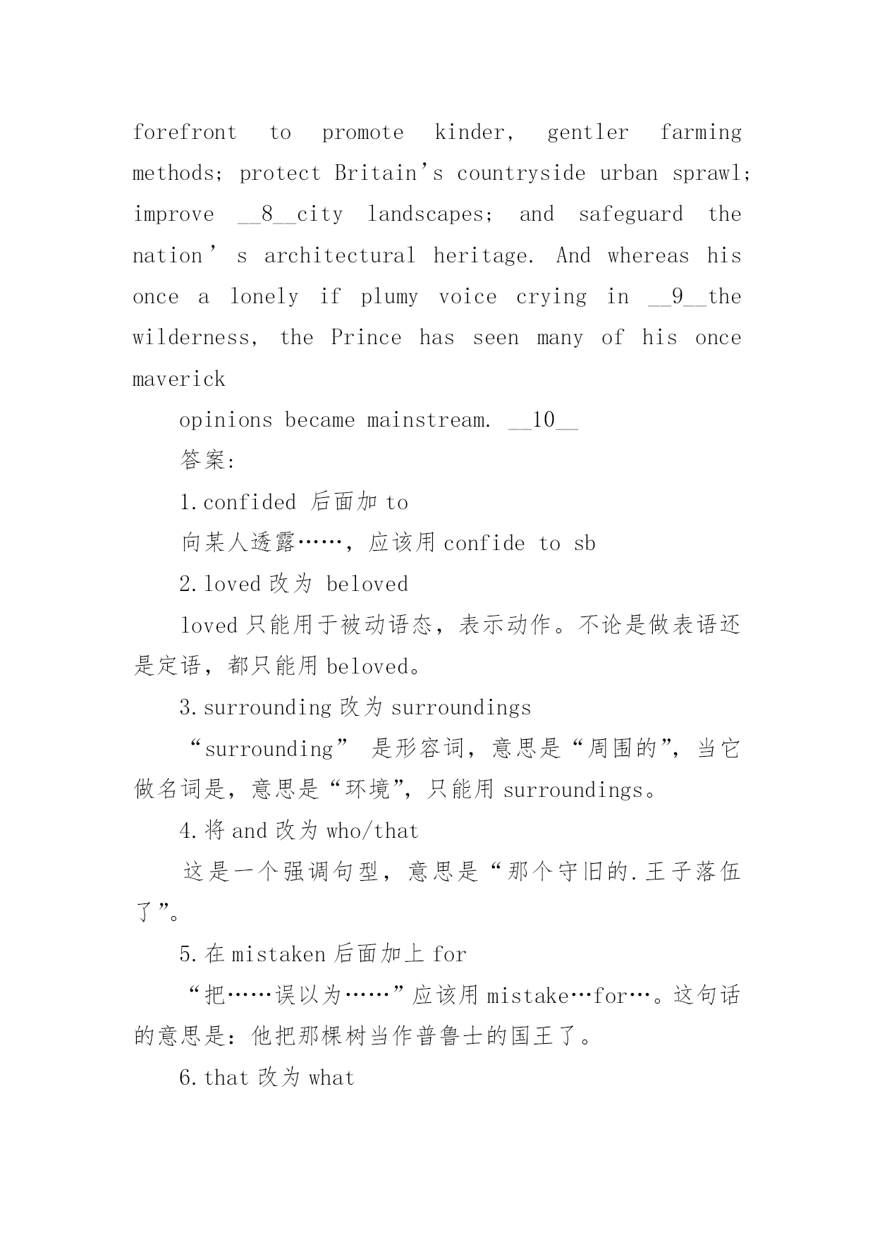大学生英语专八考试改错综合训练 大学生英语专八考试改错综合训练Aburntchilddreadsthefire.以下是小编为大家搜索整理的大学生英语专八考试改错综合训练,希望能给大家带来帮助!更多精彩内容请及时关注我们应届毕业生考试网!Longagotherewasaprincewhounwiselyconfidedthemedia__1__thatwhiletendinghislovedgarden,heoftentalkedtohisplants.__2__Healsowarnedhisfuturesubjectsaboutlosingtouchwiththeirnaturalsurroundingandtheirrichculturalheritage.Butthepeople__3__scoffedandsaiditwasthefuddy-duddyPrinceandwasoutof__4__touch.AndtheyshookheadsatthemadnessofthePrince’sforebear,KingGeorgeIII,whofamouslytalkedwithatreehehadmistakentheKingofPrussia.__5__ThesedaysBritain’sPrinceofWalesisstillconsideredatadeccentric.Butincreasingly,CharlesPhilipWindsoriswinningapplauseforhiscampaigntocombatthathecallsthewantondestruction__6__thathastakenplacewiththenameofprogress.For30years__7__thePrincehasbeenintheforefronttopromotekinder,gentlerfarmingmethods;protectBritain’scountrysideurbansprawl;improve__8__citylandscapes;andsafeguardthenation’sarchitecturalheritage.Andwhereashisoncealonelyifplumyvoicecryingin__9__thewilderness,thePrincehasseenmanyofhisoncemaverickopinionsbecamemainstream.__10__答案:1.confided后面加to向某人透露……,应该用confidetosb2.loved改为belovedloved只能用于被动语态,表示动作。不论是做表语还是定语,都只能用beloved。3.surrounding改为surroundings“surrounding”是形容词,意思是“周围的”,当它做名词是,意思是“环境”,只能用surroundings。4.将and改为who/that这是一个强调句型,意思是“那个守旧的.王子落伍了”。5.在mistaken后面加上for“把……误以为……”应该用mistake…for…。这句话的意思是:他把那棵树当作普鲁士的国王了。6.that改为what在这里what做代词,引导宾语从句,做combat的宾语。7.将with改为inInthenameof以为“以……名义”,为固定搭配。这里意思是:以进步为名义恣意的破坏。8.在urban前加fromProtect…from…为固定搭配,指的是“保护……不受……的侵害”9.once前加was这里“his”代表“hisvoice”,很明显这里缺少谓语动词。这里指“虽然他的声音曾经在荒野里哭喊,但是却无人聆听”。10.将became改为becomeSee…dosth为固定搭配