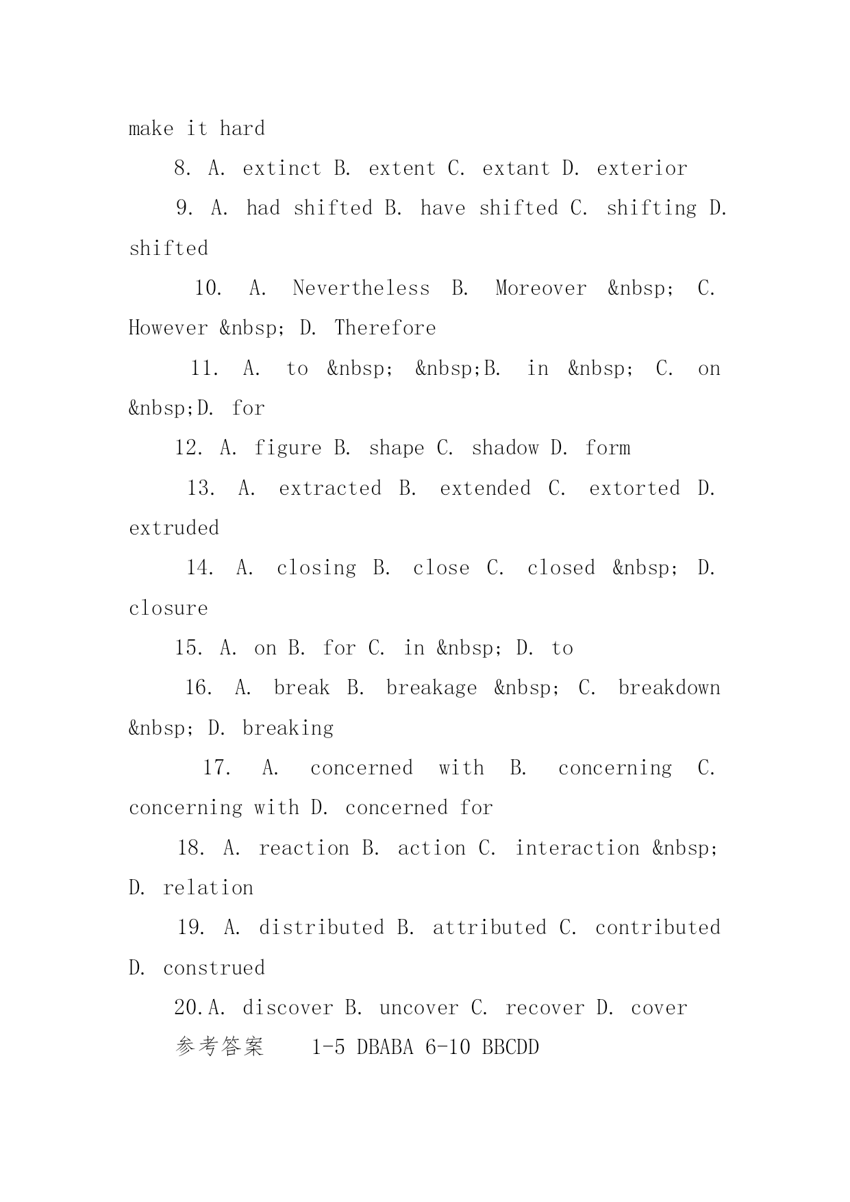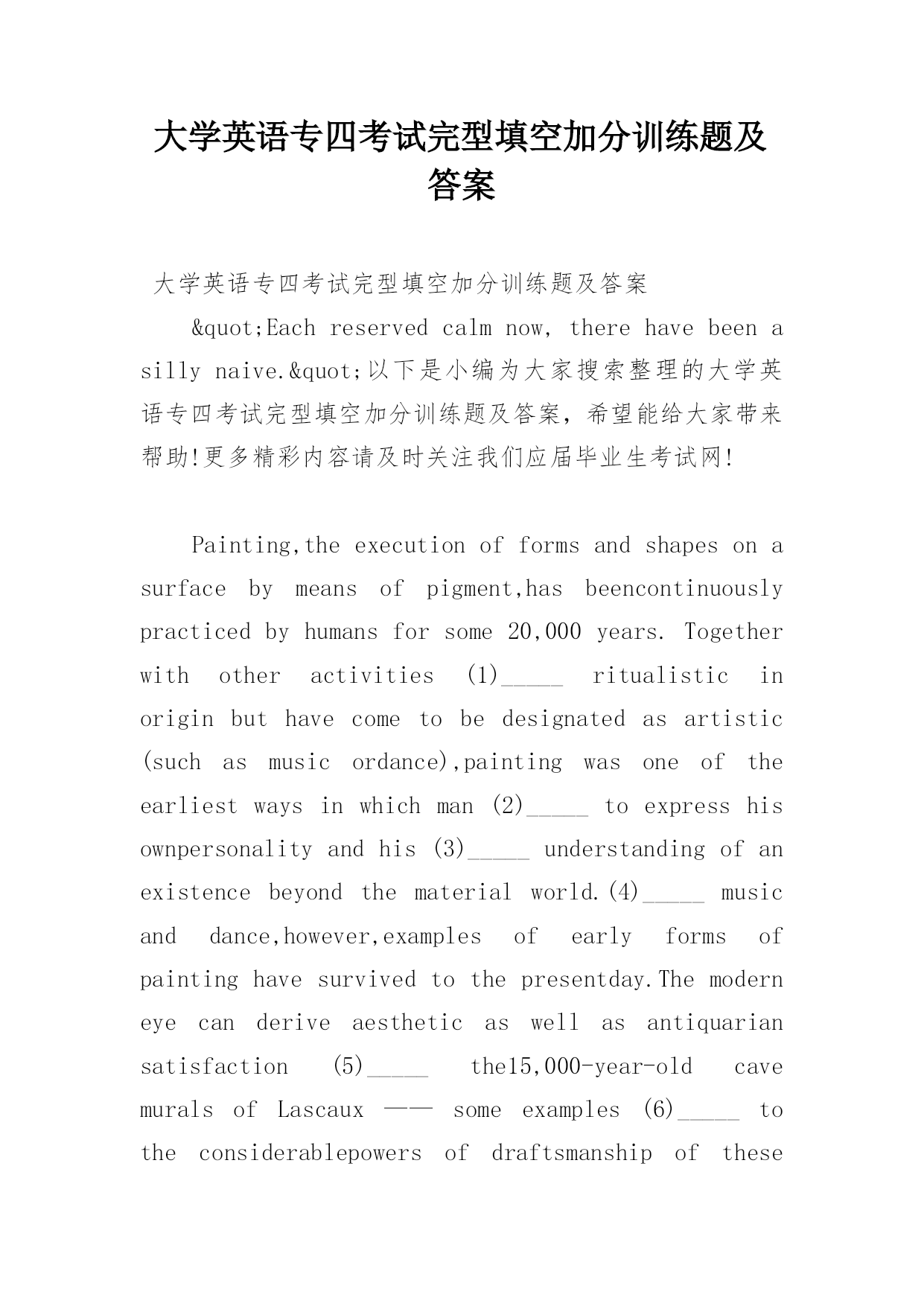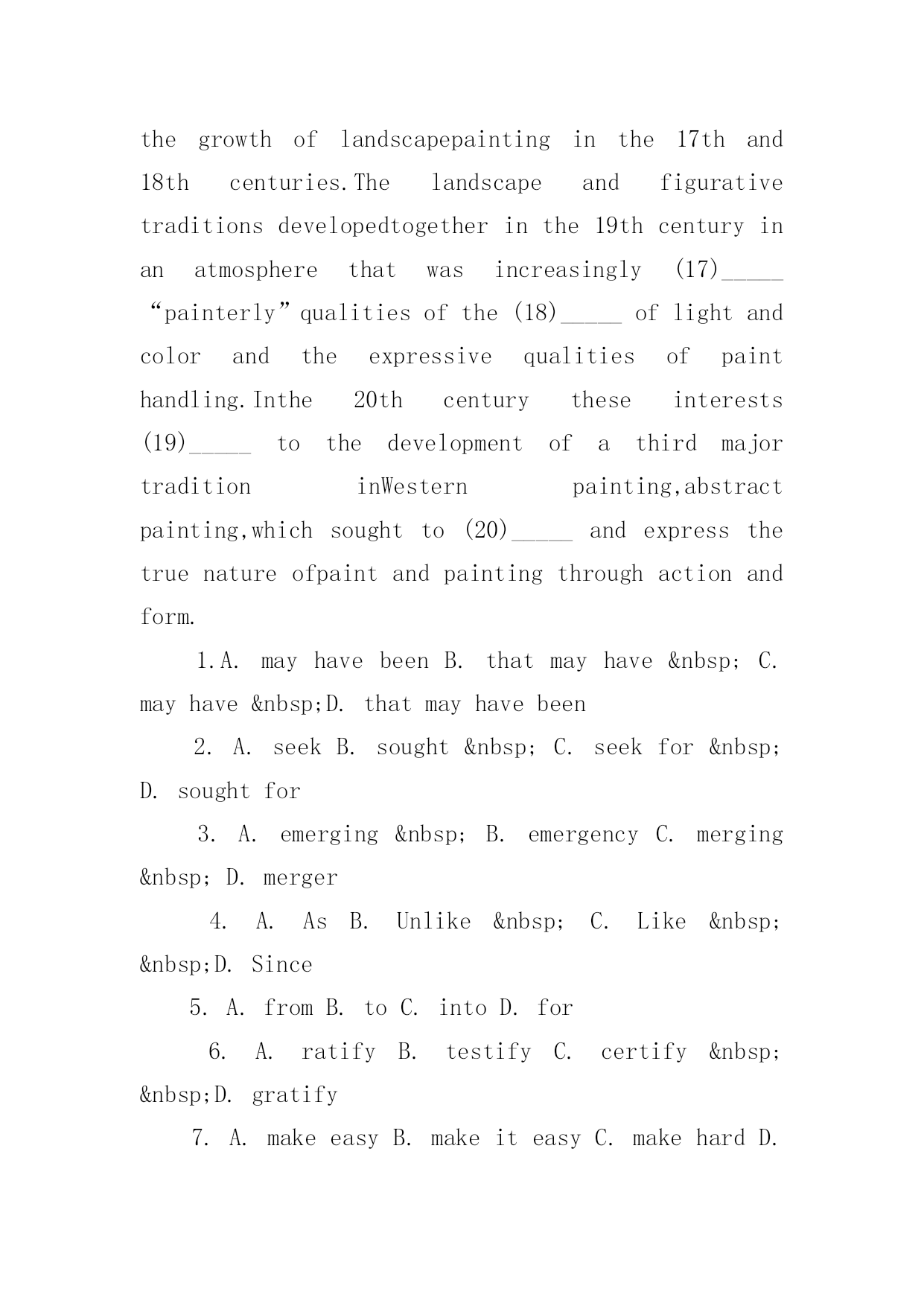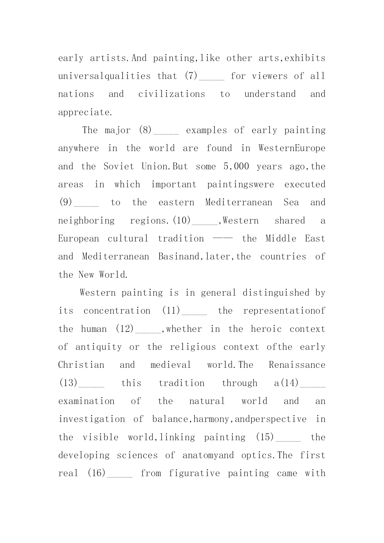 大学英语专四考试完型填空加分训练题及答案 大学英语专四考试完型填空加分训练题及答案"Eachreservedcalmnow,therehavebeenasillynaive."以下是小编为大家搜索整理的大学英语专四考试完型填空加分训练题及答案,希望能给大家带来帮助!更多精彩内容请及时关注我们应届毕业生考试网!Painting,theexecutionofformsandshapesonasurfacebymeansofpigment,hasbeencontinuouslypracticedbyhumansforsome20,000years.Togetherwithotheractivities(1)_____ritualisticinoriginbuthavecometobedesignatedasartistic(suchasmusicordance),paintingwasoneoftheearliestwaysinwhichman(2)_____toexpresshisownpersonalityandhis(3)_____understandingofanexistencebeyondthematerialworld.(4)_____musicanddance,however,examplesofearlyformsofpaintinghavesurvivedtothepresentday.Themoderneyecanderiveaestheticaswellasantiquariansatisfaction(5)_____the15,000-year-oldcavemuralsofLascaux——someexamples(6)_____totheconsiderablepowersofdraftsmanshipoftheseearlyartists.Andpainting,likeotherarts,exhibitsuniversalqualitiesthat(7)_____forviewersofallnationsandcivilizationstounderstandandappreciate.Themajor(8)_____examplesofearlypaintinganywhereintheworldarefoundinWesternEuropeandtheSovietUnion.Butsome5,000yearsago,theareasinwhichimportantpaintingswereexecuted(9)_____totheeasternMediterraneanSeaandneighboringregions.(10)_____,WesternsharedaEuropeanculturaltradition——theMiddleEastandMediterraneanBasinand,later,thecountriesoftheNewWorld.Westernpaintingisingeneraldistinguishedbyitsconcentration(11)_____therepresentationofthehuman(12)_____,whetherintheheroiccontextofantiquityorthereligiouscontextoftheearlyChristianandmedievalworld.TheRenaissance(13)_____thistraditionthrougha(14)_____examinationofthenaturalworldandaninvestigationofbalance,harmony,andperspectiveinthevisibleworld,linkingpainting(15)_____thedevelopingsciencesofanatomyandoptics.Thefirstreal(16)_____fromfigurativepaintingcamewiththegrowthoflandscapepaintinginthe17thand18thcenturies.Thelandscapeandfigurativetraditionsdevelopedtogetherinthe19thcenturyinanatmospherethatwasincreasingly(17)_____“painterly”qualitiesofthe(18)_____oflightandcolorandtheexpressivequalitiesofpainthandling.Inthe20t