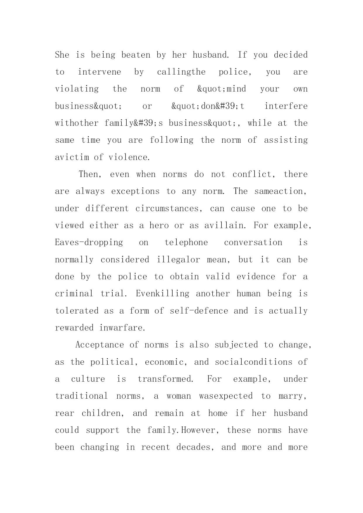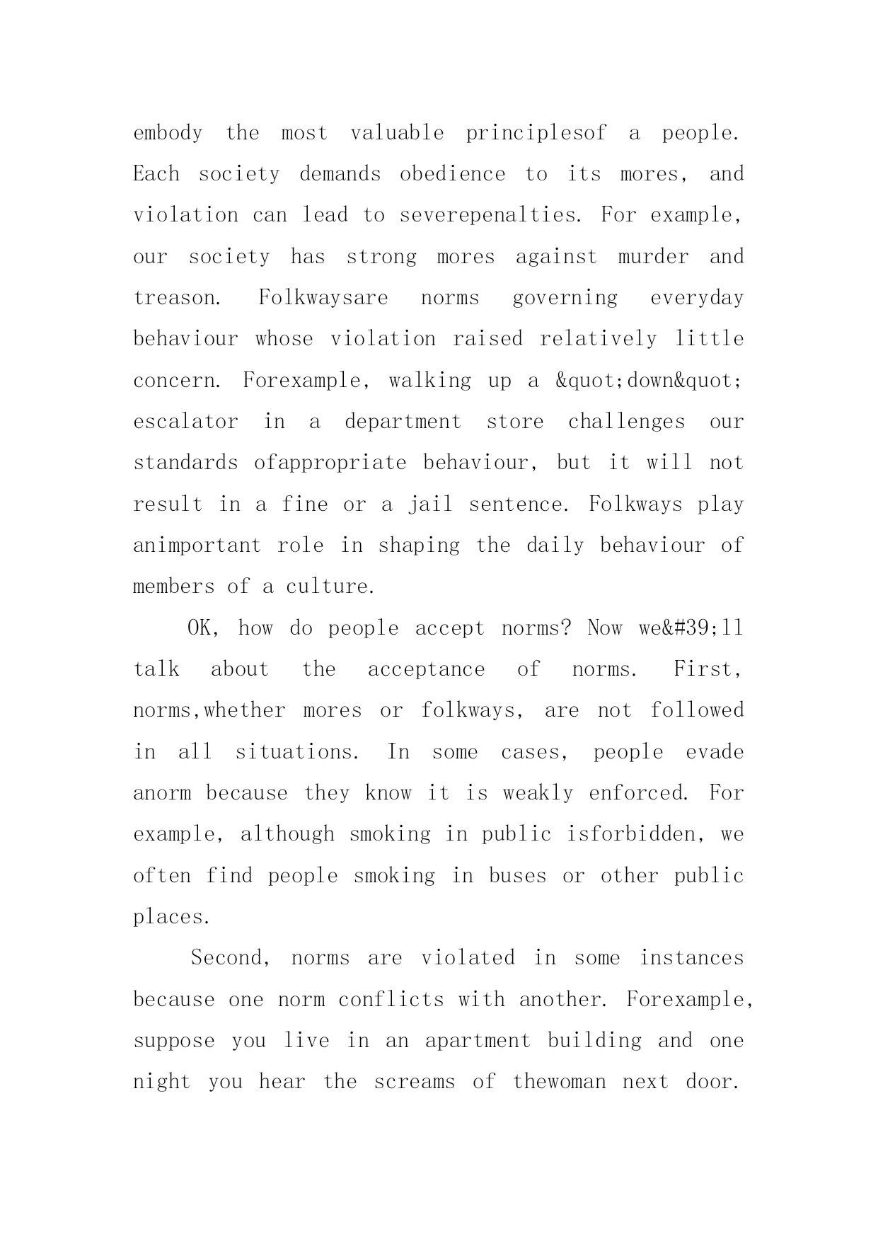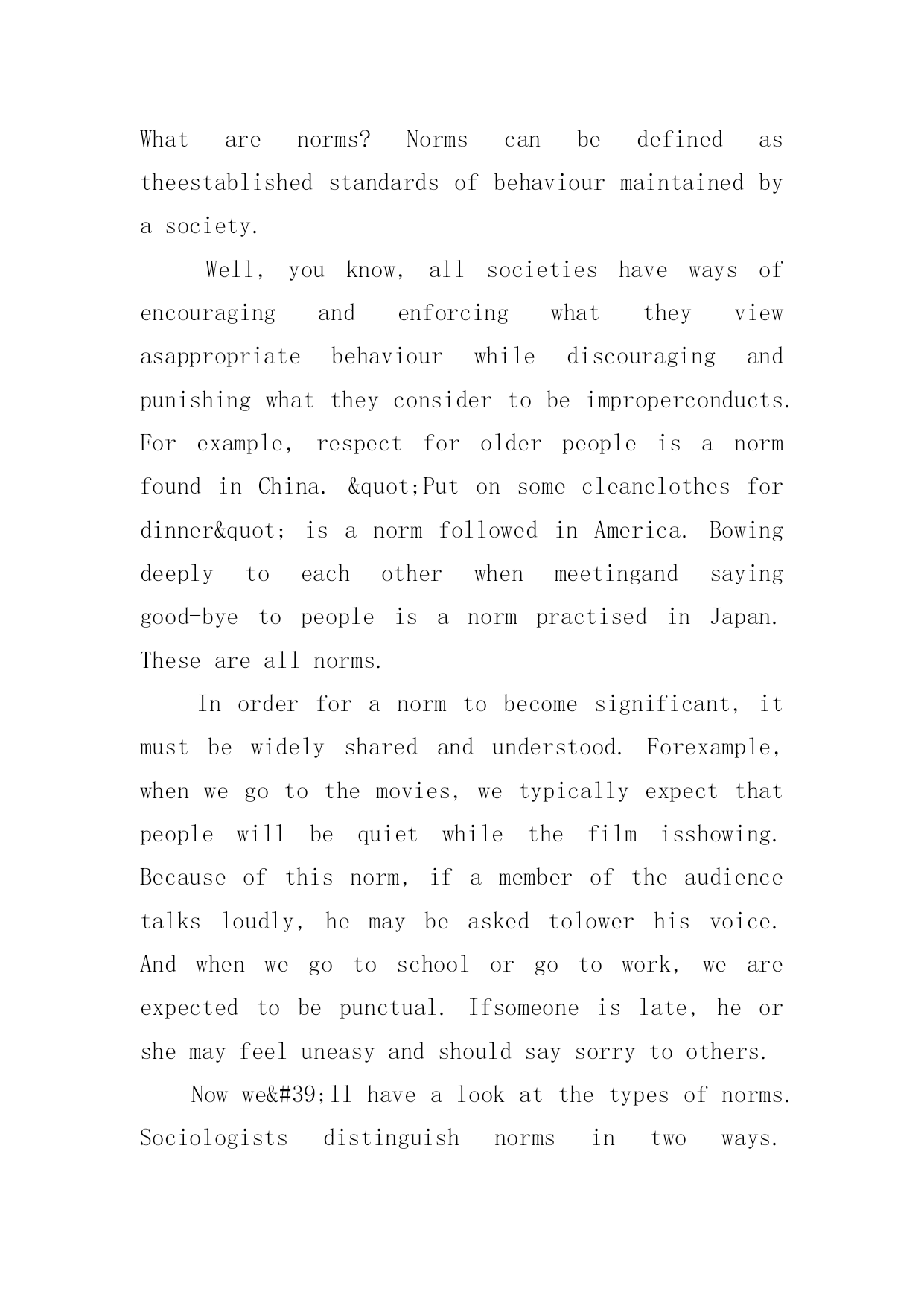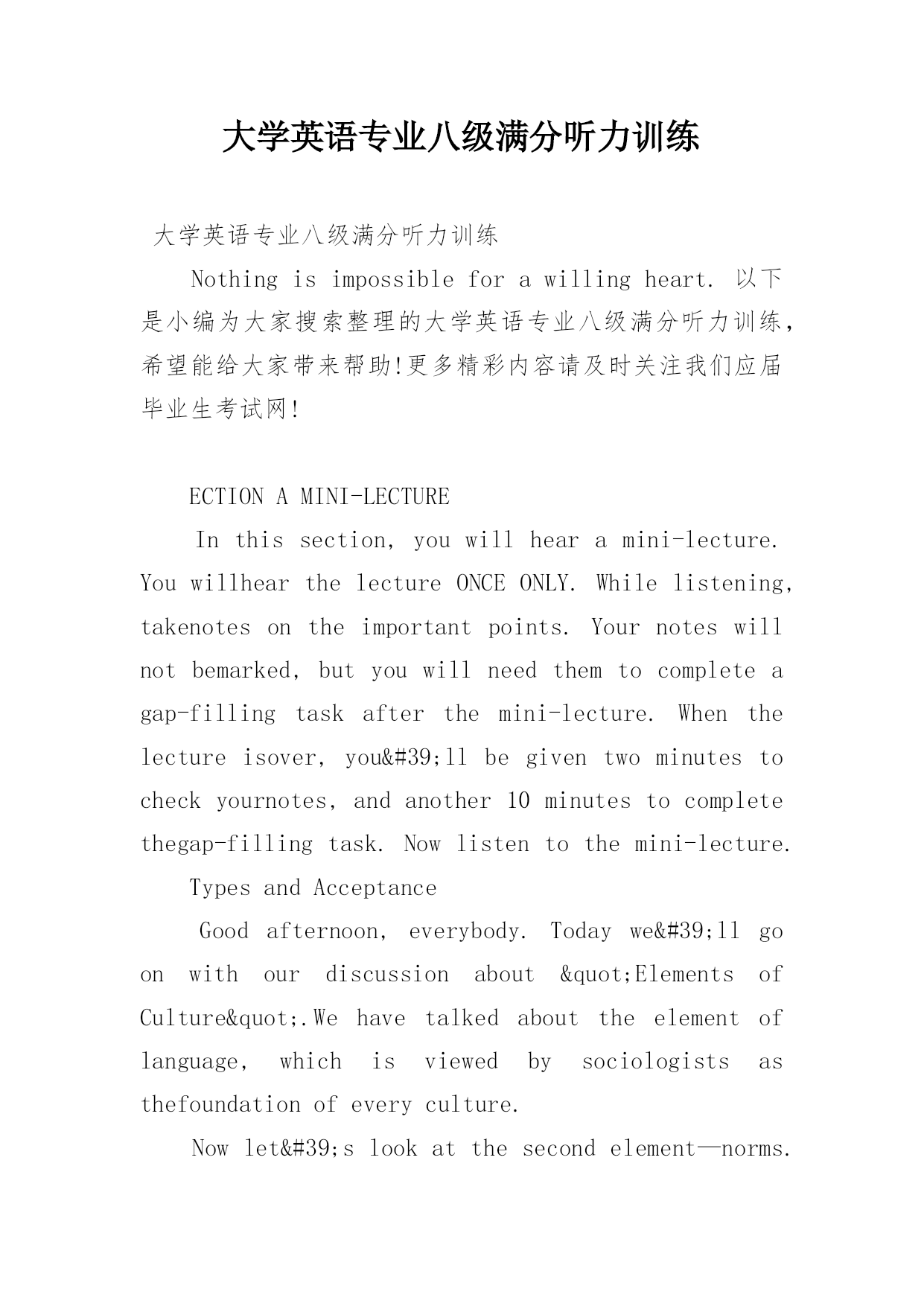 大学英语专业八级满分听力训练 大学英语专业八级满分听力训练Nothingisimpossibleforawillingheart.以下是小编为大家搜索整理的大学英语专业八级满分听力训练,希望能给大家带来帮助!更多精彩内容请及时关注我们应届毕业生考试网!ECTIONAMINI-LECTUREInthissection,youwillhearamini-lecture.YouwillhearthelectureONCEONLY.Whilelistening,takenotesontheimportantpoints.Yournoteswillnotbemarked,butyouwillneedthemtocompleteagap-fillingtaskafterthemini-lecture.Whenthelectureisover,you'llbegiventwominutestocheckyournotes,andanother10minutestocompletethegap-fillingtask.Nowlistentothemini-lecture.TypesandAcceptanceGoodafternoon,everybody.Todaywe'llgoonwithourdiscussionabout"ElementsofCulture".Wehavetalkedabouttheelementoflanguage,whichisviewedbysociologistsasthefoundationofeveryculture.Nowlet'slookatthesecondelement—norms.Whatarenorms?Normscanbedefinedastheestablishedstandardsofbehaviourmaintainedbyasociety.Well,youknow,allsocietieshavewaysofencouragingandenforcingwhattheyviewasappropriatebehaviourwhilediscouragingandpunishingwhattheyconsidertobeimproperconducts.Forexample,respectforolderpeopleisanormfoundinChina."Putonsomecleanclothesfordinner"isanormfollowedinAmerica.Bowingdeeplytoeachotherwhenmeetingandsayinggood-byetopeopleisanormpractisedinJapan.Theseareallnorms.Inorderforanormtobecomesignificant,itmustbewidelysharedandunderstood.Forexample,whenwegotothemovies,wetypicallyexpectthatpeoplewillbequietwhilethefilmisshowing.Becauseofthisnorm,ifamemberoftheaudiencetalksloudly,hemaybeaskedtolowerhisvoice.Andwhenwegotoschoolorgotowork,weareexpectedtobepunctual.Ifsomeoneislate,heorshemayfeeluneasyandshouldsaysorrytoothers.Nowwe'llhavealookatthetypesofnorms.Sociologistsdistinguishnormsintwoways.First,normscanbeclassifiedasformalandinformal.Formalnormshavegenerallybeenwrittendownandinvolvestrictrulesforpunishmentofviolators.Lawsareanexampleofformalnorms,becauseinapoliticalsense,thelawisthebodyofrules,madebygovernmentforsociety,interpretedbythecourts,andbackedbythestate.Besides,therequirementsforacollegemajorandrulesofacardgamearealsoformalnorms.Bycontr