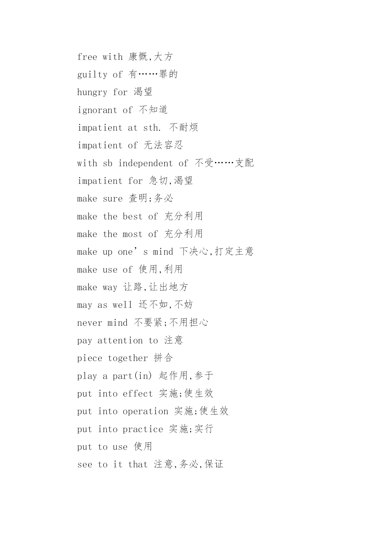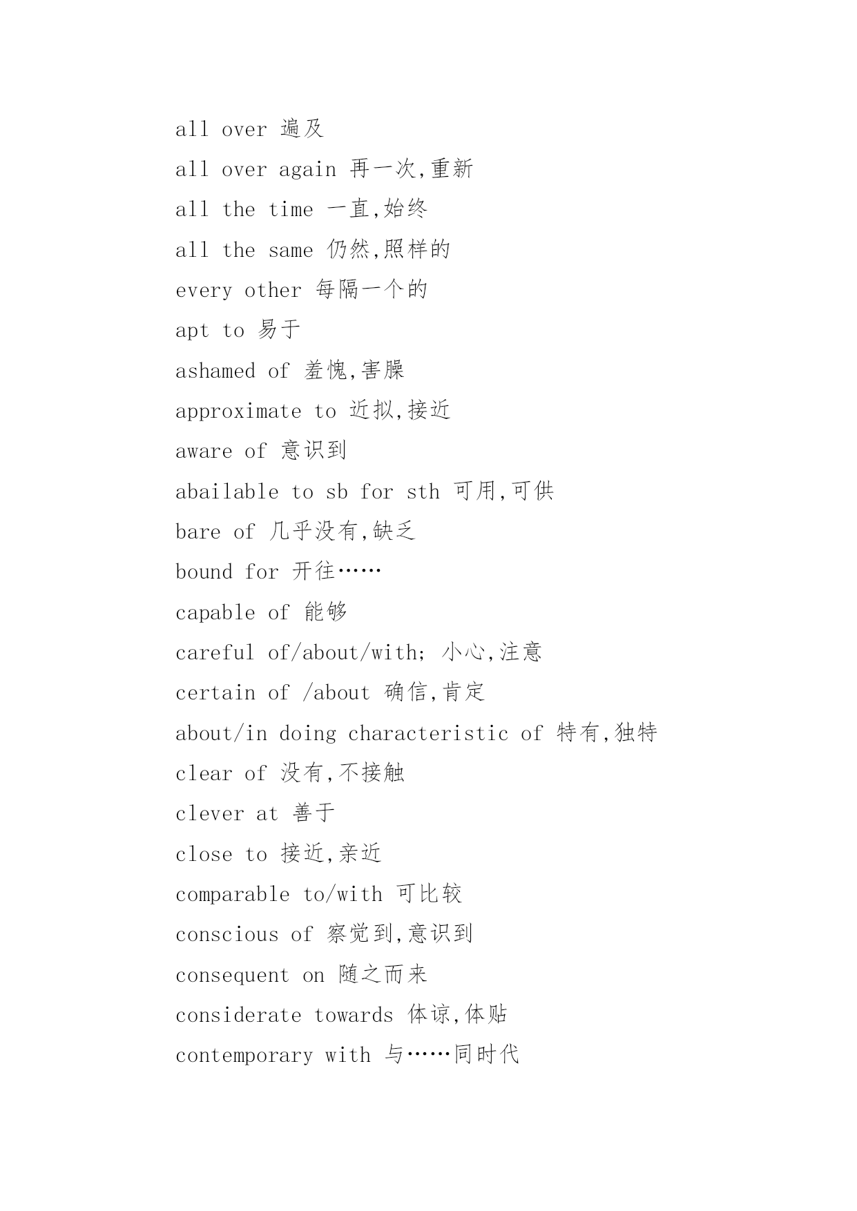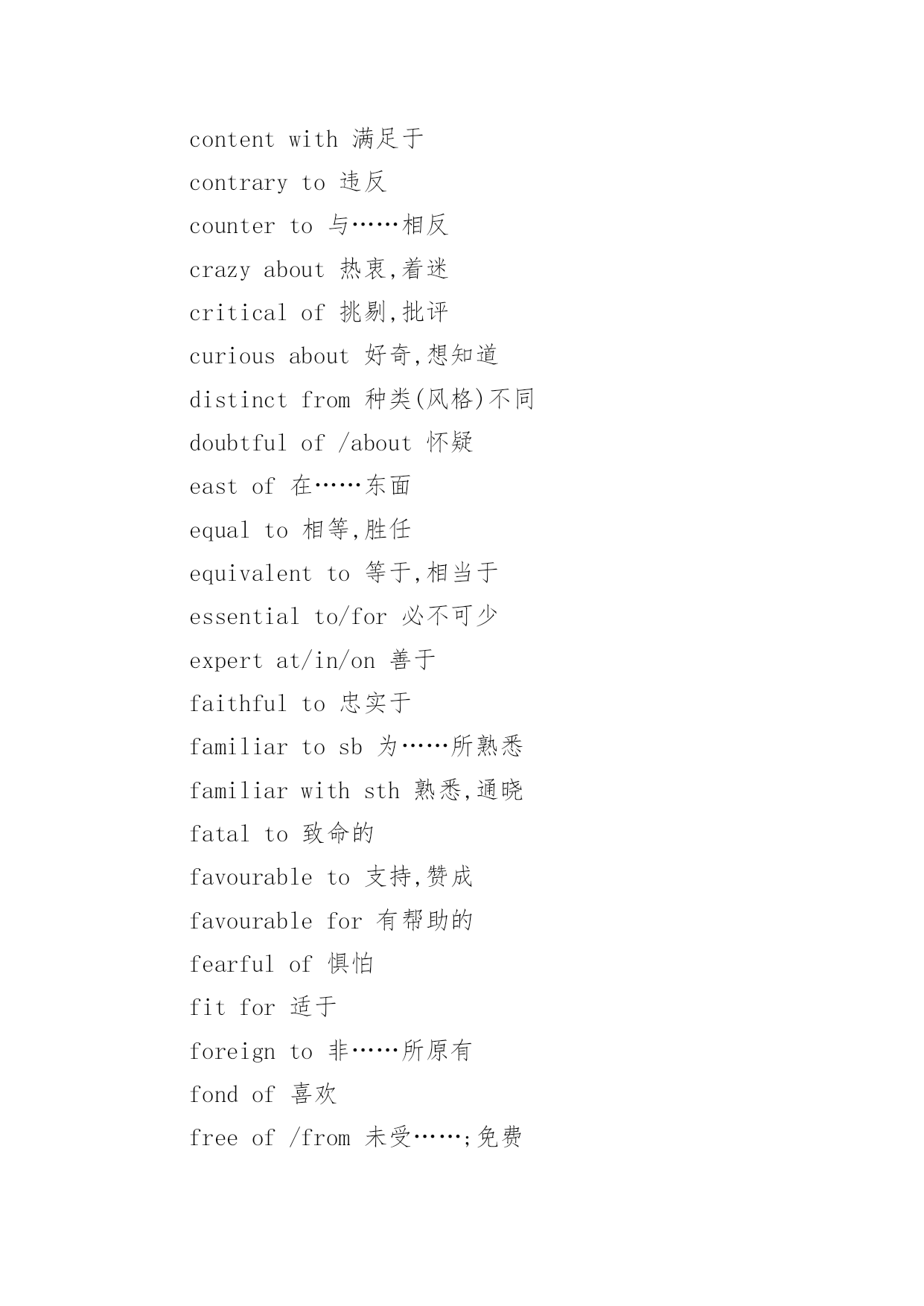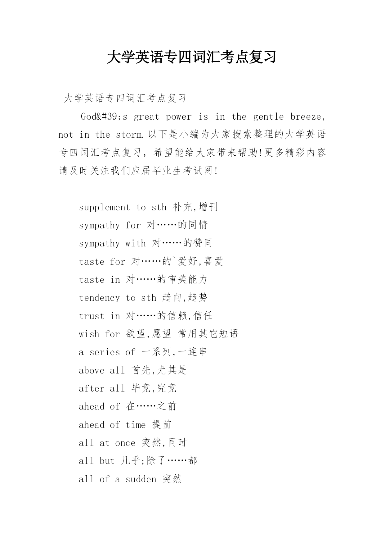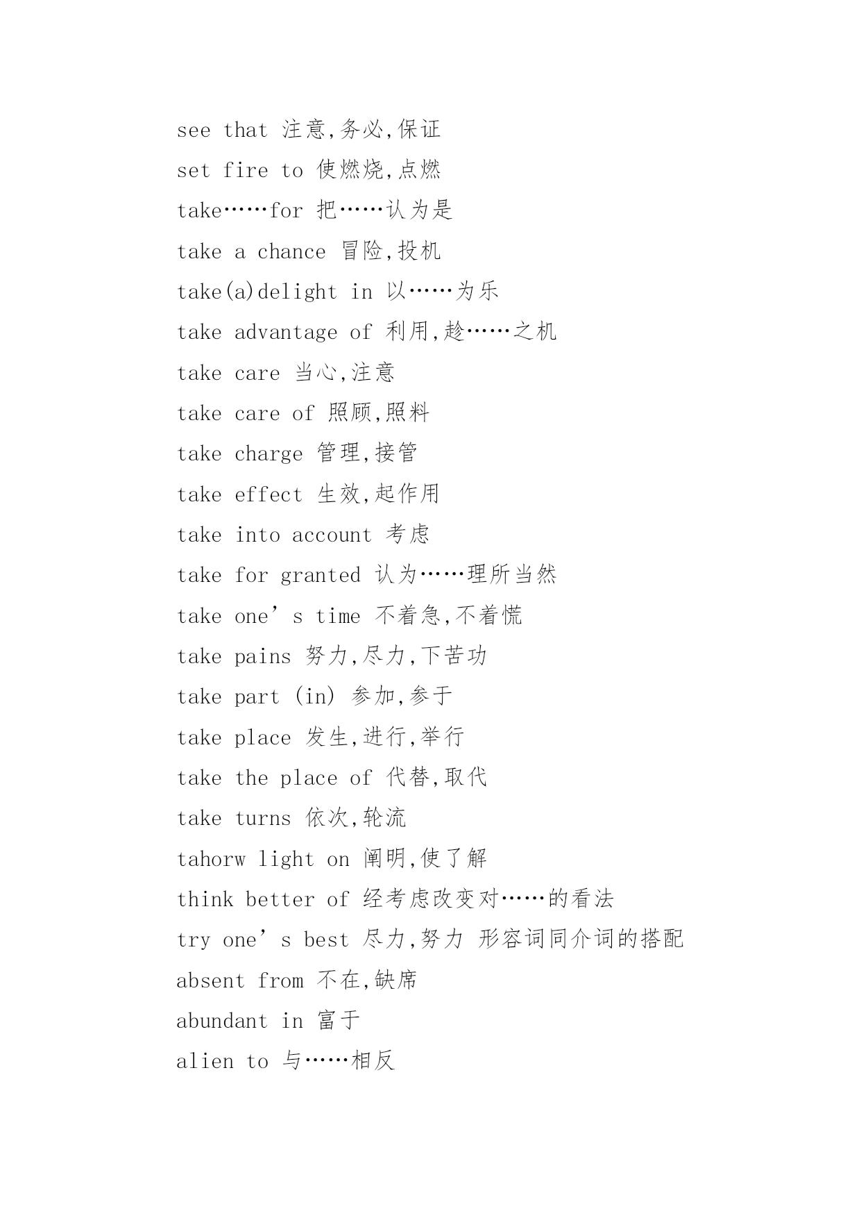 大学英语专四词汇考点复习 大学英语专四词汇考点复习God'sgreatpowerisinthegentlebreeze,notinthestorm.以下是小编为大家搜索整理的大学英语专四词汇考点复习,希望能给大家带来帮助!更多精彩内容请及时关注我们应届毕业生考试网!supplementtosth补充,增刊sympathyfor对……的同情sympathywith对……的赞同tastefor对……的`爱好,喜爱tastein对……的审美能力tendencytosth趋向,趋势trustin对……的信赖,信任wishfor欲望,愿望常用其它短语aseriesof一系列,一连串aboveall首先,尤其是afterall毕竟,究竟aheadof在……之前aheadoftime提前allatonce突然,同时allbut几乎;除了……都allofasudden突然allover遍及alloveragain再一次,重新allthetime一直,始终allthesame仍然,照样的everyother每隔一个的aptto易于ashamedof羞愧,害臊approximateto近拟,接近awareof意识到abailabletosbforsth可用,可供bareof几乎没有,缺乏boundfor开往……capableof能够carefulof/about/with;小心,注意certainof/about确信,肯定about/indoingcharacteristicof特有,独特clearof没有,不接触cleverat善于closeto接近,亲近comparableto/with可比较consciousof察觉到,意识到consequenton随之而来consideratetowards体谅,体贴contemporarywith与……同时代contentwith满足于contraryto违反counterto与……相反crazyabout热衷,着迷criticalof挑剔,批评curiousabout好奇,想知道distinctfrom种类(风格)不同doubtfulof/about怀疑eastof在……东面equalto相等,胜任equivalentto等于,相当于essentialto/for必不可少expertat/in/on善于faithfulto忠实于familiartosb为……所熟悉familiarwithsth熟悉,通晓fatalto致命的favourableto支持,赞成favourablefor有帮助的fearfulof惧怕fitfor适于foreignto非……所原有fondof喜欢freeof/from未受……;免费freewith康慨,大方guiltyof有……罪的hungryfor渴望ignorantof不知道impatientatsth.不耐烦impatientof无法容忍withsbindependentof不受……支配impatientfor急切,渴望makesure查明;务必makethebestof充分利用makethemostof充分利用makeupone’smind下决心,打定主意makeuseof使用,利用makeway让路,让出地方mayaswell还不如,不妨nevermind不要紧;不用担心payattentionto注意piecetogether拼合playapart(in)起作用,参于putintoeffect实施;使生效putintooperation实施;使生效putintopractice实施;实行puttouse使用seetoitthat注意,务必,保证seethat注意,务必,保证setfireto使燃烧,点燃take……for把……认为是takeachance冒险,投机take(a)delightin以……为乐takeadvantageof利用,趁……之机takecare当心,注意takecareof照顾,照料takecharge管理,接管takeeffect生效,起作用takeintoaccount考虑takeforgranted认为……理所当然takeone’stime不着急,不着慌takepains努力,尽力,下苦功takepart(in)参加,参于takeplace发生,进行,举行taketheplaceof代替,取代taketurns依次,轮流tahorwlighton阐明,使了解thinkbetterof经考虑改变对……的看法tryone’sbest尽力,努力形容词同介词的搭配absentfrom不在,缺席abundantin富于aliento与……相反angrywithsbat/aboutsth生气,愤怒anxiousabout/for忧虑,担心