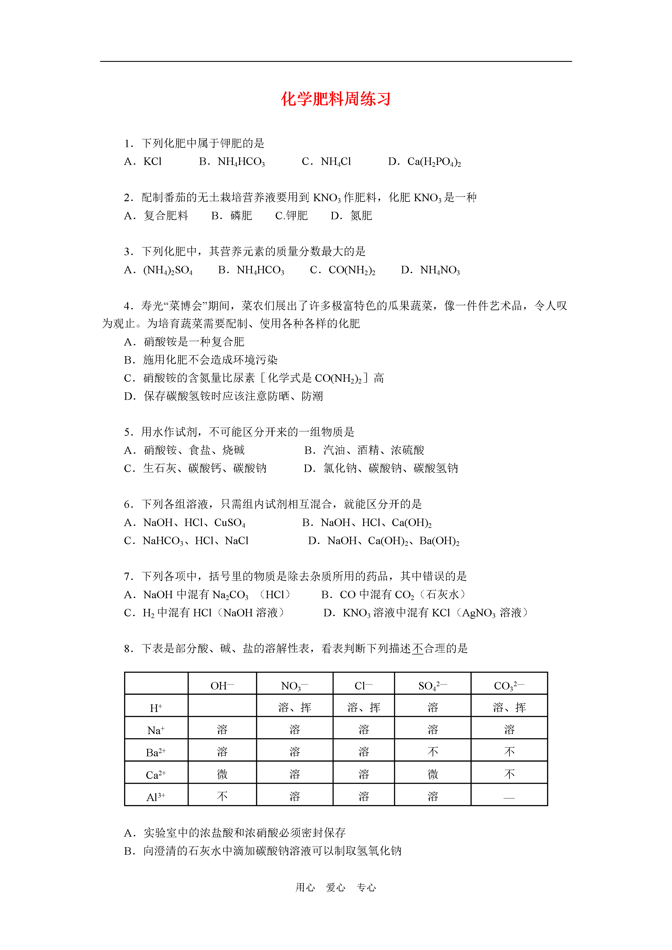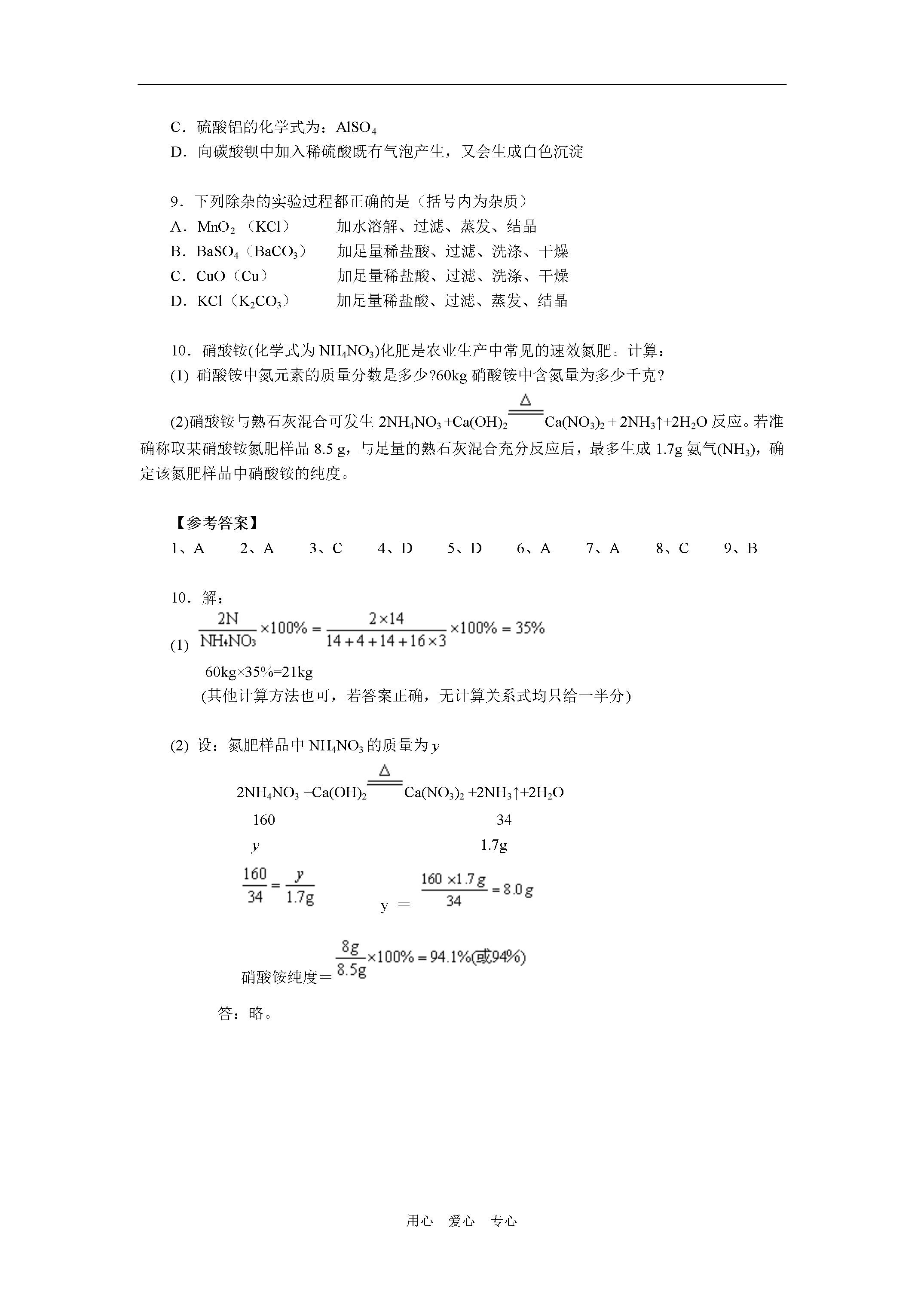 用心爱心专心化学肥料周练习1.下列化肥中属于钾肥的是A.KClB.NH4HCO3C.NH4ClD.Ca(H2PO4)22.配制番茄的无土栽培营养液要用到KNO3作肥料,化肥KNO3是一种A.复合肥料B.磷肥C.钾肥D.氮肥3.下列化肥中,其营养元素的质量分数最大的是A.(NH4)2SO4B.NH4HCO3C.CO(NH2)2D.NH4NO34.寿光“菜博会”期间,菜农们展出了许多极富特色的瓜果蔬菜,像一件件艺术品,令人叹为观止。为培育蔬菜需要配制、使用各种各样的化肥A.硝酸铵是一种复合肥B.施用化肥不会造成环境污染C.硝酸铵的含氮量比尿素[化学式是CO(NH2)2]高D.保存碳酸氢铵时应该注意防晒、防潮5.用水作试剂,不可能区分开来的一组物质是A.硝酸铵、食盐、烧碱B.汽油、酒精、浓硫酸C.生石灰、碳酸钙、碳酸钠D.氯化钠、碳酸钠、碳酸氢钠6.下列各组溶液,只需组内试剂相互混合,就能区分开的是A.NaOH、HCl、CuSO4B.NaOH、HCl、Ca(OH)2C.NaHCO3、HCl、NaClD.NaOH、Ca(OH)2、Ba(OH)27.下列各项中,括号里的物质是除去杂质所用的药品,其中错误的是A.NaOH中混有Na2CO3(HCl)B.CO中混有CO2(石灰水)C.H2中混有HCl(NaOH溶液)D.KNO3溶液中混有KCl(AgNO3溶液)8.下表是部分酸、碱、盐的溶解性表,看表判断下列描述不合理的是OH—NO3—Cl—SO42—CO32—H+溶、挥溶、挥溶溶、挥Na+溶溶溶溶溶Ba2+溶溶溶不不Ca2+微溶溶微不Al3+不溶溶溶—A.实验室中的浓盐酸和浓硝酸必须密封保存B.向澄清的石灰水中滴加碳酸钠溶液可以制取氢氧化钠C.硫酸铝的化学式为:AlSO4D.向碳酸钡中加入稀硫酸既有气泡产生,又会生成白色沉淀9.下列除杂的实验过程都正确的是(括号内为杂质)A.MnO2(KCl)加水溶解、过滤、蒸发、结晶B.BaSO4(BaCO3)加足量稀盐酸、过滤、洗涤、干燥C.CuO(Cu)加足量稀盐酸、过滤、洗涤、干燥D.KCl(K2CO3)加足量稀盐酸、过滤、蒸发、结晶10.硝酸铵(化学式为NH4NO3)化肥是农业生产中常见的速效氮肥。计算:(1)硝酸铵中氮元素的质量分数是多少?60kg硝酸铵中含氮量为多少千克?(2)硝酸铵与熟石灰混合可发生2NH4NO3+Ca(OH)2Ca(NO3)2+2NH3↑+2H2O反应。若准确称取某硝酸铵氮肥样品8.5g,与足量的熟石灰混合充分反应后,最多生成1.7g氨气(NH3),确定该氮肥样品中硝酸铵的纯度。【参考答案】1、A2、A3、C4、D5、D6、A7、A8、C9、B10.解:(1)60kg×35%=21kg(其他计算方法也可,若答案正确,无计算关系式均只给一半分)(2)设:氮肥样品中NH4NO3的质量为y2NH4NO3+Ca(OH)2Ca(NO3)2+2NH3↑+2H2O16034y1.7gy=硝酸铵纯度=答:略。