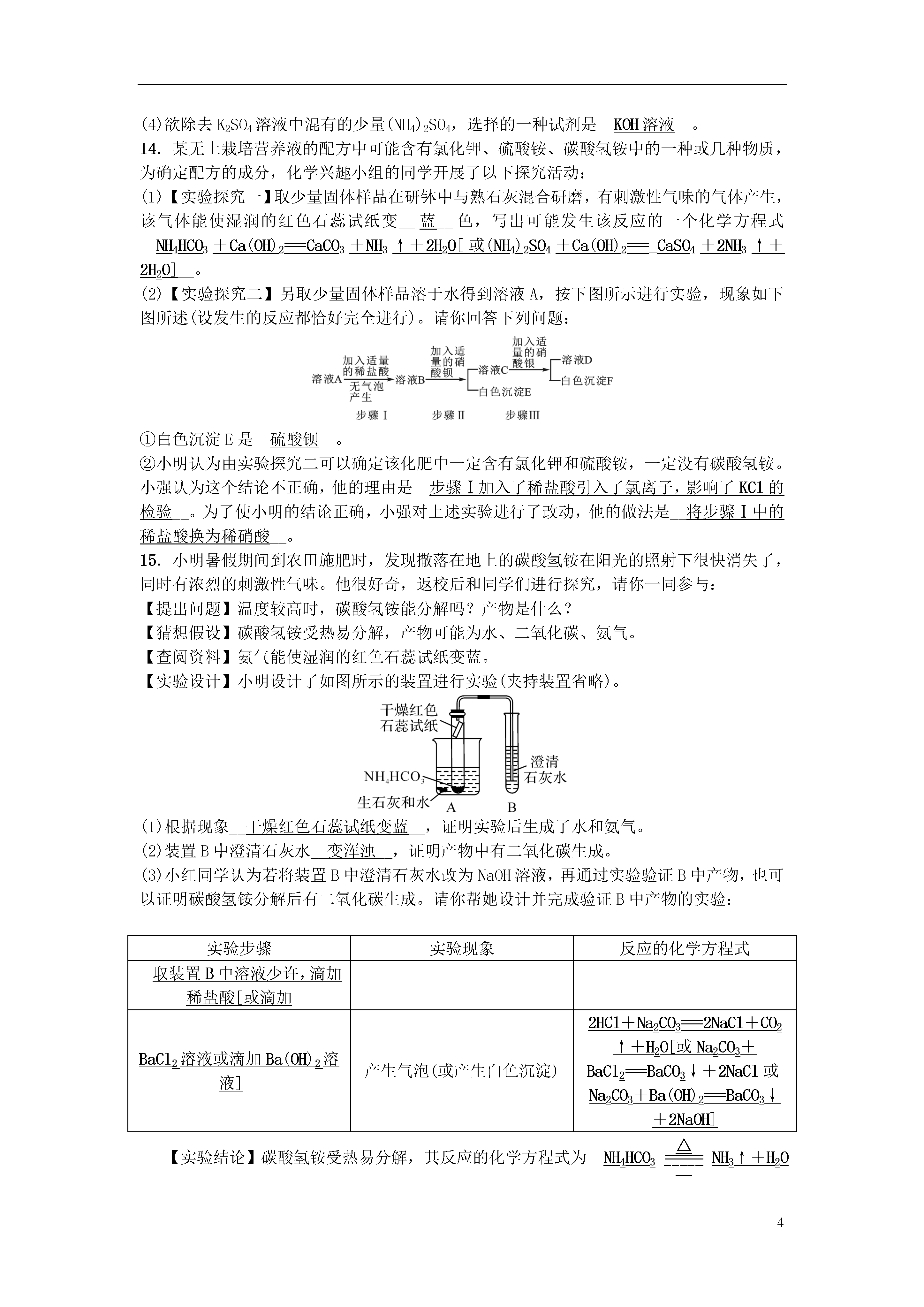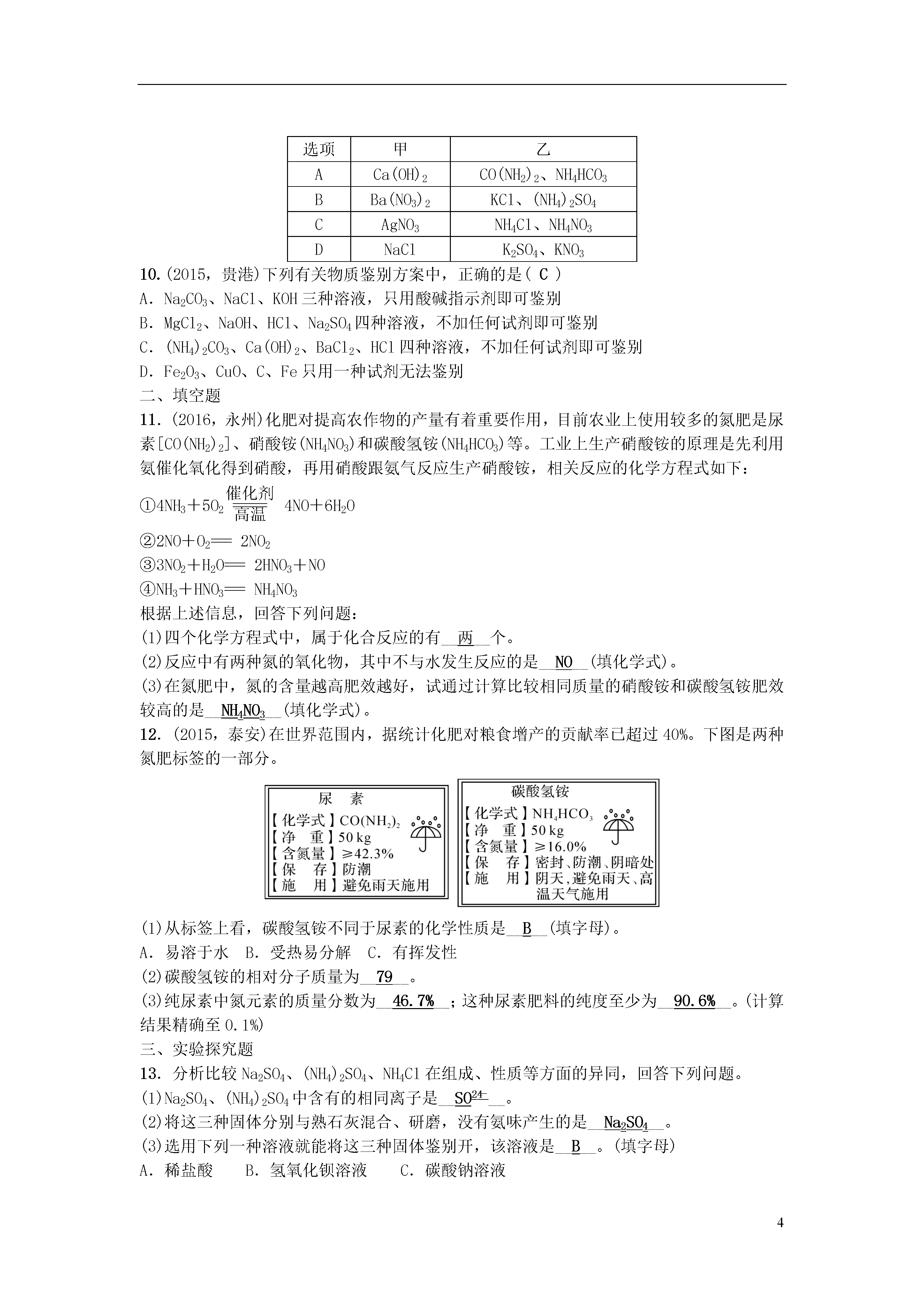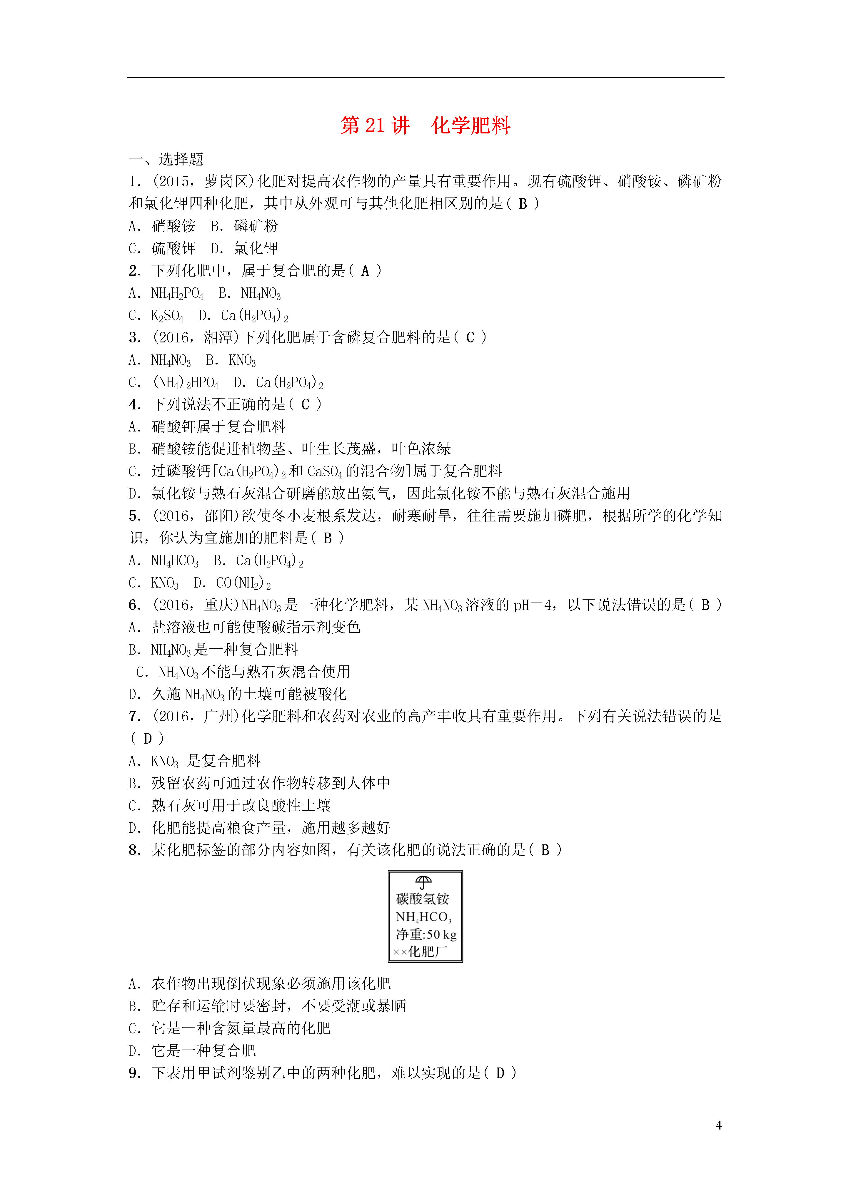 4第21讲化学肥料一、选择题1.(2015,萝岗区)化肥对提高农作物的产量具有重要作用。现有硫酸钾、硝酸铵、磷矿粉和氯化钾四种化肥,其中从外观可与其他化肥相区别的是(B)A.硝酸铵B.磷矿粉C.硫酸钾D.氯化钾2.下列化肥中,属于复合肥的是(A)A.NH4H2PO4B.NH4NO3C.K2SO4D.Ca(H2PO4)23.(2016,湘潭)下列化肥属于含磷复合肥料的是(C)A.NH4NO3B.KNO3C.(NH4)2HPO4D.Ca(H2PO4)24.下列说法不正确的是(C)A.硝酸钾属于复合肥料B.硝酸铵能促进植物茎、叶生长茂盛,叶色浓绿C.过磷酸钙[Ca(H2PO4)2和CaSO4的混合物]属于复合肥料D.氯化铵与熟石灰混合研磨能放出氨气,因此氯化铵不能与熟石灰混合施用5.(2016,邵阳)欲使冬小麦根系发达,耐寒耐旱,往往需要施加磷肥,根据所学的化学知识,你认为宜施加的肥料是(B)A.NH4HCO3B.Ca(H2PO4)2C.KNO3D.CO(NH2)26.(2016,重庆)NH4NO3是一种化学肥料,某NH4NO3溶液的pH=4,以下说法错误的是(B)A.盐溶液也可能使酸碱指示剂变色B.NH4NO3是一种复合肥料C.NH4NO3不能与熟石灰混合使用D.久施NH4NO3的土壤可能被酸化7.(2016,广州)化学肥料和农药对农业的高产丰收具有重要作用。下列有关说法错误的是(D)A.KNO3是复合肥料B.残留农药可通过农作物转移到人体中C.熟石灰可用于改良酸性土壤D.化肥能提高粮食产量,施用越多越好8.某化肥标签的部分内容如图,有关该化肥的说法正确的是(B)A.农作物出现倒伏现象必须施用该化肥B.贮存和运输时要密封,不要受潮或暴晒C.它是一种含氮量最高的化肥D.它是一种复合肥9.下表用甲试剂鉴别乙中的两种化肥,难以实现的是(D)选项甲乙ACa(OH)2CO(NH2)2、NH4HCO3BBa(NO3)2KCl、(NH4)2SO4CAgNO3NH4Cl、NH4NO3DNaClK2SO4、KNO310.(2015,贵港)下列有关物质鉴别方案中,正确的是(C)A.Na2CO3、NaCl、KOH三种溶液,只用酸碱指示剂即可鉴别B.MgCl2、NaOH、HCl、Na2SO4四种溶液,不加任何试剂即可鉴别C.(NH4)2CO3、Ca(OH)2、BaCl2、HCl四种溶液,不加任何试剂即可鉴别D.Fe2O3、CuO、C、Fe只用一种试剂无法鉴别二、填空题11.(2016,永州)化肥对提高农作物的产量有着重要作用,目前农业上使用较多的氮肥是尿素[CO(NH2)2]、硝酸铵(NH4NO3)和碳酸氢铵(NH4HCO3)等。工业上生产硝酸铵的原理是先利用氨催化氧化得到硝酸,再用硝酸跟氨气反应生产硝酸铵,相关反应的化学方程式如下:①4NH3+5O2eq\o(=====,\s\up7(催化剂),\s\do5(高温))4NO+6H2O②2NO+O2===2NO2③3NO2+H2O===2HNO3+NO④NH3+HNO3===NH4NO3根据上述信息,回答下列问题:(1)四个化学方程式中,属于化合反应的有__两__个。(2)反应中有两种氮的氧化物,其中不与水发生反应的是__NO__(填化学式)。(3)在氮肥中,氮的含量越高肥效越好,试通过计算比较相同质量的硝酸铵和碳酸氢铵肥效较高的是__NH4NO3__(填化学式)。12.(2015,泰安)在世界范围内,据统计化肥对粮食增产的贡献率已超过40%。下图是两种氮肥标签的一部分。(1)从标签上看,碳酸氢铵不同于尿素的化学性质是__B__(填字母)。A.易溶于水B.受热易分解C.有挥发性(2)碳酸氢铵的相对分子质量为__79__。(3)纯尿素中氮元素的质量分数为__46.7%__;这种尿素肥料的纯度至少为__90.6%__。(计算结果精确至0.1%)三、实验探究题13.分析比较Na2SO4、(NH4)2SO4、NH4Cl在组成、性质等方面的异同,回答下列问题。(1)Na2SO4、(NH4)2SO4中含有的相同离子是__SOeq\o\al(2-,4)__。(2)将这三种固体分别与熟石灰混合、研磨,没有氨味产生的是__Na2SO4__。(3)选用下列一种溶液就能将这三种固体鉴别开,该溶液是__B__。(填字母)A.稀盐酸B.氢氧化钡溶液C.碳酸钠溶液(4)欲除去K2SO4溶液中混有的少量(NH4)2SO4,选择的一种试剂是__KOH溶液__。14.某无土栽培营养液的配方中可能含有氯化钾、硫酸铵、碳酸氢铵中的一种或几种物质,为确定配方的成分,化学兴趣小组的同学开展了
