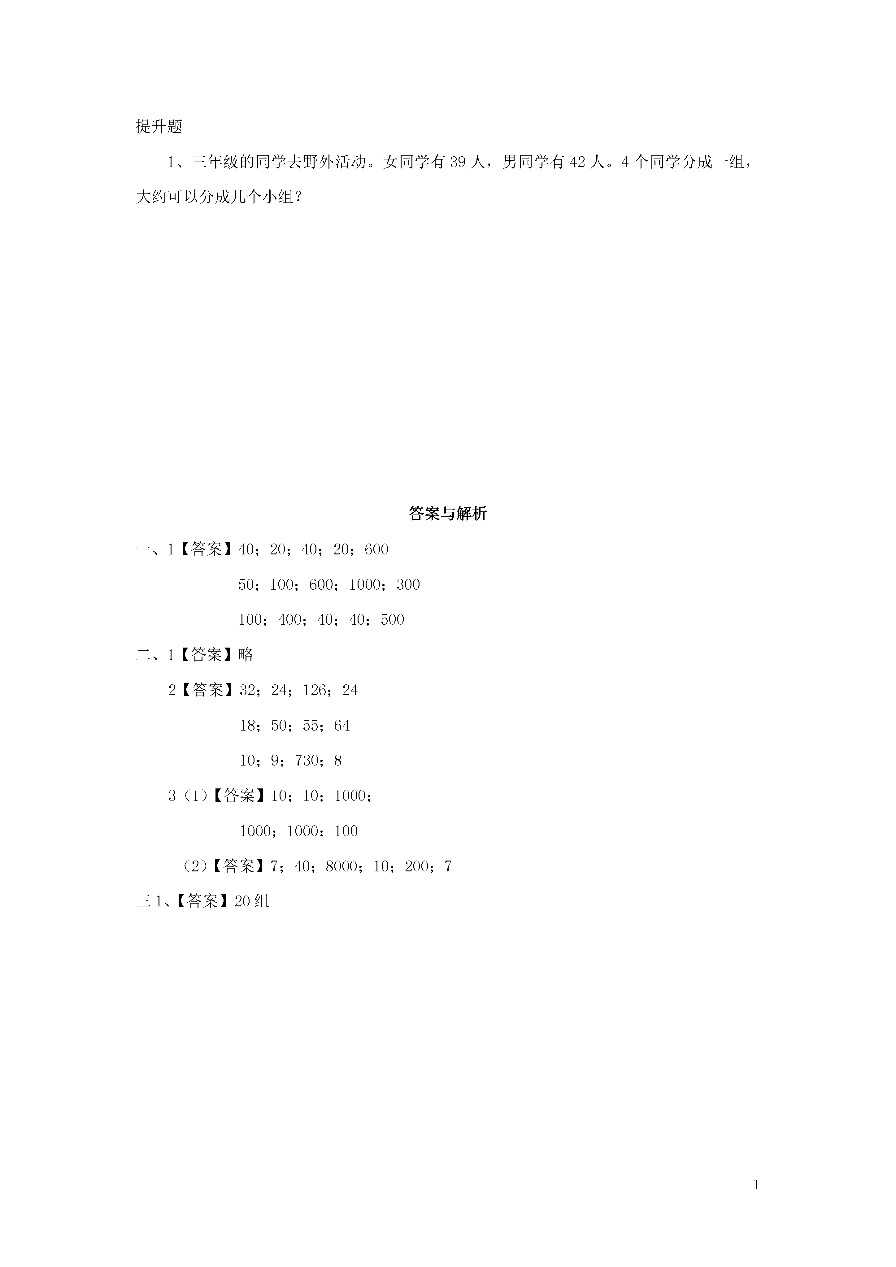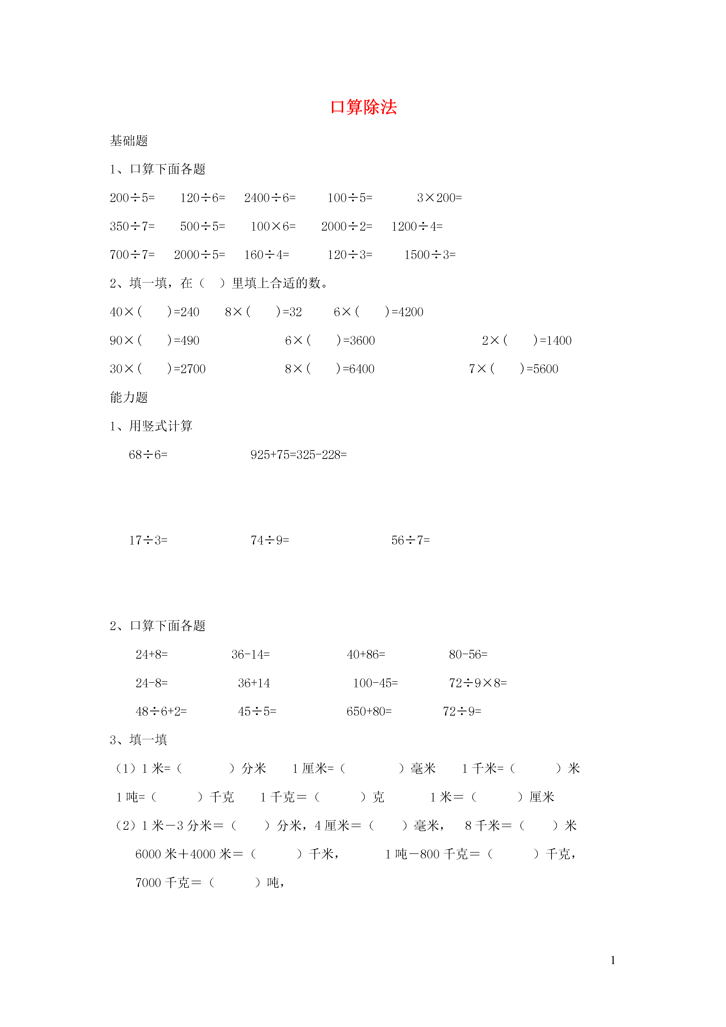 1口算除法基础题1、口算下面各题200÷5=120÷6=2400÷6=100÷5=3×200=350÷7=500÷5=100×6=2000÷2=1200÷4=700÷7=2000÷5=160÷4=120÷3=1500÷3=2、填一填,在()里填上合适的数。40×()=2408×()=326×()=420090×()=4906×()=36002×()=140030×()=27008×()=64007×()=5600能力题1、用竖式计算68÷6=925+75=325-228=17÷3=74÷9=56÷7=2、口算下面各题24+8=36-14=40+86=80-56=24-8=36+14100-45=72÷9×8=48÷6+2=45÷5=650+80=72÷9=3、填一填(1)1米=()分米1厘米=()毫米1千米=()米1吨=()千克1千克=()克1米=()厘米(2)1米-3分米=()分米,4厘米=()毫米,8千米=()米6000米+4000米=()千米,1吨-800千克=()千克,7000千克=()吨,提升题1、三年级的同学去野外活动。女同学有39人,男同学有42人。4个同学分成一组,大约可以分成几个小组?答案与解析一、1【答案】40;20;40;20;60050;100;600;1000;300100;400;40;40;500二、1【答案】略2【答案】32;24;126;2418;50;55;6410;9;730;83(1)【答案】10;10;1000;1000;1000;100(2)【答案】7;40;8000;10;200;7三1、【答案】20组