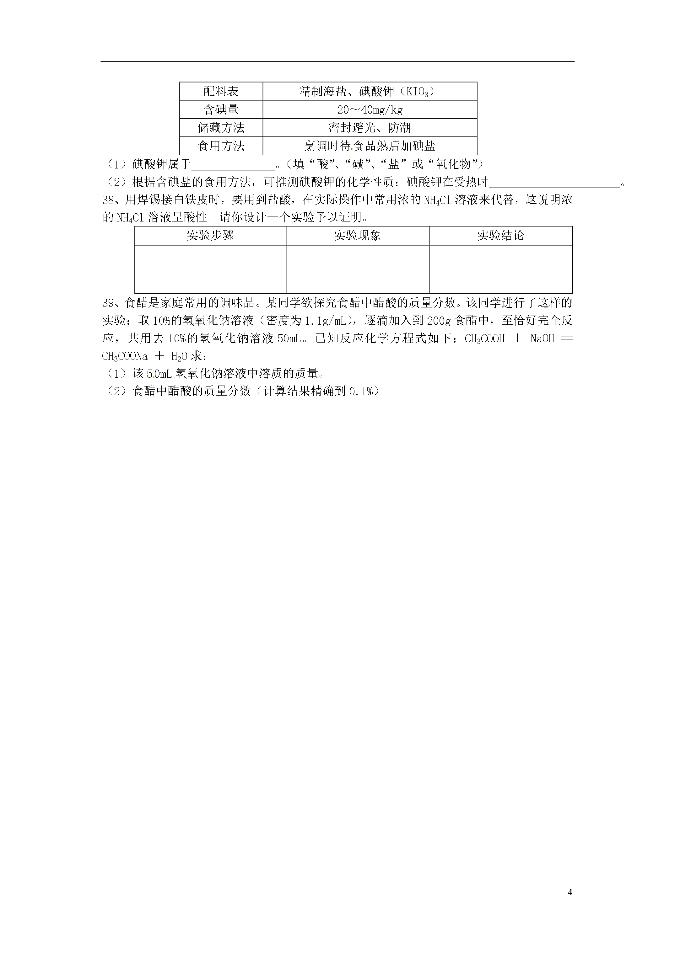 4广东省仁化县周田中学2013届九年级化学《第十一单元盐和化学肥料》综合练习题(无答案)1、下列关于氯化钠性质和用途的描述中,不正确的是()A、易溶于水B、Na+对维持细胞内外正常的水分分布和促进细胞内外物质交换起主要作用C、公路上的积雪可用氯化钠来消除,是因为NaCl能吸收空气中的水分而潮解D、Cl-是胃液的主要成分,具有促生盐酸,帮助消化和增进食欲的作用2、下列说法中,正确的是()A、盐就是食盐,食盐就是氯化钠B、纯碱就是纯净的碱C、氨水不是化肥D、氯化钠和纯碱都属盐3、我国某地曾发生过把外形式和食盐相似,有咸味的工业用盐误作食盐,食用后发生中毒的事件,这种工业盐可能含有的有毒物质是()A、KMnO4B、Na2CO3C、NaNO2D、CuSO44、鱼胆弄破后,会使鱼肉沾上一种叫胆汁酸(一种酸)且难溶于水的物质,使鱼肉变苦,要消除这种苦味,用下列的何种溶液冲洗最适宜()A、食盐水B、醋酸C、纯碱溶液D、氢氧化钠溶液5、欲确保混有盐酸的氯化钙溶液中和至中性,在不用指示剂的条件下,应加入的试剂是()A、生石灰B、熟石灰C、纯碱D、石灰石粉末6、做馒头时要在发酵好的面团中加食用碱,以便产生气体使馒头疏松多孔,面团在发酵过程中产生的物质的性质是()A、酸性B、碱性C、中性D、无法判断7、判断复分解反应能否发生,不必考虑的是()A、是否有沉淀生成B、是否有气体生成C、是否有水生成D、金属活动顺性8、下列物质的名称、类别、化学式相一致的是()A、纯碱、碱、Na2CO3B、氨水、盐、NH3·H2OC、碳酸氢钠、酸、NaCO3D、氯化氨、盐、NH4Cl9、下列物质按氧化物、酸、碱、盐、混合物的顺序排列的是()A、氯酸钾、硝酸、氢氧化铜、硫酸亚铁、天然气B、氧化铁、磷酸、氢氧化钾、氯化钠、高锰酸钾C、五氧化二磷、盐酸、氢氧化钙、硝酸镁、石油D、水、碳酸、硫酸铁、碳酸钠、空气10、在下列溶液中分别放入锌片,一段时间后把锌片取出,溶液质量增加的是()A、氯化镁溶液B、盐酸C、硫酸亚铁溶液D、硝酸银溶液11、有甲、乙、丙、丁四种金属,仅甲在自然界中主要以单质状态存在。丙盐的水溶液不能用丁制的容器盛放,丁与乙盐的水溶液不反应,这四种金属的活动性由强到弱的顺序()A、甲、乙、丙、丁B、丁、乙、甲、丙C、丙、乙、丁、甲D、乙、丁、丙、甲12、在反应A+HClZnCl2+B中,A可能是下列物质中的()①Zn②ZnO③Zn(OH)2④ZnCO3A、只有①②③B、只有①②④C、只有①②D、①②③④都有13、取下列化肥与熟石灰粉末混合,研磨后,能闻到氨臭气味气体的是()A、氯化钾B、硝酸钾C、硫酸铵D、磷酸钙14、下列各组内两种物质的溶液混合后,不能发生反应的是()A、CaCl2和AgNO3B、Na2SO4和MgCl2C、HNO3和KOHD、Na2CO3和BaCl215、能与稀盐酸反应,但不加入无色酚酞试液就观察不到明显现象的是()A、金属锌B、澄清石灰水C、氢氧化钠D、碳酸钠溶液16、下列说法正确的是()A、纯碱不是碱B、食盐不是盐C、烧碱不是碱D、盐酸不是酸17、在发酵面团中加入下列某种物质的溶液揉和,既能除去面团中的酸,又能使蒸出的馒头疏松多孔,这种物质是()A、CaOB、Ca(OH)2C、Na2CO3D、NaCl18、下列各组物质混合后,能发生化学反应,并生成氯化铁的是()A、FeO和盐酸B、Fe2(SO4)和盐酸C、Fe和CuCl2D、Fe2O3和盐酸19、食盐、食醋、纯碱等均为家庭厨房中常用的物质,利用这些物质你能完成的实验是()①检验自来水中是否含有氯离子;②鉴别食盐和纯碱;③检验鸡蛋壳能否溶于酸;④除去热水瓶中的水垢A、①②B、①③C、①④D、②③④20、被誉为“春果第一枝”的大樱桃已成为烟台农业经济的一个亮点。为了预防大樱桃在成熟期发生裂果现象,果农常驻施用一种钾肥。这种钾肥的水溶液能跟氯化钡溶液反应生成不溶于HNO3的白色沉淀,则该钾肥为()A、KNO3B、K2CO3C、K2SO4D、KCl21、配制番茄的无土栽培营养液要用到KNO3作肥料,化肥KNO3是一种()A、复合肥B、磷肥C、钾肥D、氮肥22、筹建中的一座生态农业园内,不仅是农业高新技术示范和推广基地,还将是一个观光休闲的生态农业园区,在一些生产思路上,你认为不妥的是()A、将农家肥与化肥综合使用,以提高增产效益B、对大棚中的植物施加适量的CO2,以促进其光合作用C、种植、养殖、制沼气相结合,既可以改善环境,又可以提高农畜牧业的产量D、将硝酸铵和熟石灰混合使用,在给作物提供营养元素的同时,又能降低土壤的酸性23、在蔬菜生长过程中,常喷洒农药防治病虫害,据有关专家介绍,用碱性溶液或清水浸泡,可使残留在蔬菜上的农药的毒性降低。因此,买来的蔬菜在食用前最好用稀碱水或清水浸泡一段时间。用水浸